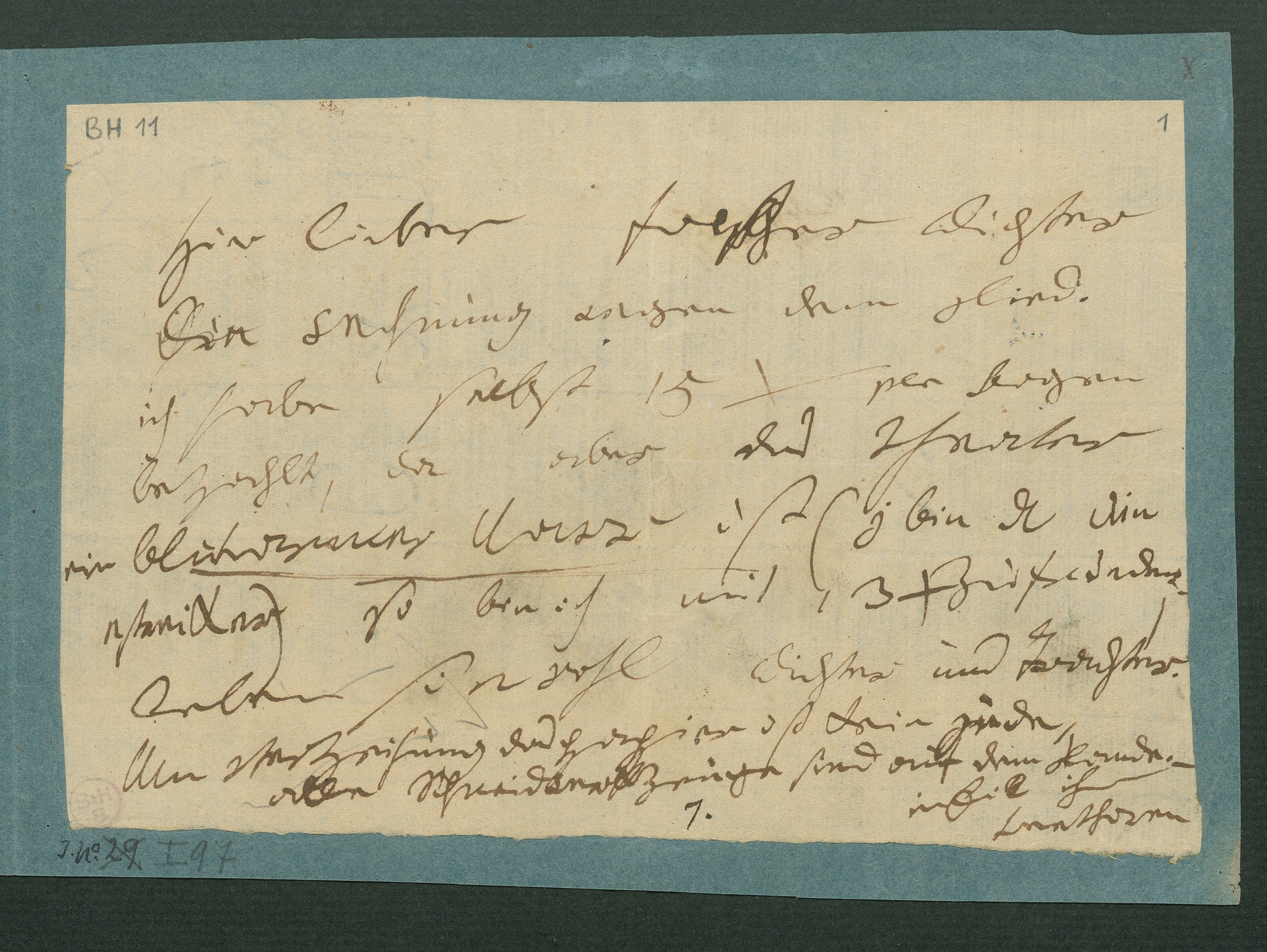Begleitschreiben zu einer nicht überlieferten Rechnung. Beethoven hatte wohl eine Abschrift von WoO 97 "Es ist vollbracht", Schlussgesang aus Treitschkes Singspiel "Die Ehrenpforten", anfertigen lassen und dafür 15 Kreuzer pro Bogen bezahlt. Er stellt nun dem Theater lediglich 13 Kreuzer in Rechnung, da ihm die schlechte Kassenlage des Theaters bekannt ist. (J.R.)