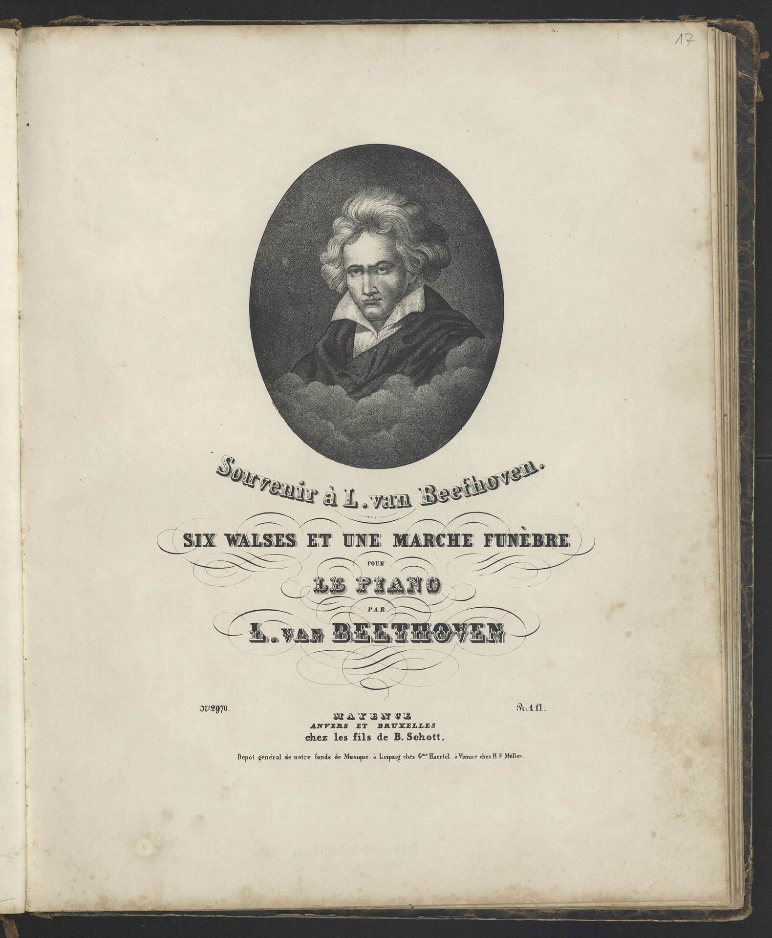 Ludwig van Beethoven - Lithographie von Félix Achille Saint-Aulaire nach dem Gemälde von Joseph Karl Stieler aus dem Jahr 1820, anonyme Lithographie, Titelvignette, erschienen bei Schott, Mainz, ca. 1840