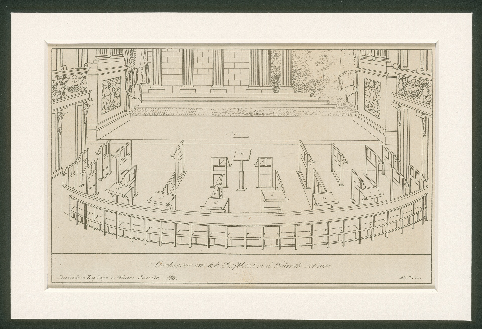 Bühne und Sitzplan des Orchesters im Kärntnertortheater Wien, 1821 - Stich von Franz Xaver Stöber