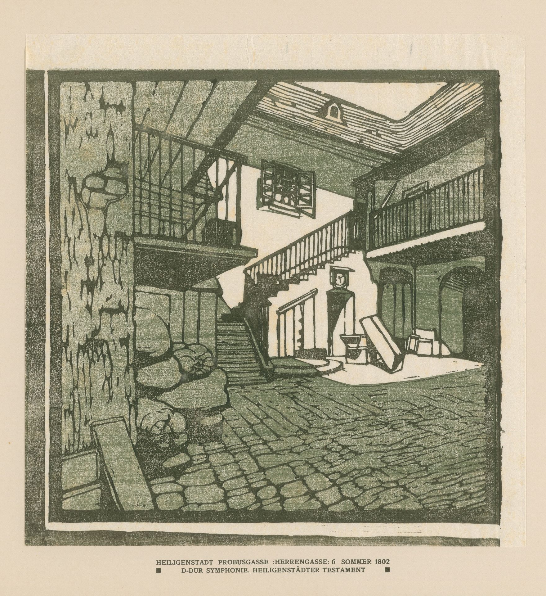 Wien, Heiligenstadt, Probusgasse 6, Wohnung von Ludwig van Beethoven, Hofansicht - Holzschnitt von Carl Moll, im Aquarelldruckverfahren farbig gedruckt von der Wiener Werkstätte, Wien, um 1907