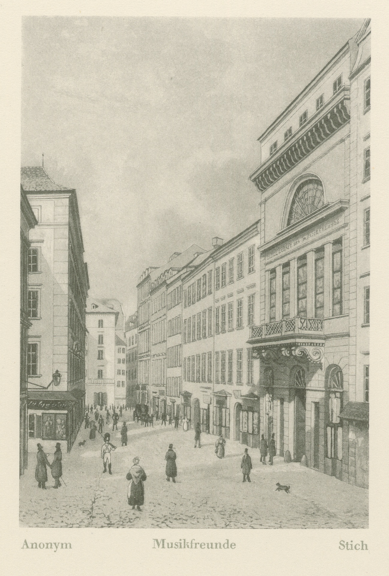 Das Gebäude der Gesellschaft der Musikfreunde in den Tuchlauben in Wien, um 1840 - Reproduktion eines anonymem Stiches, Wien, 1929
