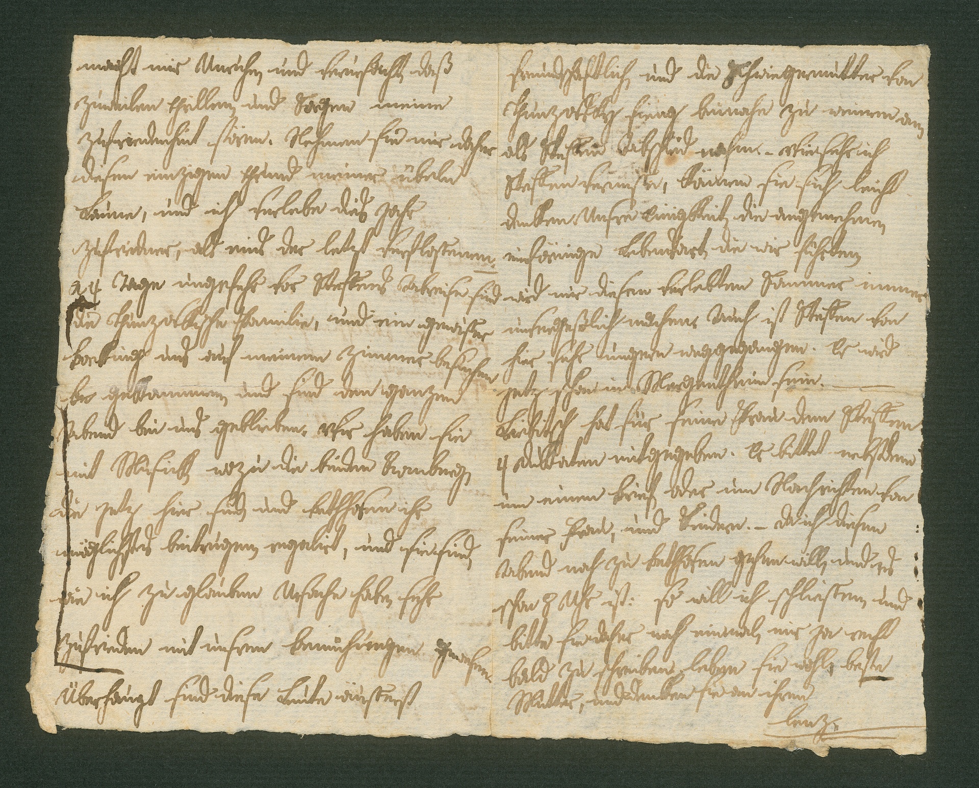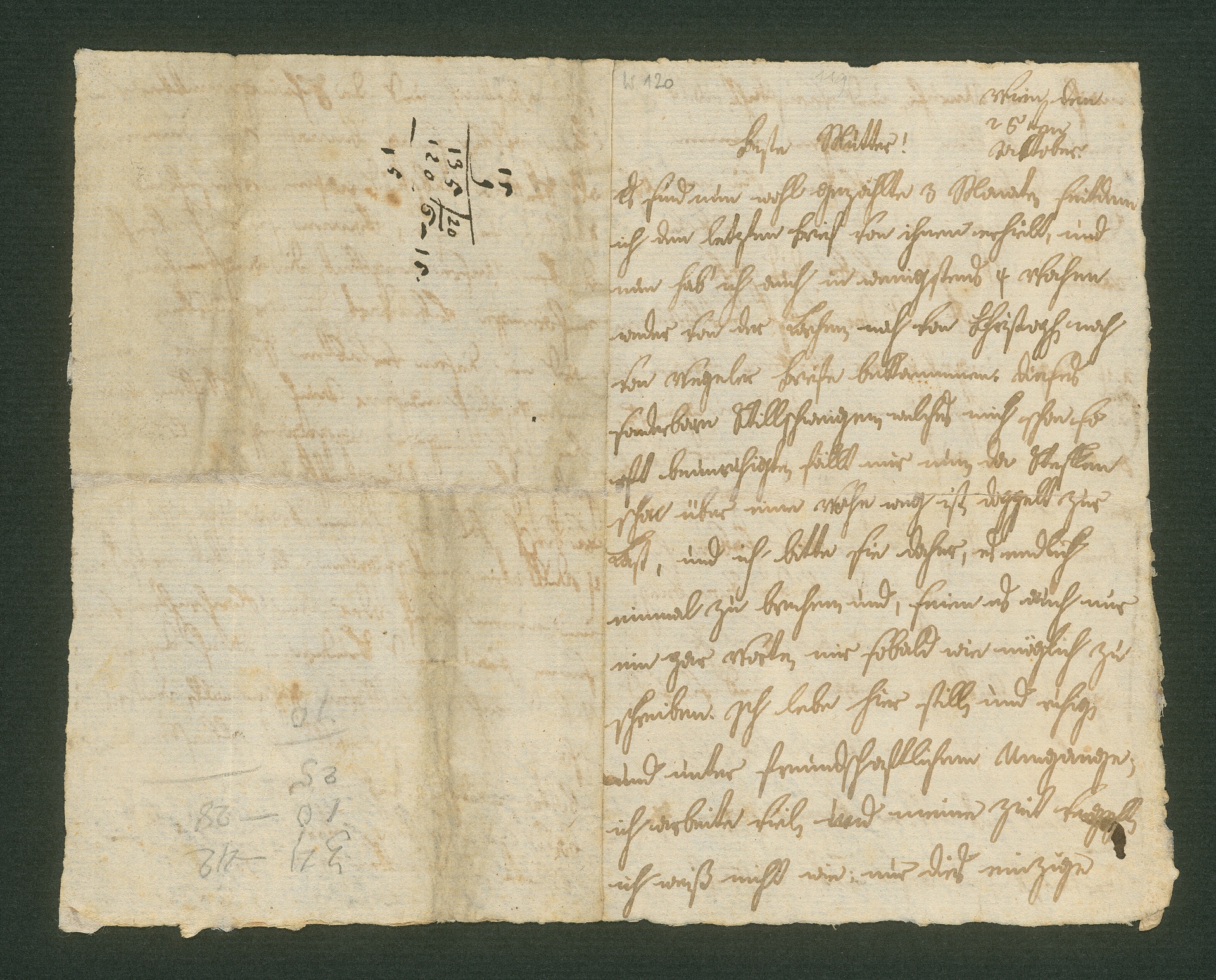 Lorenz von Breuning hat seit drei Monaten keinen Brief von der Mutter erhalten, seit mindestens vier Wochen wartet er auf einen Brief von seinen Geschwistern Eleonore und Christoph und von Wegeler. Das sonderbare Schweigen beunruhigt ihn sehr, und er bittet mehrmals, bald wenigstens einige Worte an ihn zu schreiben. Sobald er versichert worden sei, dass seine Grillen und Launen unberechtigt seien, verspreche das Jahr eines seiner zufriedensten zu werden. Lorenz verbringt seine Tage ruhig und arbeitet viel. Besonders freundschaftlichen Umgang pflegten er und sein Bruder Stephan mit der Familie seines Professors Johann Nepomuk Hunczovsky. Während eines Besuchs der Hunczovskys wurde mit Beethoven und den Vettern Romberg musiziert. Stephan ist vor gut einer Woche nach Mergentheim aufgebrochen. Lorenz vermisst ihn sehr. "Unsre Einigkeit, die angenehme, einförmige Lebensart, die wir führten, wird mir diesen verlebten Sommer unvergesslich mache. Auch ist Steffen von hier sehr ungern weggegangen." Lorenz wird diesen Abend noch Beethoven besuchen. (F.G.)