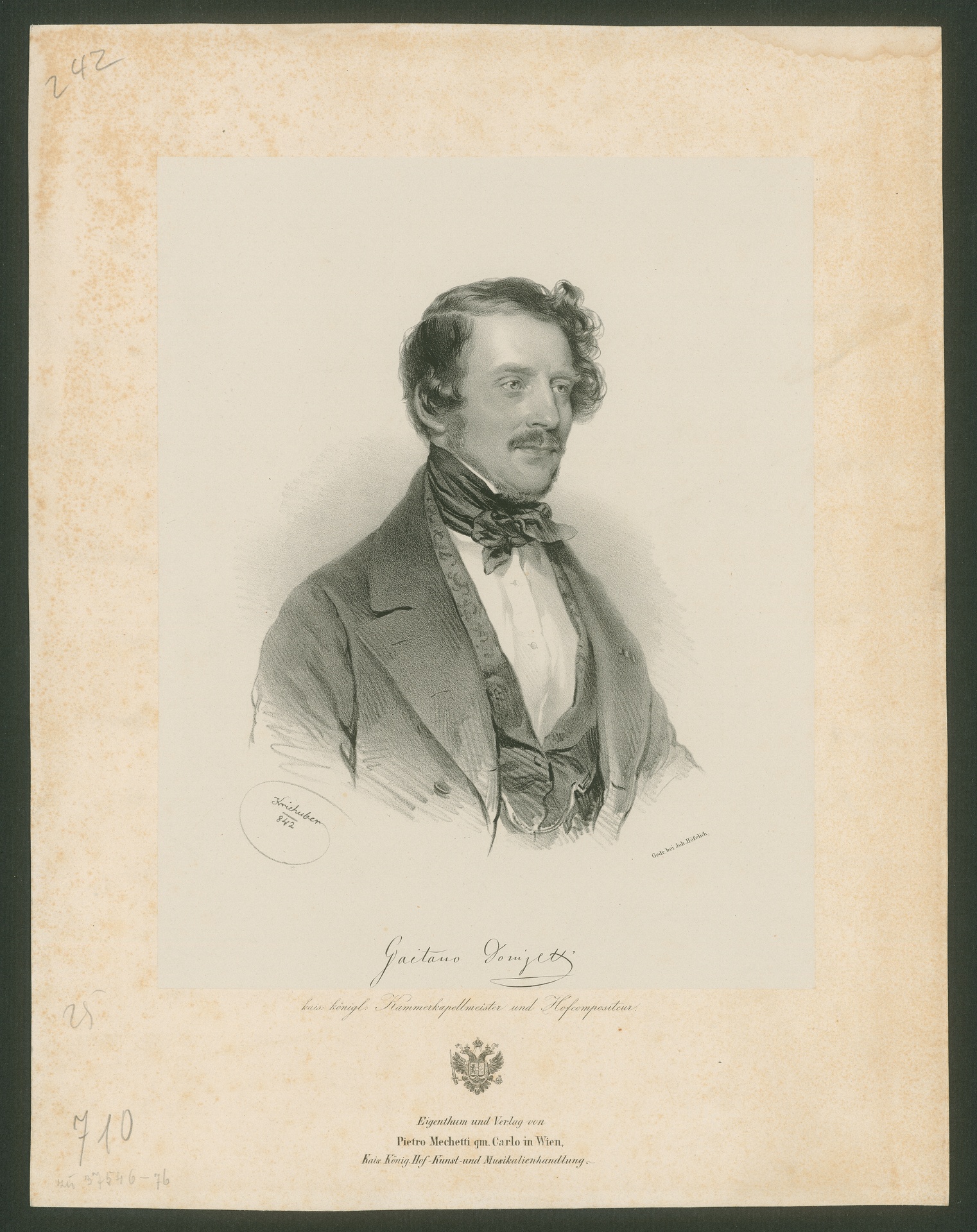 Gaetano Donizetti (1797-1848) - Lithographie von Josef Kriehuber, gedruckt bei Johann Höfelich, erschienen im Verlag Mechetti, Wien, 1842