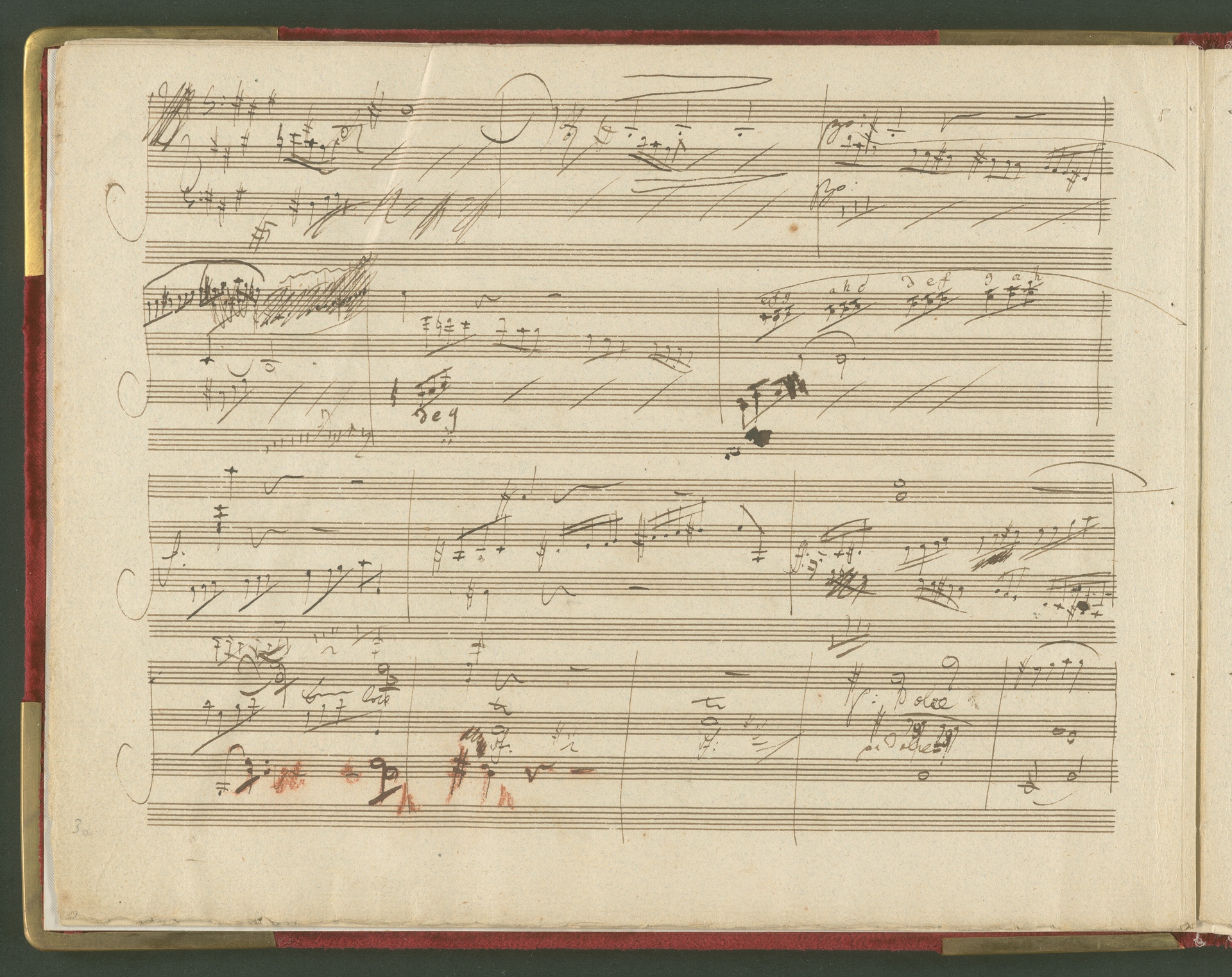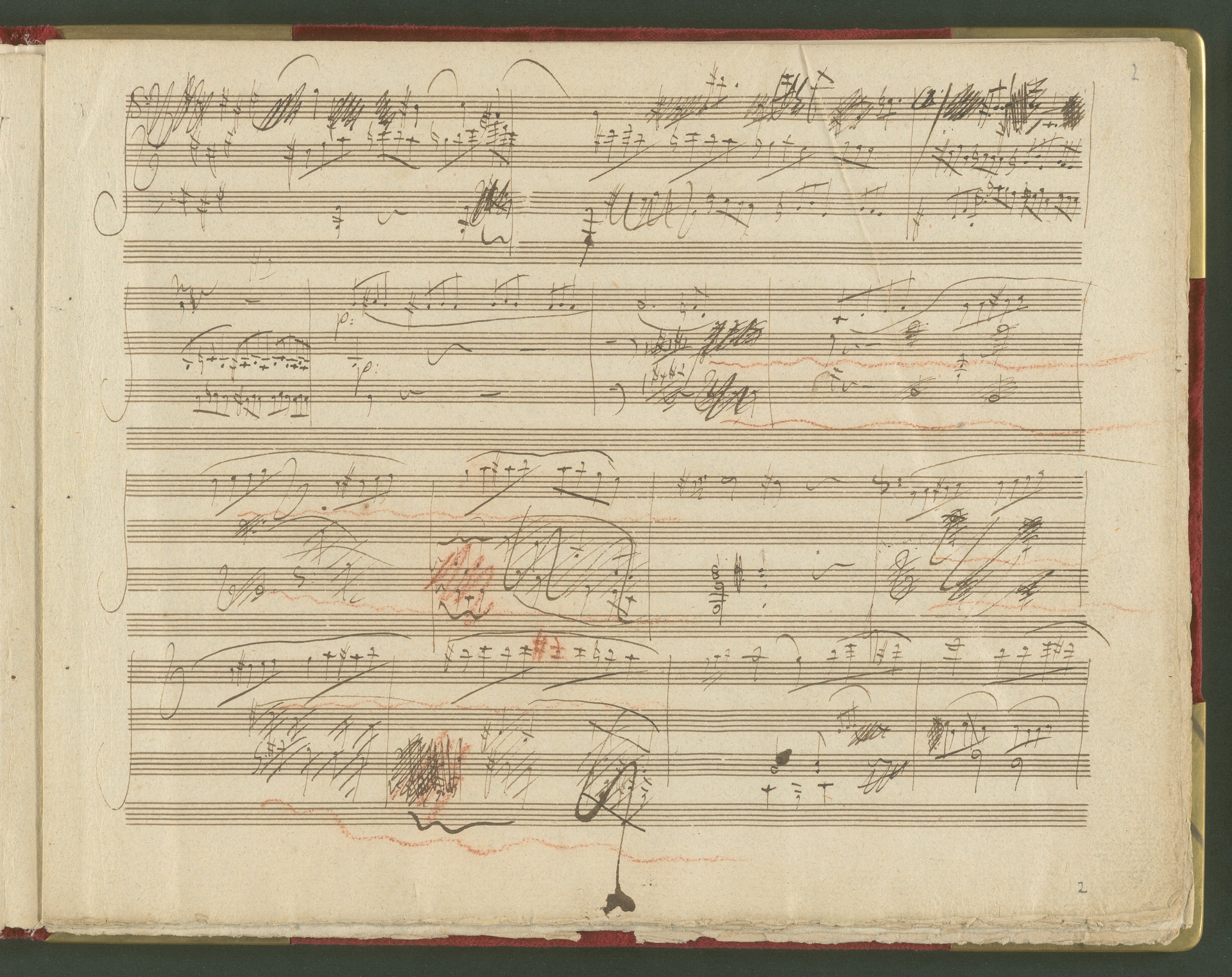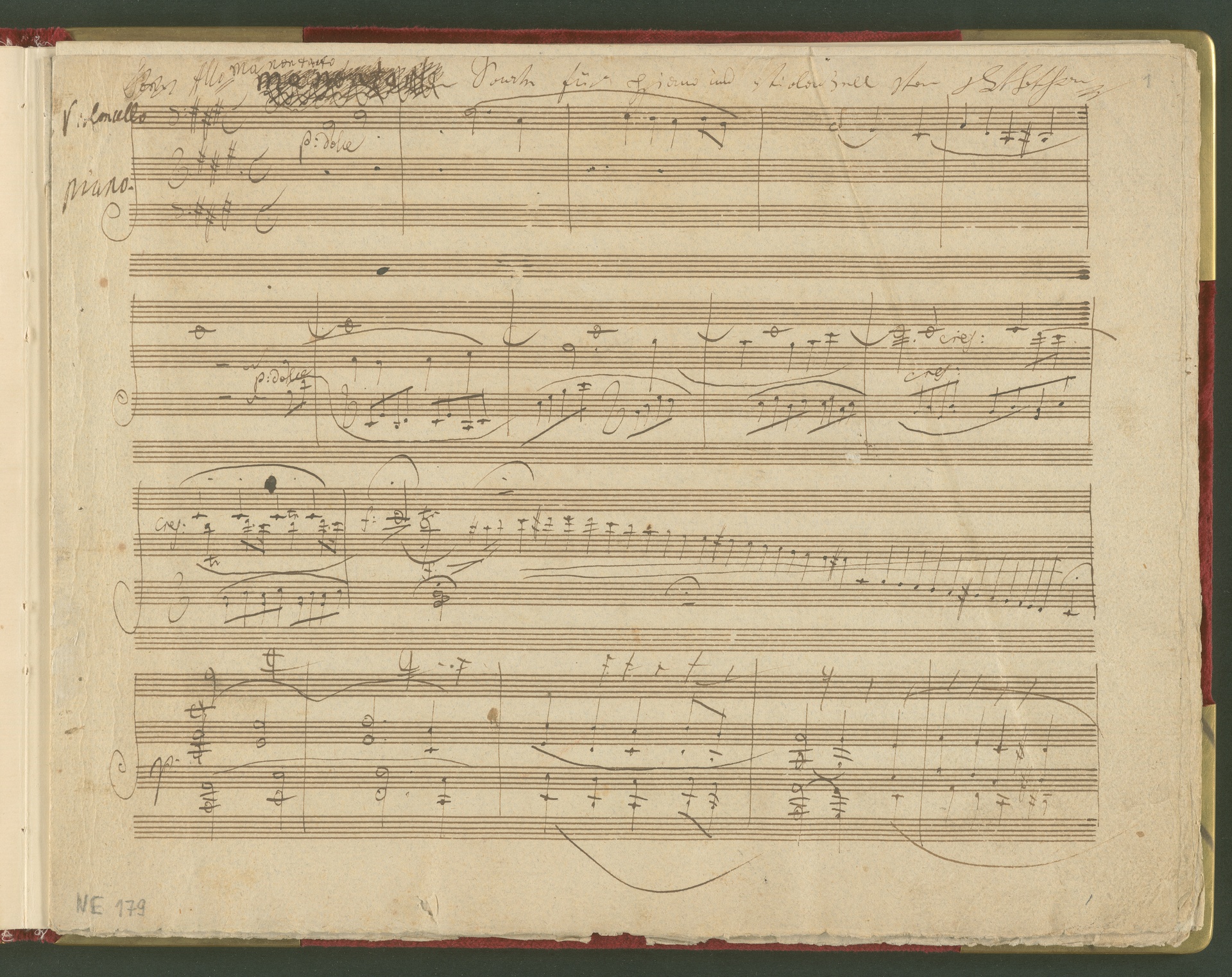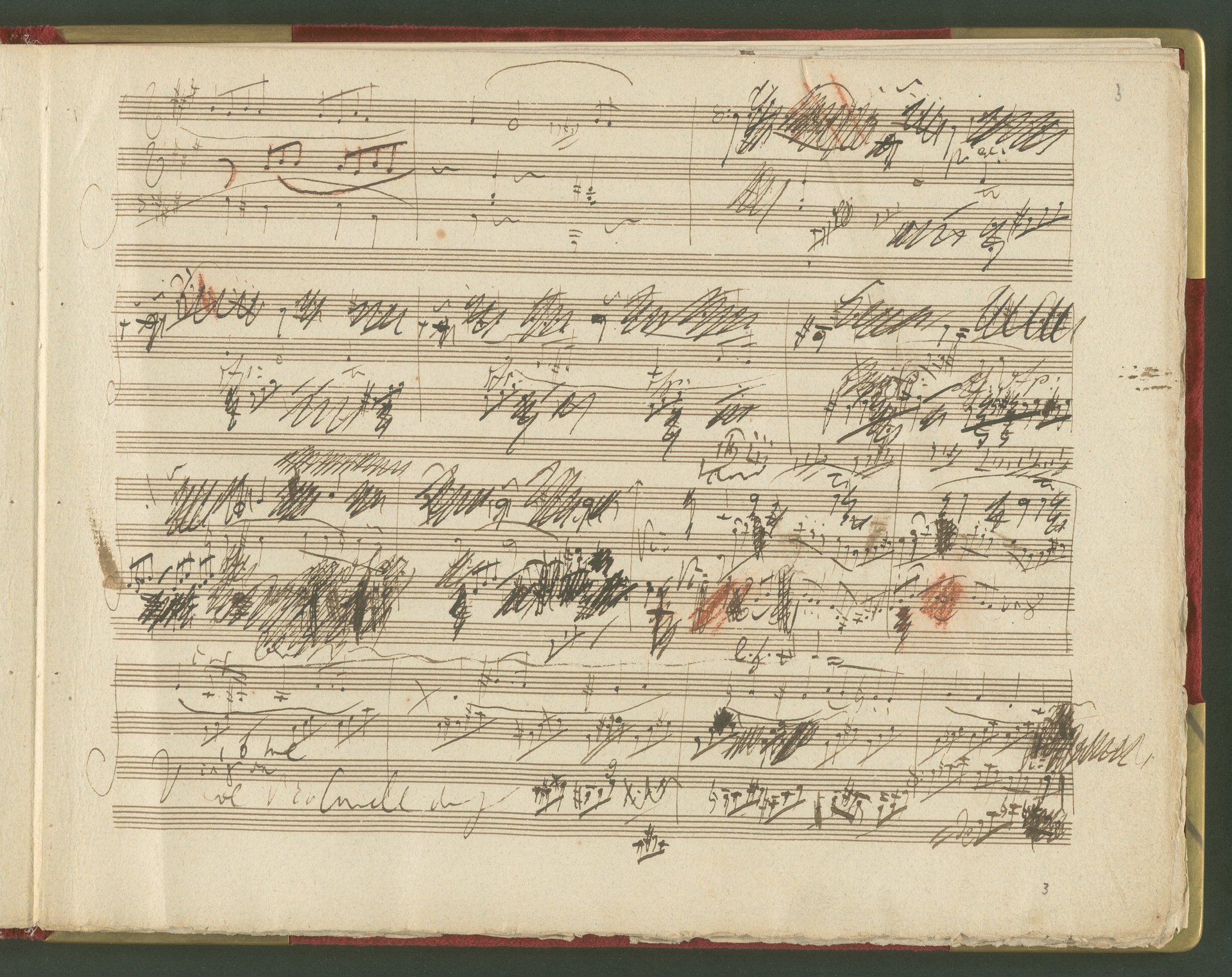 Der erste Satz der Sonate für Violoncello und Klavier op. 69 ist eine der wichtigsten und kostbarsten Erwerbungen des Beethoven-Hauses der 1990er Jahre. Von der Sonate existiert kein vollständiges Autograph, dieser 1. Satz in einer ersten Fassung ist neben den Skizzen die einzige überlieferte Quelle von Beethovens Hand. Lagenstruktur und Notentext lassen annehmen, dass die Handschrift ursprünglich vollständig war und alle Sätze enthielt. Wahrscheinlich ist Beethoven selbst für die fragmentarische Überlieferung verantwortlich (nach mehreren Korrekturgängen war das Manuskript so unleserlich geworden, dass er es möglicherweise niemandem, nicht einmal dem besten Kopisten mehr zumuten wollte). Das vorliegende Autograph enthält nicht die Fassung letzter Hand, vielmehr spiegelt es den Entstehungsprozeß eines Werkes über mehrere Stadien hinweg wider. Beethoven hatte den Notentext als Reinschrift begonnen - die erste Seite (Bild 2) sieht ordentlich und sauber aus, man könnte mühelos daraus musizieren. Im Laufe der Arbeit degenerierte die Niederschrift jedoch zur Skizze. Insgesamt sind drei Schichten zu erkennen: Die erste Schreibschicht enthält eine vollständige Fassung des ersten Satzes, die jedoch von der in der Originalausgabe gedruckten Version noch deutlich abweicht. Über dieser Frühfassung liegen zwei Korrekturgänge. Während die Urfassung mit heller Tinte und feiner Feder geschrieben war, wurden die Revisionen mit unterschiedlichen dunkleren Tinten, breiteren Federn und auch mit Rötel ausgeführt. An einigen Stellen sind die Korrekturen so vehement, dass die darunter liegende erste Schicht nur noch mit Mühe lesbar ist. Trotz der unzähligen Überarbeitungen erreicht das Autograph keineswegs die endgültige gedruckte Fassung. Mit Sicherheit hat Beethoven ein zweites vollständiges Manuskript verfasst, das heute verschollen ist. Auch in der Stichvorlage, ja sogar noch nach Erscheinen der Originalausgabe brachte der Komponist weitere Nachbesserungen an.(J.R.)