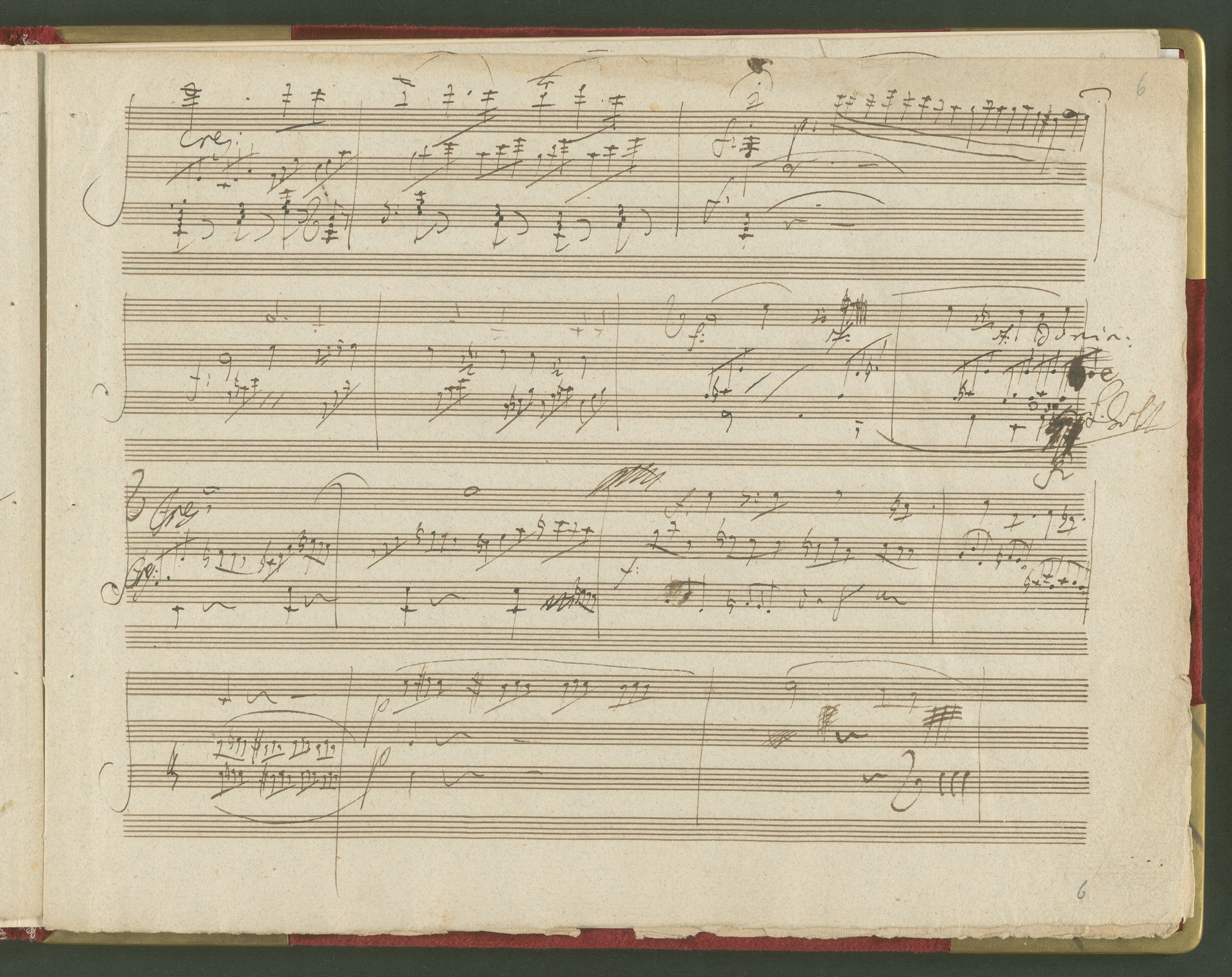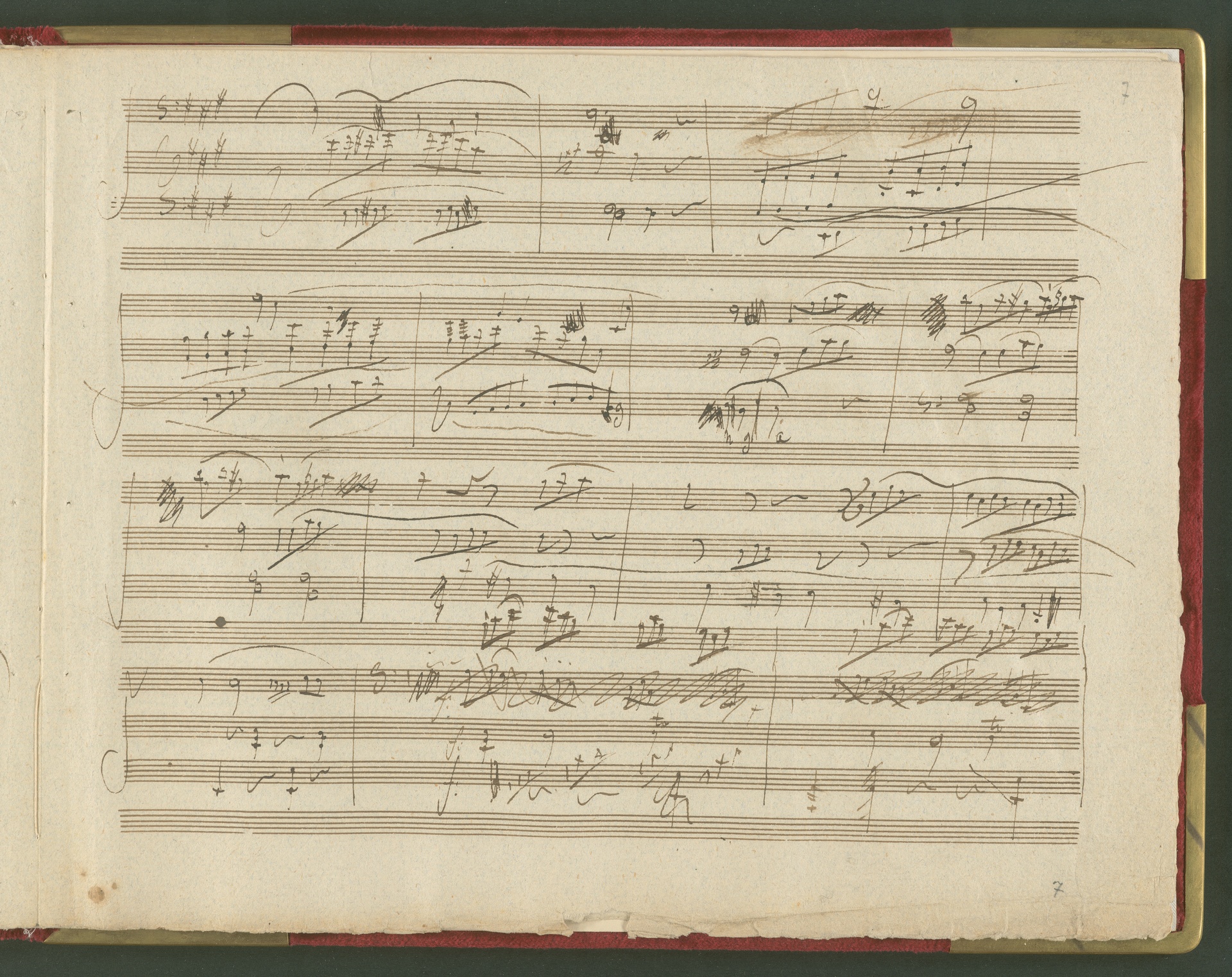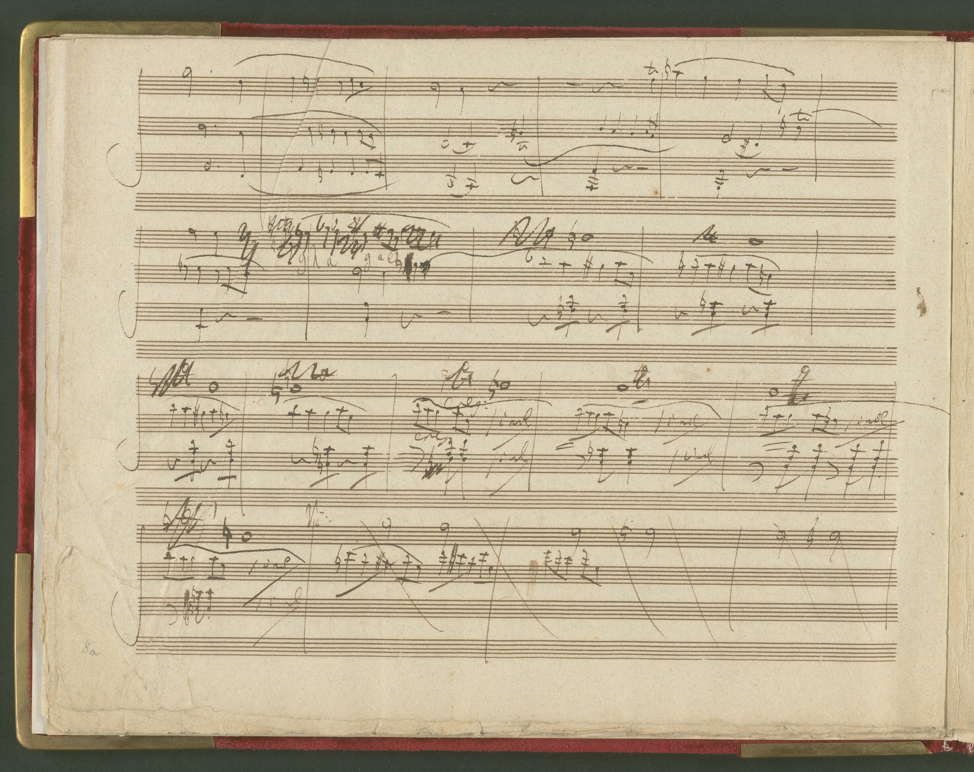 Der erste Satz der Sonate für Violoncello und Klavier op. 69 ist eine der wichtigsten und kostbarsten Erwerbungen des Beethoven-Hauses der 1990er Jahre. Von der Sonate existiert kein vollständiges Autograph, dieser 1. Satz in einer ersten Fassung ist neben den Skizzen die einzige überlieferte Quelle von Beethovens Hand. Lagenstruktur und Notentext lassen annehmen, dass die Handschrift ursprünglich vollständig war und alle Sätze enthielt. Wahrscheinlich ist Beethoven selbst für die fragmentarische Überlieferung verantwortlich (nach mehreren Korrekturgängen war das Manuskript so unleserlich geworden, dass er es möglicherweise niemandem, nicht einmal dem besten Kopisten mehr zumuten wollte). Das vorliegende Autograph enthält nicht die Fassung letzter Hand, vielmehr spiegelt es den Entstehungsprozeß eines Werkes über mehrere Stadien hinweg wider. Beethoven hatte den Notentext als Reinschrift begonnen - die erste Seite (Bild 2) sieht ordentlich und sauber aus, man könnte mühelos daraus musizieren. Im Laufe der Arbeit degenerierte die Niederschrift jedoch zur Skizze. Insgesamt sind drei Schichten zu erkennen: Die erste Schreibschicht enthält eine vollständige Fassung des ersten Satzes, die jedoch von der in der Originalausgabe gedruckten Version noch deutlich abweicht. Über dieser Frühfassung liegen zwei Korrekturgänge. Während die Urfassung mit heller Tinte und feiner Feder geschrieben war, wurden die Revisionen mit unterschiedlichen dunkleren Tinten, breiteren Federn und auch mit Rötel ausgeführt. An einigen Stellen sind die Korrekturen so vehement, dass die darunter liegende erste Schicht nur noch mit Mühe lesbar ist. Trotz der unzähligen Überarbeitungen erreicht das Autograph keineswegs die endgültige gedruckte Fassung. Mit Sicherheit hat Beethoven ein zweites vollständiges Manuskript verfasst, das heute verschollen ist. Auch in der Stichvorlage, ja sogar noch nach Erscheinen der Originalausgabe brachte der Komponist weitere Nachbesserungen an.(J.R.)