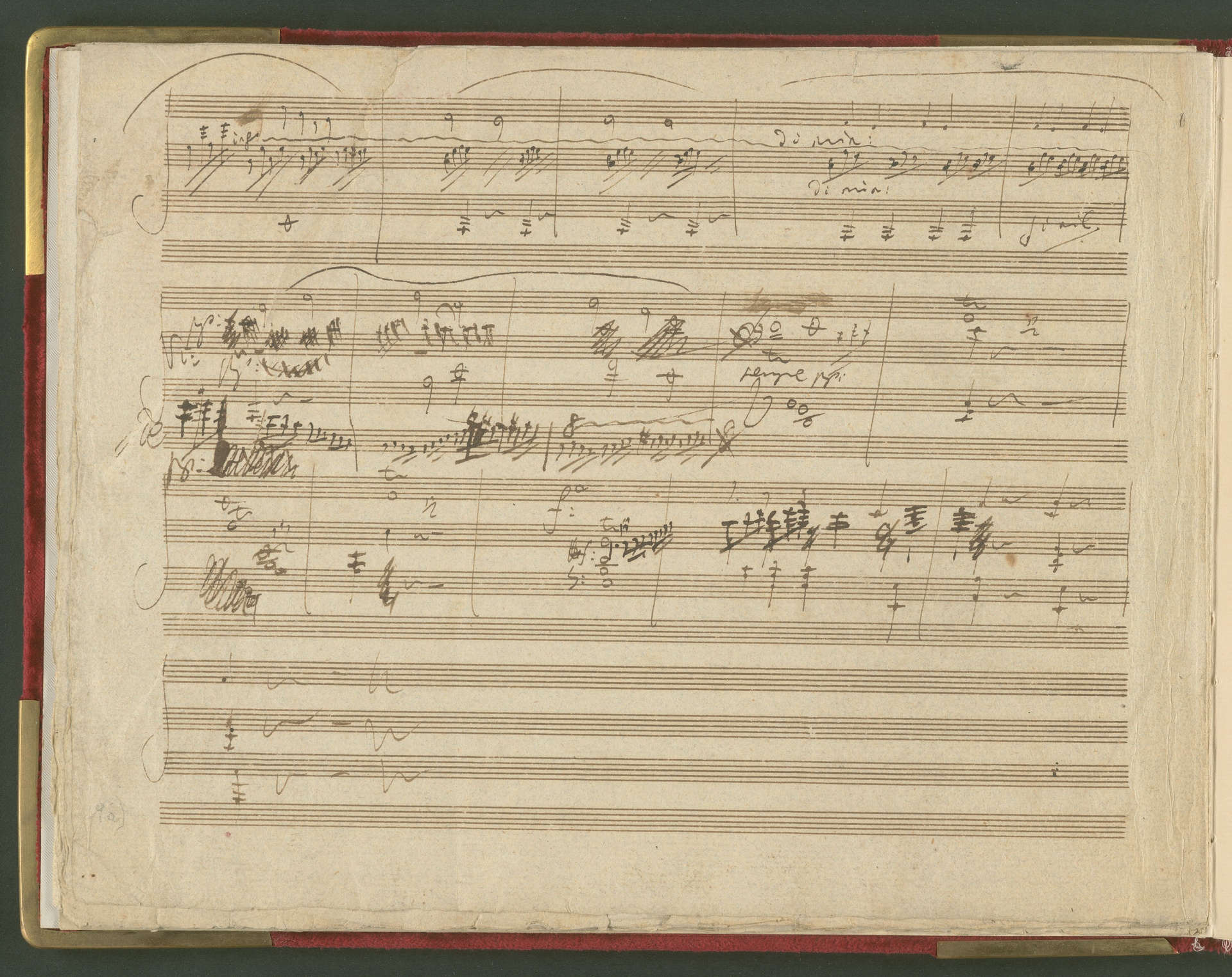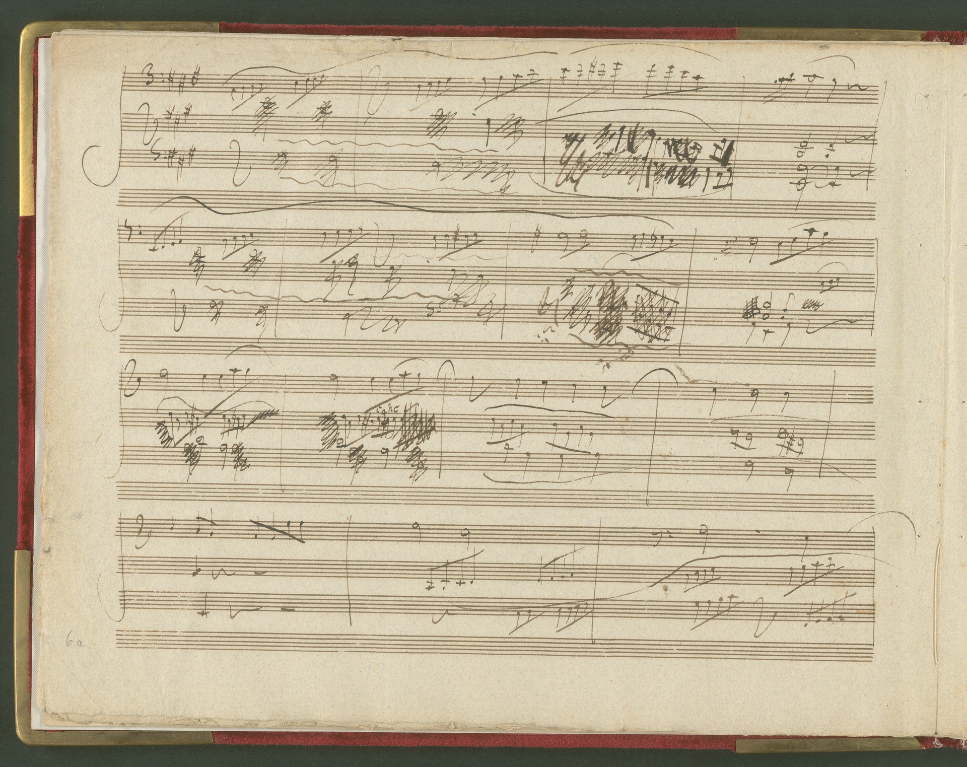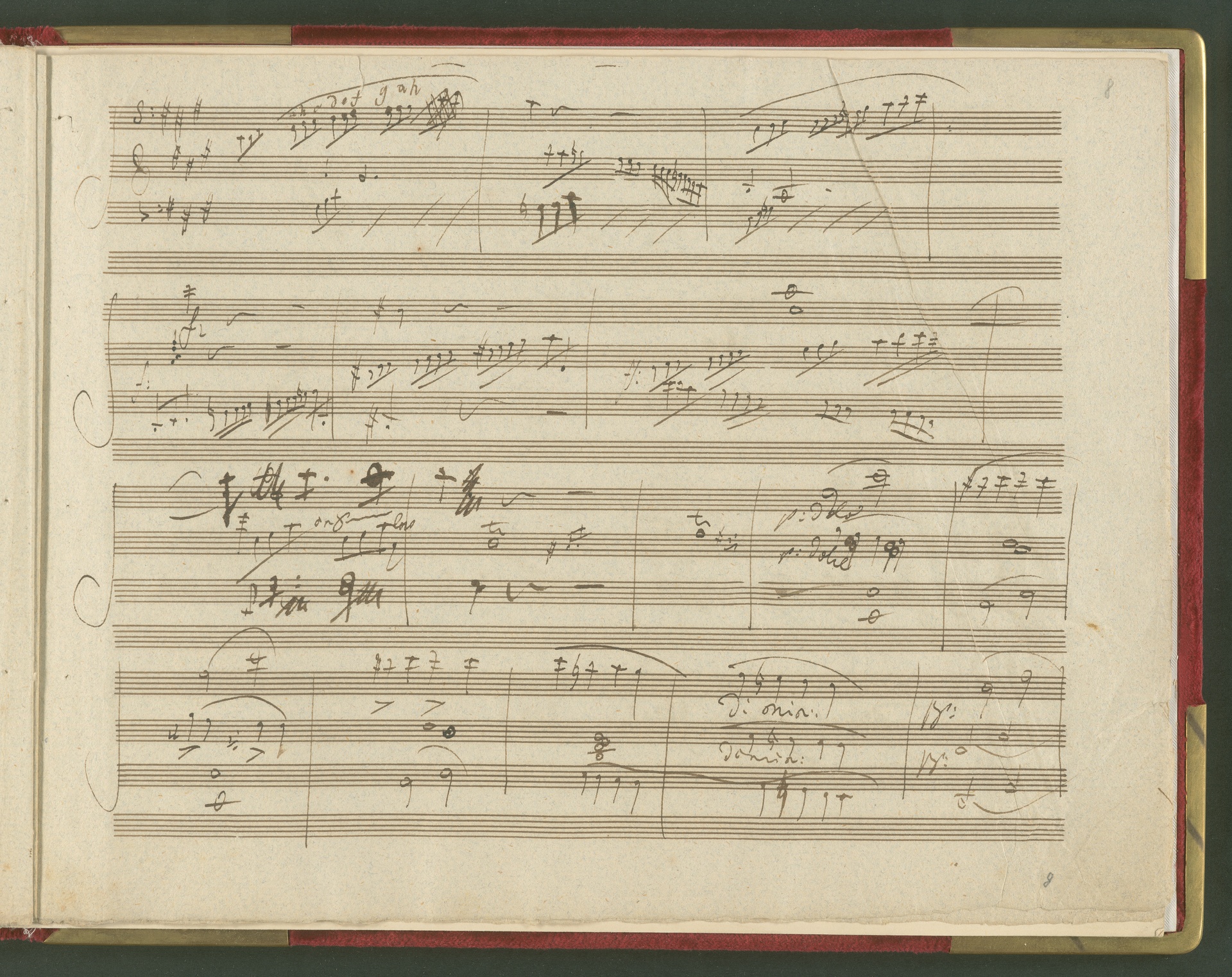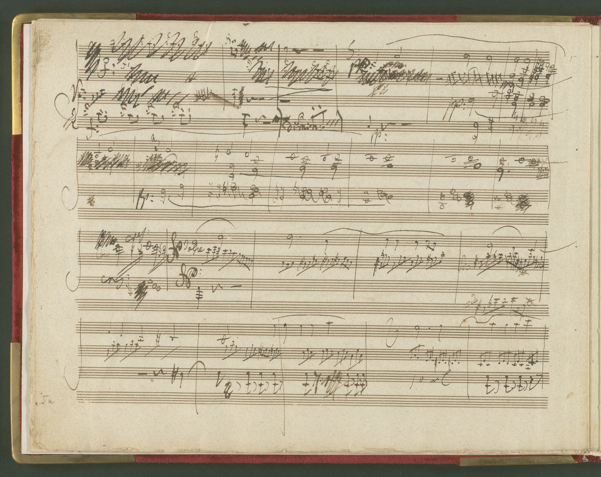 Der erste Satz der Sonate für Violoncello und Klavier op. 69 ist eine der wichtigsten und kostbarsten Erwerbungen des Beethoven-Hauses der 1990er Jahre. Von der Sonate existiert kein vollständiges Autograph, dieser 1. Satz in einer ersten Fassung ist neben den Skizzen die einzige überlieferte Quelle von Beethovens Hand. Lagenstruktur und Notentext lassen annehmen, dass die Handschrift ursprünglich vollständig war und alle Sätze enthielt. Wahrscheinlich ist Beethoven selbst für die fragmentarische Überlieferung verantwortlich (nach mehreren Korrekturgängen war das Manuskript so unleserlich geworden, dass er es möglicherweise niemandem, nicht einmal dem besten Kopisten mehr zumuten wollte). Das vorliegende Autograph enthält nicht die Fassung letzter Hand, vielmehr spiegelt es den Entstehungsprozeß eines Werkes über mehrere Stadien hinweg wider. Beethoven hatte den Notentext als Reinschrift begonnen - die erste Seite (Bild 2) sieht ordentlich und sauber aus, man könnte mühelos daraus musizieren. Im Laufe der Arbeit degenerierte die Niederschrift jedoch zur Skizze. Insgesamt sind drei Schichten zu erkennen: Die erste Schreibschicht enthält eine vollständige Fassung des ersten Satzes, die jedoch von der in der Originalausgabe gedruckten Version noch deutlich abweicht. Über dieser Frühfassung liegen zwei Korrekturgänge. Während die Urfassung mit heller Tinte und feiner Feder geschrieben war, wurden die Revisionen mit unterschiedlichen dunkleren Tinten, breiteren Federn und auch mit Rötel ausgeführt. An einigen Stellen sind die Korrekturen so vehement, dass die darunter liegende erste Schicht nur noch mit Mühe lesbar ist. Trotz der unzähligen Überarbeitungen erreicht das Autograph keineswegs die endgültige gedruckte Fassung. Mit Sicherheit hat Beethoven ein zweites vollständiges Manuskript verfasst, das heute verschollen ist. Auch in der Stichvorlage, ja sogar noch nach Erscheinen der Originalausgabe brachte der Komponist weitere Nachbesserungen an.(J.R.)