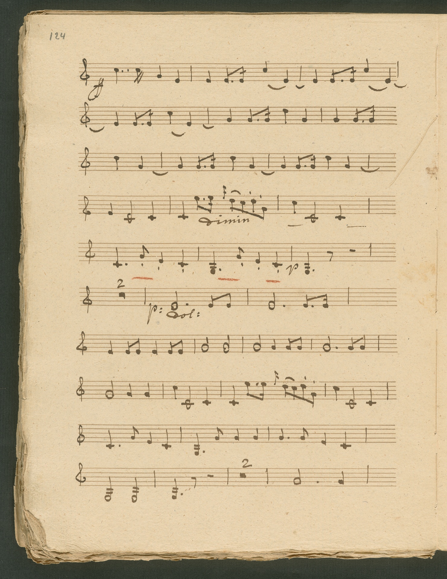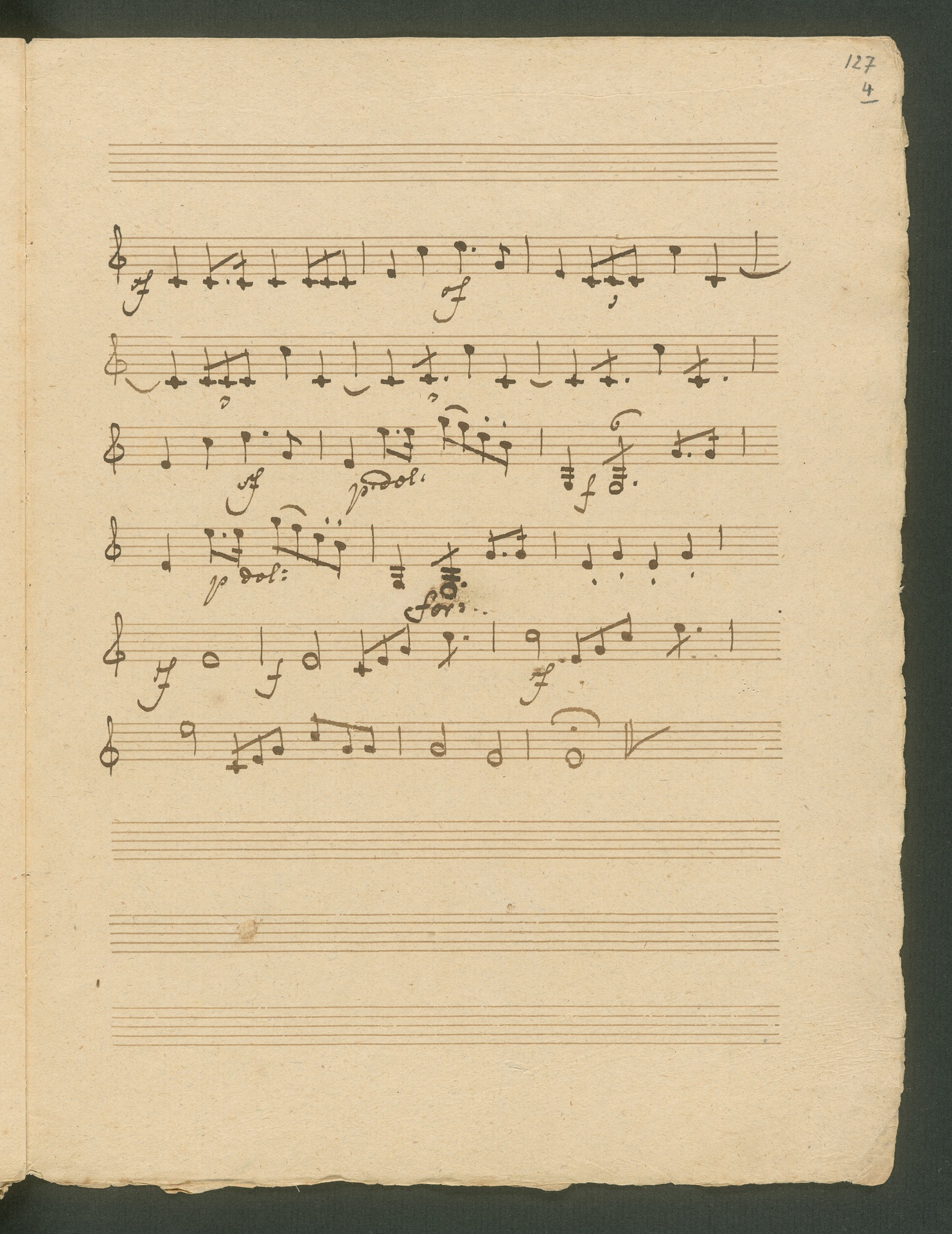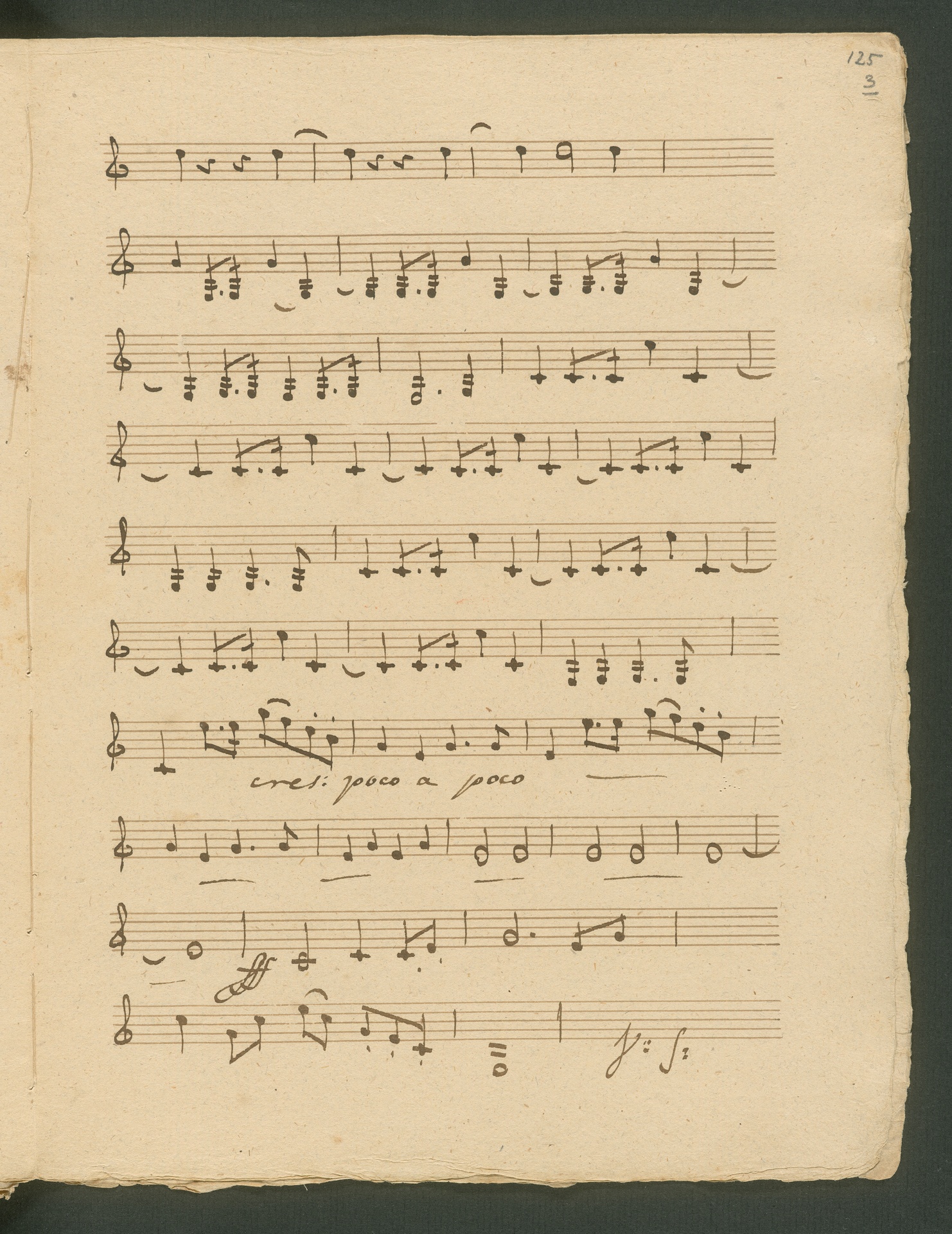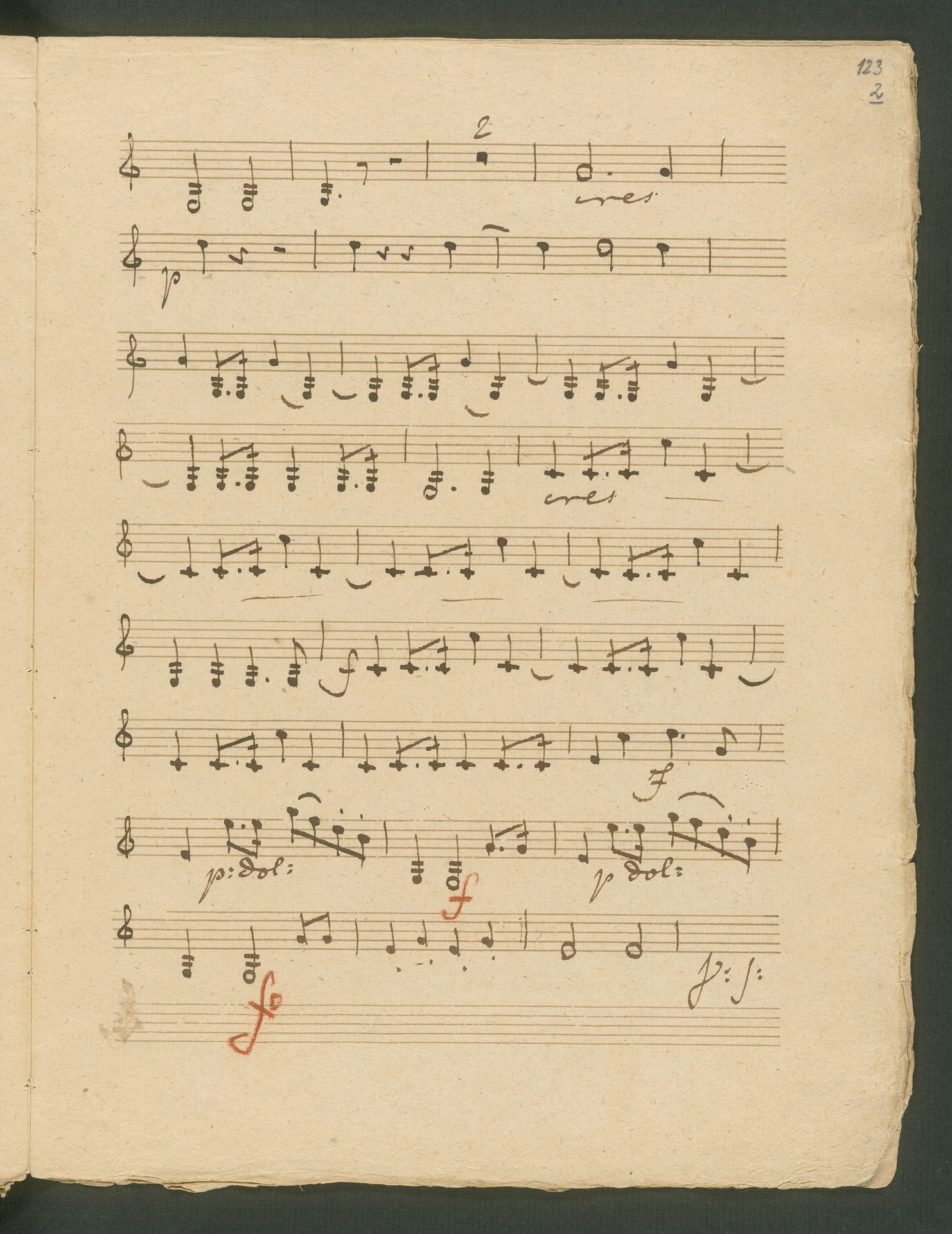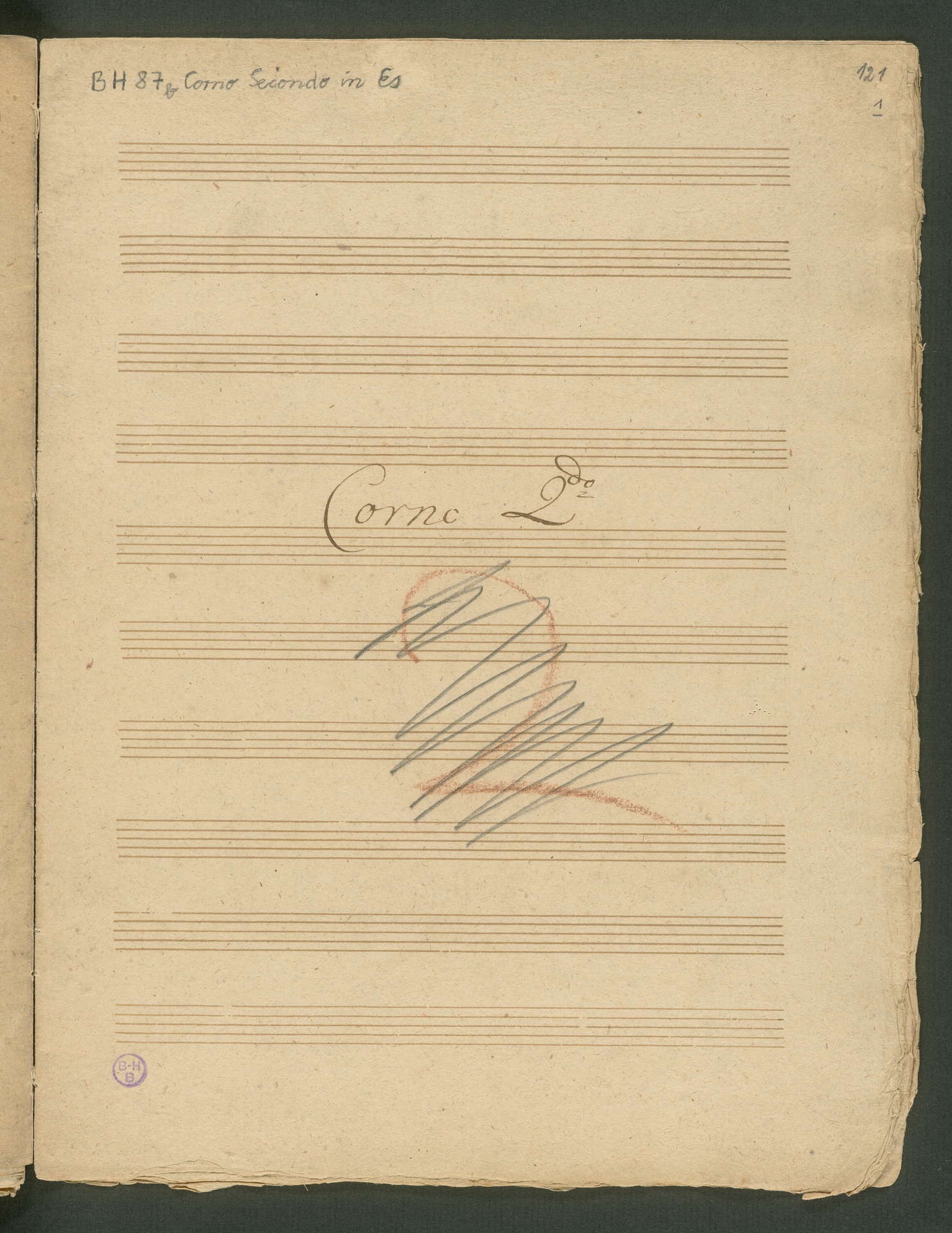 "Kaum bin ich hier, so befindet sich ein Theaterdirektor, der ein Theater in Wien erbaut, und es mit einem Werke von mir eröffnet, hier, dem zu Gefallen ich einige neue Stücke hiezu schreiben mußte." (BGA 1496. Beethoven an Carl Friedrich Peters in Leipzig, 13. September 1822). Der Theaterdirektor, von dem Beethoven aus dem Kurort Baden bei Wien nach Leipzig berichtet, ist Karl Friedrich Hensler, Direktor des Theaters in der Josephstadt, das am 3. Oktober 1822 nach einem Umbau feierlich wiedereröffnet wurde. Das Theater wurde mit dem Festspiel "Die Weihe des Hauses" von Carl Meisl neu eingeweiht, für das Beethoven seine Musik zu den "Ruinen von Athen" op. 113 umarbeitete. Die Ouvertüre (op. 124) und den Chor "Wo sich die Pulse jugendlich jagen" (WoO 98) komponierte er neu, den Marsch mit Chor "Schmückt die Altäre" (op. 113 Nr. 6) arbeitete er zu diesem Zweck um (op. 114). Die vorliegende Stimme für das 2. Horn, eine saubere Abschrift von Beethovens Kopist Wenzel Rampl, ist bislang zu diesem Marsch die einzige bekannte Stimmenabschrift. Sie ist irrtümlich in Stimmenmaterial zu op. 116 eingebunden - vermutlich entstand sie also schon für ein Konzert 1814. Möglicherweise ließ Beethoven die Hornstimme jedoch auch erst im Zuge der Aufführung zur Weihe des Hauses 1822 anfertigen.