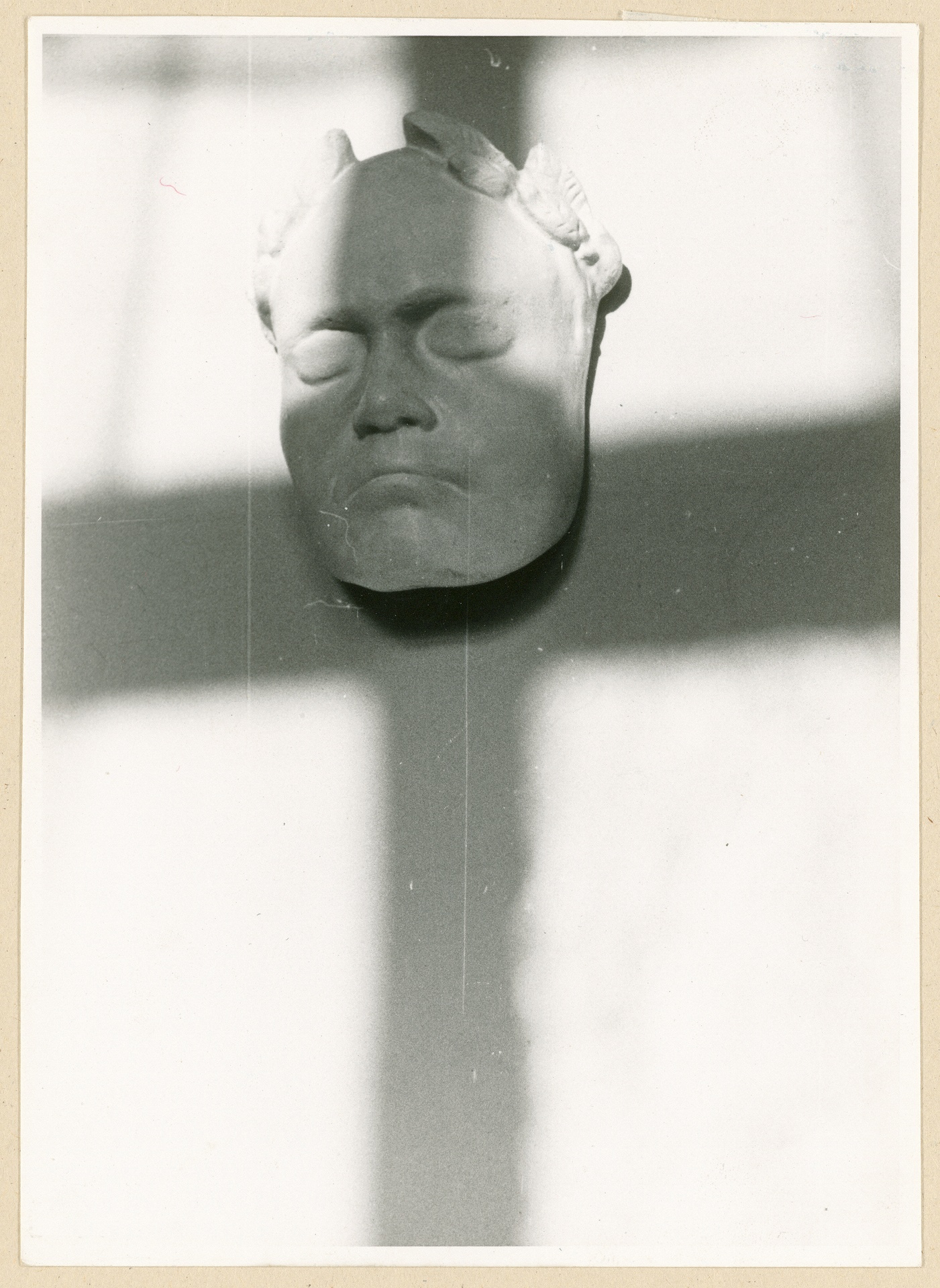 "Beethoven im Schatten des Kreuzes" - Fotografie von Kurt Mittag nach der 1812 von Franz Klein abgenommenen Lebendmaske Beethovens, beschattet von einem großen Kreuz, um 1966