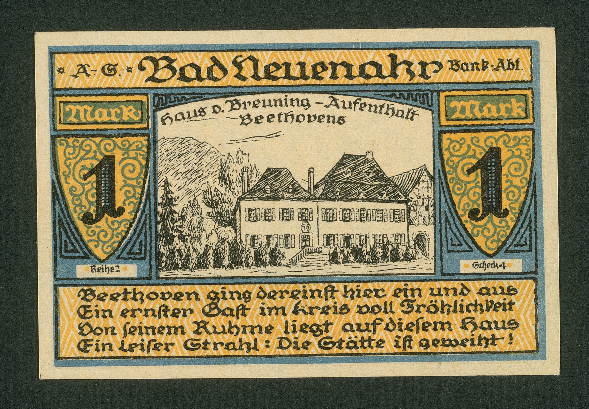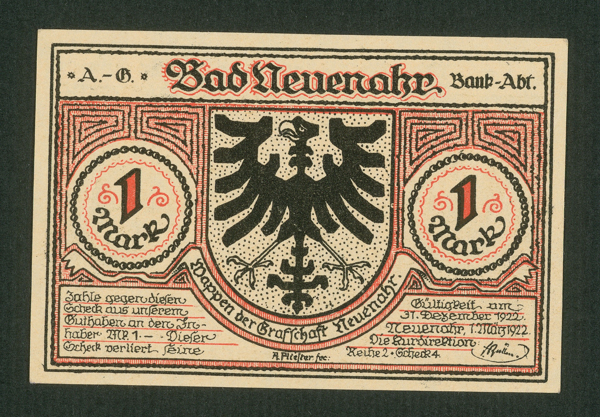 Bad Neuenahr, Wohnung der Familie von Breuning - Zeichnung von A. Pliester, gedruckt auf einem Scheck über 1 Mark, ausgestellt von der Stadt Bad Neuenahr