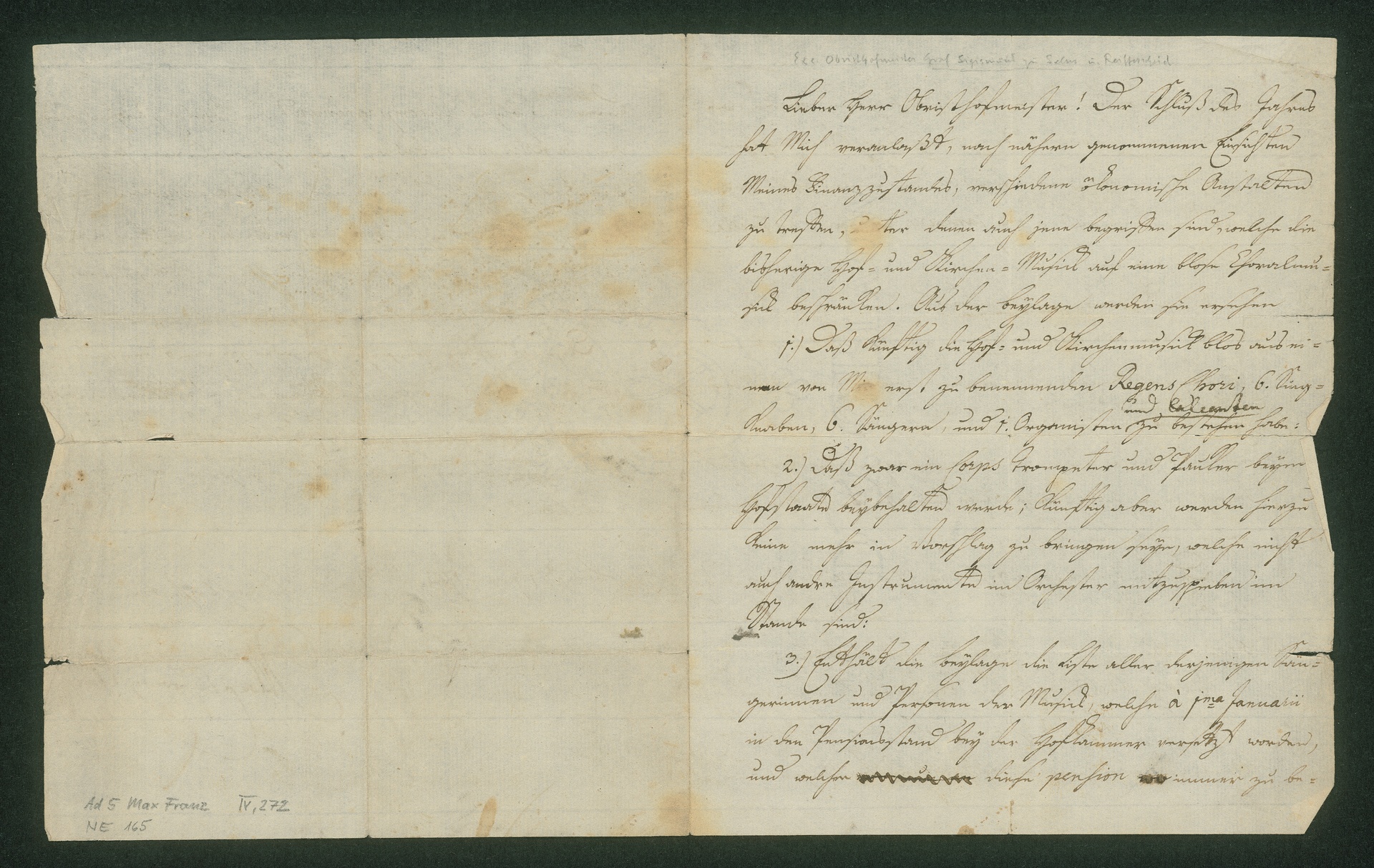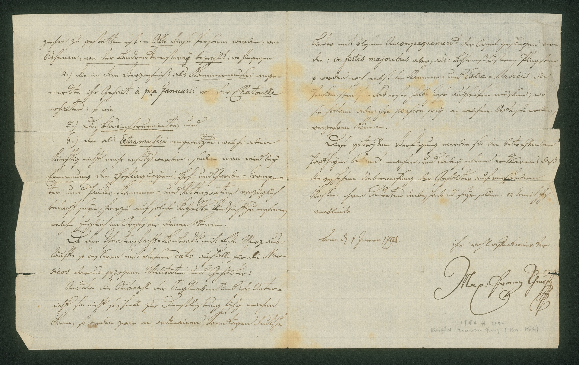 Der Kurfürst und Erzbischof von Köln, Maximilian Franz, teilt seinem Obristhofmeister Graf Sigismund zu Salm und Reifferscheid mit, in Anbetracht der angespannten Finanzlage müsse er die Hofkapelle auf ein Minimum an Personal reduzieren und erläutert seine Vorstellungen diesbezüglich.