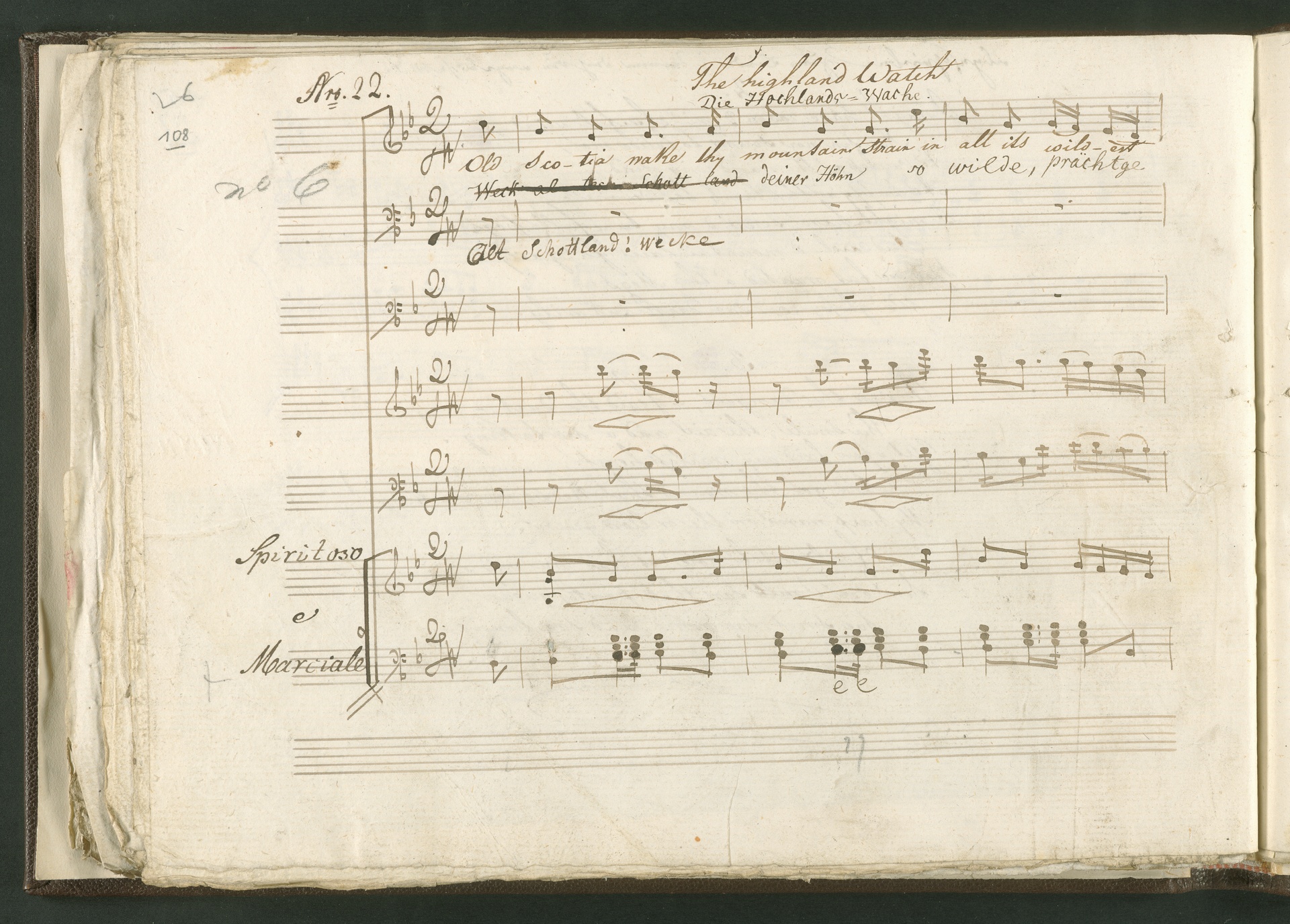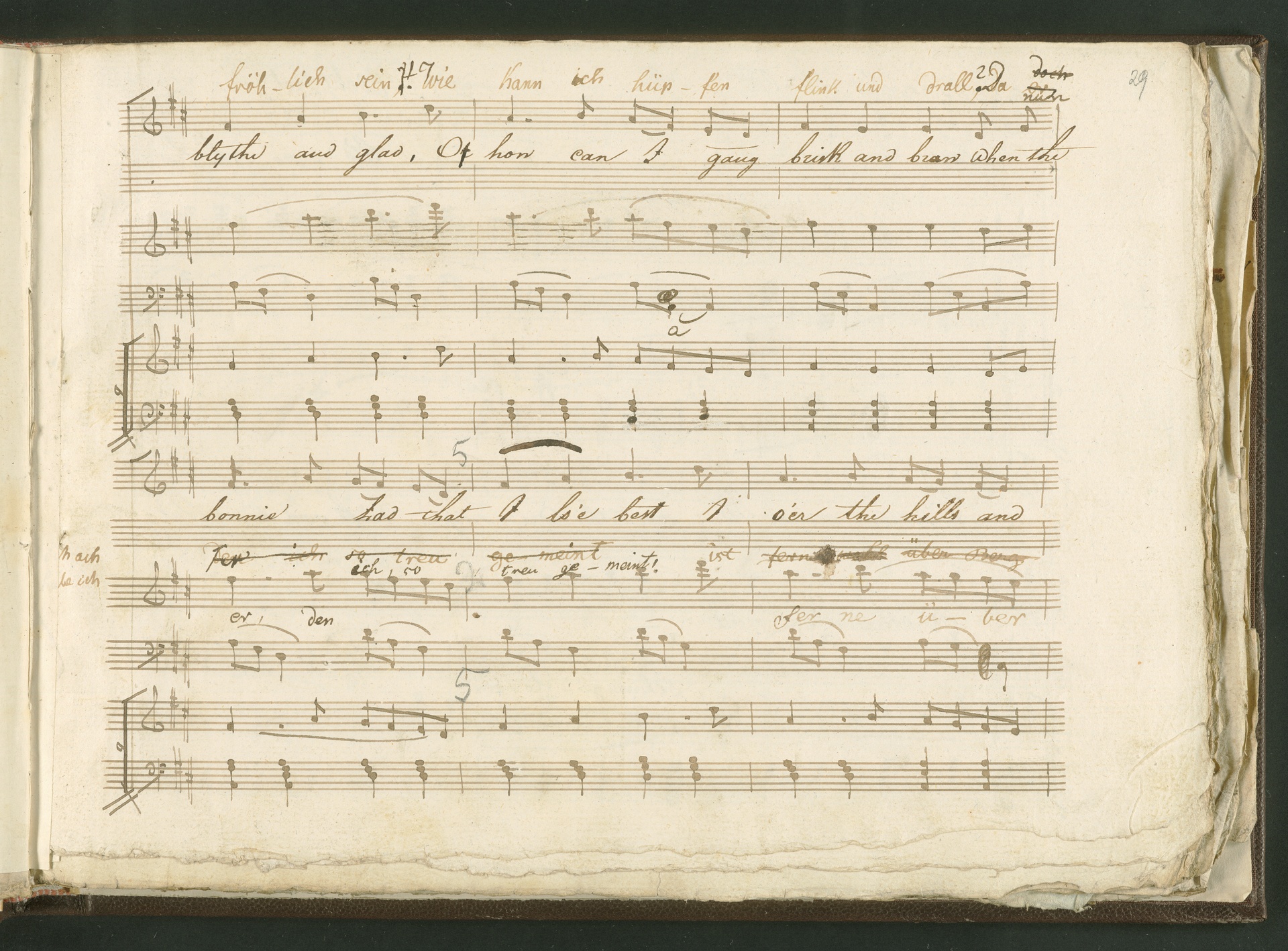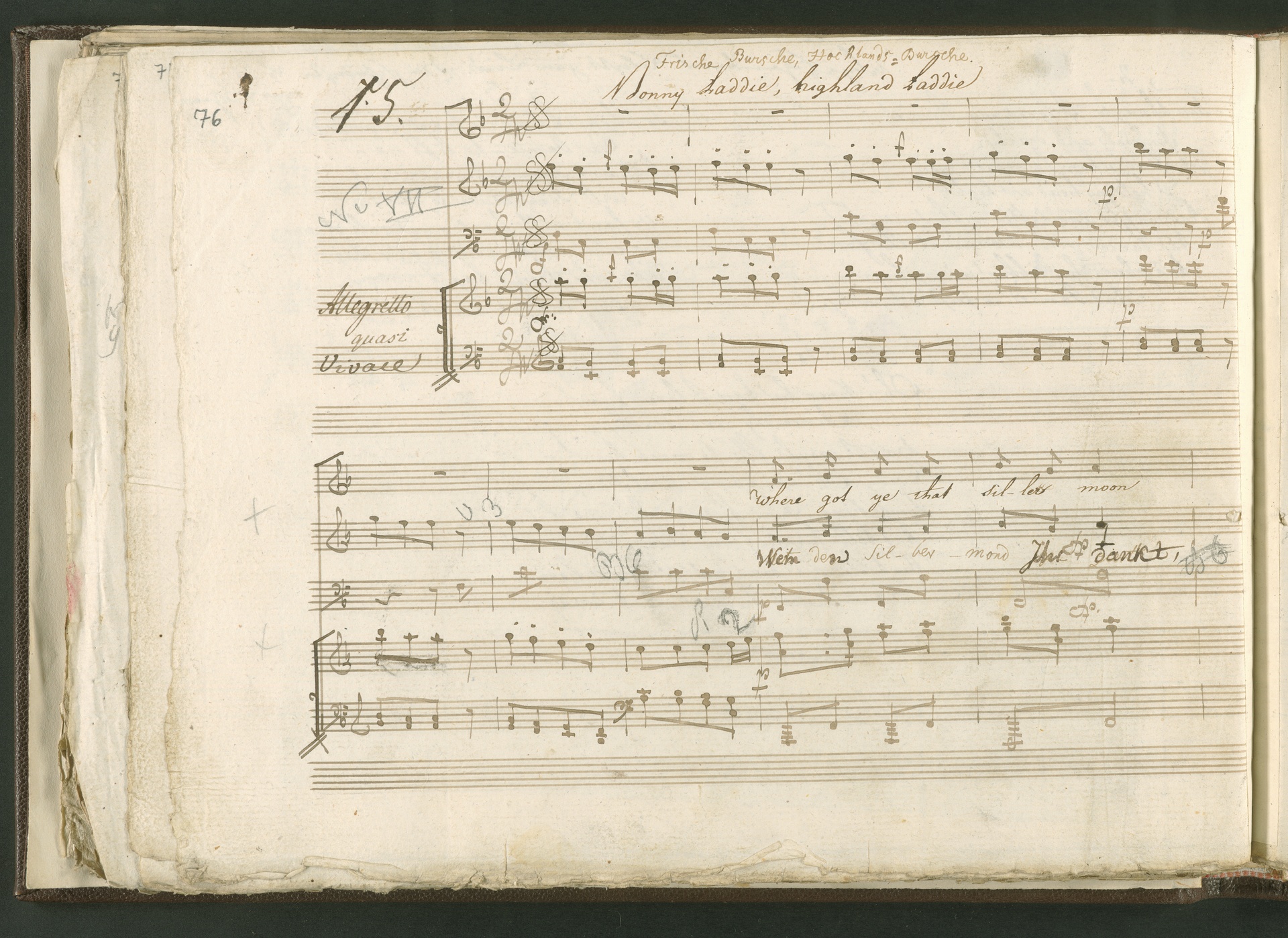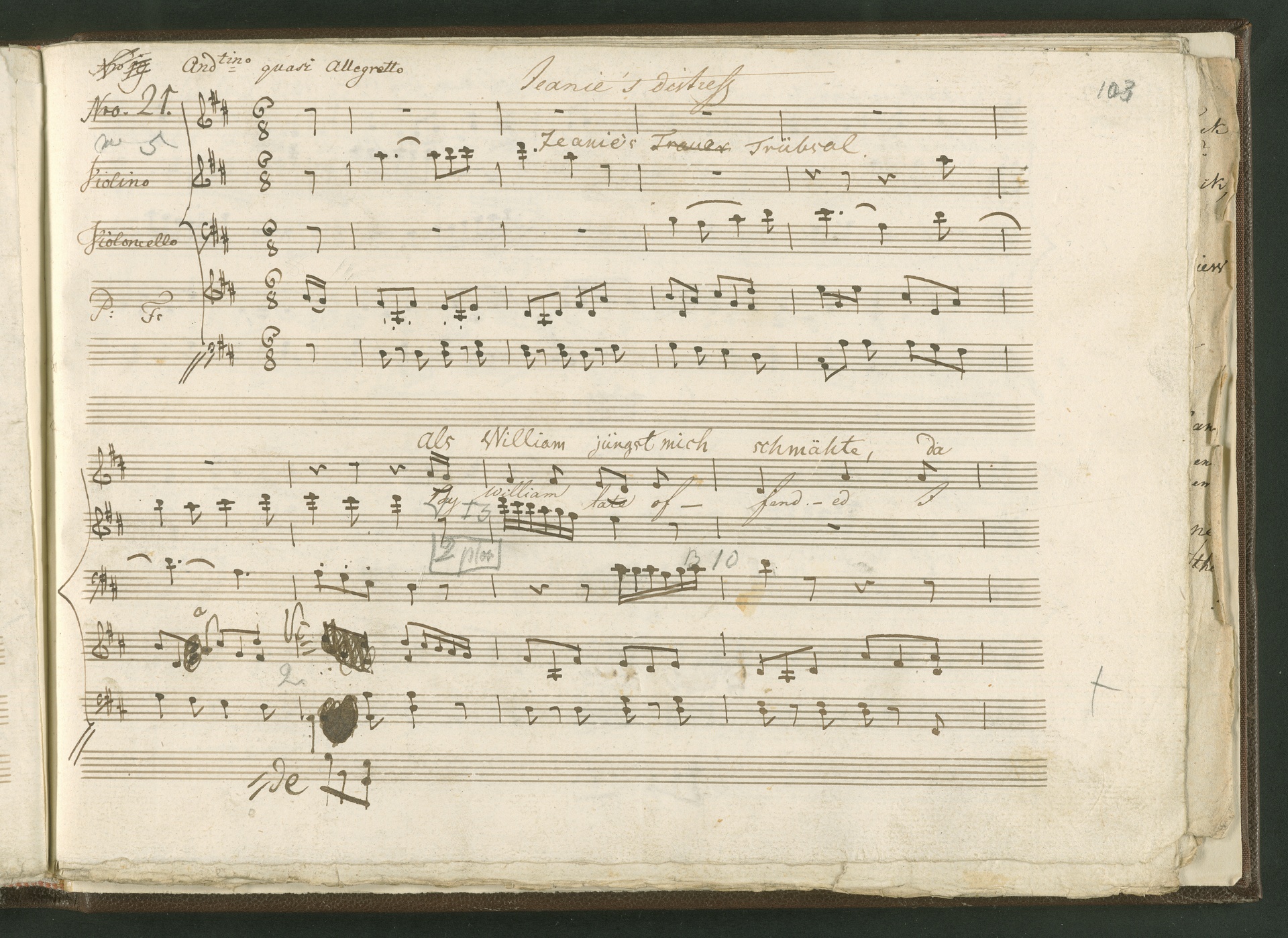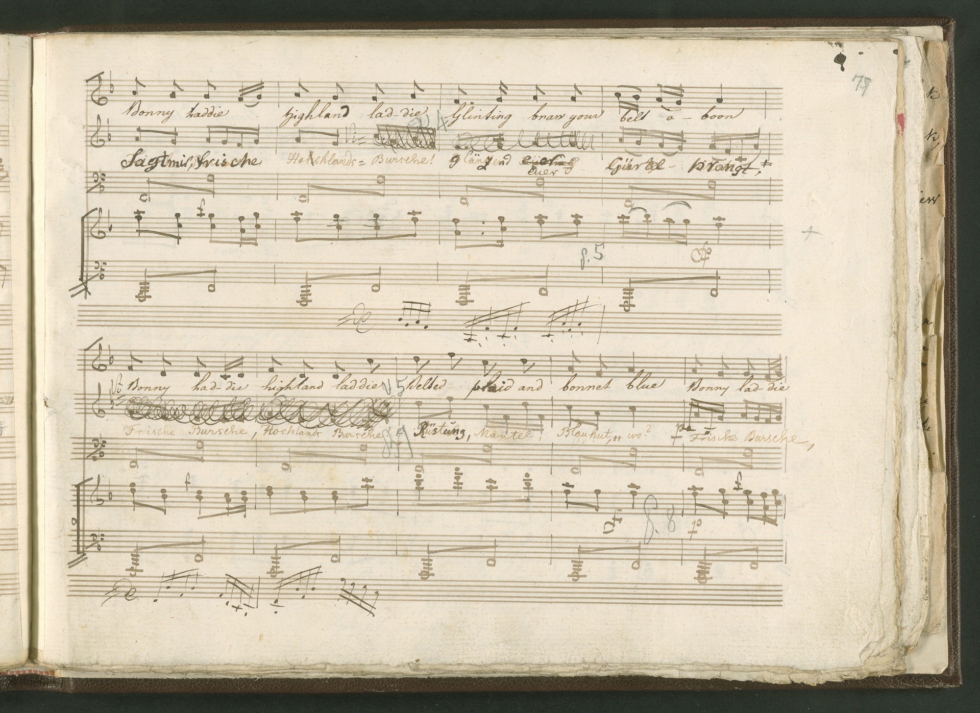 Im Juni 1818 erschien auf den britischen Inseln "A Select Collection of Original Scottish Airs": Beethovens musikalische Ausgestaltung von 25 schottischen Liedern. Beethoven, durchaus kein schlechter Geschäftsmann, versuchte anschließend, die Kompositionen auch auf dem Kontinent zu verkaufen und hatte 1820 in Berlin Glück. Der Verleger Adolph Martin Schlesinger interessierte sich für die Lieder und veranstaltete 1822 eine deutsche Ausgabe. Die überprüfte Abschrift ist die Stichvorlage für diese deutsche Originalausgabe (Op. 108). Neben dem von zwei unterschiedlichen Schreibern kopierten Notentext sind noch zwei weitere Handschriften erkennbar: Franz Oliva, Beethovens Freund und freiwilliger Sekretär schrieb den englischen Text der Lieder in die Abschrift, Samuel Heinrich Spiker fügte deren deutsche Übersetzung hinzu. Um die Lieder auf dem deutschen Markt besser verkaufen zu können, ließ Schlesinger sie übersetzen und druckte seine Ausgabe zweisprachig englisch und deutsch. Die Lieder waren im Original in einem schottischen Dialekt geschrieben, was deren Übersetzung nicht eben einfach machte. Der deutsche Text ist nicht immer ganz glücklich. Auch Beethoven bemerkte das in einem Brief an Schlesinger am 9. April 1822 und bat um Abhilfe: "wegen den Schottischen Liedern schrieb ich ihnen schon, daß beßer vom dichter auf die Langen u. kurzen Silben, welche leztere oft auf lange Noten u. die erstern auf kurze Nothen gerathen sind, Es läßt sich zwar etwas entschuld. in dieser Art, wäre der dichter hier so wäres leicht, jezt aber bin ich so überhaüft beschäftigt, daß es mir nicht mögl. ist, H. Zelter ein Mann von Kenntniß in der Poesie wie es sich für einen ausgezeichneten autor schikt, würde wol bald ihnen helfen können diese kleinen Fleken abzuwaschen" (BGA 1460, Beethoven an Adolph Martin Schlesinger). Trotz Beethovens Empfehlung, sich an Zelter (ein Freund Goethes) zu wenden, blieb der Verlag bei Spiker. Die deutschen Textunterlegungen wurden weder korrigiert noch geändert. (J.R.)