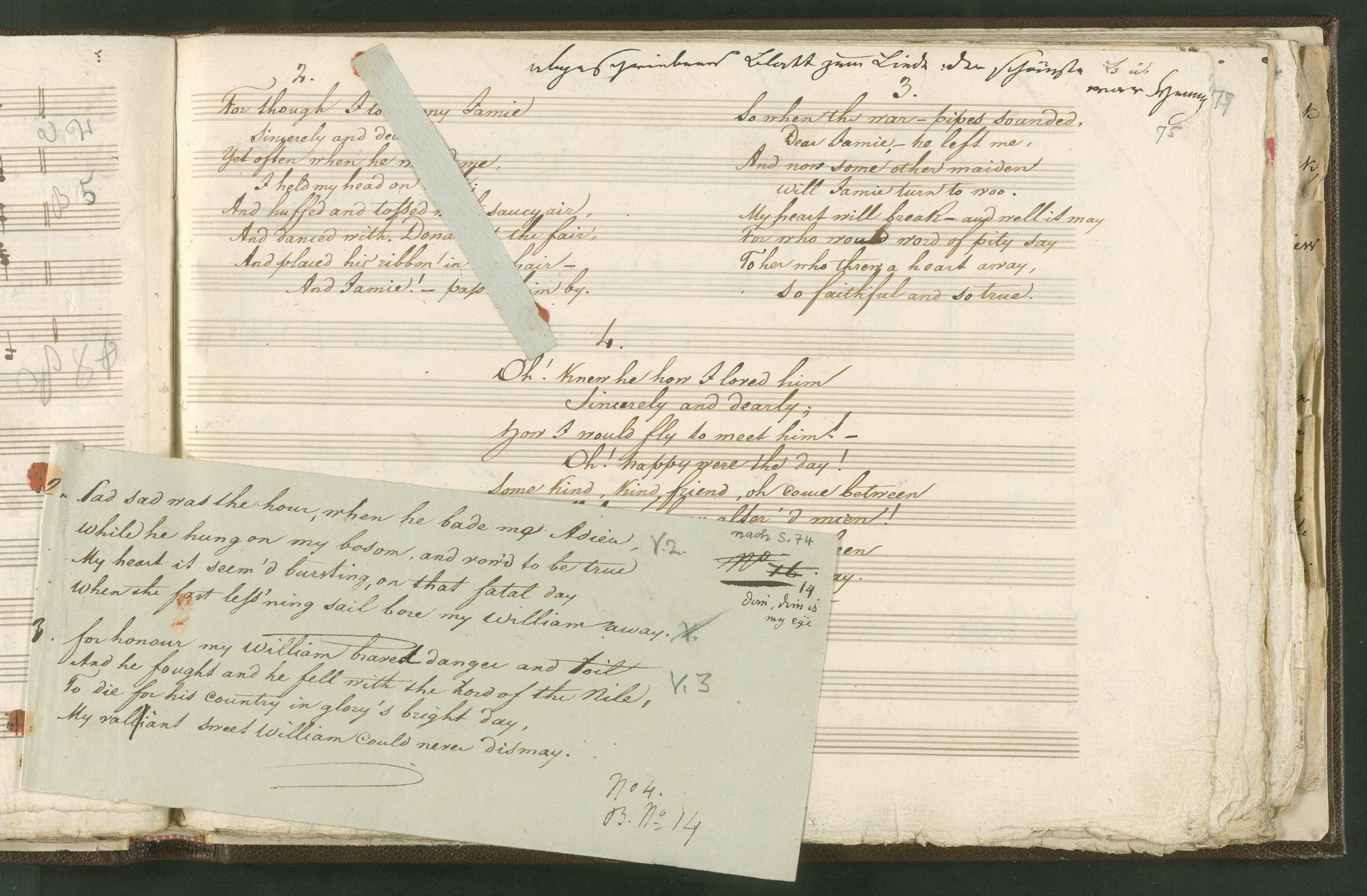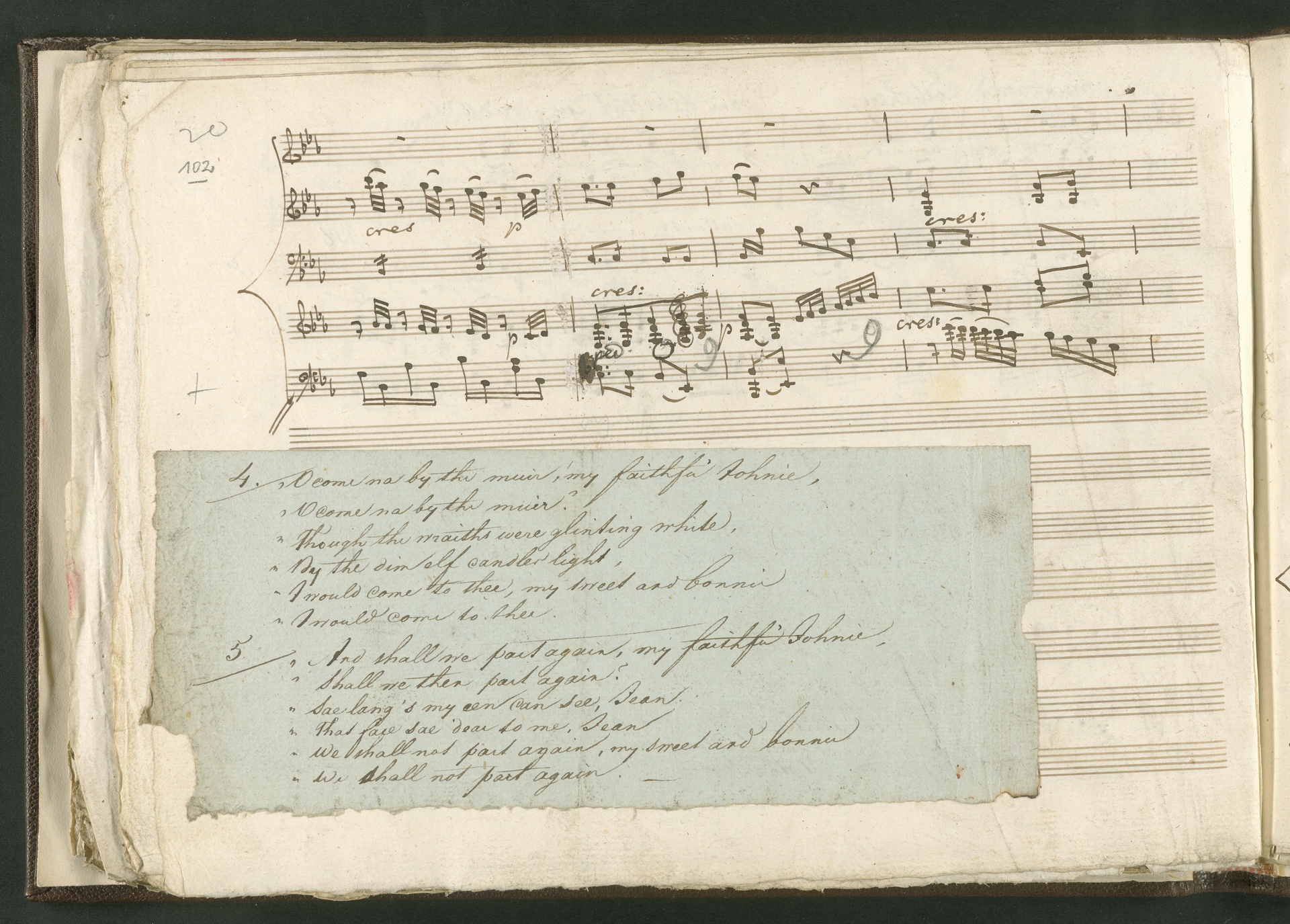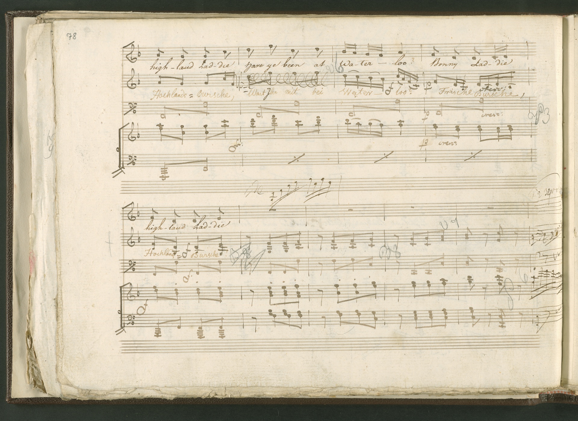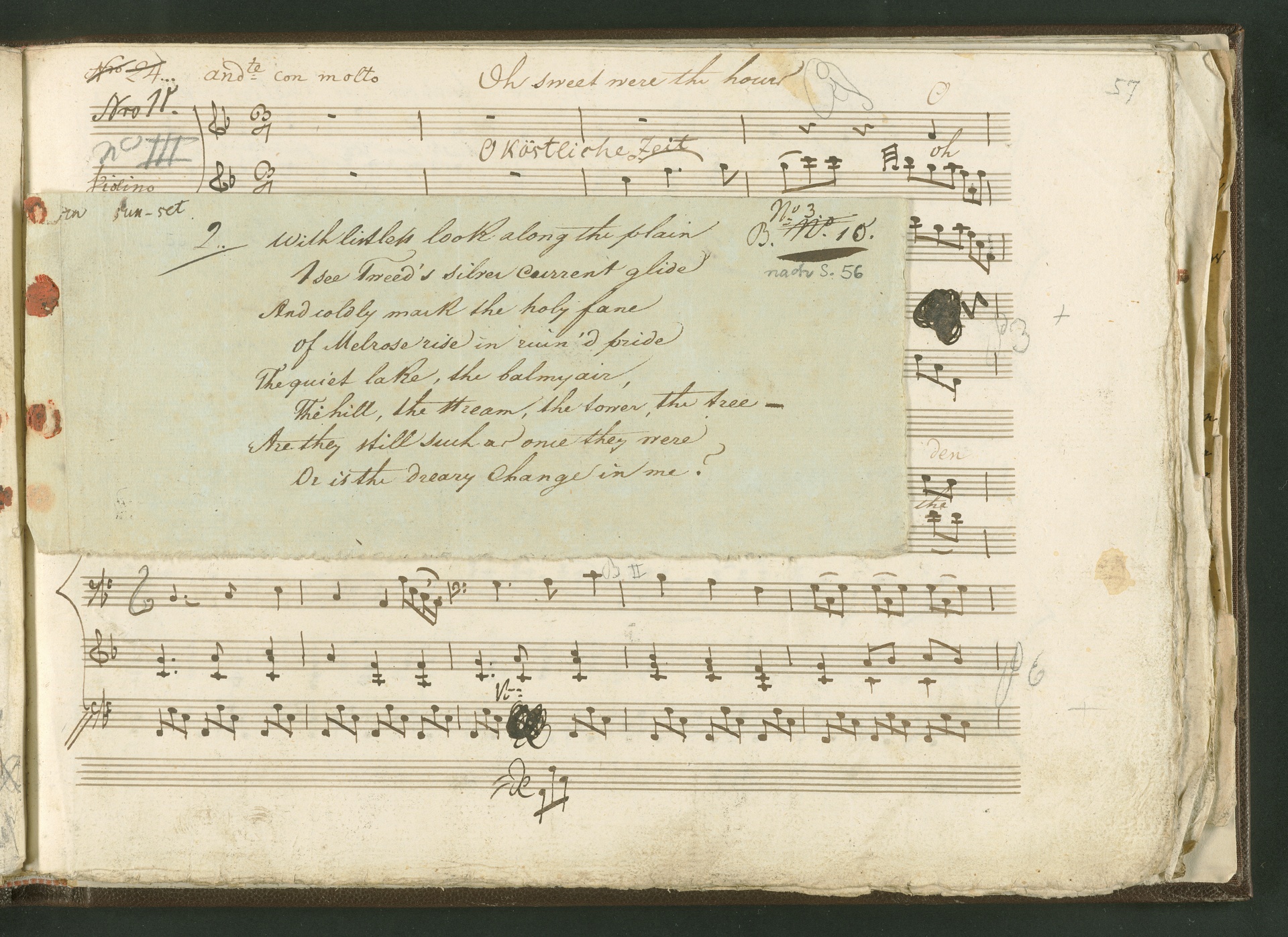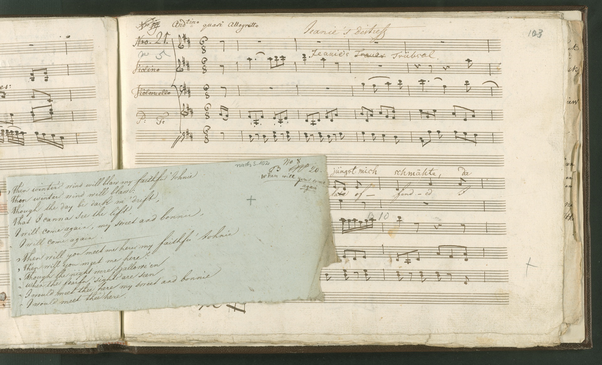 Im Juni 1818 erschien auf den britischen Inseln "A Select Collection of Original Scottish Airs": Beethovens musikalische Ausgestaltung von 25 schottischen Liedern. Beethoven, durchaus kein schlechter Geschäftsmann, versuchte anschließend, die Kompositionen auch auf dem Kontinent zu verkaufen und hatte 1820 in Berlin Glück. Der Verleger Adolph Martin Schlesinger interessierte sich für die Lieder und veranstaltete 1822 eine deutsche Ausgabe. Die überprüfte Abschrift ist die Stichvorlage für diese deutsche Originalausgabe (Op. 108). Neben dem von zwei unterschiedlichen Schreibern kopierten Notentext sind noch zwei weitere Handschriften erkennbar: Franz Oliva, Beethovens Freund und freiwilliger Sekretär schrieb den englischen Text der Lieder in die Abschrift, Samuel Heinrich Spiker fügte deren deutsche Übersetzung hinzu. Um die Lieder auf dem deutschen Markt besser verkaufen zu können, ließ Schlesinger sie übersetzen und druckte seine Ausgabe zweisprachig englisch und deutsch. Die Lieder waren im Original in einem schottischen Dialekt geschrieben, was deren Übersetzung nicht eben einfach machte. Der deutsche Text ist nicht immer ganz glücklich. Auch Beethoven bemerkte das in einem Brief an Schlesinger am 9. April 1822 und bat um Abhilfe: "wegen den Schottischen Liedern schrieb ich ihnen schon, daß beßer vom dichter auf die Langen u. kurzen Silben, welche leztere oft auf lange Noten u. die erstern auf kurze Nothen gerathen sind, Es läßt sich zwar etwas entschuld. in dieser Art, wäre der dichter hier so wäres leicht, jezt aber bin ich so überhaüft beschäftigt, daß es mir nicht mögl. ist, H. Zelter ein Mann von Kenntniß in der Poesie wie es sich für einen ausgezeichneten autor schikt, würde wol bald ihnen helfen können diese kleinen Fleken abzuwaschen" (BGA 1460, Beethoven an Adolph Martin Schlesinger). Trotz Beethovens Empfehlung, sich an Zelter (ein Freund Goethes) zu wenden, blieb der Verlag bei Spiker. Die deutschen Textunterlegungen wurden weder korrigiert noch geändert. (J.R.)