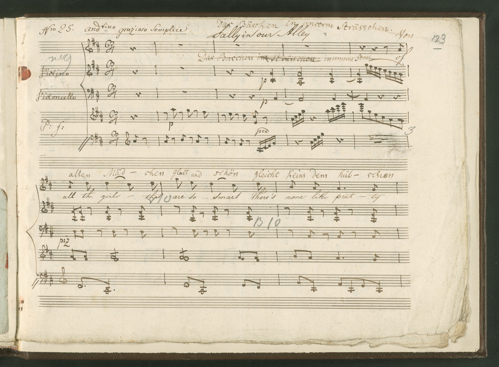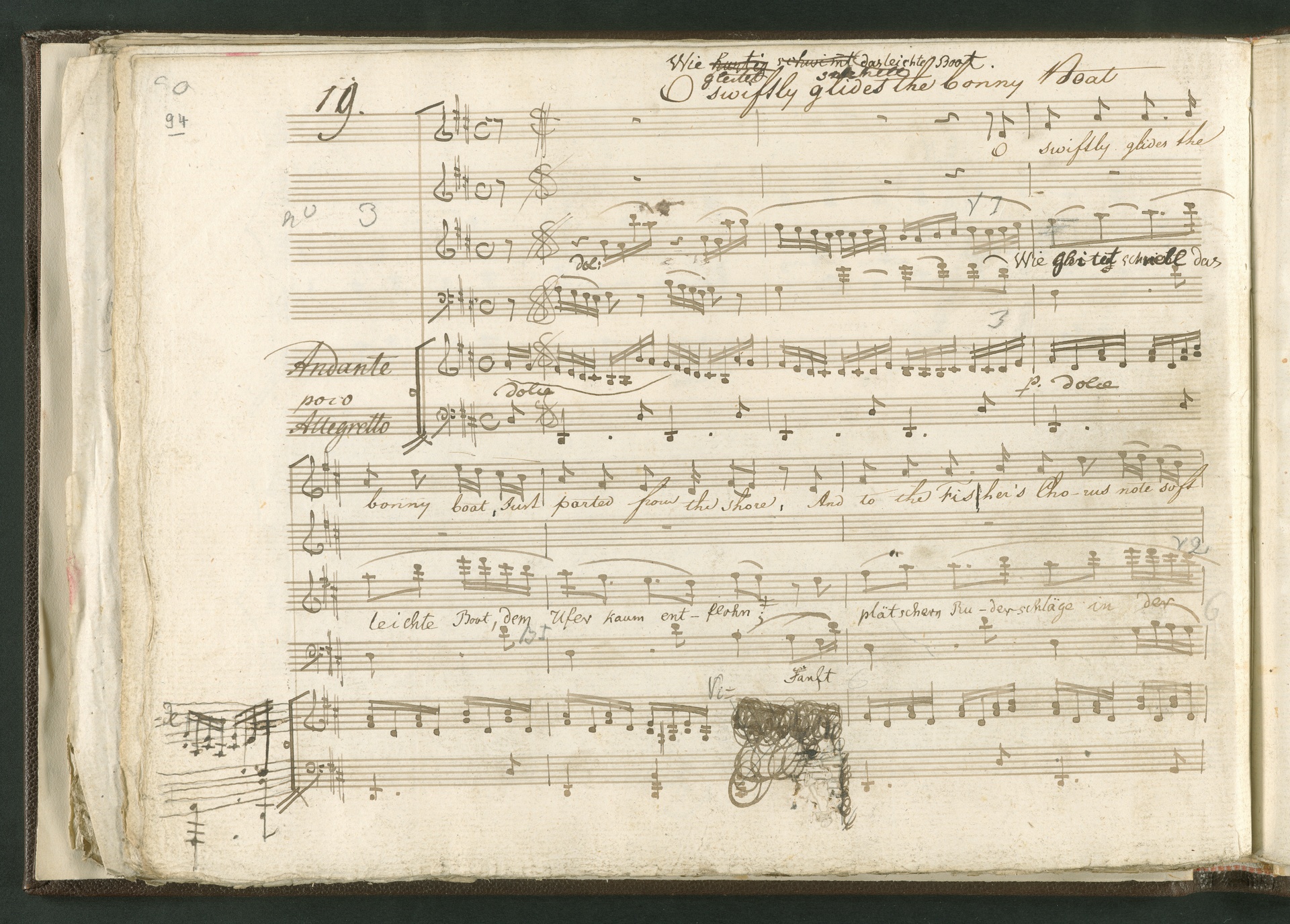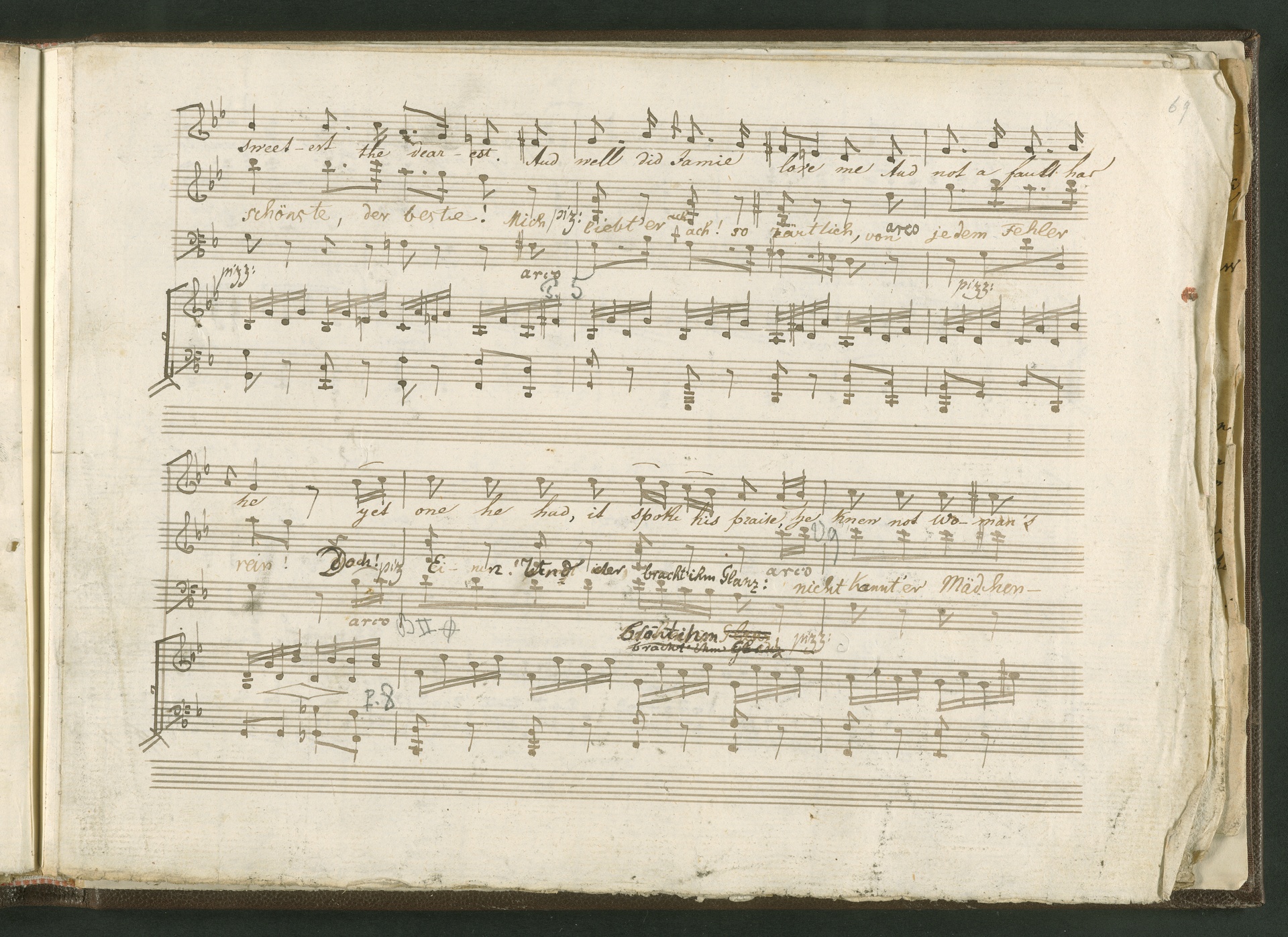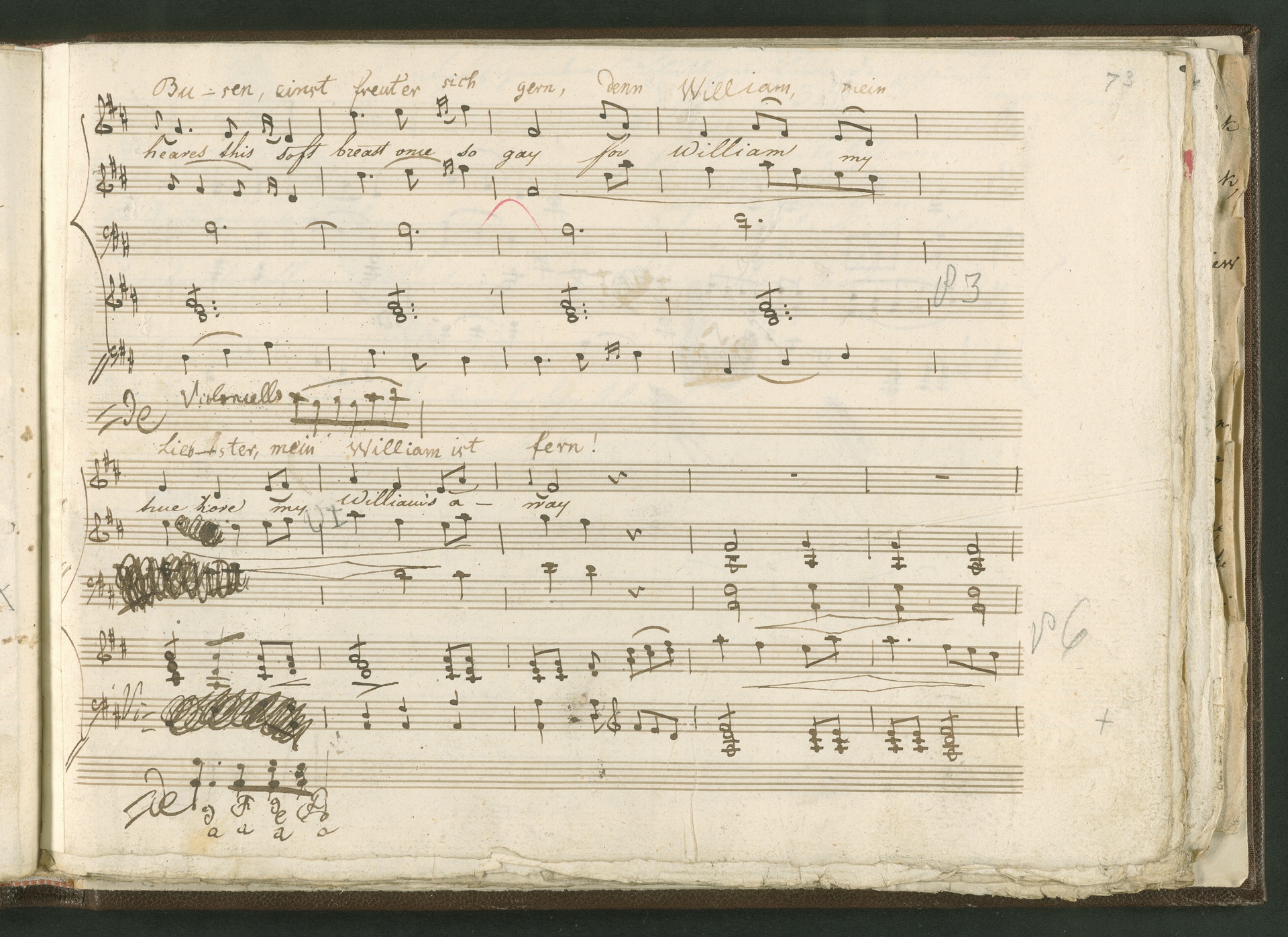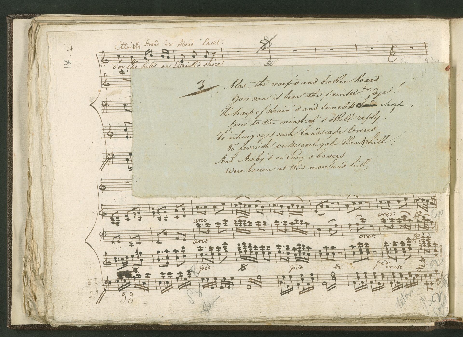 Im Juni 1818 erschien auf den britischen Inseln "A Select Collection of Original Scottish Airs": Beethovens musikalische Ausgestaltung von 25 schottischen Liedern. Beethoven, durchaus kein schlechter Geschäftsmann, versuchte anschließend, die Kompositionen auch auf dem Kontinent zu verkaufen und hatte 1820 in Berlin Glück. Der Verleger Adolph Martin Schlesinger interessierte sich für die Lieder und veranstaltete 1822 eine deutsche Ausgabe. Die überprüfte Abschrift ist die Stichvorlage für diese deutsche Originalausgabe (Op. 108). Neben dem von zwei unterschiedlichen Schreibern kopierten Notentext sind noch zwei weitere Handschriften erkennbar: Franz Oliva, Beethovens Freund und freiwilliger Sekretär schrieb den englischen Text der Lieder in die Abschrift, Samuel Heinrich Spiker fügte deren deutsche Übersetzung hinzu. Um die Lieder auf dem deutschen Markt besser verkaufen zu können, ließ Schlesinger sie übersetzen und druckte seine Ausgabe zweisprachig englisch und deutsch. Die Lieder waren im Original in einem schottischen Dialekt geschrieben, was deren Übersetzung nicht eben einfach machte. Der deutsche Text ist nicht immer ganz glücklich. Auch Beethoven bemerkte das in einem Brief an Schlesinger am 9. April 1822 und bat um Abhilfe: "wegen den Schottischen Liedern schrieb ich ihnen schon, daß beßer vom dichter auf die Langen u. kurzen Silben, welche leztere oft auf lange Noten u. die erstern auf kurze Nothen gerathen sind, Es läßt sich zwar etwas entschuld. in dieser Art, wäre der dichter hier so wäres leicht, jezt aber bin ich so überhaüft beschäftigt, daß es mir nicht mögl. ist, H. Zelter ein Mann von Kenntniß in der Poesie wie es sich für einen ausgezeichneten autor schikt, würde wol bald ihnen helfen können diese kleinen Fleken abzuwaschen" (BGA 1460, Beethoven an Adolph Martin Schlesinger). Trotz Beethovens Empfehlung, sich an Zelter (ein Freund Goethes) zu wenden, blieb der Verlag bei Spiker. Die deutschen Textunterlegungen wurden weder korrigiert noch geändert. (J.R.)