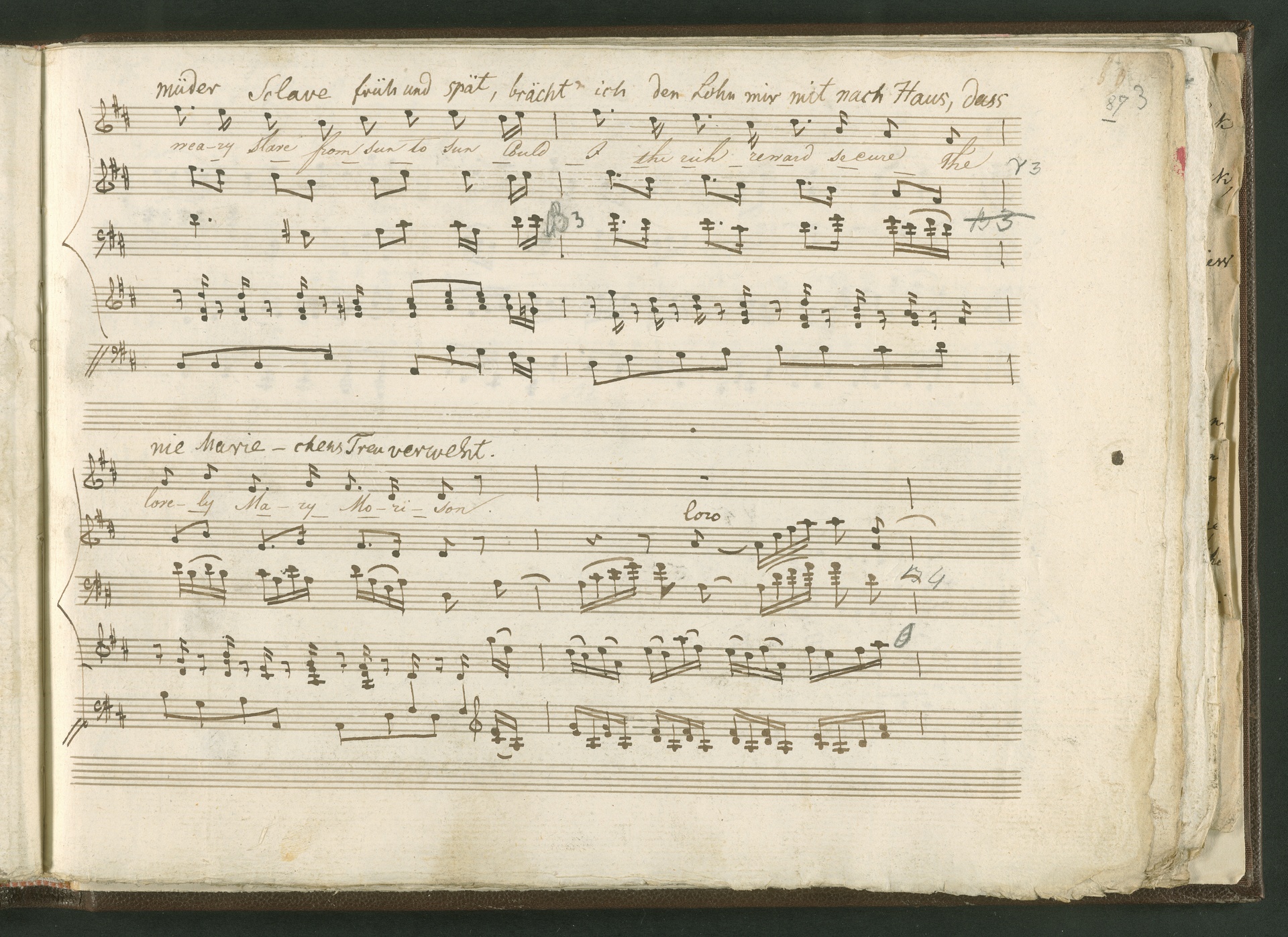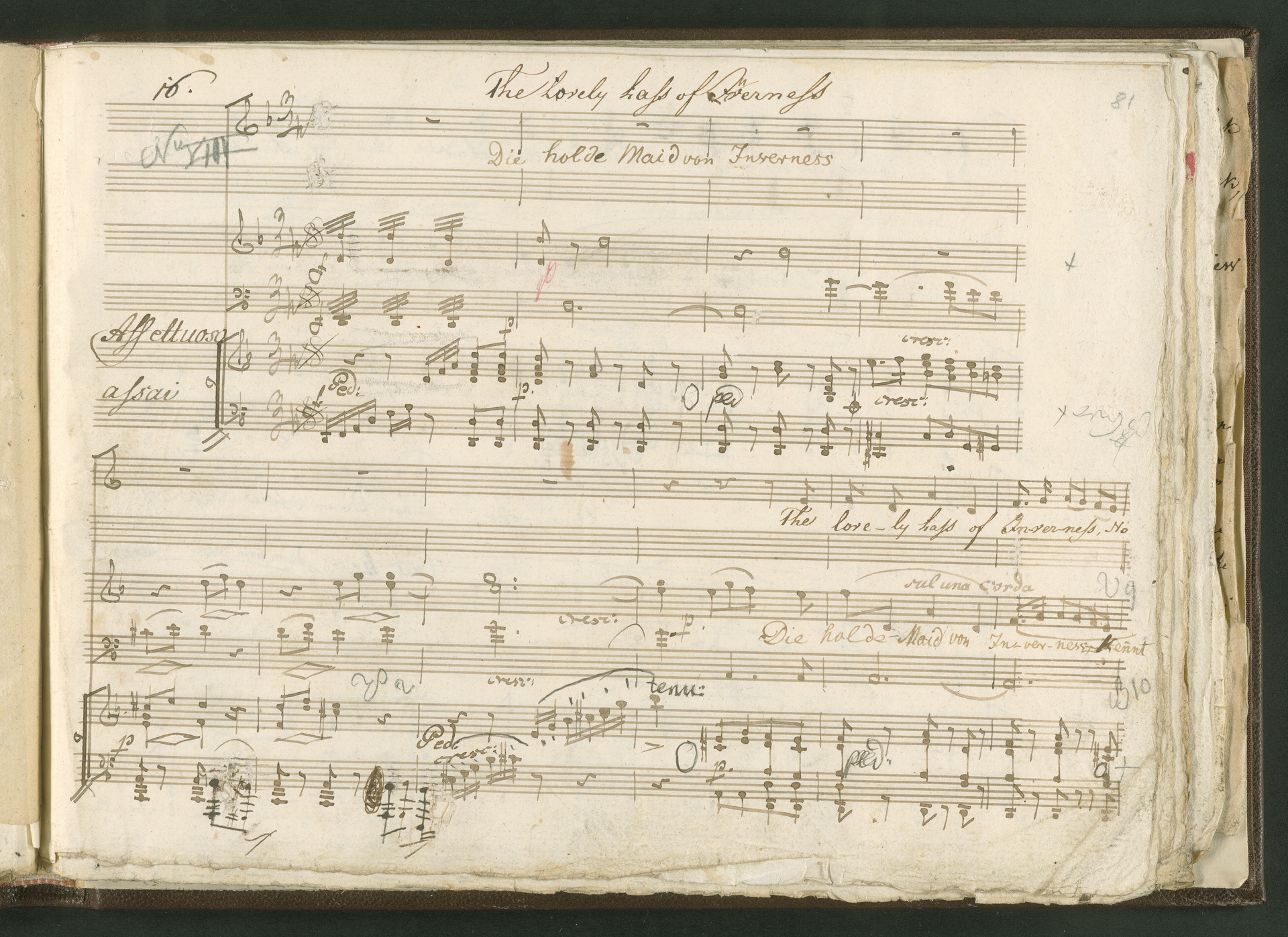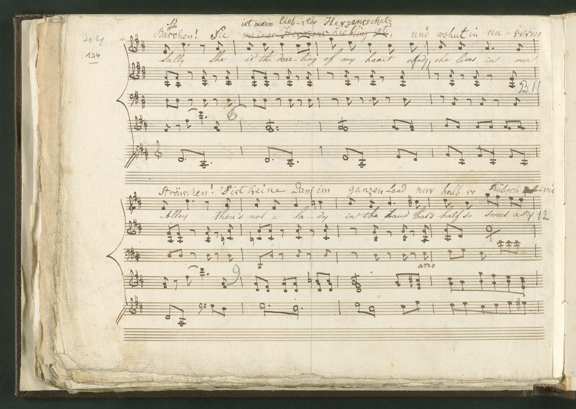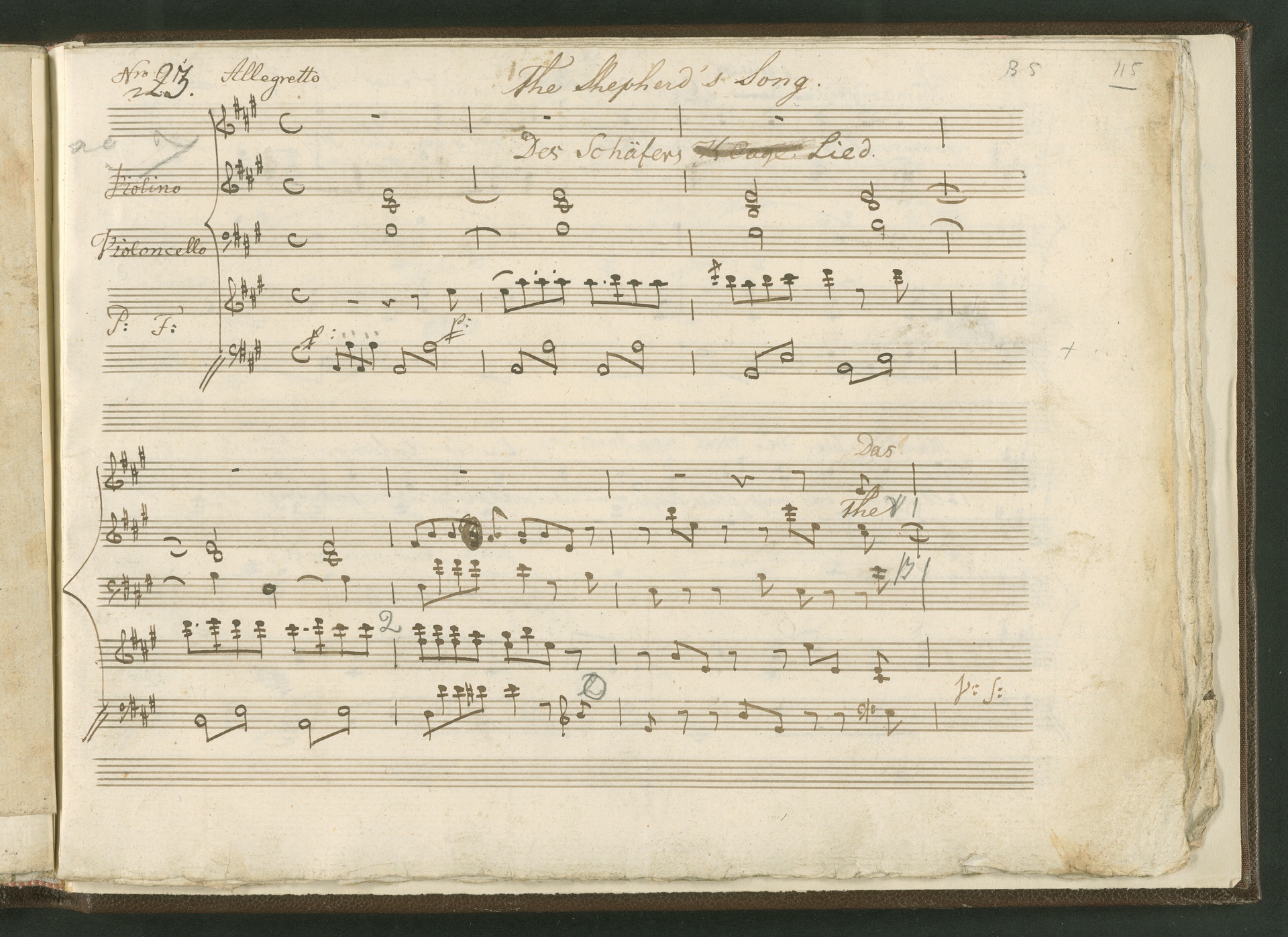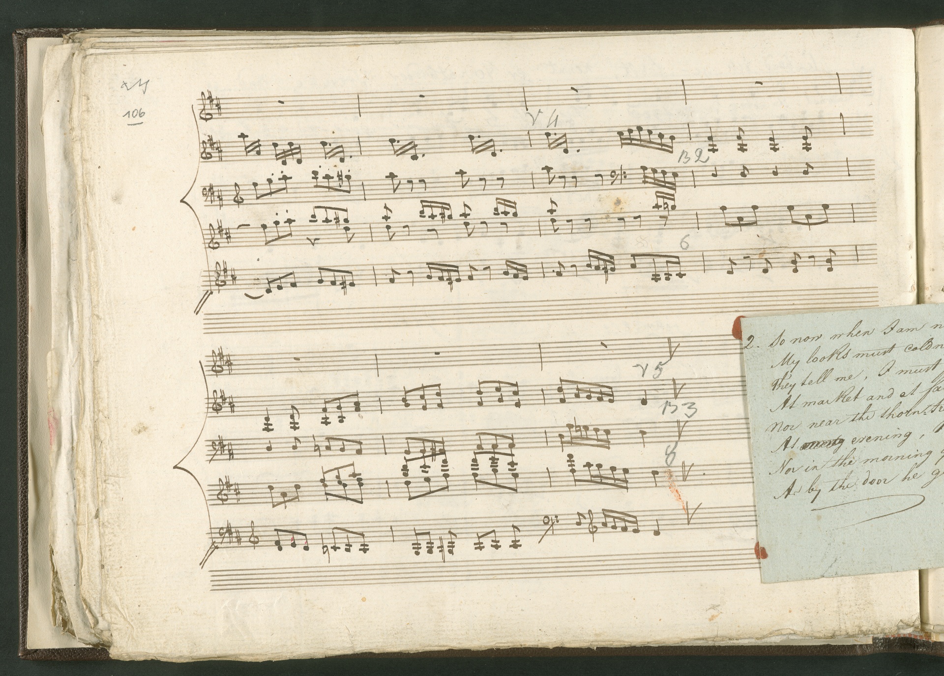 Im Juni 1818 erschien auf den britischen Inseln "A Select Collection of Original Scottish Airs": Beethovens musikalische Ausgestaltung von 25 schottischen Liedern. Beethoven, durchaus kein schlechter Geschäftsmann, versuchte anschließend, die Kompositionen auch auf dem Kontinent zu verkaufen und hatte 1820 in Berlin Glück. Der Verleger Adolph Martin Schlesinger interessierte sich für die Lieder und veranstaltete 1822 eine deutsche Ausgabe. Die überprüfte Abschrift ist die Stichvorlage für diese deutsche Originalausgabe (Op. 108). Neben dem von zwei unterschiedlichen Schreibern kopierten Notentext sind noch zwei weitere Handschriften erkennbar: Franz Oliva, Beethovens Freund und freiwilliger Sekretär schrieb den englischen Text der Lieder in die Abschrift, Samuel Heinrich Spiker fügte deren deutsche Übersetzung hinzu. Um die Lieder auf dem deutschen Markt besser verkaufen zu können, ließ Schlesinger sie übersetzen und druckte seine Ausgabe zweisprachig englisch und deutsch. Die Lieder waren im Original in einem schottischen Dialekt geschrieben, was deren Übersetzung nicht eben einfach machte. Der deutsche Text ist nicht immer ganz glücklich. Auch Beethoven bemerkte das in einem Brief an Schlesinger am 9. April 1822 und bat um Abhilfe: "wegen den Schottischen Liedern schrieb ich ihnen schon, daß beßer vom dichter auf die Langen u. kurzen Silben, welche leztere oft auf lange Noten u. die erstern auf kurze Nothen gerathen sind, Es läßt sich zwar etwas entschuld. in dieser Art, wäre der dichter hier so wäres leicht, jezt aber bin ich so überhaüft beschäftigt, daß es mir nicht mögl. ist, H. Zelter ein Mann von Kenntniß in der Poesie wie es sich für einen ausgezeichneten autor schikt, würde wol bald ihnen helfen können diese kleinen Fleken abzuwaschen" (BGA 1460, Beethoven an Adolph Martin Schlesinger). Trotz Beethovens Empfehlung, sich an Zelter (ein Freund Goethes) zu wenden, blieb der Verlag bei Spiker. Die deutschen Textunterlegungen wurden weder korrigiert noch geändert. (J.R.)