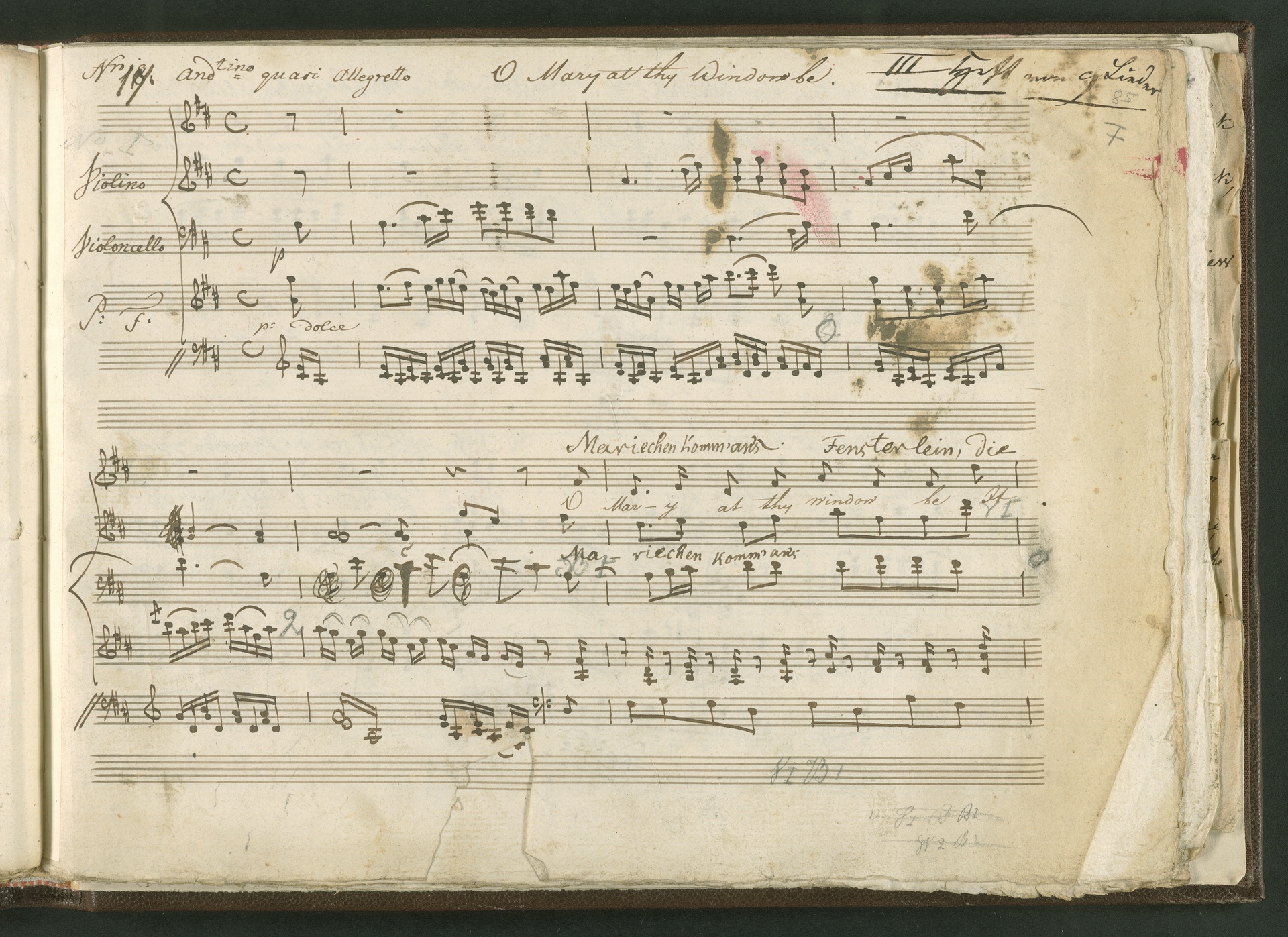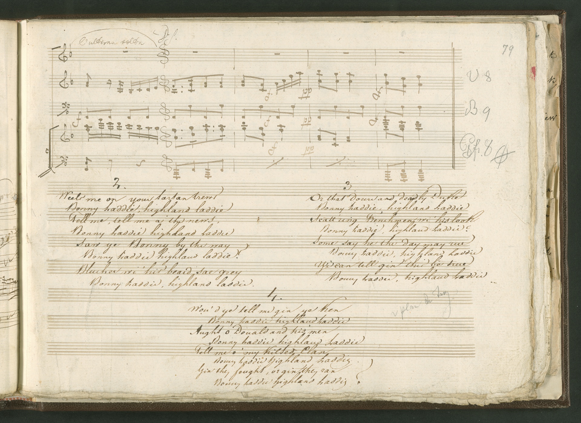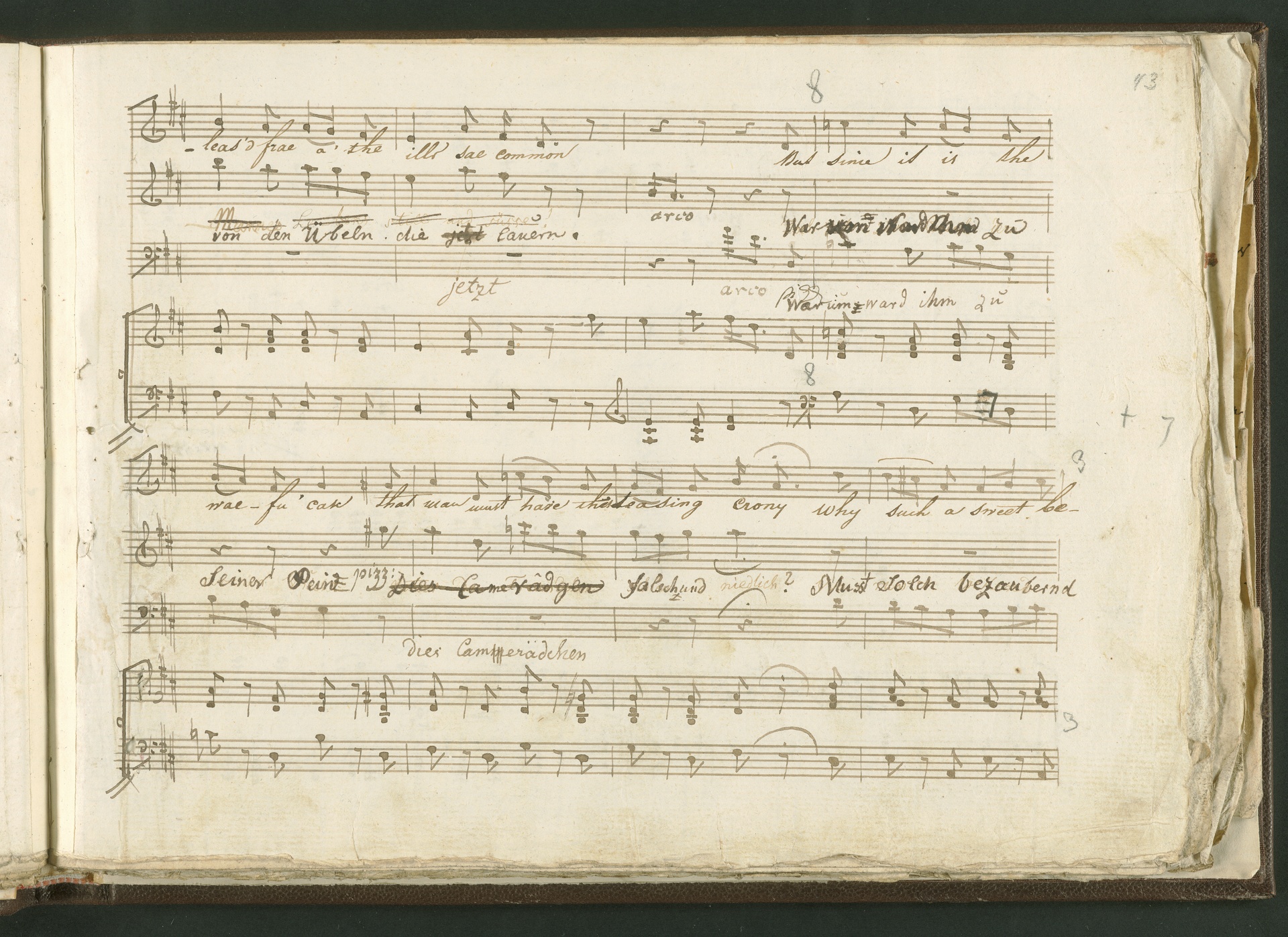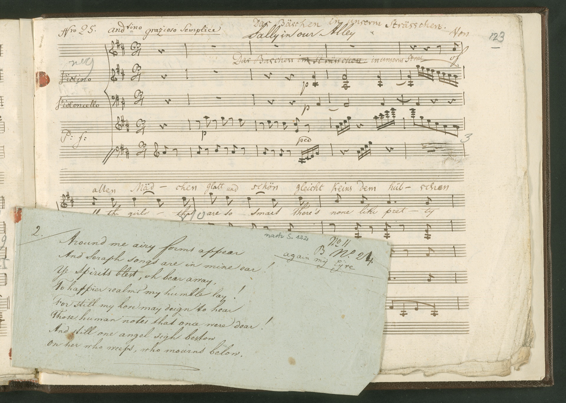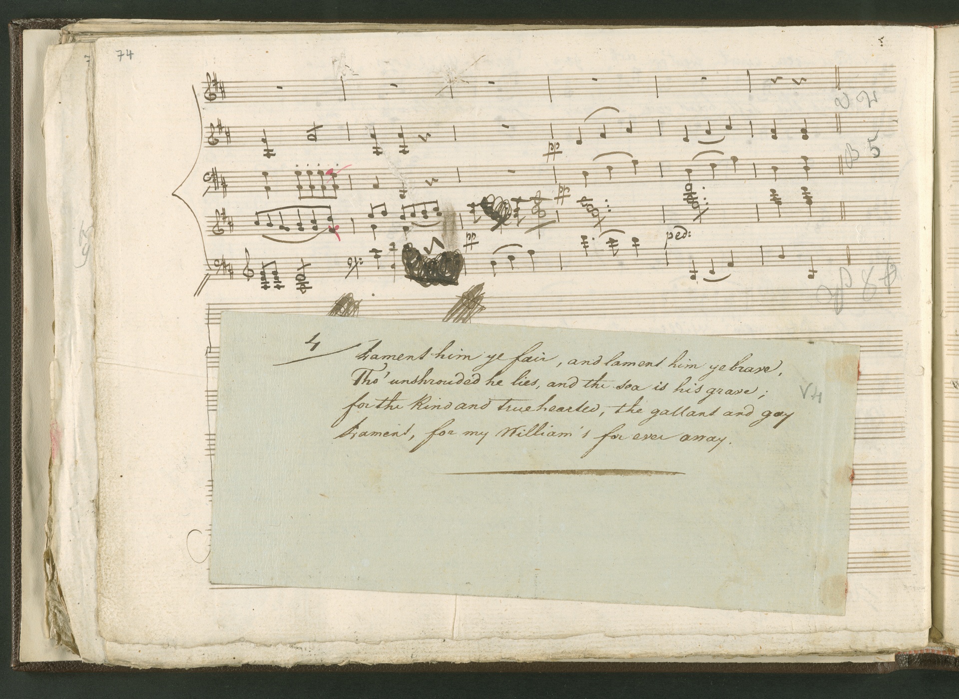 Im Juni 1818 erschien auf den britischen Inseln "A Select Collection of Original Scottish Airs": Beethovens musikalische Ausgestaltung von 25 schottischen Liedern. Beethoven, durchaus kein schlechter Geschäftsmann, versuchte anschließend, die Kompositionen auch auf dem Kontinent zu verkaufen und hatte 1820 in Berlin Glück. Der Verleger Adolph Martin Schlesinger interessierte sich für die Lieder und veranstaltete 1822 eine deutsche Ausgabe. Die überprüfte Abschrift ist die Stichvorlage für diese deutsche Originalausgabe (Op. 108). Neben dem von zwei unterschiedlichen Schreibern kopierten Notentext sind noch zwei weitere Handschriften erkennbar: Franz Oliva, Beethovens Freund und freiwilliger Sekretär schrieb den englischen Text der Lieder in die Abschrift, Samuel Heinrich Spiker fügte deren deutsche Übersetzung hinzu. Um die Lieder auf dem deutschen Markt besser verkaufen zu können, ließ Schlesinger sie übersetzen und druckte seine Ausgabe zweisprachig englisch und deutsch. Die Lieder waren im Original in einem schottischen Dialekt geschrieben, was deren Übersetzung nicht eben einfach machte. Der deutsche Text ist nicht immer ganz glücklich. Auch Beethoven bemerkte das in einem Brief an Schlesinger am 9. April 1822 und bat um Abhilfe: "wegen den Schottischen Liedern schrieb ich ihnen schon, daß beßer vom dichter auf die Langen u. kurzen Silben, welche leztere oft auf lange Noten u. die erstern auf kurze Nothen gerathen sind, Es läßt sich zwar etwas entschuld. in dieser Art, wäre der dichter hier so wäres leicht, jezt aber bin ich so überhaüft beschäftigt, daß es mir nicht mögl. ist, H. Zelter ein Mann von Kenntniß in der Poesie wie es sich für einen ausgezeichneten autor schikt, würde wol bald ihnen helfen können diese kleinen Fleken abzuwaschen" (BGA 1460, Beethoven an Adolph Martin Schlesinger). Trotz Beethovens Empfehlung, sich an Zelter (ein Freund Goethes) zu wenden, blieb der Verlag bei Spiker. Die deutschen Textunterlegungen wurden weder korrigiert noch geändert. (J.R.)