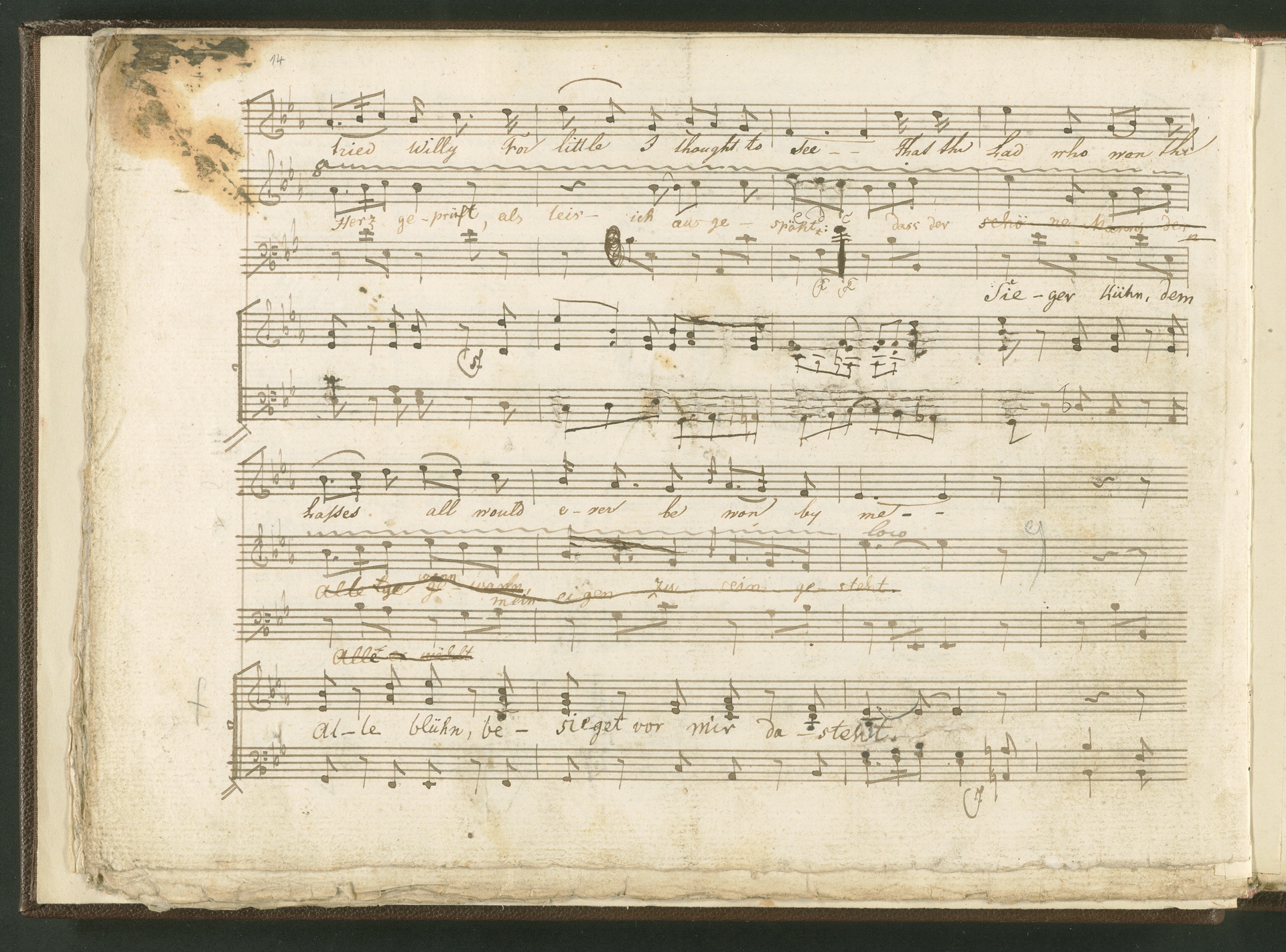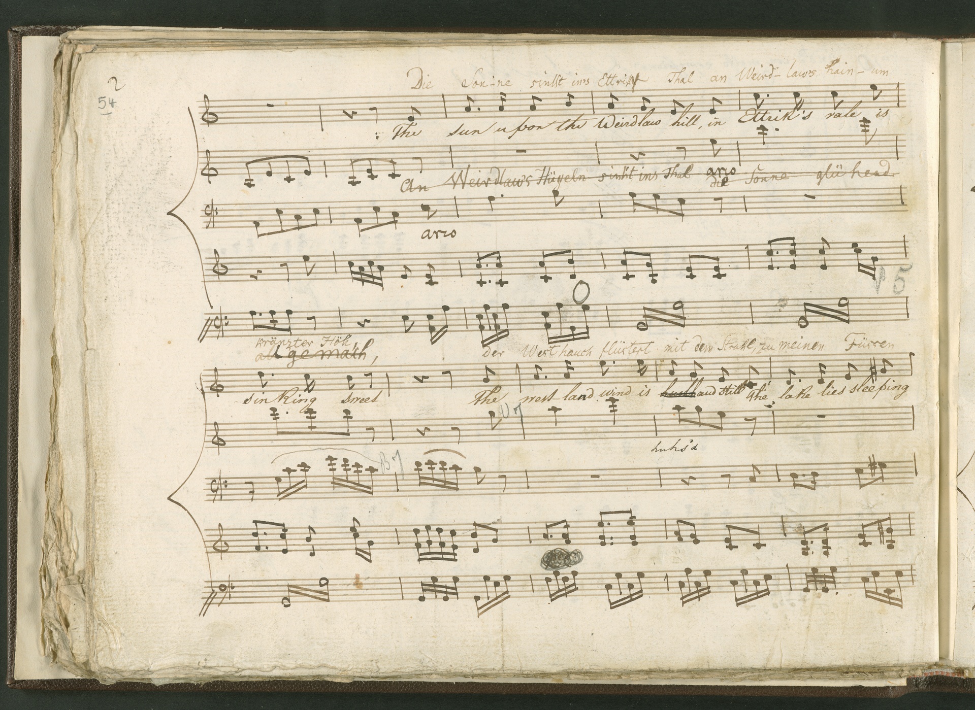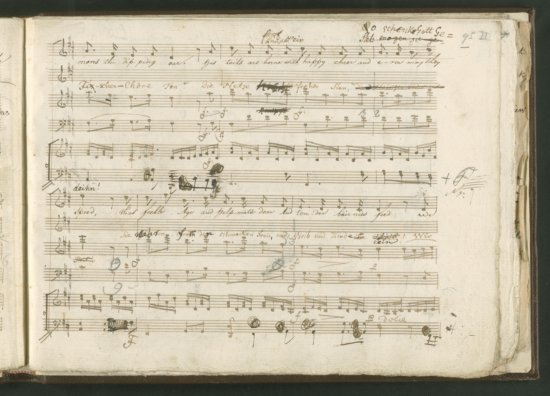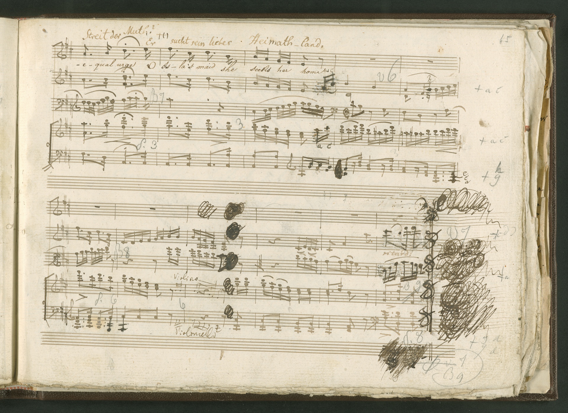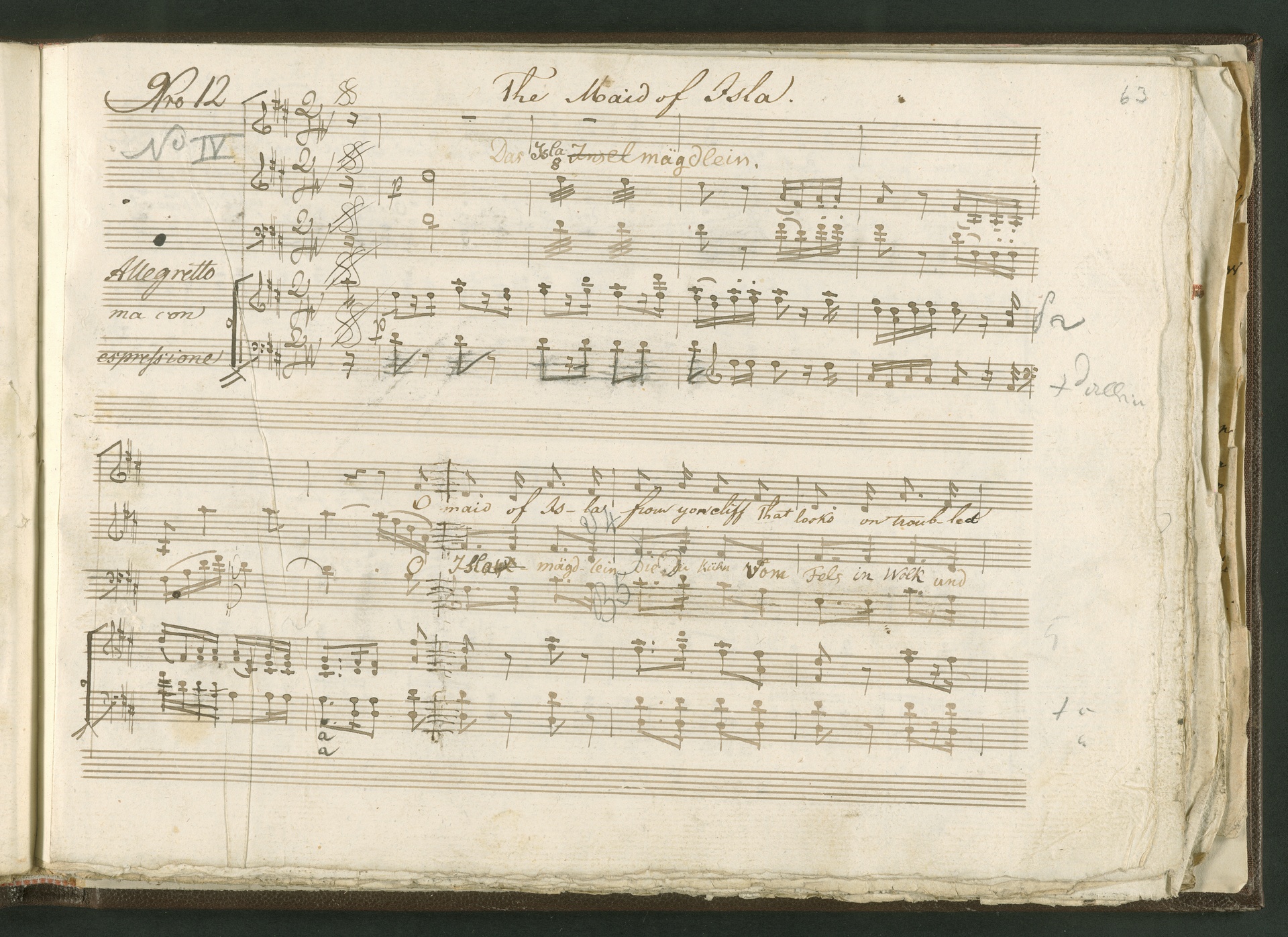 Im Juni 1818 erschien auf den britischen Inseln "A Select Collection of Original Scottish Airs": Beethovens musikalische Ausgestaltung von 25 schottischen Liedern. Beethoven, durchaus kein schlechter Geschäftsmann, versuchte anschließend, die Kompositionen auch auf dem Kontinent zu verkaufen und hatte 1820 in Berlin Glück. Der Verleger Adolph Martin Schlesinger interessierte sich für die Lieder und veranstaltete 1822 eine deutsche Ausgabe. Die überprüfte Abschrift ist die Stichvorlage für diese deutsche Originalausgabe (Op. 108). Neben dem von zwei unterschiedlichen Schreibern kopierten Notentext sind noch zwei weitere Handschriften erkennbar: Franz Oliva, Beethovens Freund und freiwilliger Sekretär schrieb den englischen Text der Lieder in die Abschrift, Samuel Heinrich Spiker fügte deren deutsche Übersetzung hinzu. Um die Lieder auf dem deutschen Markt besser verkaufen zu können, ließ Schlesinger sie übersetzen und druckte seine Ausgabe zweisprachig englisch und deutsch. Die Lieder waren im Original in einem schottischen Dialekt geschrieben, was deren Übersetzung nicht eben einfach machte. Der deutsche Text ist nicht immer ganz glücklich. Auch Beethoven bemerkte das in einem Brief an Schlesinger am 9. April 1822 und bat um Abhilfe: "wegen den Schottischen Liedern schrieb ich ihnen schon, daß beßer vom dichter auf die Langen u. kurzen Silben, welche leztere oft auf lange Noten u. die erstern auf kurze Nothen gerathen sind, Es läßt sich zwar etwas entschuld. in dieser Art, wäre der dichter hier so wäres leicht, jezt aber bin ich so überhaüft beschäftigt, daß es mir nicht mögl. ist, H. Zelter ein Mann von Kenntniß in der Poesie wie es sich für einen ausgezeichneten autor schikt, würde wol bald ihnen helfen können diese kleinen Fleken abzuwaschen" (BGA 1460, Beethoven an Adolph Martin Schlesinger). Trotz Beethovens Empfehlung, sich an Zelter (ein Freund Goethes) zu wenden, blieb der Verlag bei Spiker. Die deutschen Textunterlegungen wurden weder korrigiert noch geändert. (J.R.)
