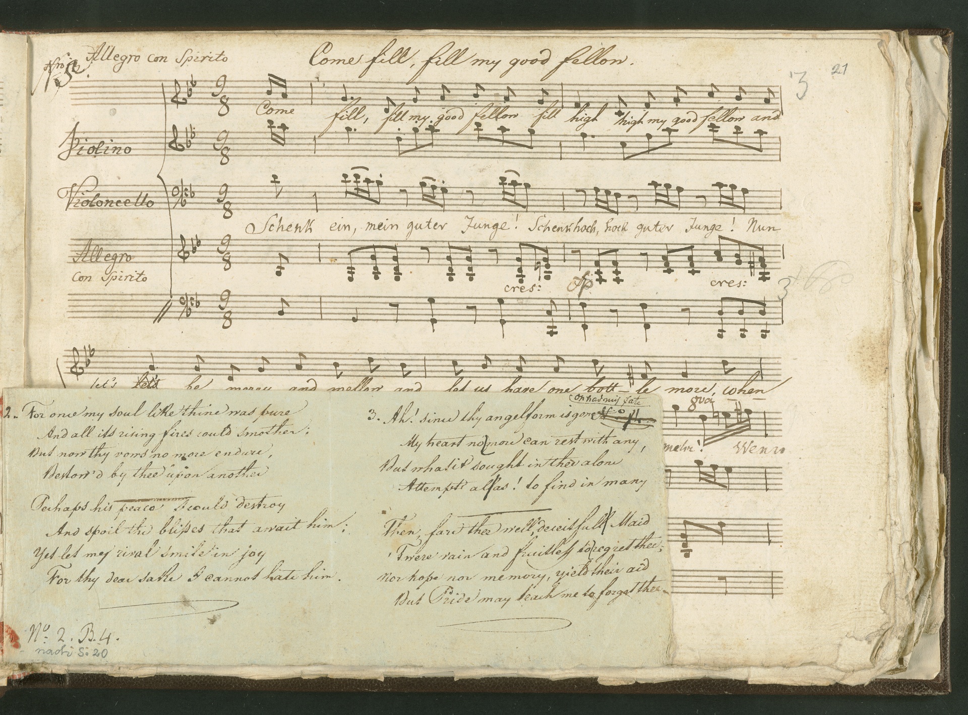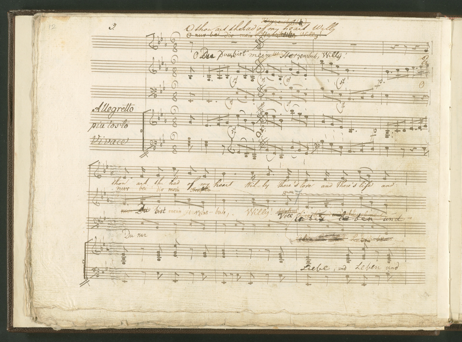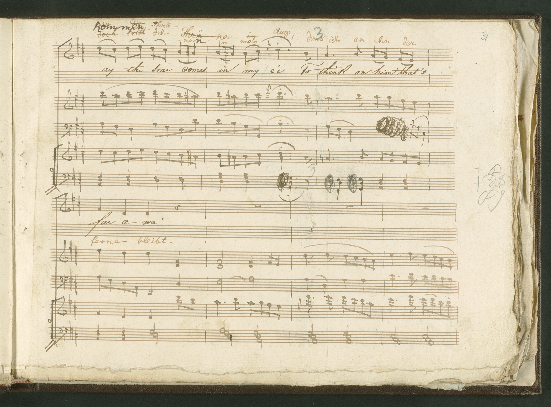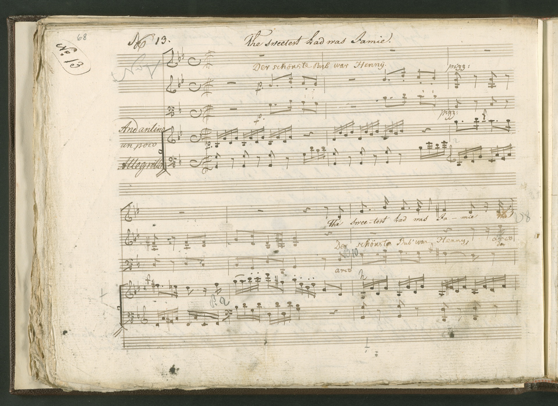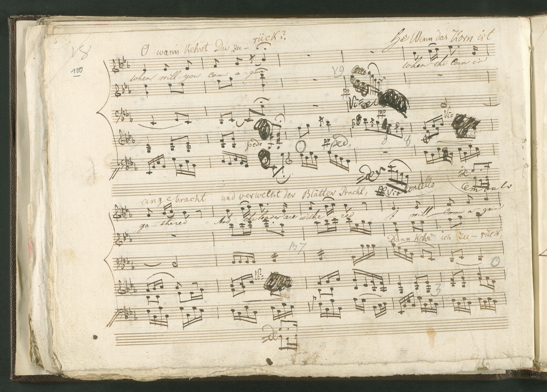 Im Juni 1818 erschien auf den britischen Inseln "A Select Collection of Original Scottish Airs": Beethovens musikalische Ausgestaltung von 25 schottischen Liedern. Beethoven, durchaus kein schlechter Geschäftsmann, versuchte anschließend, die Kompositionen auch auf dem Kontinent zu verkaufen und hatte 1820 in Berlin Glück. Der Verleger Adolph Martin Schlesinger interessierte sich für die Lieder und veranstaltete 1822 eine deutsche Ausgabe. Die überprüfte Abschrift ist die Stichvorlage für diese deutsche Originalausgabe (Op. 108). Neben dem von zwei unterschiedlichen Schreibern kopierten Notentext sind noch zwei weitere Handschriften erkennbar: Franz Oliva, Beethovens Freund und freiwilliger Sekretär schrieb den englischen Text der Lieder in die Abschrift, Samuel Heinrich Spiker fügte deren deutsche Übersetzung hinzu. Um die Lieder auf dem deutschen Markt besser verkaufen zu können, ließ Schlesinger sie übersetzen und druckte seine Ausgabe zweisprachig englisch und deutsch. Die Lieder waren im Original in einem schottischen Dialekt geschrieben, was deren Übersetzung nicht eben einfach machte. Der deutsche Text ist nicht immer ganz glücklich. Auch Beethoven bemerkte das in einem Brief an Schlesinger am 9. April 1822 und bat um Abhilfe: "wegen den Schottischen Liedern schrieb ich ihnen schon, daß beßer vom dichter auf die Langen u. kurzen Silben, welche leztere oft auf lange Noten u. die erstern auf kurze Nothen gerathen sind, Es läßt sich zwar etwas entschuld. in dieser Art, wäre der dichter hier so wäres leicht, jezt aber bin ich so überhaüft beschäftigt, daß es mir nicht mögl. ist, H. Zelter ein Mann von Kenntniß in der Poesie wie es sich für einen ausgezeichneten autor schikt, würde wol bald ihnen helfen können diese kleinen Fleken abzuwaschen" (BGA 1460, Beethoven an Adolph Martin Schlesinger). Trotz Beethovens Empfehlung, sich an Zelter (ein Freund Goethes) zu wenden, blieb der Verlag bei Spiker. Die deutschen Textunterlegungen wurden weder korrigiert noch geändert. (J.R.)