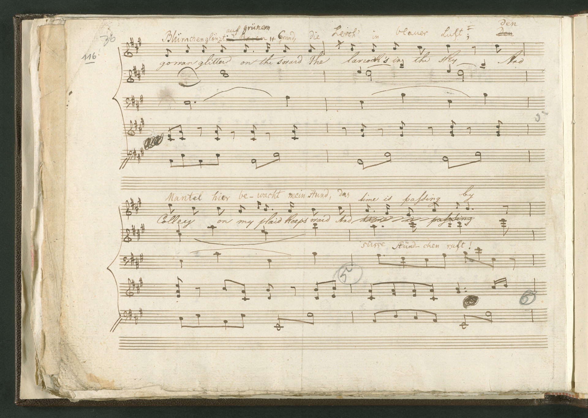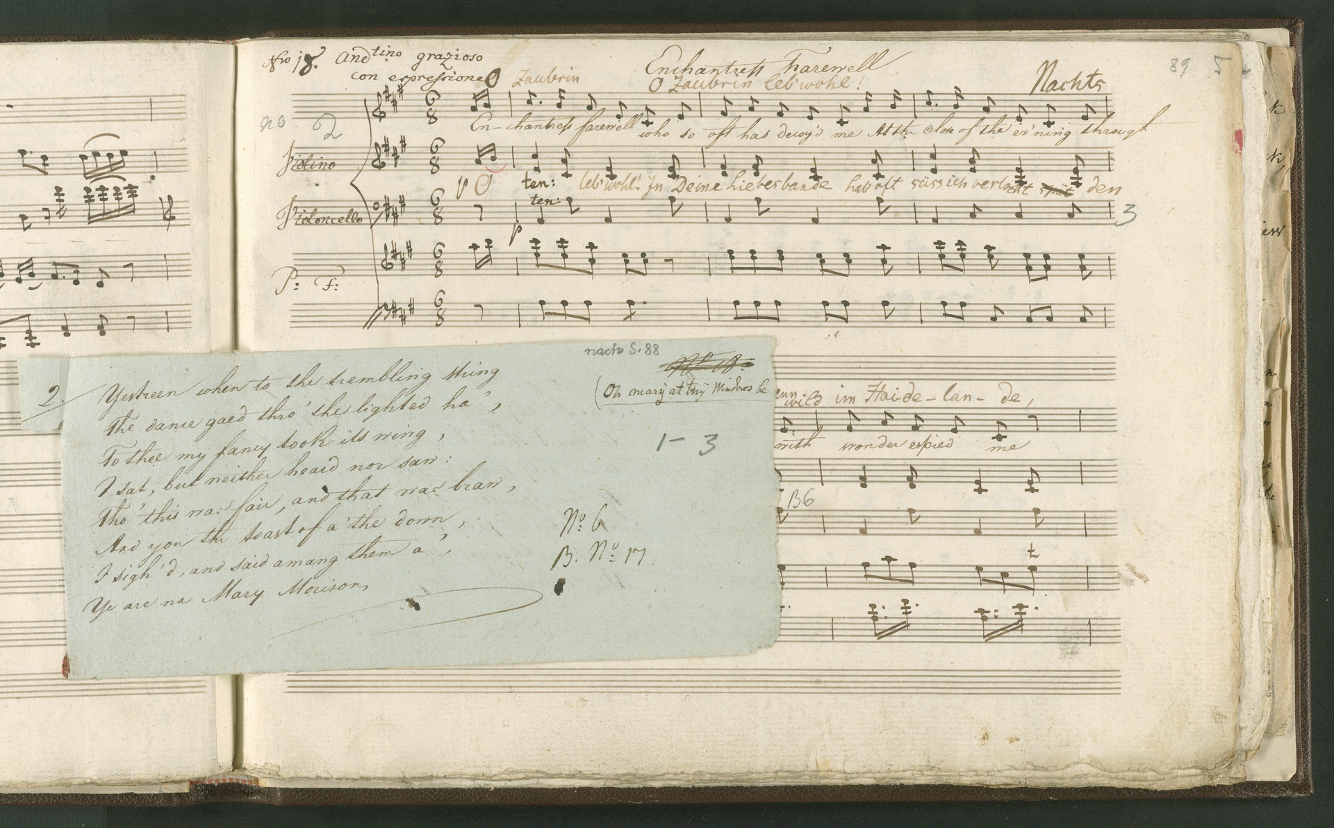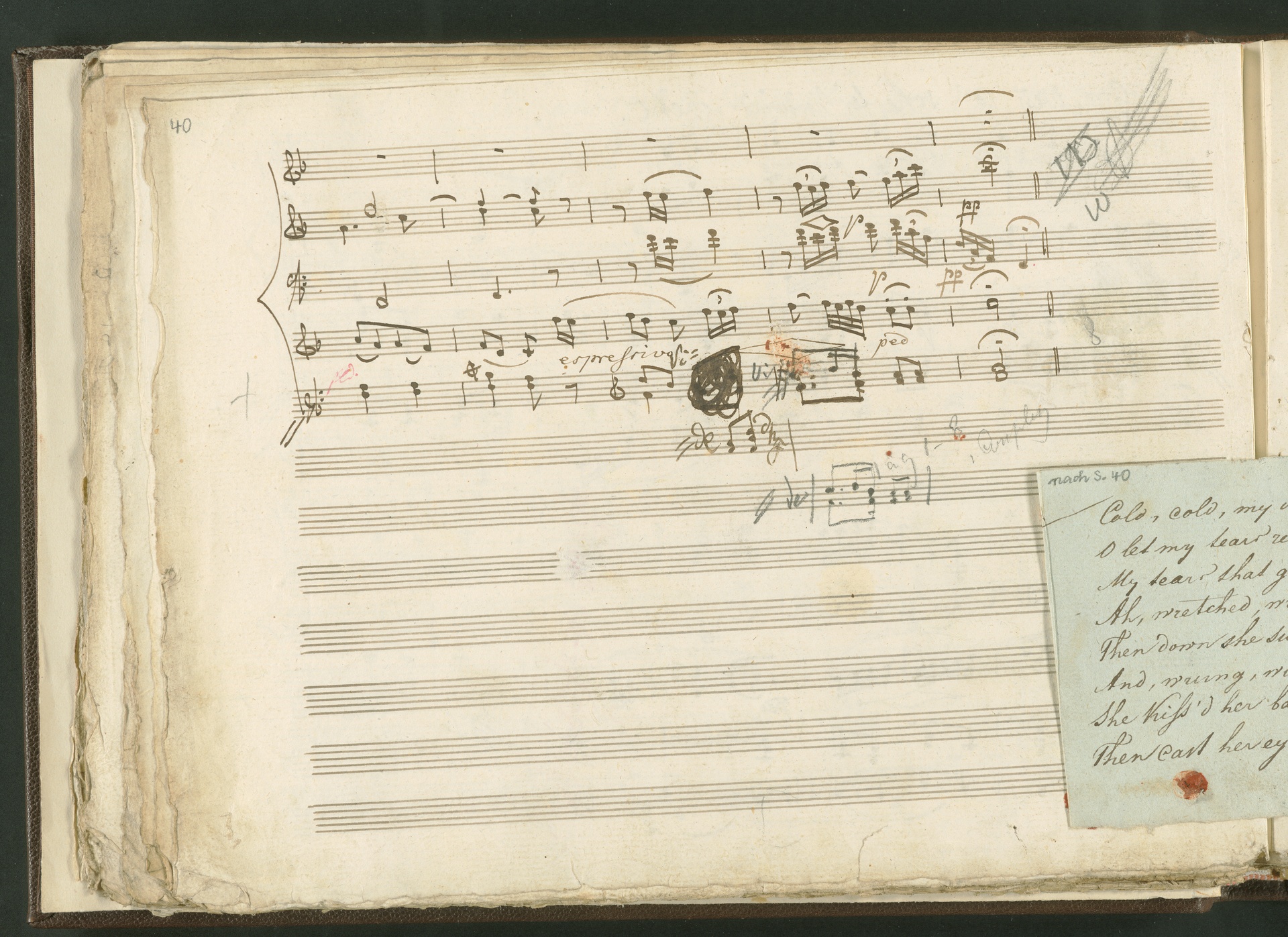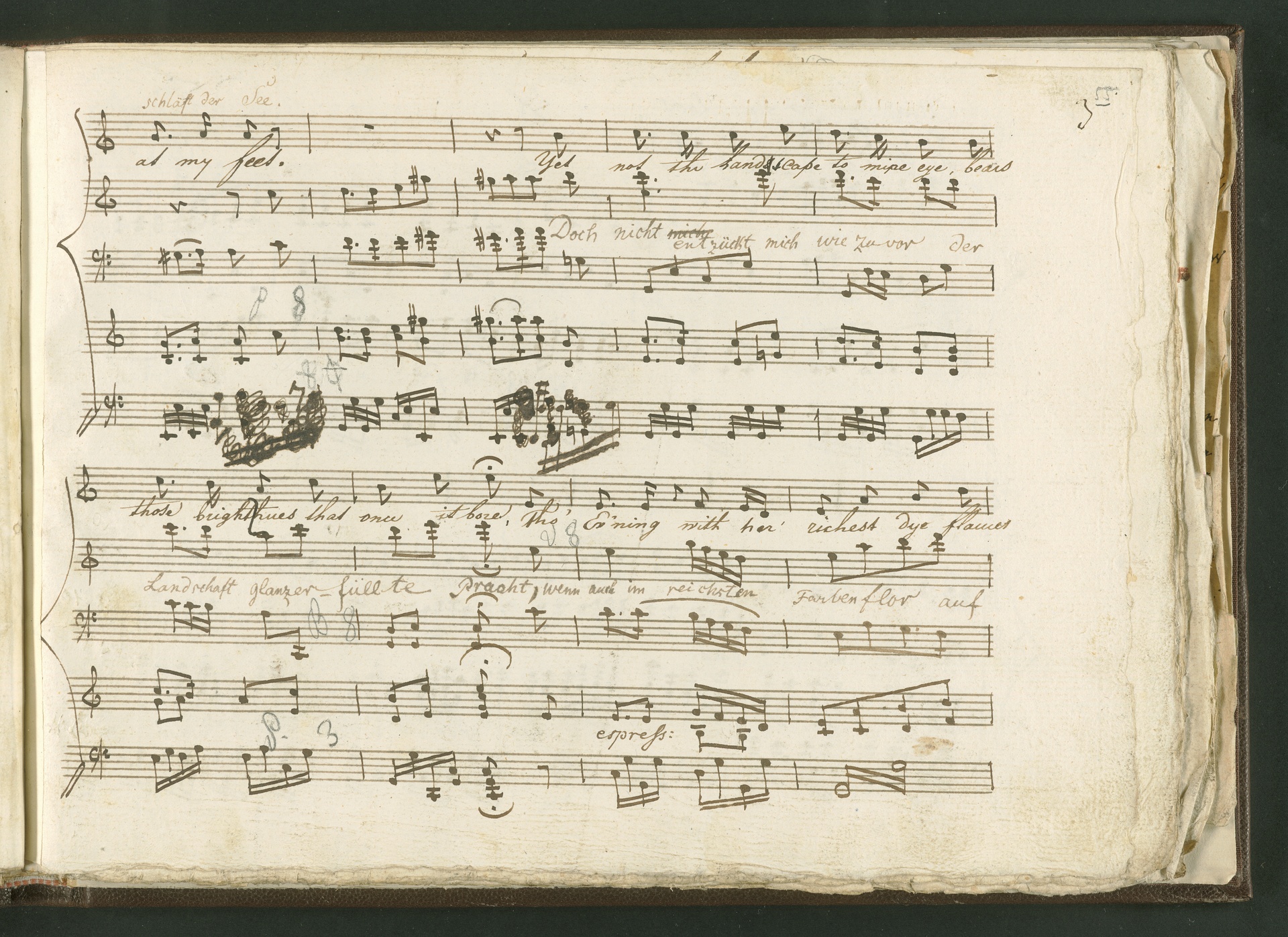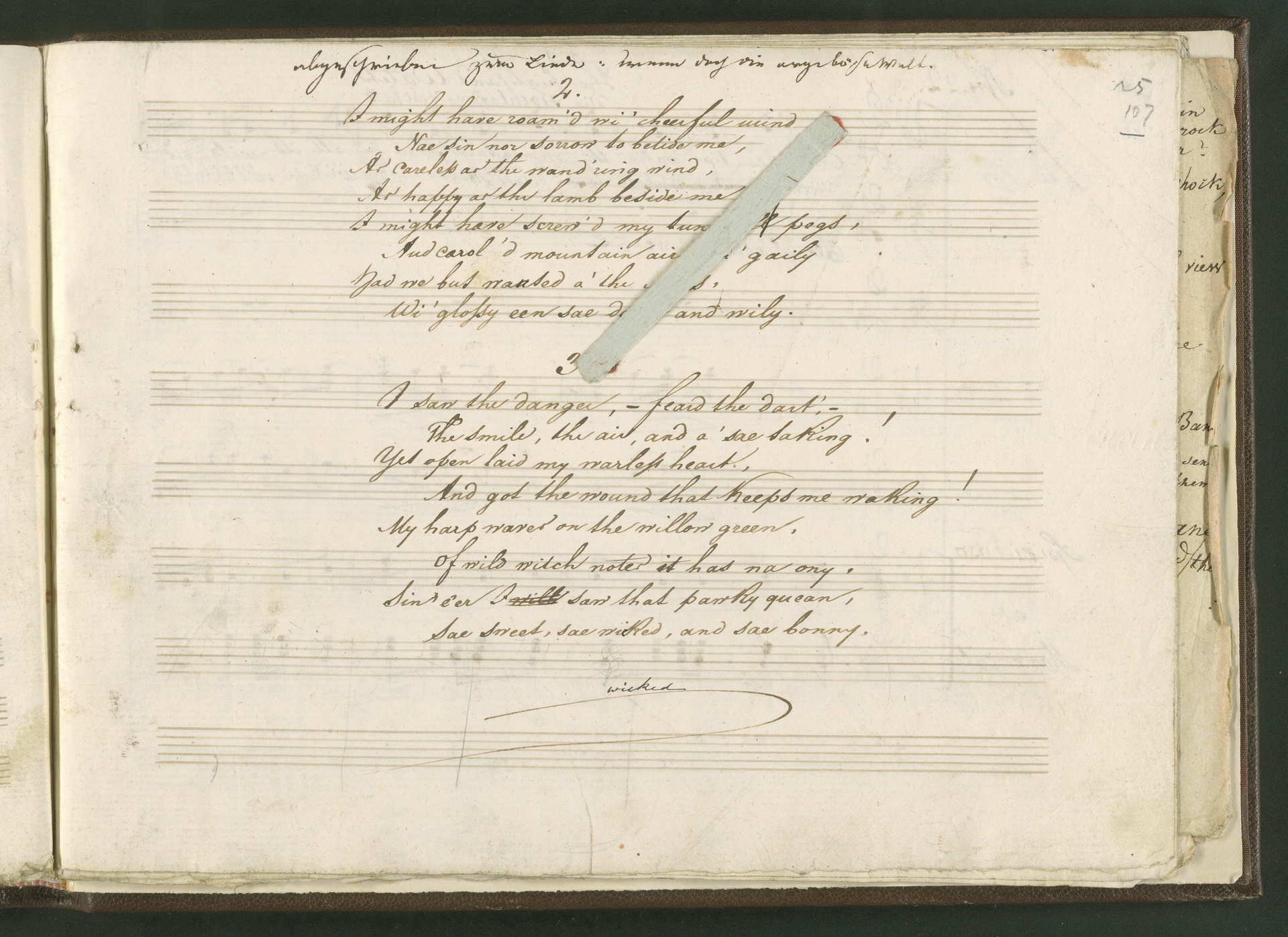 Im Juni 1818 erschien auf den britischen Inseln "A Select Collection of Original Scottish Airs": Beethovens musikalische Ausgestaltung von 25 schottischen Liedern. Beethoven, durchaus kein schlechter Geschäftsmann, versuchte anschließend, die Kompositionen auch auf dem Kontinent zu verkaufen und hatte 1820 in Berlin Glück. Der Verleger Adolph Martin Schlesinger interessierte sich für die Lieder und veranstaltete 1822 eine deutsche Ausgabe. Die überprüfte Abschrift ist die Stichvorlage für diese deutsche Originalausgabe (Op. 108). Neben dem von zwei unterschiedlichen Schreibern kopierten Notentext sind noch zwei weitere Handschriften erkennbar: Franz Oliva, Beethovens Freund und freiwilliger Sekretär schrieb den englischen Text der Lieder in die Abschrift, Samuel Heinrich Spiker fügte deren deutsche Übersetzung hinzu. Um die Lieder auf dem deutschen Markt besser verkaufen zu können, ließ Schlesinger sie übersetzen und druckte seine Ausgabe zweisprachig englisch und deutsch. Die Lieder waren im Original in einem schottischen Dialekt geschrieben, was deren Übersetzung nicht eben einfach machte. Der deutsche Text ist nicht immer ganz glücklich. Auch Beethoven bemerkte das in einem Brief an Schlesinger am 9. April 1822 und bat um Abhilfe: "wegen den Schottischen Liedern schrieb ich ihnen schon, daß beßer vom dichter auf die Langen u. kurzen Silben, welche leztere oft auf lange Noten u. die erstern auf kurze Nothen gerathen sind, Es läßt sich zwar etwas entschuld. in dieser Art, wäre der dichter hier so wäres leicht, jezt aber bin ich so überhaüft beschäftigt, daß es mir nicht mögl. ist, H. Zelter ein Mann von Kenntniß in der Poesie wie es sich für einen ausgezeichneten autor schikt, würde wol bald ihnen helfen können diese kleinen Fleken abzuwaschen" (BGA 1460, Beethoven an Adolph Martin Schlesinger). Trotz Beethovens Empfehlung, sich an Zelter (ein Freund Goethes) zu wenden, blieb der Verlag bei Spiker. Die deutschen Textunterlegungen wurden weder korrigiert noch geändert. (J.R.)