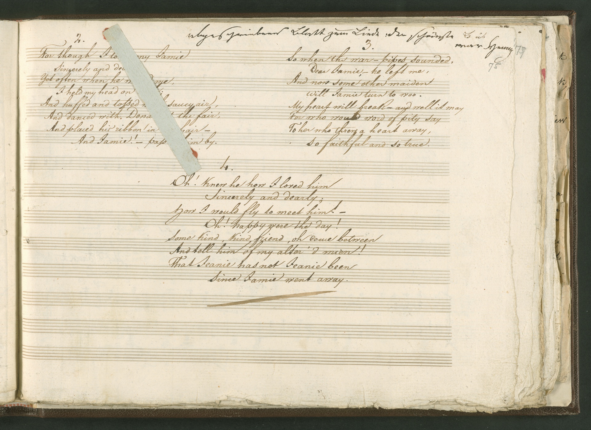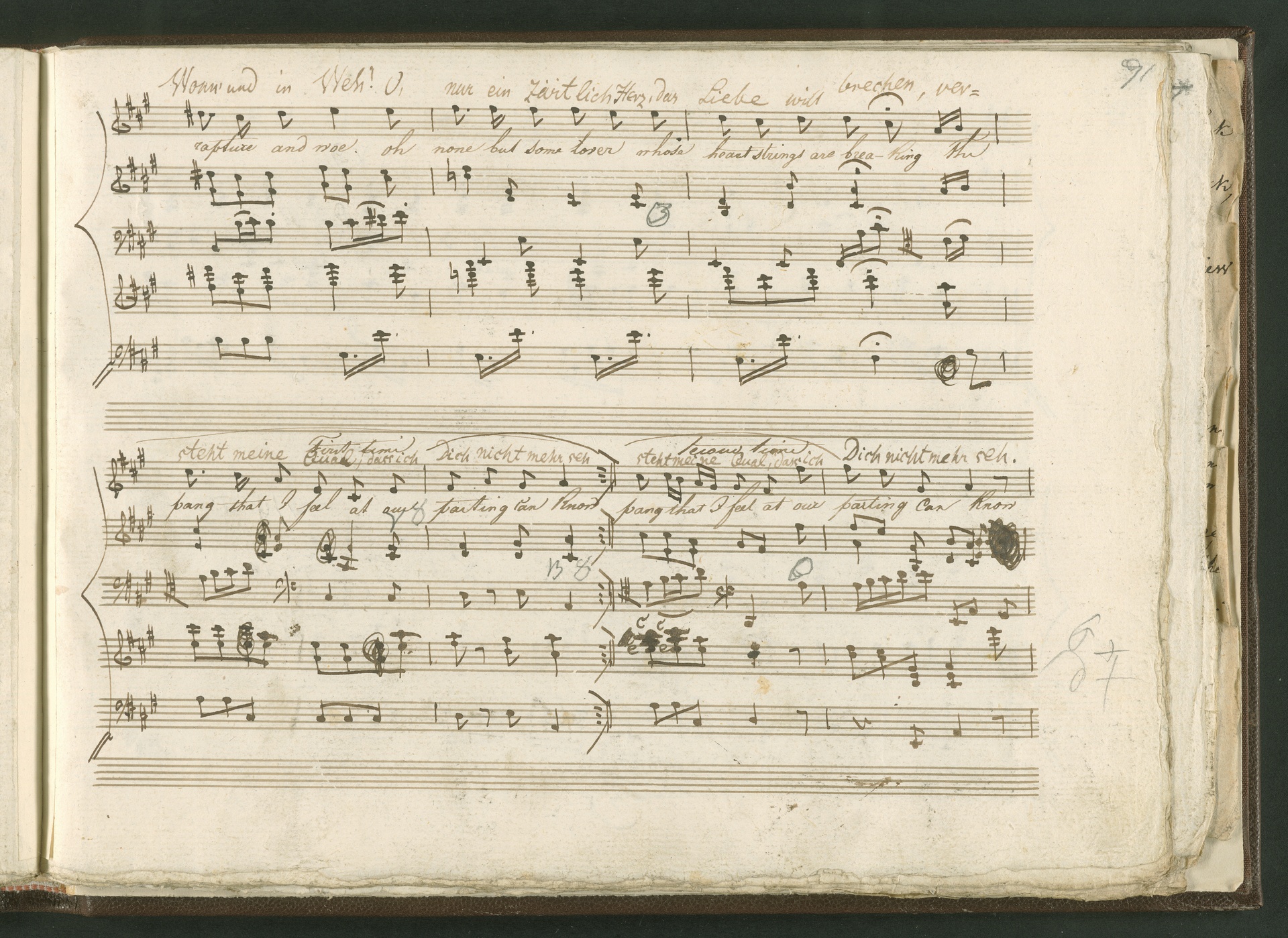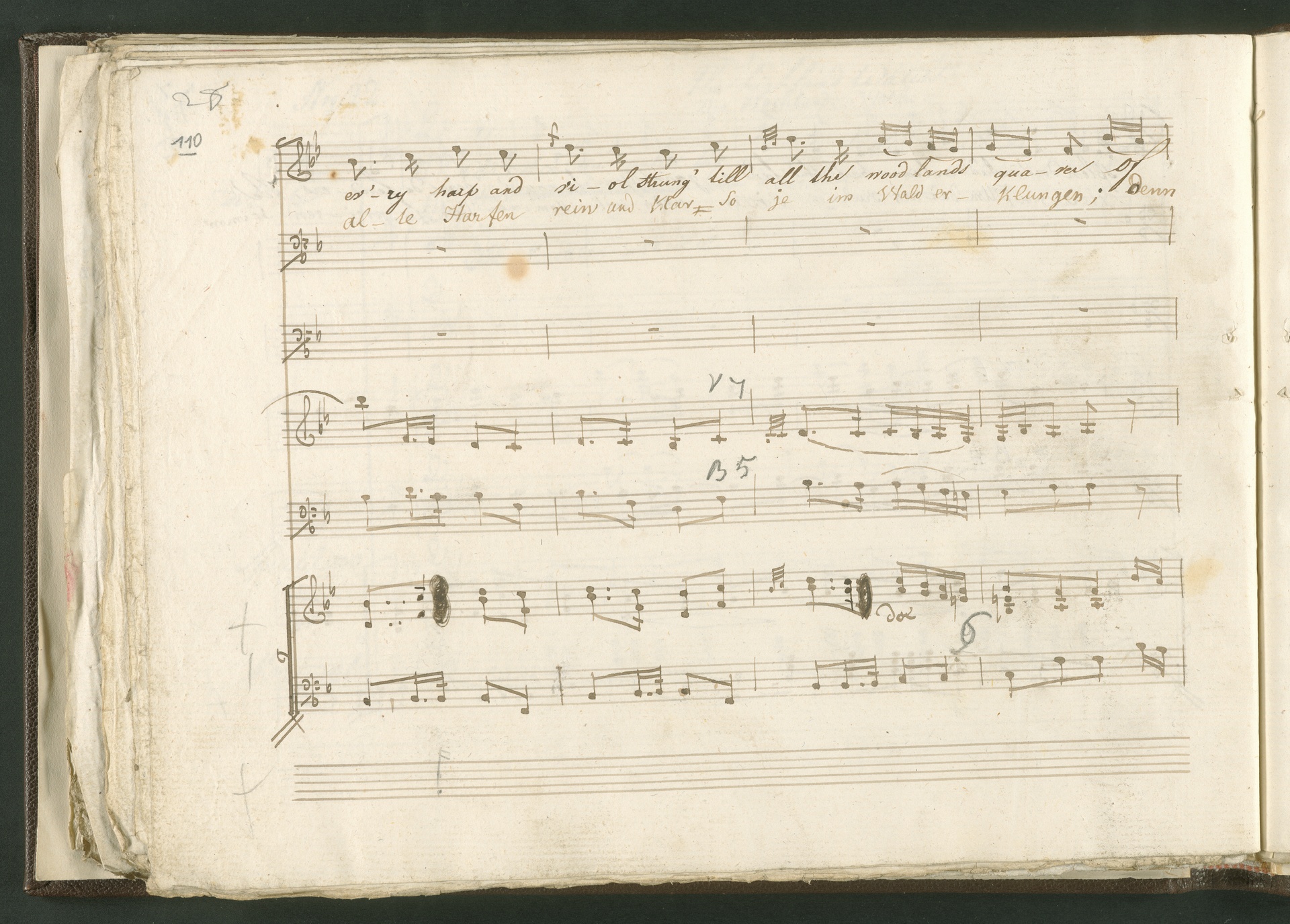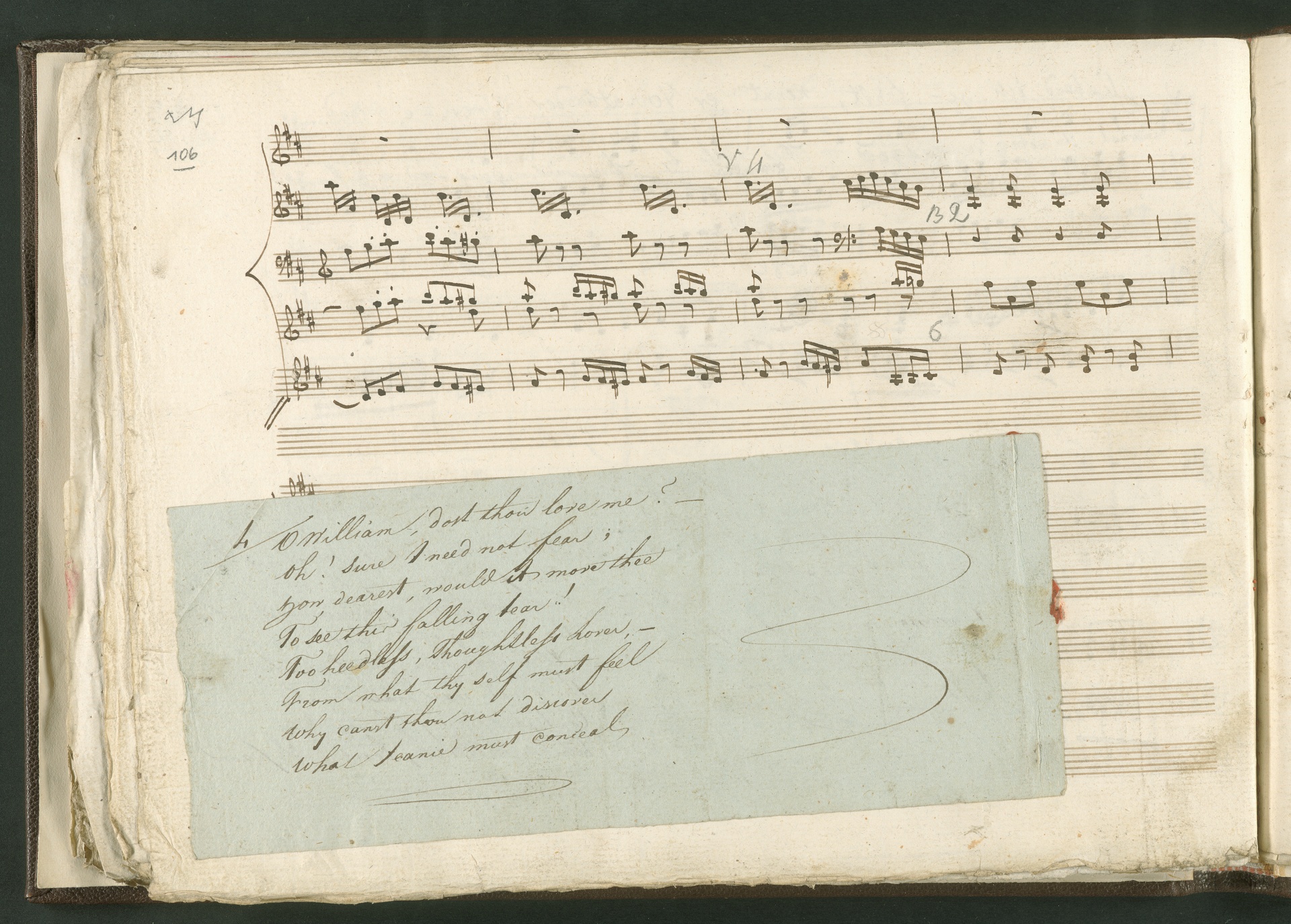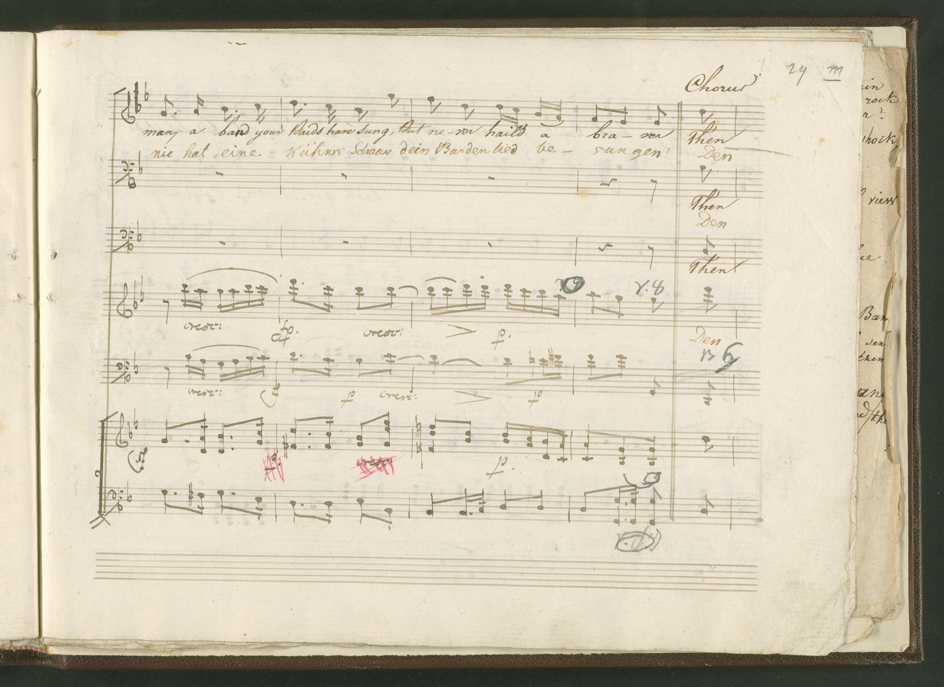 Im Juni 1818 erschien auf den britischen Inseln "A Select Collection of Original Scottish Airs": Beethovens musikalische Ausgestaltung von 25 schottischen Liedern. Beethoven, durchaus kein schlechter Geschäftsmann, versuchte anschließend, die Kompositionen auch auf dem Kontinent zu verkaufen und hatte 1820 in Berlin Glück. Der Verleger Adolph Martin Schlesinger interessierte sich für die Lieder und veranstaltete 1822 eine deutsche Ausgabe. Die überprüfte Abschrift ist die Stichvorlage für diese deutsche Originalausgabe (Op. 108). Neben dem von zwei unterschiedlichen Schreibern kopierten Notentext sind noch zwei weitere Handschriften erkennbar: Franz Oliva, Beethovens Freund und freiwilliger Sekretär schrieb den englischen Text der Lieder in die Abschrift, Samuel Heinrich Spiker fügte deren deutsche Übersetzung hinzu. Um die Lieder auf dem deutschen Markt besser verkaufen zu können, ließ Schlesinger sie übersetzen und druckte seine Ausgabe zweisprachig englisch und deutsch. Die Lieder waren im Original in einem schottischen Dialekt geschrieben, was deren Übersetzung nicht eben einfach machte. Der deutsche Text ist nicht immer ganz glücklich. Auch Beethoven bemerkte das in einem Brief an Schlesinger am 9. April 1822 und bat um Abhilfe: "wegen den Schottischen Liedern schrieb ich ihnen schon, daß beßer vom dichter auf die Langen u. kurzen Silben, welche leztere oft auf lange Noten u. die erstern auf kurze Nothen gerathen sind, Es läßt sich zwar etwas entschuld. in dieser Art, wäre der dichter hier so wäres leicht, jezt aber bin ich so überhaüft beschäftigt, daß es mir nicht mögl. ist, H. Zelter ein Mann von Kenntniß in der Poesie wie es sich für einen ausgezeichneten autor schikt, würde wol bald ihnen helfen können diese kleinen Fleken abzuwaschen" (BGA 1460, Beethoven an Adolph Martin Schlesinger). Trotz Beethovens Empfehlung, sich an Zelter (ein Freund Goethes) zu wenden, blieb der Verlag bei Spiker. Die deutschen Textunterlegungen wurden weder korrigiert noch geändert. (J.R.)