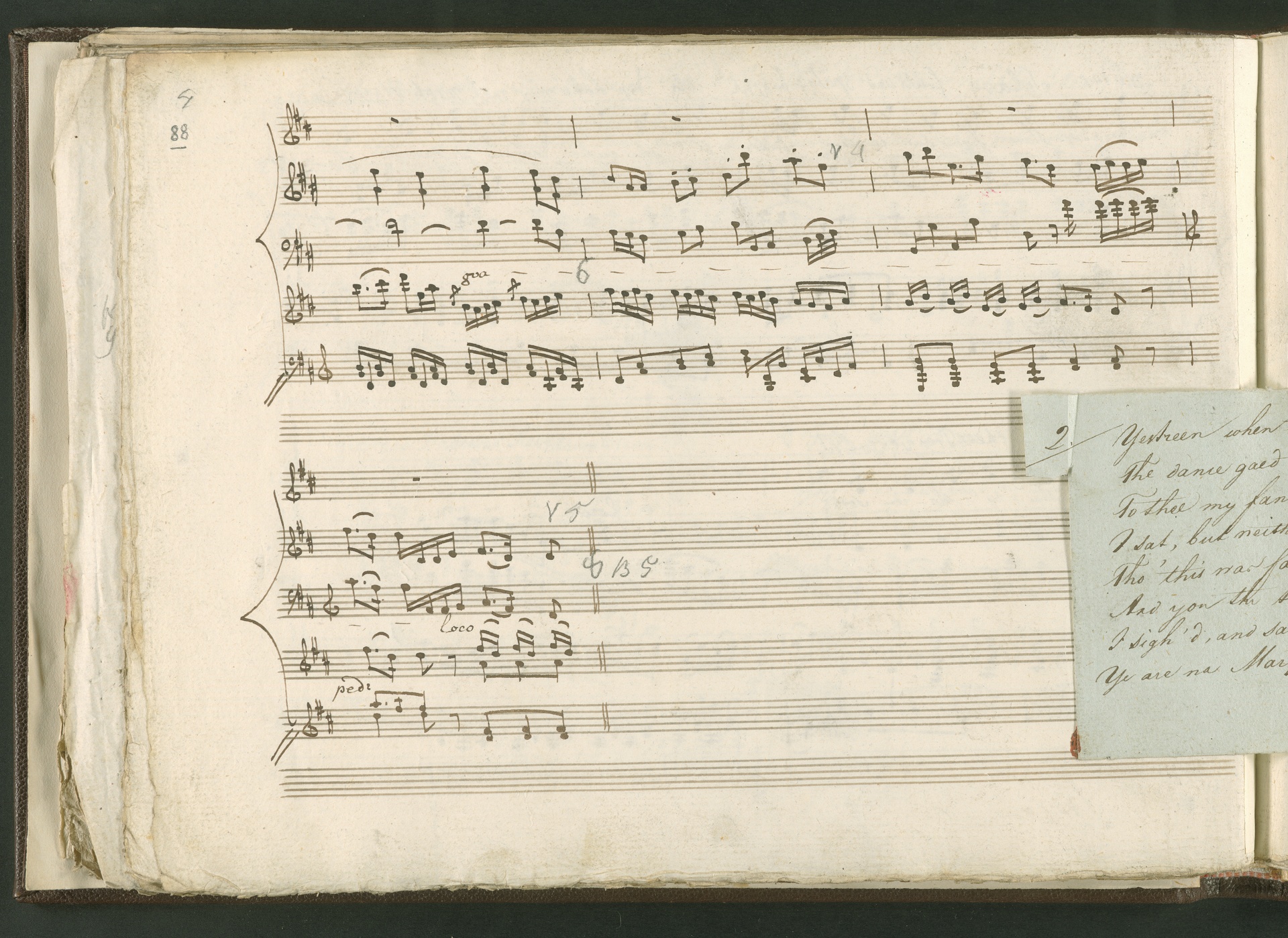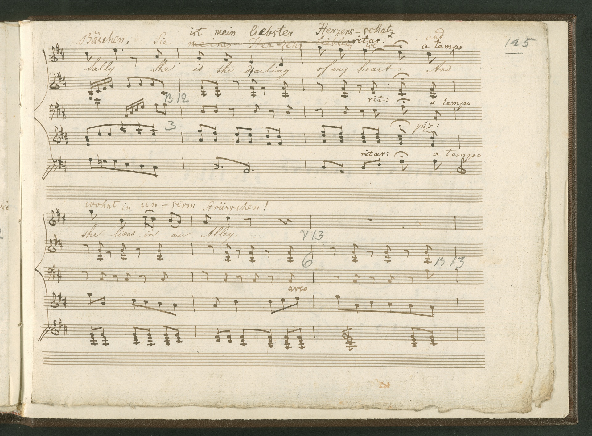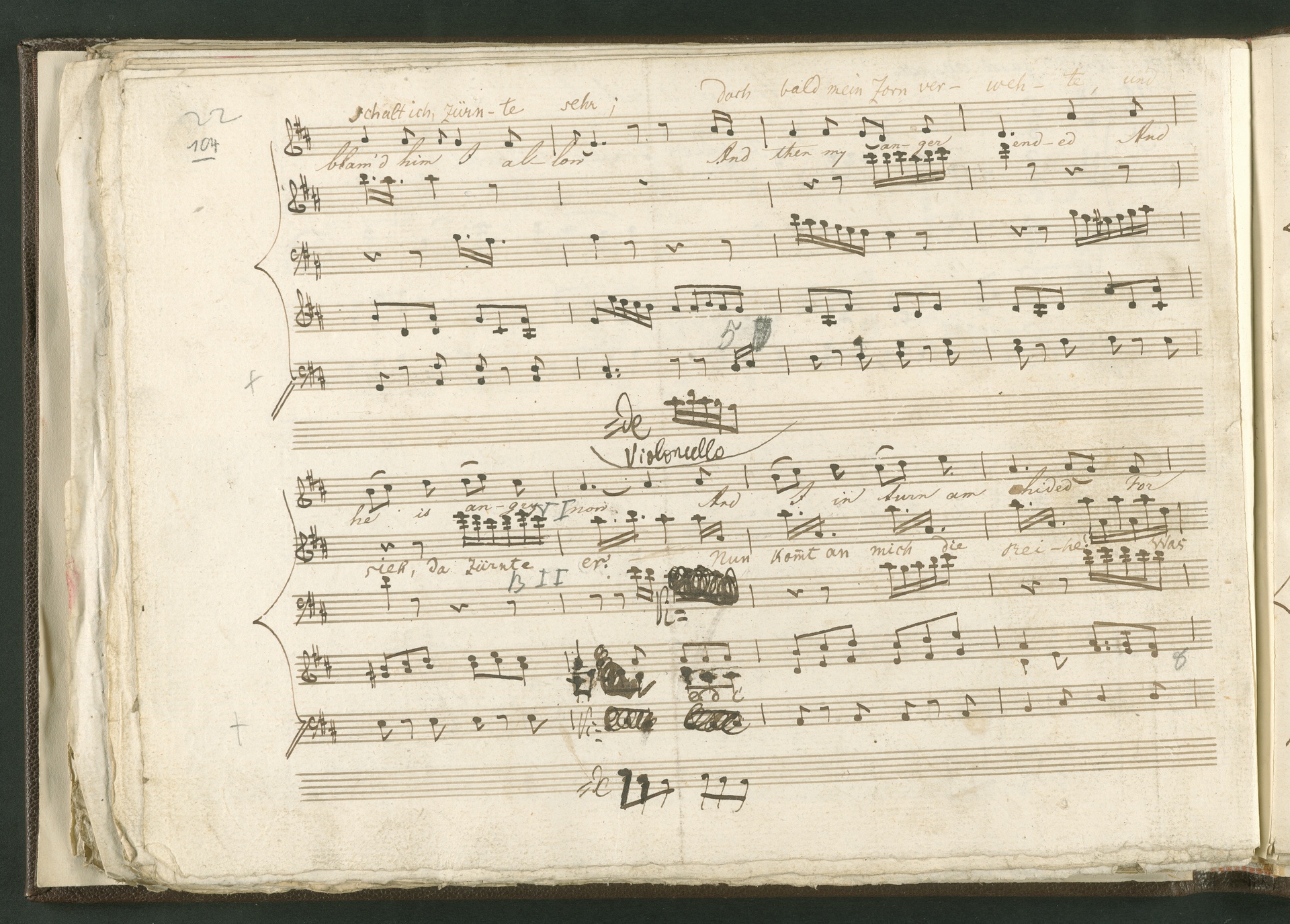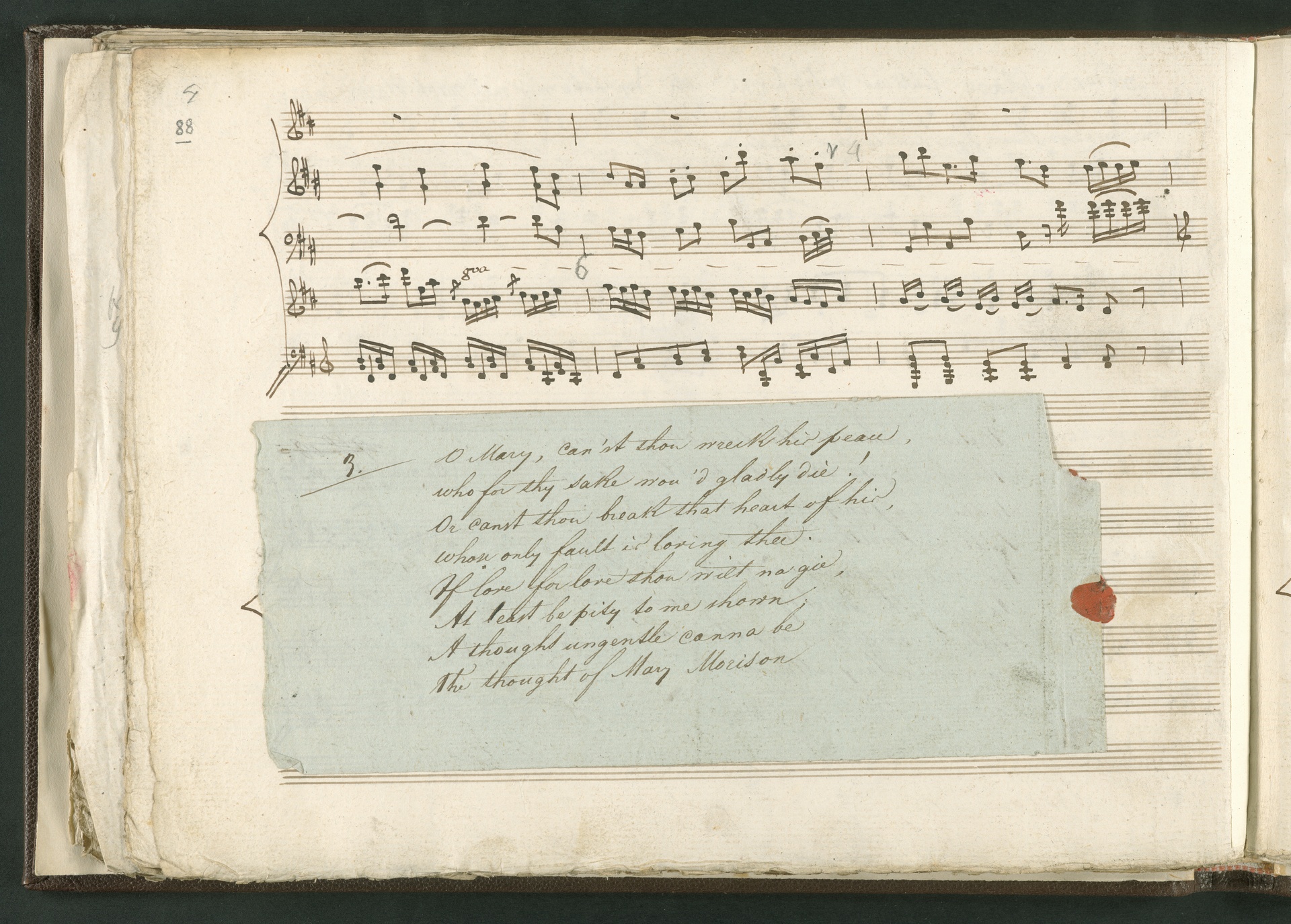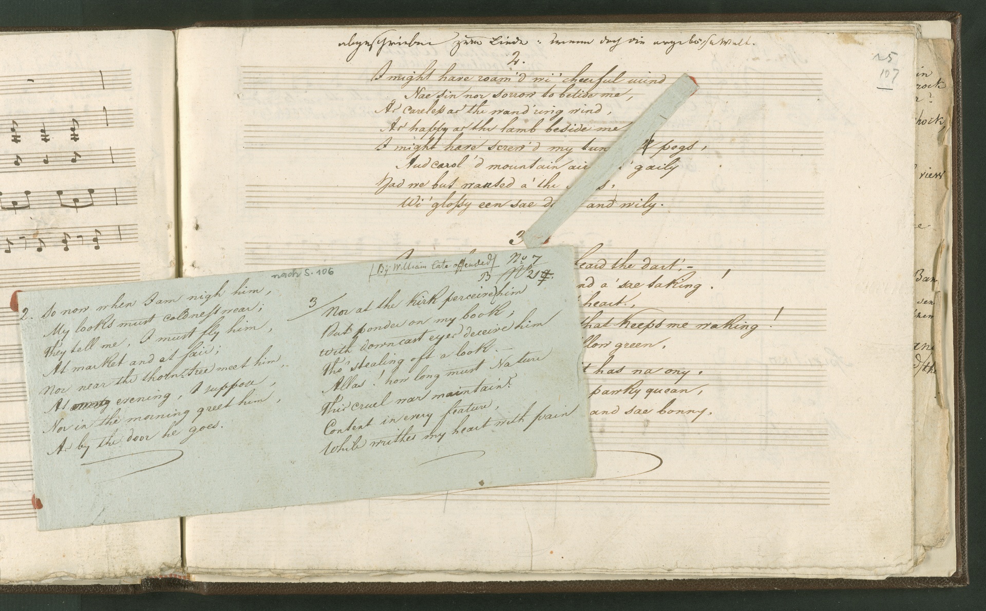 Im Juni 1818 erschien auf den britischen Inseln "A Select Collection of Original Scottish Airs": Beethovens musikalische Ausgestaltung von 25 schottischen Liedern. Beethoven, durchaus kein schlechter Geschäftsmann, versuchte anschließend, die Kompositionen auch auf dem Kontinent zu verkaufen und hatte 1820 in Berlin Glück. Der Verleger Adolph Martin Schlesinger interessierte sich für die Lieder und veranstaltete 1822 eine deutsche Ausgabe. Die überprüfte Abschrift ist die Stichvorlage für diese deutsche Originalausgabe (Op. 108). Neben dem von zwei unterschiedlichen Schreibern kopierten Notentext sind noch zwei weitere Handschriften erkennbar: Franz Oliva, Beethovens Freund und freiwilliger Sekretär schrieb den englischen Text der Lieder in die Abschrift, Samuel Heinrich Spiker fügte deren deutsche Übersetzung hinzu. Um die Lieder auf dem deutschen Markt besser verkaufen zu können, ließ Schlesinger sie übersetzen und druckte seine Ausgabe zweisprachig englisch und deutsch. Die Lieder waren im Original in einem schottischen Dialekt geschrieben, was deren Übersetzung nicht eben einfach machte. Der deutsche Text ist nicht immer ganz glücklich. Auch Beethoven bemerkte das in einem Brief an Schlesinger am 9. April 1822 und bat um Abhilfe: "wegen den Schottischen Liedern schrieb ich ihnen schon, daß beßer vom dichter auf die Langen u. kurzen Silben, welche leztere oft auf lange Noten u. die erstern auf kurze Nothen gerathen sind, Es läßt sich zwar etwas entschuld. in dieser Art, wäre der dichter hier so wäres leicht, jezt aber bin ich so überhaüft beschäftigt, daß es mir nicht mögl. ist, H. Zelter ein Mann von Kenntniß in der Poesie wie es sich für einen ausgezeichneten autor schikt, würde wol bald ihnen helfen können diese kleinen Fleken abzuwaschen" (BGA 1460, Beethoven an Adolph Martin Schlesinger). Trotz Beethovens Empfehlung, sich an Zelter (ein Freund Goethes) zu wenden, blieb der Verlag bei Spiker. Die deutschen Textunterlegungen wurden weder korrigiert noch geändert. (J.R.)