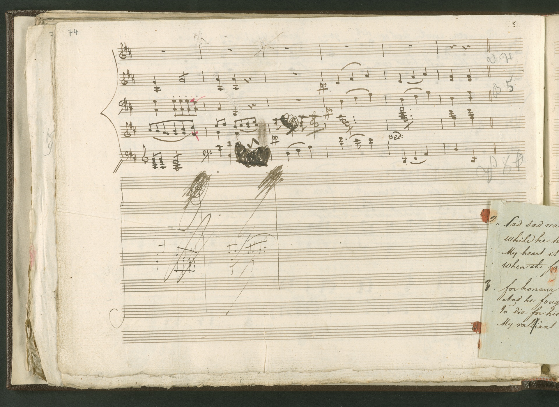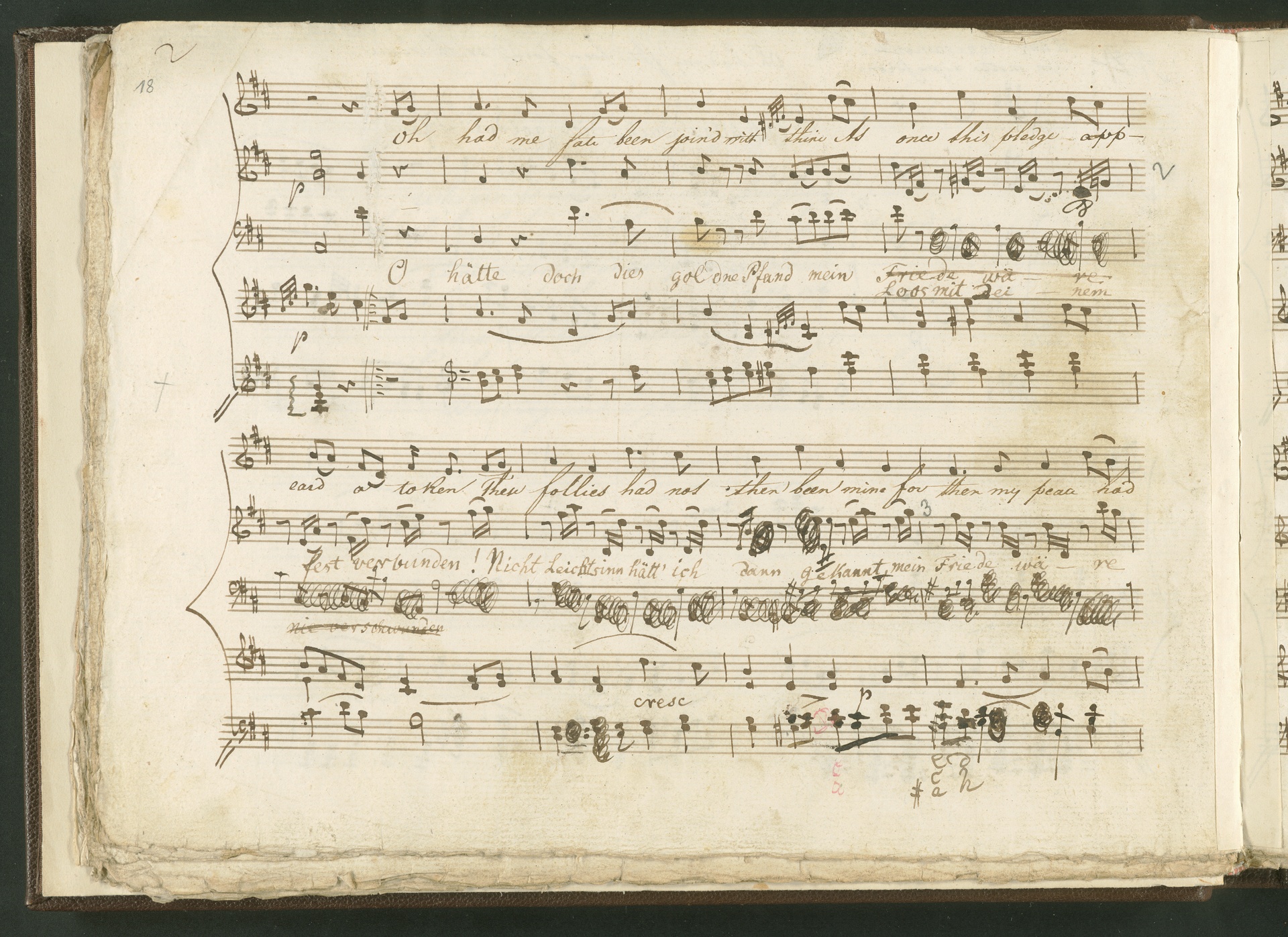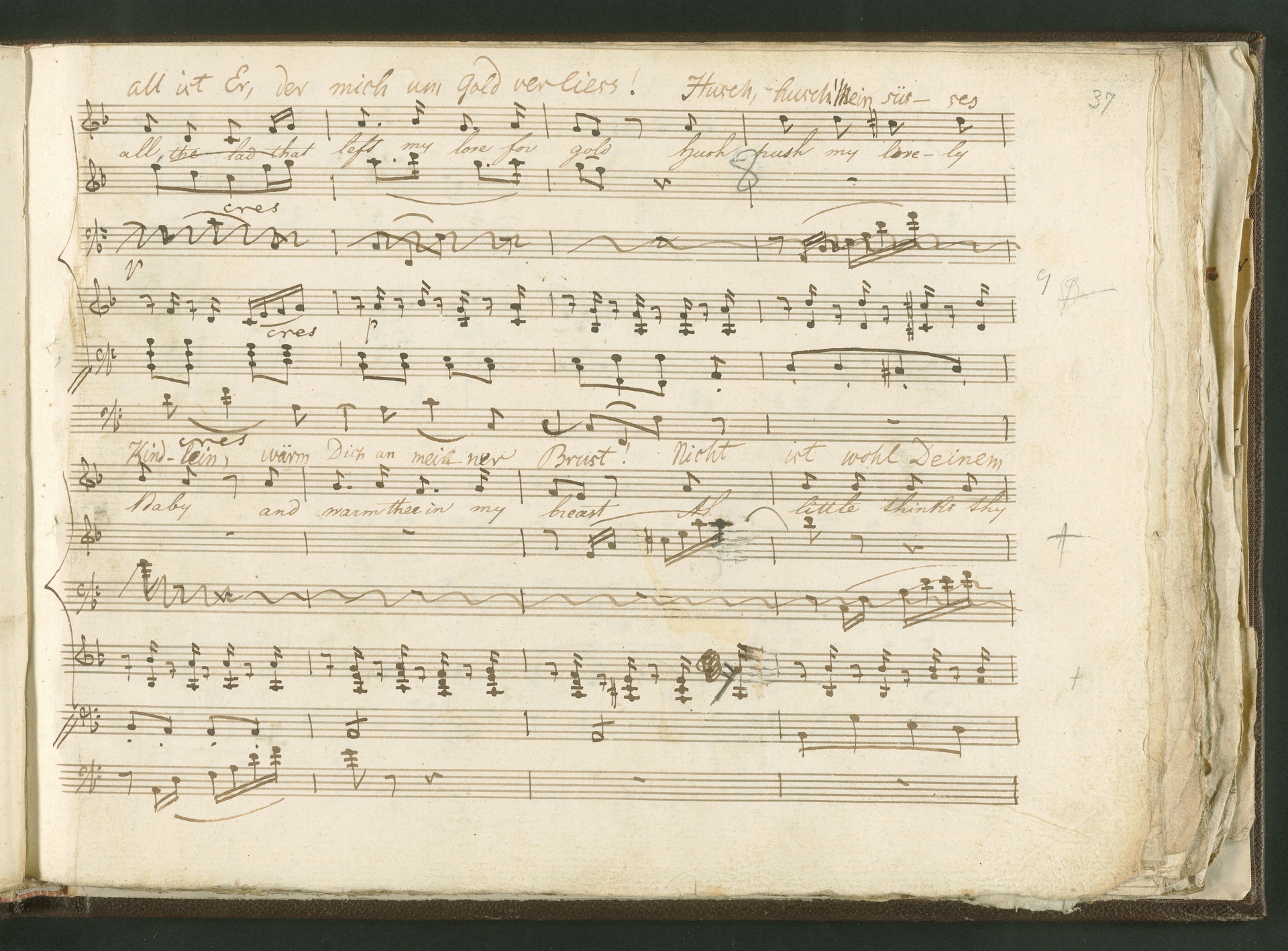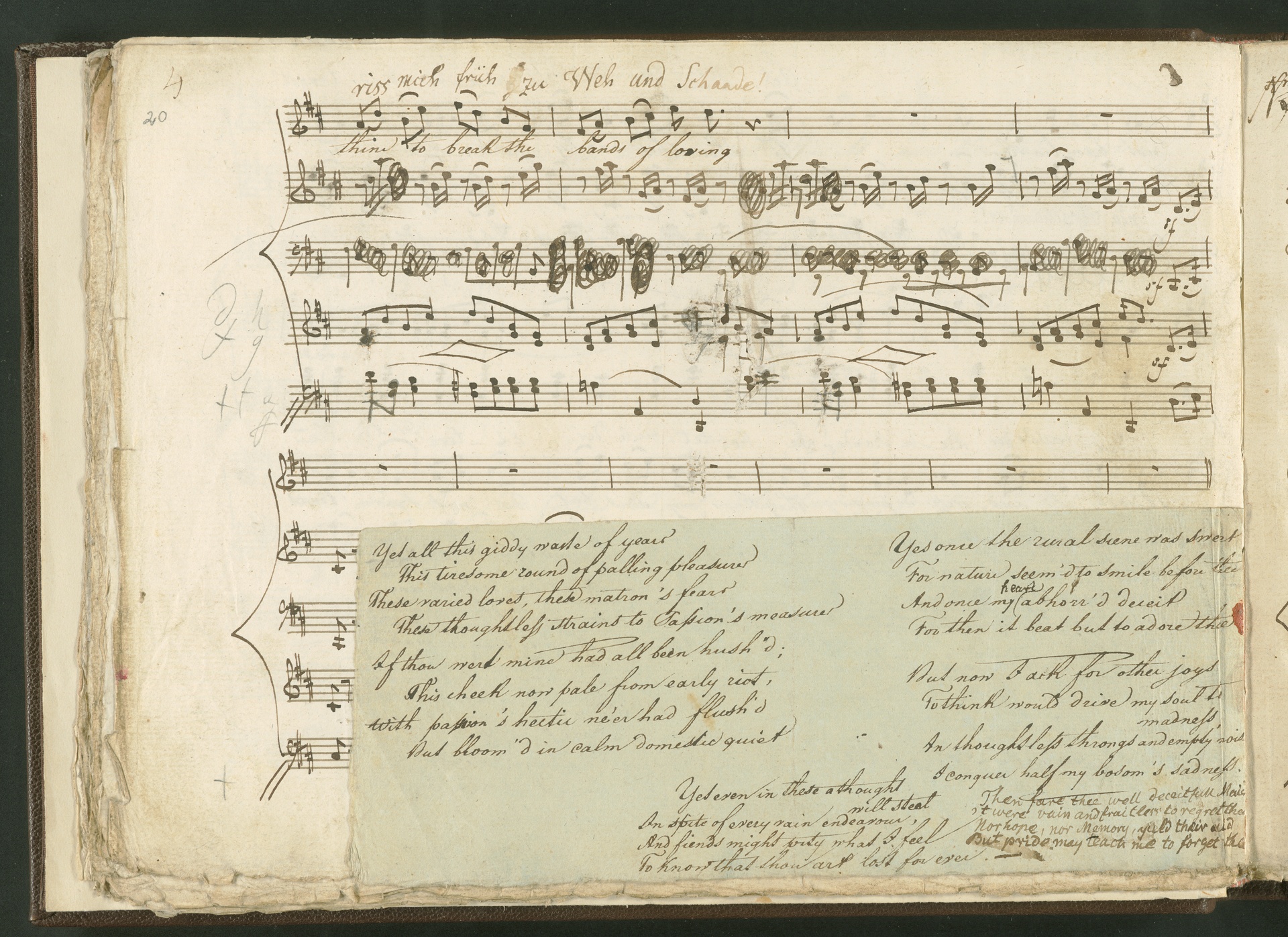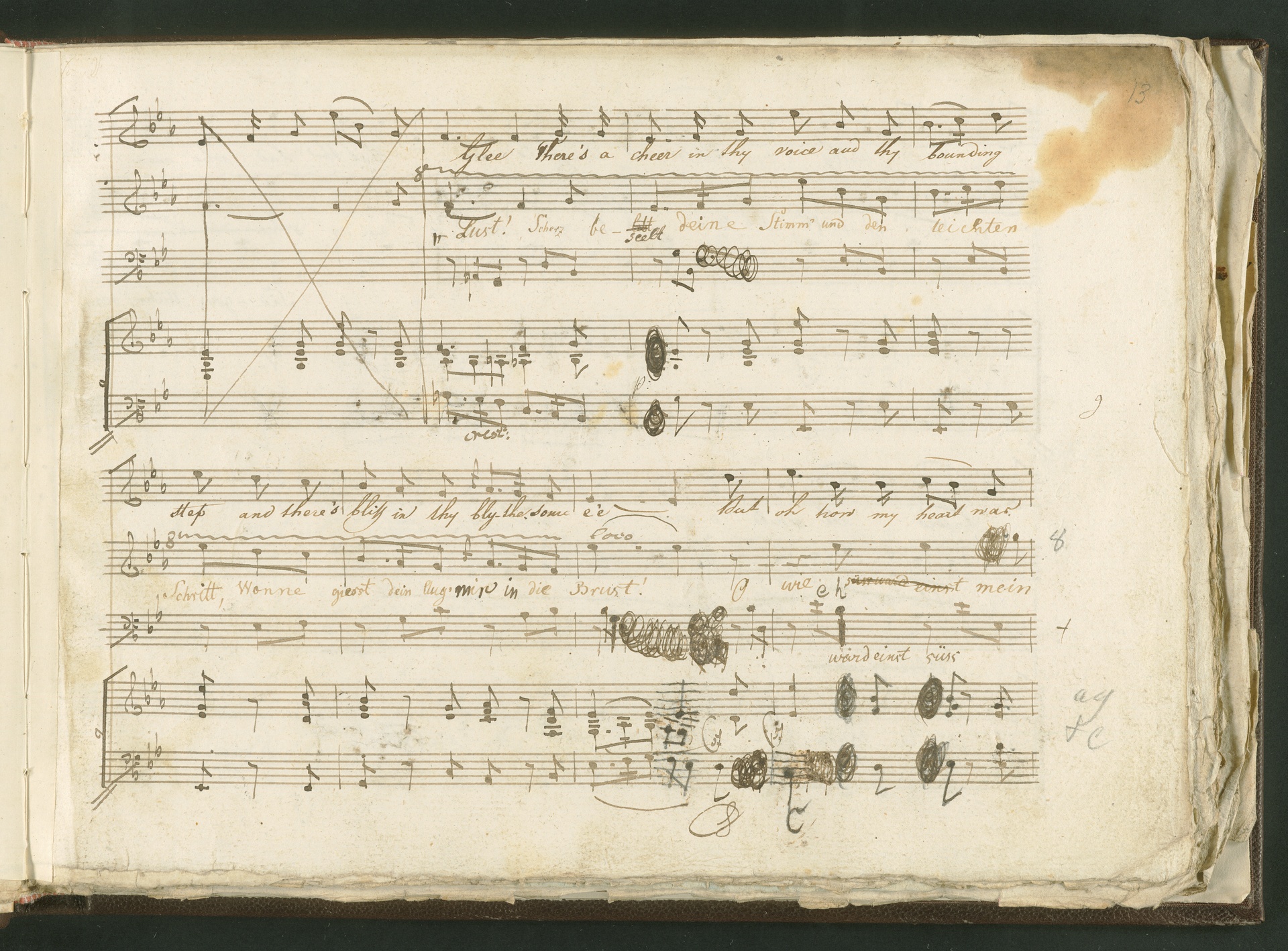 Im Juni 1818 erschien auf den britischen Inseln "A Select Collection of Original Scottish Airs": Beethovens musikalische Ausgestaltung von 25 schottischen Liedern. Beethoven, durchaus kein schlechter Geschäftsmann, versuchte anschließend, die Kompositionen auch auf dem Kontinent zu verkaufen und hatte 1820 in Berlin Glück. Der Verleger Adolph Martin Schlesinger interessierte sich für die Lieder und veranstaltete 1822 eine deutsche Ausgabe. Die überprüfte Abschrift ist die Stichvorlage für diese deutsche Originalausgabe (Op. 108). Neben dem von zwei unterschiedlichen Schreibern kopierten Notentext sind noch zwei weitere Handschriften erkennbar: Franz Oliva, Beethovens Freund und freiwilliger Sekretär schrieb den englischen Text der Lieder in die Abschrift, Samuel Heinrich Spiker fügte deren deutsche Übersetzung hinzu. Um die Lieder auf dem deutschen Markt besser verkaufen zu können, ließ Schlesinger sie übersetzen und druckte seine Ausgabe zweisprachig englisch und deutsch. Die Lieder waren im Original in einem schottischen Dialekt geschrieben, was deren Übersetzung nicht eben einfach machte. Der deutsche Text ist nicht immer ganz glücklich. Auch Beethoven bemerkte das in einem Brief an Schlesinger am 9. April 1822 und bat um Abhilfe: "wegen den Schottischen Liedern schrieb ich ihnen schon, daß beßer vom dichter auf die Langen u. kurzen Silben, welche leztere oft auf lange Noten u. die erstern auf kurze Nothen gerathen sind, Es läßt sich zwar etwas entschuld. in dieser Art, wäre der dichter hier so wäres leicht, jezt aber bin ich so überhaüft beschäftigt, daß es mir nicht mögl. ist, H. Zelter ein Mann von Kenntniß in der Poesie wie es sich für einen ausgezeichneten autor schikt, würde wol bald ihnen helfen können diese kleinen Fleken abzuwaschen" (BGA 1460, Beethoven an Adolph Martin Schlesinger). Trotz Beethovens Empfehlung, sich an Zelter (ein Freund Goethes) zu wenden, blieb der Verlag bei Spiker. Die deutschen Textunterlegungen wurden weder korrigiert noch geändert. (J.R.)