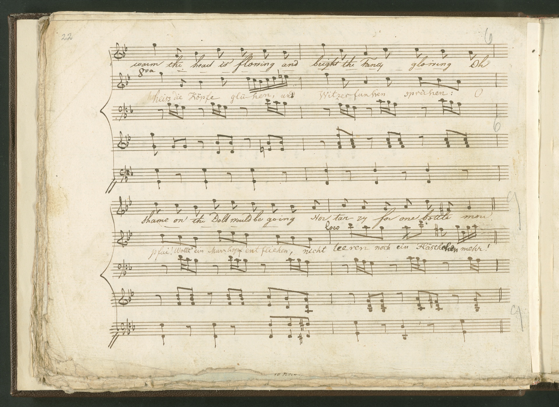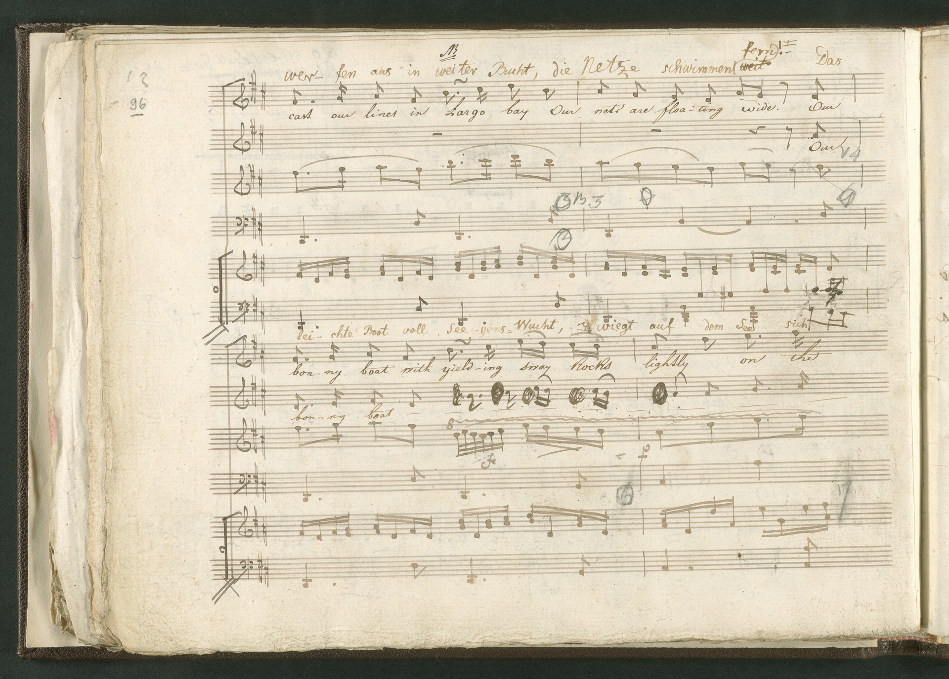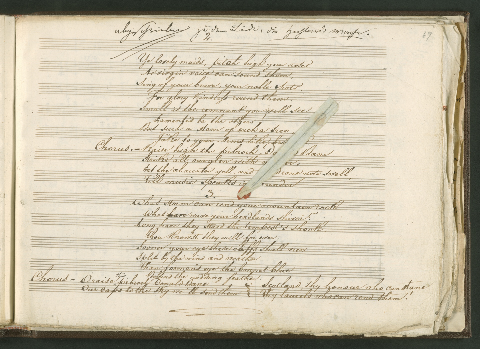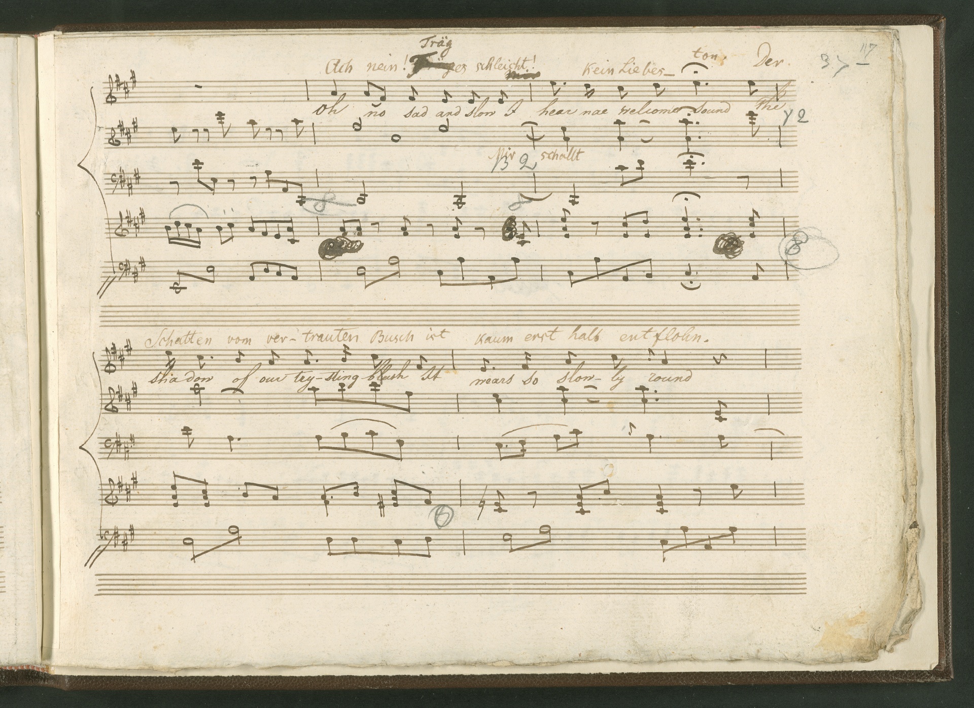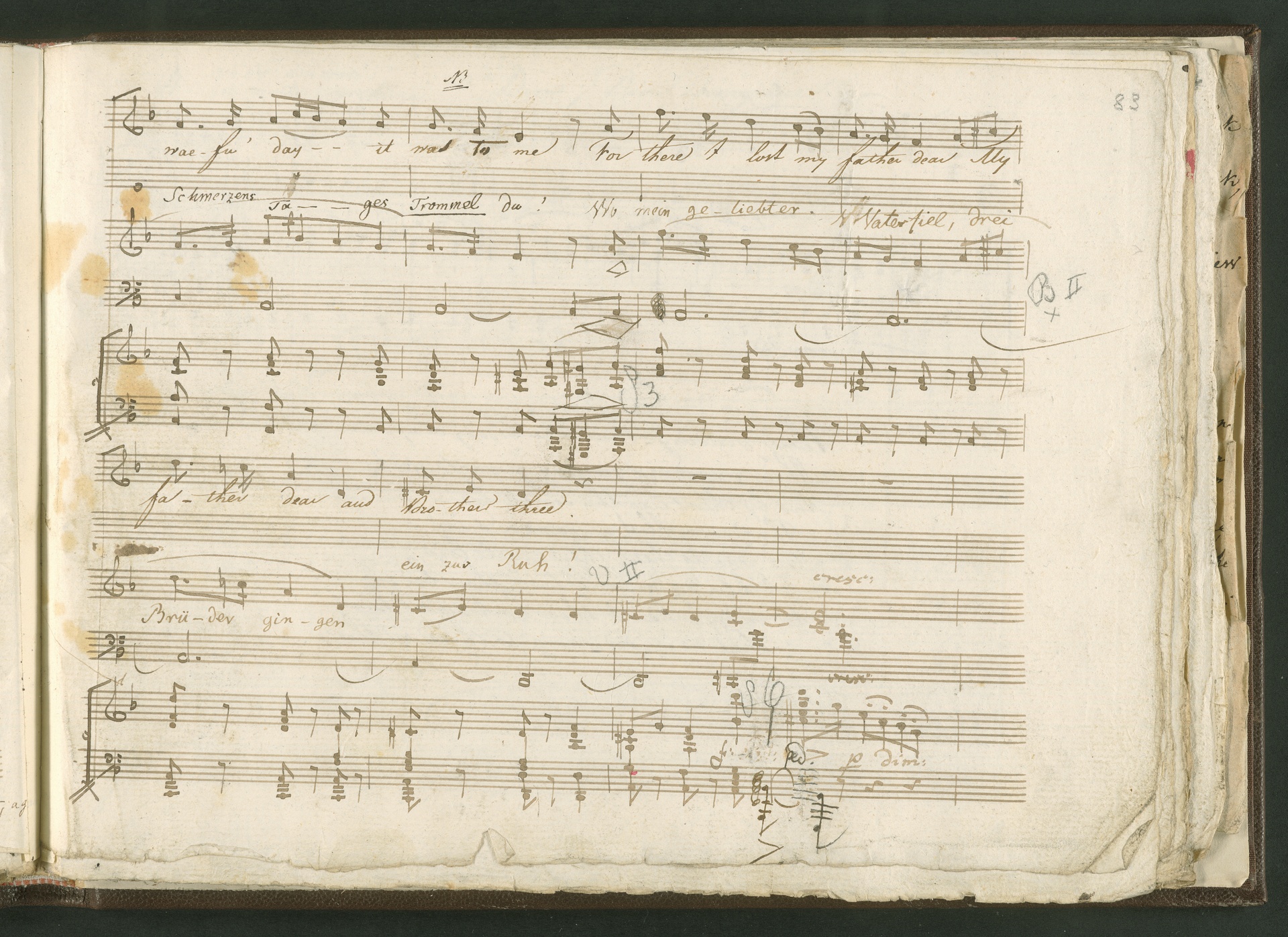 Im Juni 1818 erschien auf den britischen Inseln "A Select Collection of Original Scottish Airs": Beethovens musikalische Ausgestaltung von 25 schottischen Liedern. Beethoven, durchaus kein schlechter Geschäftsmann, versuchte anschließend, die Kompositionen auch auf dem Kontinent zu verkaufen und hatte 1820 in Berlin Glück. Der Verleger Adolph Martin Schlesinger interessierte sich für die Lieder und veranstaltete 1822 eine deutsche Ausgabe. Die überprüfte Abschrift ist die Stichvorlage für diese deutsche Originalausgabe (Op. 108). Neben dem von zwei unterschiedlichen Schreibern kopierten Notentext sind noch zwei weitere Handschriften erkennbar: Franz Oliva, Beethovens Freund und freiwilliger Sekretär schrieb den englischen Text der Lieder in die Abschrift, Samuel Heinrich Spiker fügte deren deutsche Übersetzung hinzu. Um die Lieder auf dem deutschen Markt besser verkaufen zu können, ließ Schlesinger sie übersetzen und druckte seine Ausgabe zweisprachig englisch und deutsch. Die Lieder waren im Original in einem schottischen Dialekt geschrieben, was deren Übersetzung nicht eben einfach machte. Der deutsche Text ist nicht immer ganz glücklich. Auch Beethoven bemerkte das in einem Brief an Schlesinger am 9. April 1822 und bat um Abhilfe: "wegen den Schottischen Liedern schrieb ich ihnen schon, daß beßer vom dichter auf die Langen u. kurzen Silben, welche leztere oft auf lange Noten u. die erstern auf kurze Nothen gerathen sind, Es läßt sich zwar etwas entschuld. in dieser Art, wäre der dichter hier so wäres leicht, jezt aber bin ich so überhaüft beschäftigt, daß es mir nicht mögl. ist, H. Zelter ein Mann von Kenntniß in der Poesie wie es sich für einen ausgezeichneten autor schikt, würde wol bald ihnen helfen können diese kleinen Fleken abzuwaschen" (BGA 1460, Beethoven an Adolph Martin Schlesinger). Trotz Beethovens Empfehlung, sich an Zelter (ein Freund Goethes) zu wenden, blieb der Verlag bei Spiker. Die deutschen Textunterlegungen wurden weder korrigiert noch geändert. (J.R.)