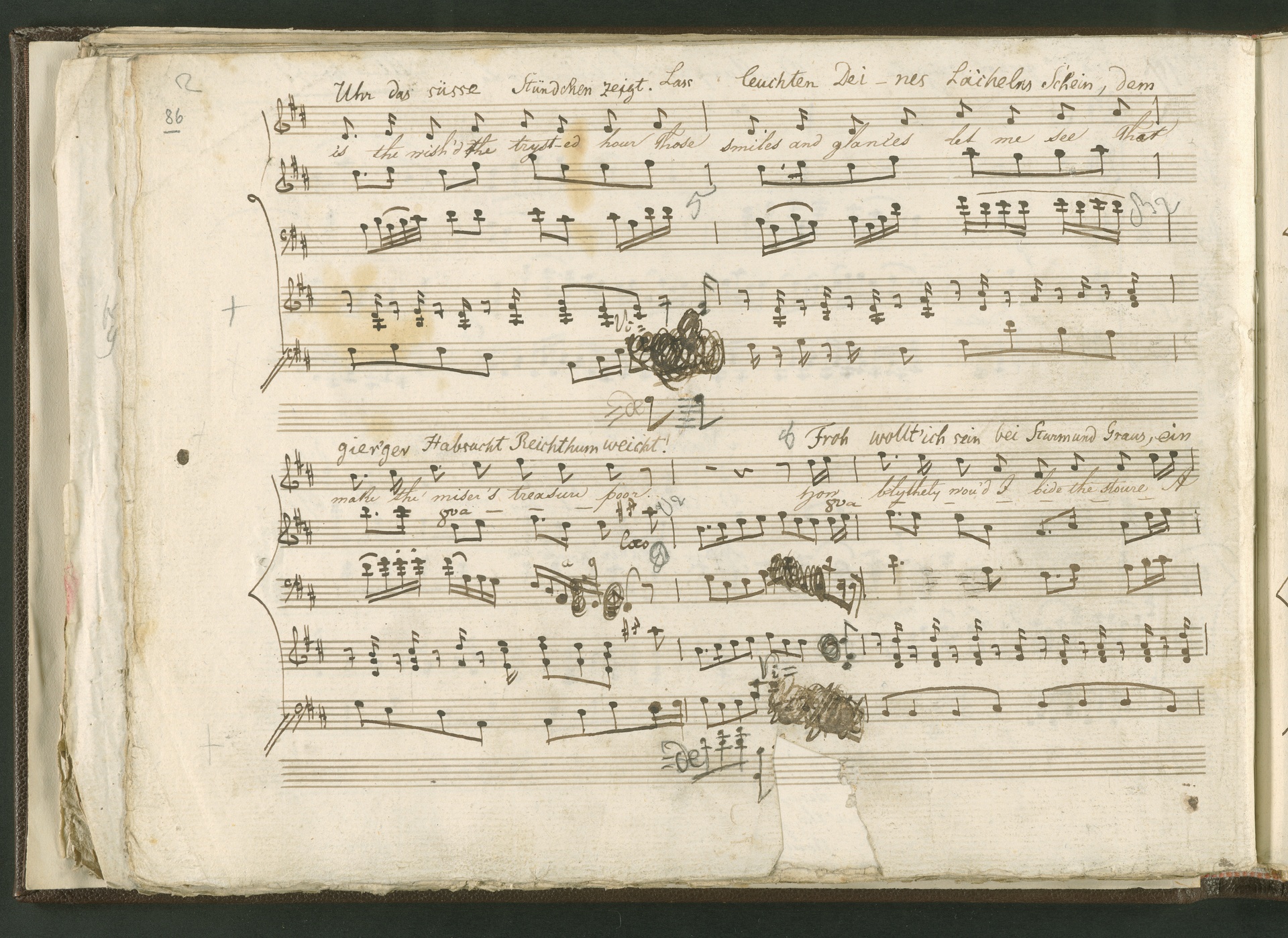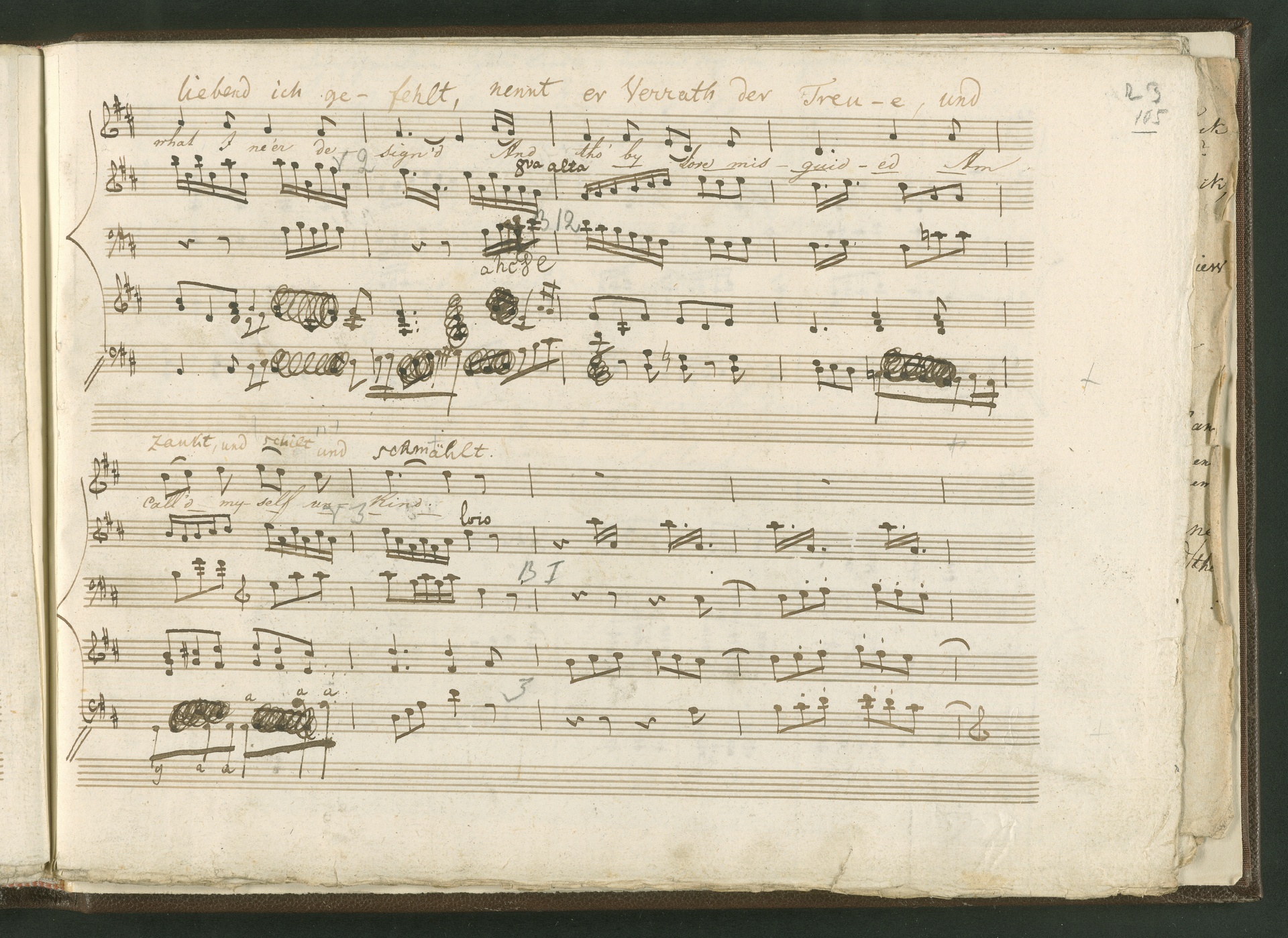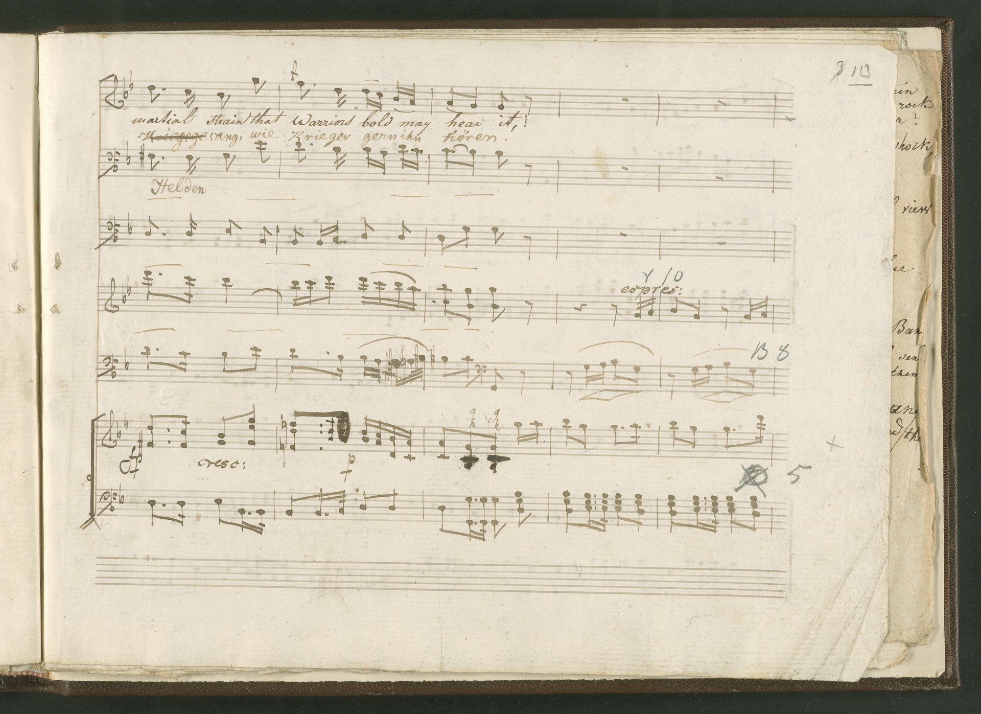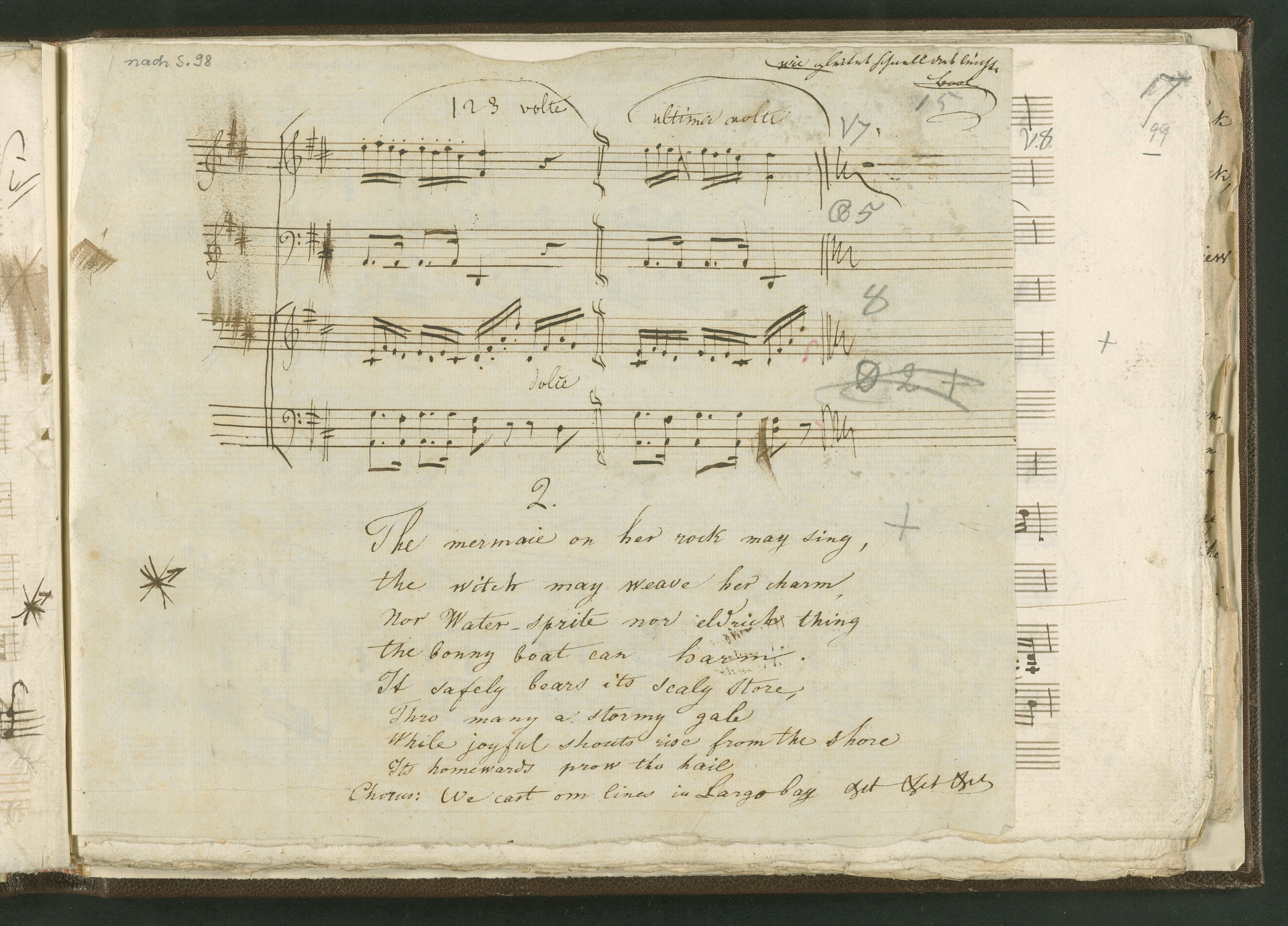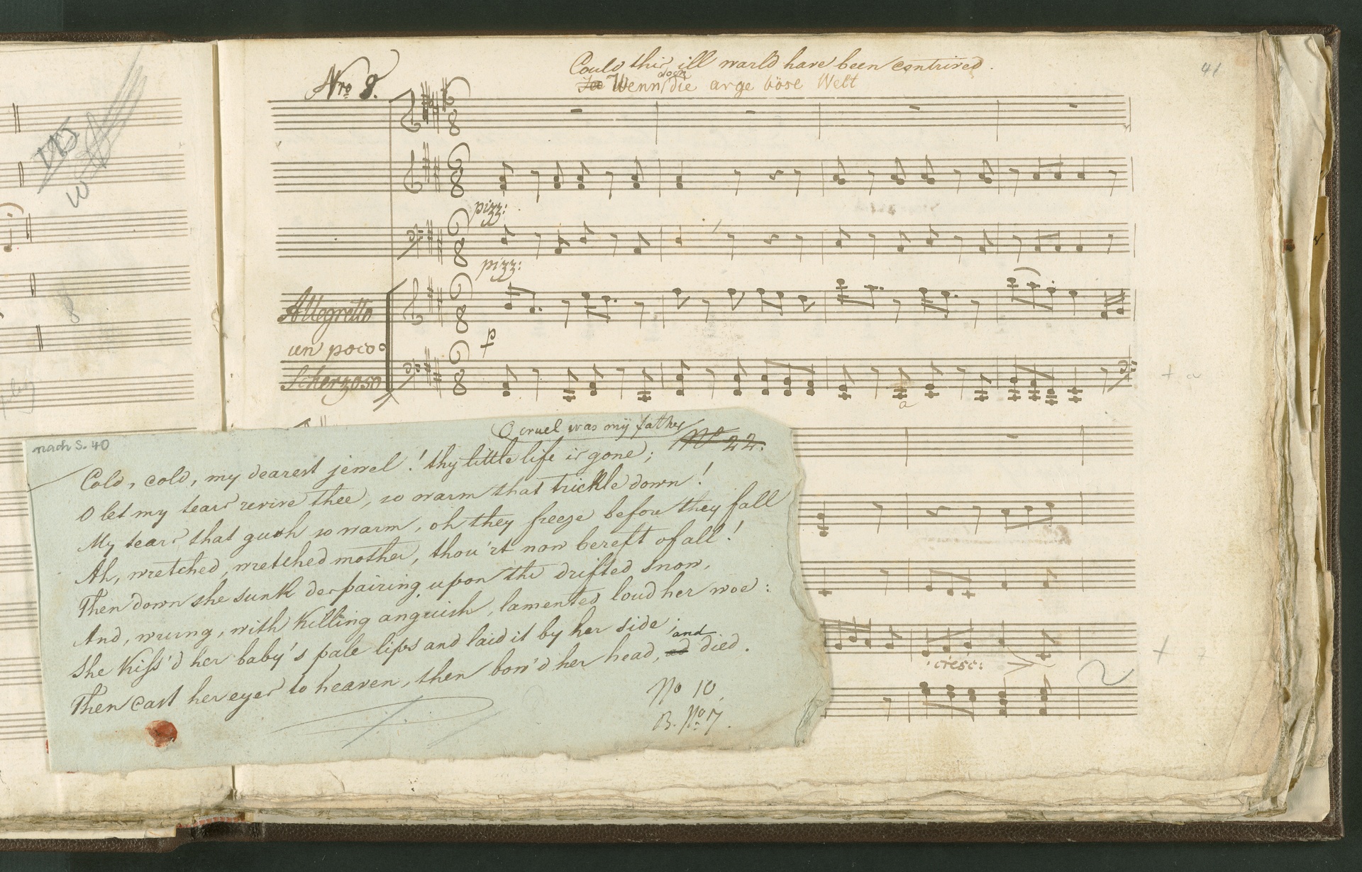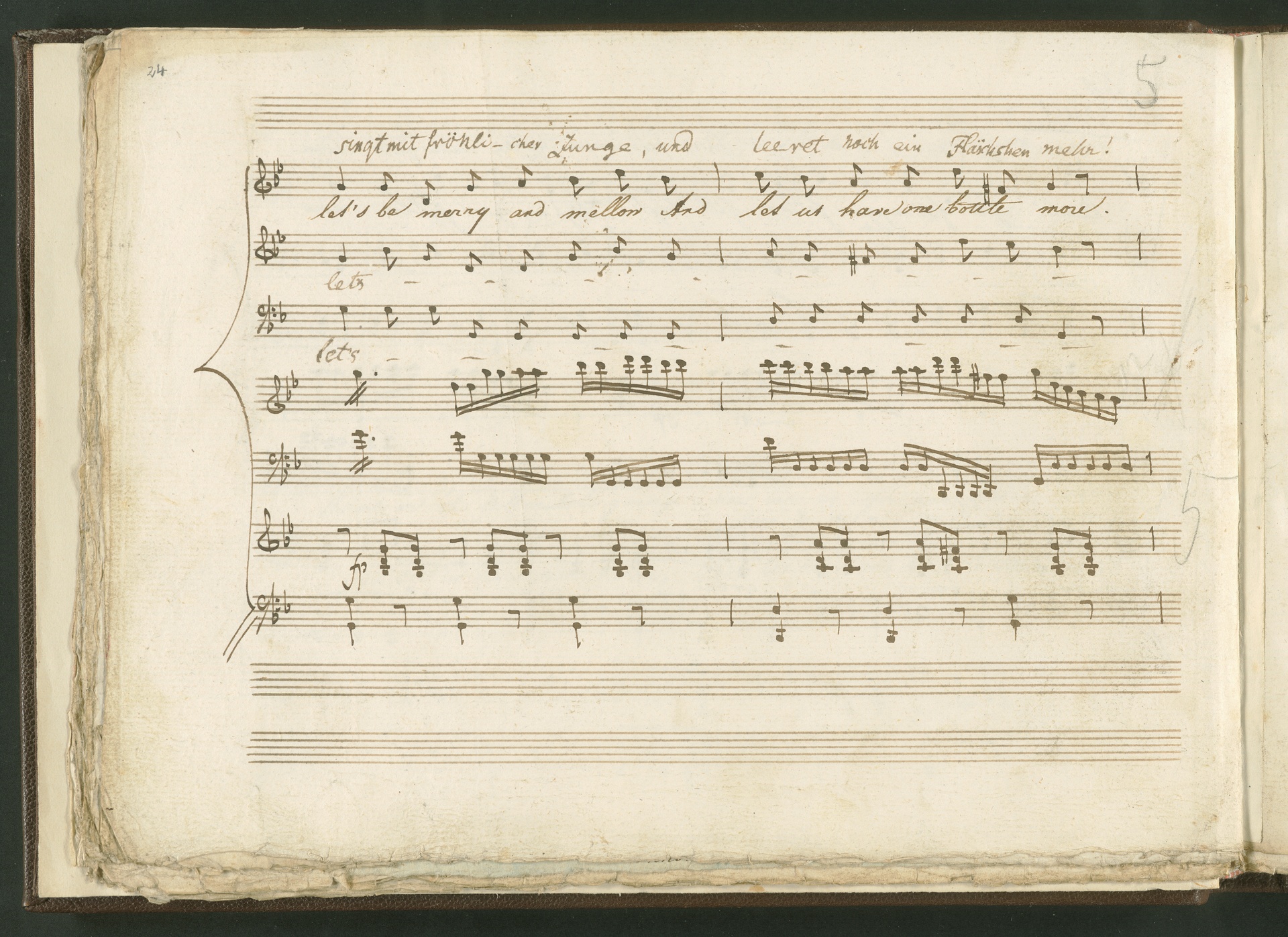 Im Juni 1818 erschien auf den britischen Inseln "A Select Collection of Original Scottish Airs": Beethovens musikalische Ausgestaltung von 25 schottischen Liedern. Beethoven, durchaus kein schlechter Geschäftsmann, versuchte anschließend, die Kompositionen auch auf dem Kontinent zu verkaufen und hatte 1820 in Berlin Glück. Der Verleger Adolph Martin Schlesinger interessierte sich für die Lieder und veranstaltete 1822 eine deutsche Ausgabe. Die überprüfte Abschrift ist die Stichvorlage für diese deutsche Originalausgabe (Op. 108). Neben dem von zwei unterschiedlichen Schreibern kopierten Notentext sind noch zwei weitere Handschriften erkennbar: Franz Oliva, Beethovens Freund und freiwilliger Sekretär schrieb den englischen Text der Lieder in die Abschrift, Samuel Heinrich Spiker fügte deren deutsche Übersetzung hinzu. Um die Lieder auf dem deutschen Markt besser verkaufen zu können, ließ Schlesinger sie übersetzen und druckte seine Ausgabe zweisprachig englisch und deutsch. Die Lieder waren im Original in einem schottischen Dialekt geschrieben, was deren Übersetzung nicht eben einfach machte. Der deutsche Text ist nicht immer ganz glücklich. Auch Beethoven bemerkte das in einem Brief an Schlesinger am 9. April 1822 und bat um Abhilfe: "wegen den Schottischen Liedern schrieb ich ihnen schon, daß beßer vom dichter auf die Langen u. kurzen Silben, welche leztere oft auf lange Noten u. die erstern auf kurze Nothen gerathen sind, Es läßt sich zwar etwas entschuld. in dieser Art, wäre der dichter hier so wäres leicht, jezt aber bin ich so überhaüft beschäftigt, daß es mir nicht mögl. ist, H. Zelter ein Mann von Kenntniß in der Poesie wie es sich für einen ausgezeichneten autor schikt, würde wol bald ihnen helfen können diese kleinen Fleken abzuwaschen" (BGA 1460, Beethoven an Adolph Martin Schlesinger). Trotz Beethovens Empfehlung, sich an Zelter (ein Freund Goethes) zu wenden, blieb der Verlag bei Spiker. Die deutschen Textunterlegungen wurden weder korrigiert noch geändert. (J.R.)