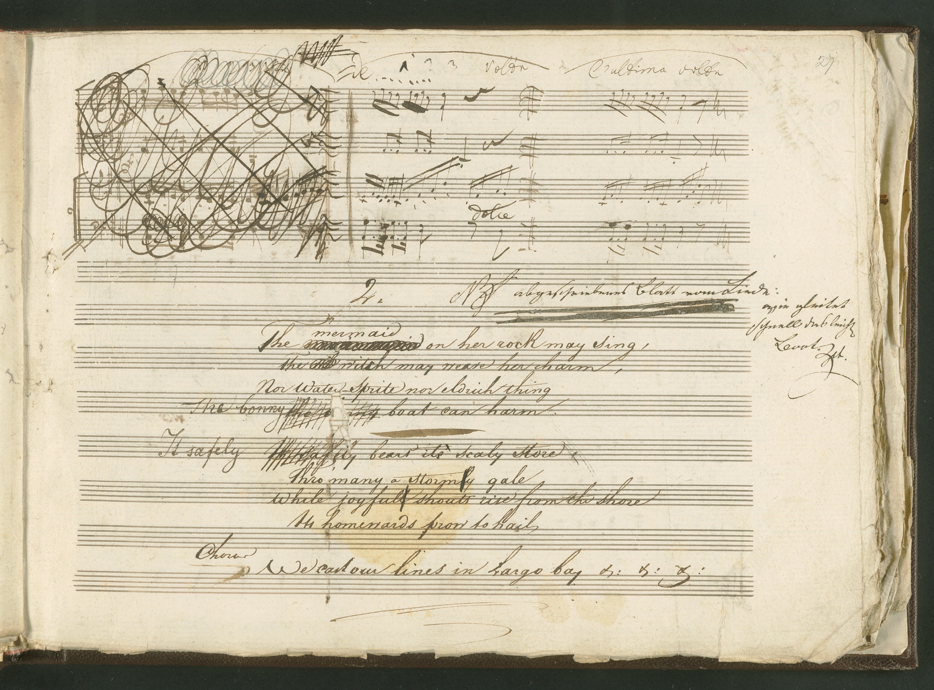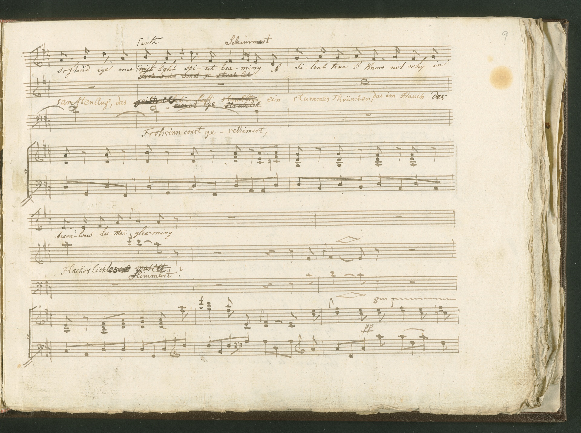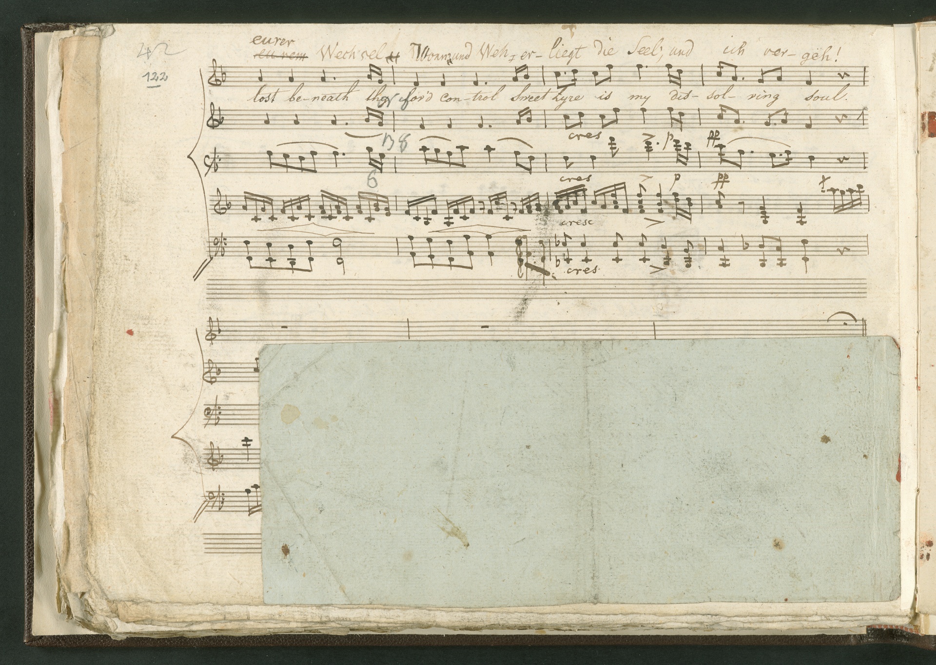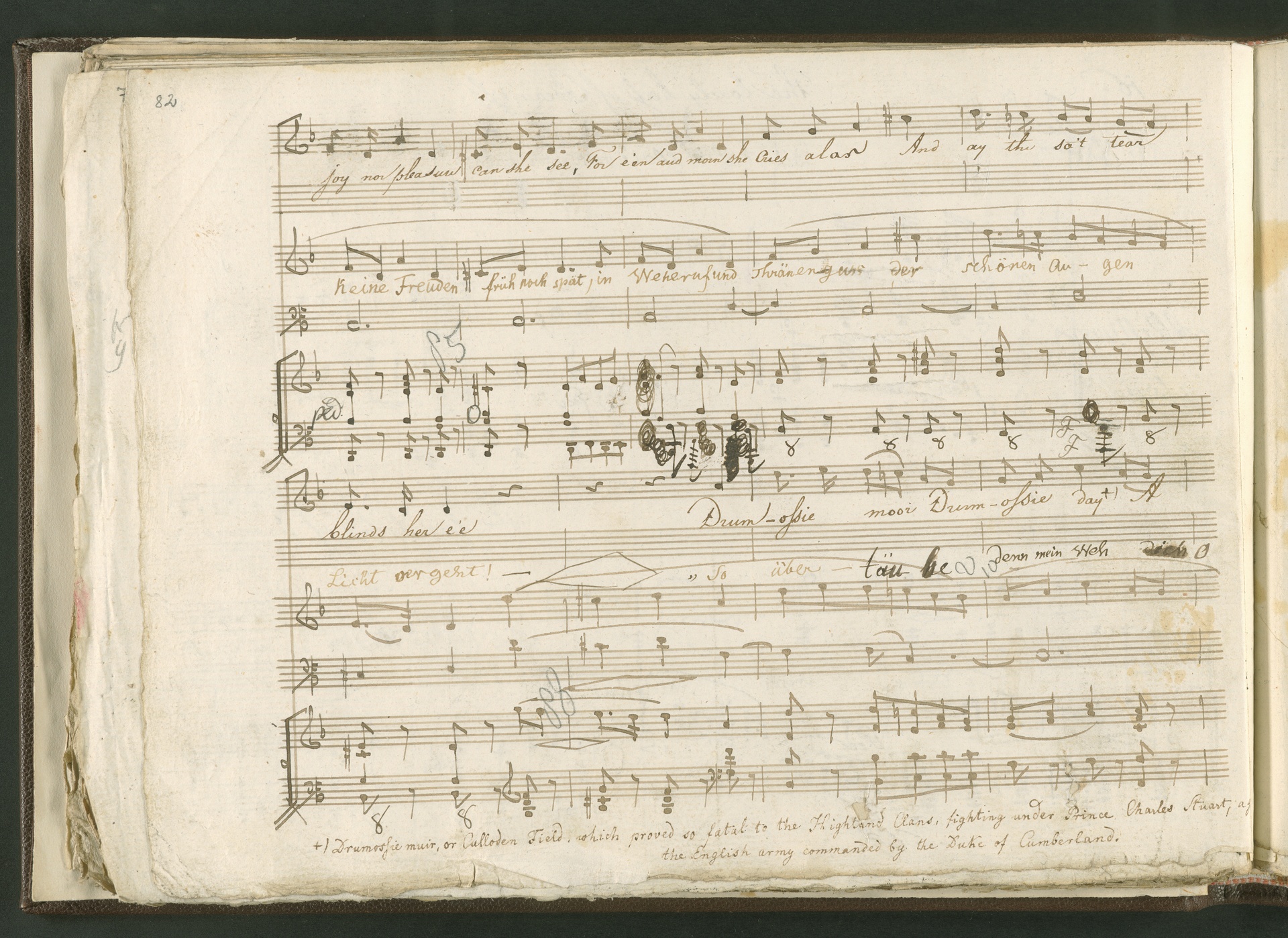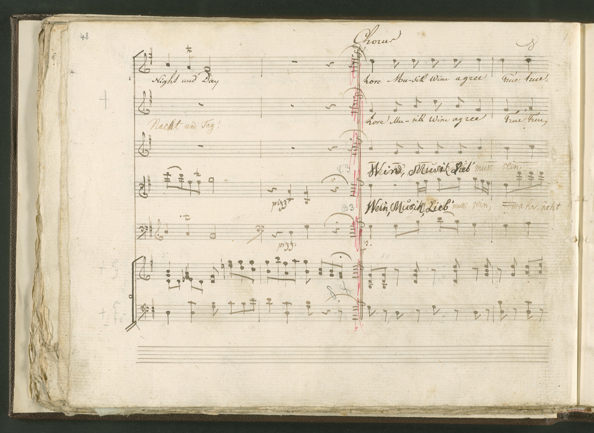 Im Juni 1818 erschien auf den britischen Inseln "A Select Collection of Original Scottish Airs": Beethovens musikalische Ausgestaltung von 25 schottischen Liedern. Beethoven, durchaus kein schlechter Geschäftsmann, versuchte anschließend, die Kompositionen auch auf dem Kontinent zu verkaufen und hatte 1820 in Berlin Glück. Der Verleger Adolph Martin Schlesinger interessierte sich für die Lieder und veranstaltete 1822 eine deutsche Ausgabe. Die überprüfte Abschrift ist die Stichvorlage für diese deutsche Originalausgabe (Op. 108). Neben dem von zwei unterschiedlichen Schreibern kopierten Notentext sind noch zwei weitere Handschriften erkennbar: Franz Oliva, Beethovens Freund und freiwilliger Sekretär schrieb den englischen Text der Lieder in die Abschrift, Samuel Heinrich Spiker fügte deren deutsche Übersetzung hinzu. Um die Lieder auf dem deutschen Markt besser verkaufen zu können, ließ Schlesinger sie übersetzen und druckte seine Ausgabe zweisprachig englisch und deutsch. Die Lieder waren im Original in einem schottischen Dialekt geschrieben, was deren Übersetzung nicht eben einfach machte. Der deutsche Text ist nicht immer ganz glücklich. Auch Beethoven bemerkte das in einem Brief an Schlesinger am 9. April 1822 und bat um Abhilfe: "wegen den Schottischen Liedern schrieb ich ihnen schon, daß beßer vom dichter auf die Langen u. kurzen Silben, welche leztere oft auf lange Noten u. die erstern auf kurze Nothen gerathen sind, Es läßt sich zwar etwas entschuld. in dieser Art, wäre der dichter hier so wäres leicht, jezt aber bin ich so überhaüft beschäftigt, daß es mir nicht mögl. ist, H. Zelter ein Mann von Kenntniß in der Poesie wie es sich für einen ausgezeichneten autor schikt, würde wol bald ihnen helfen können diese kleinen Fleken abzuwaschen" (BGA 1460, Beethoven an Adolph Martin Schlesinger). Trotz Beethovens Empfehlung, sich an Zelter (ein Freund Goethes) zu wenden, blieb der Verlag bei Spiker. Die deutschen Textunterlegungen wurden weder korrigiert noch geändert. (J.R.)