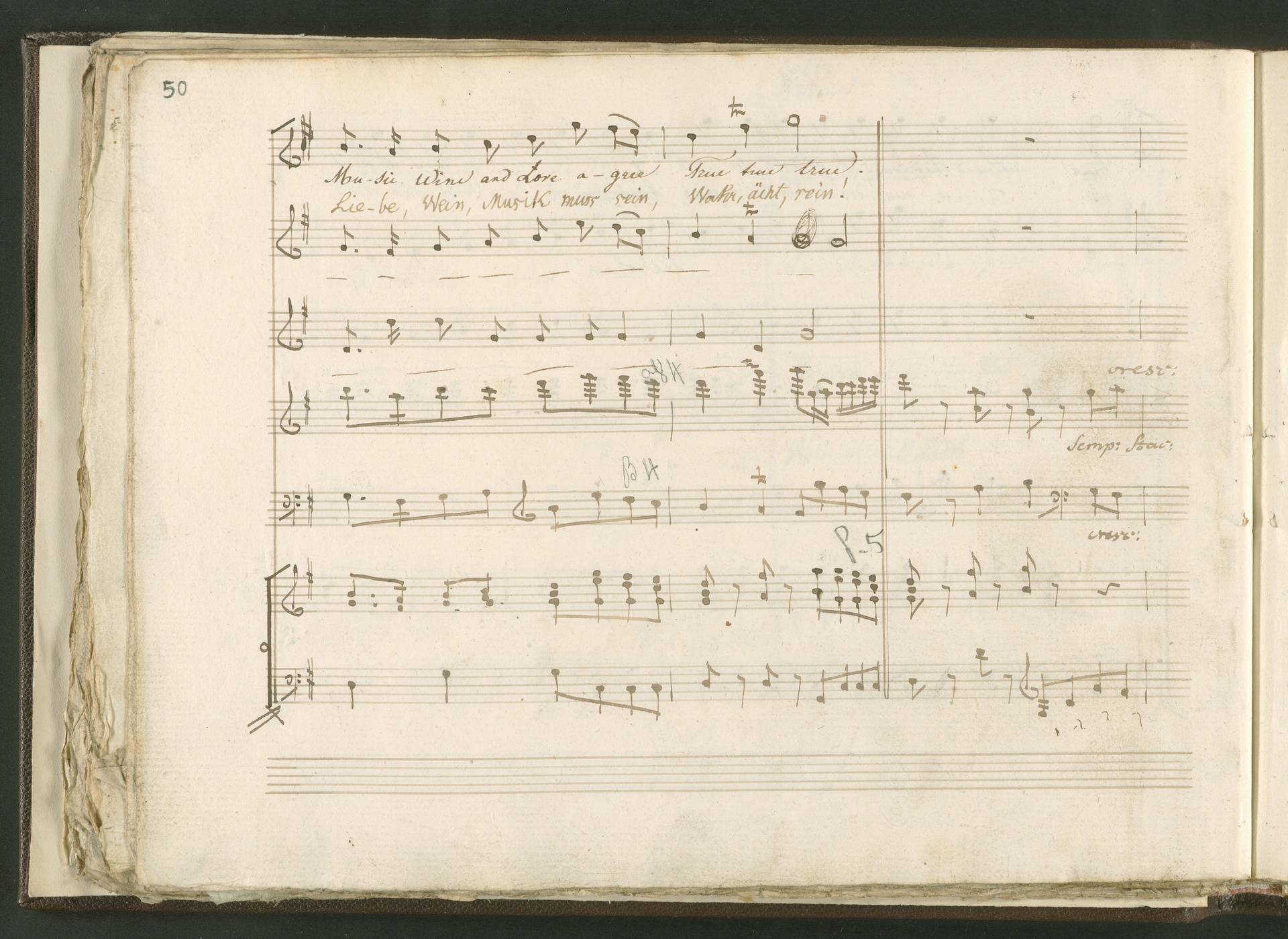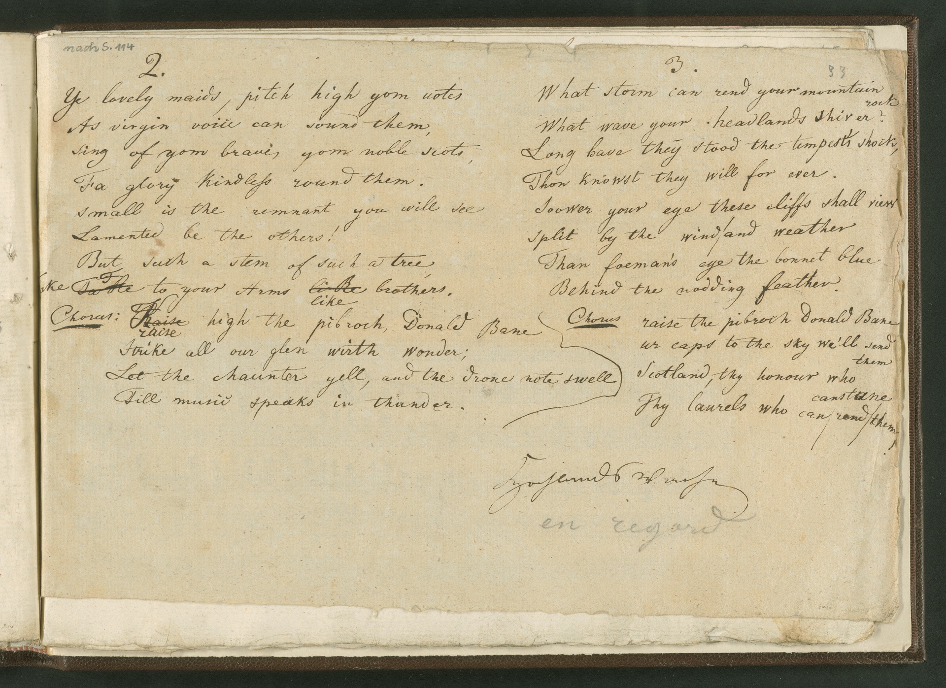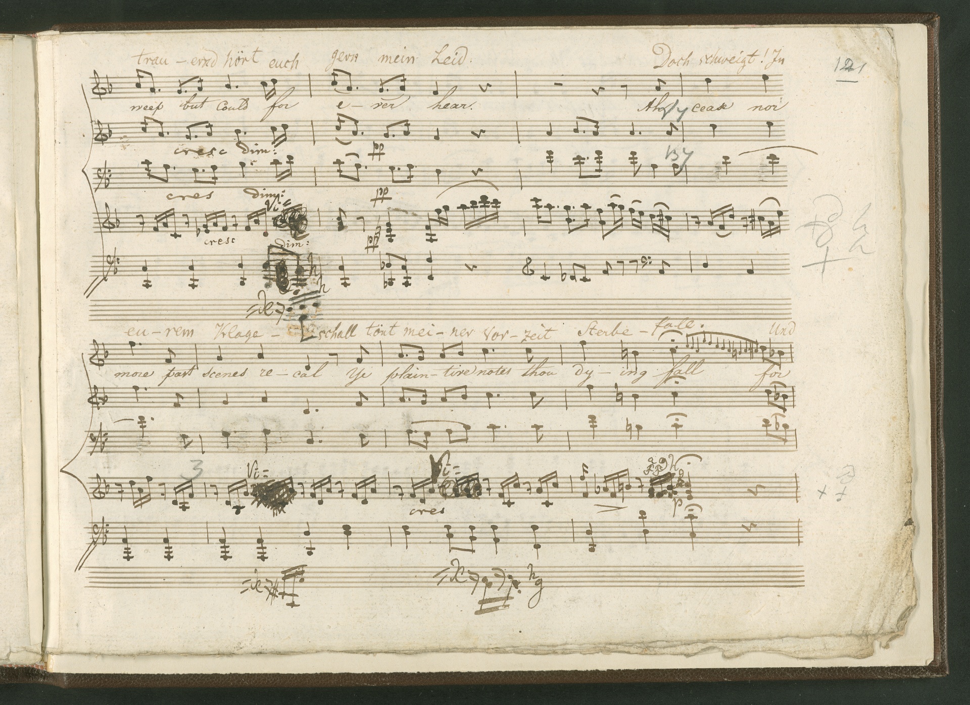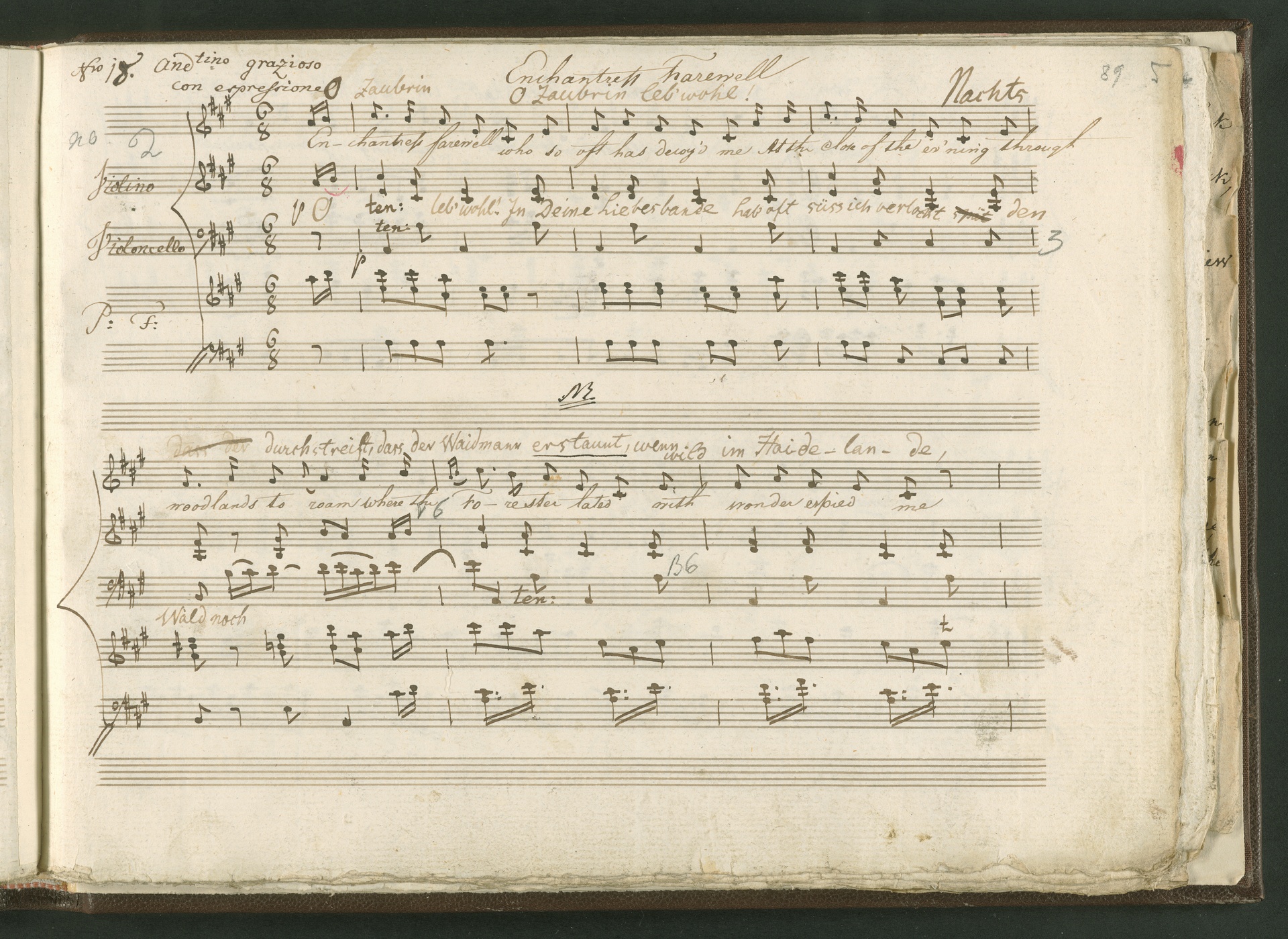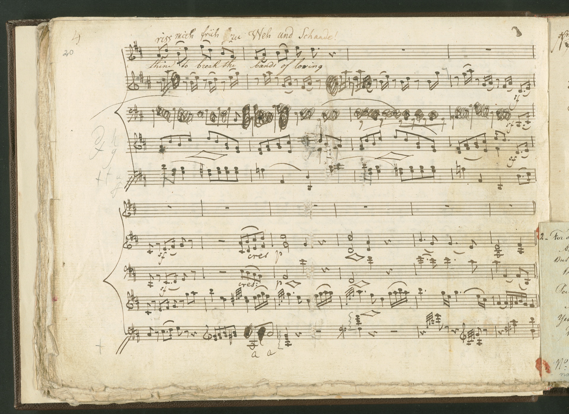 Im Juni 1818 erschien auf den britischen Inseln "A Select Collection of Original Scottish Airs": Beethovens musikalische Ausgestaltung von 25 schottischen Liedern. Beethoven, durchaus kein schlechter Geschäftsmann, versuchte anschließend, die Kompositionen auch auf dem Kontinent zu verkaufen und hatte 1820 in Berlin Glück. Der Verleger Adolph Martin Schlesinger interessierte sich für die Lieder und veranstaltete 1822 eine deutsche Ausgabe. Die überprüfte Abschrift ist die Stichvorlage für diese deutsche Originalausgabe (Op. 108). Neben dem von zwei unterschiedlichen Schreibern kopierten Notentext sind noch zwei weitere Handschriften erkennbar: Franz Oliva, Beethovens Freund und freiwilliger Sekretär schrieb den englischen Text der Lieder in die Abschrift, Samuel Heinrich Spiker fügte deren deutsche Übersetzung hinzu. Um die Lieder auf dem deutschen Markt besser verkaufen zu können, ließ Schlesinger sie übersetzen und druckte seine Ausgabe zweisprachig englisch und deutsch. Die Lieder waren im Original in einem schottischen Dialekt geschrieben, was deren Übersetzung nicht eben einfach machte. Der deutsche Text ist nicht immer ganz glücklich. Auch Beethoven bemerkte das in einem Brief an Schlesinger am 9. April 1822 und bat um Abhilfe: "wegen den Schottischen Liedern schrieb ich ihnen schon, daß beßer vom dichter auf die Langen u. kurzen Silben, welche leztere oft auf lange Noten u. die erstern auf kurze Nothen gerathen sind, Es läßt sich zwar etwas entschuld. in dieser Art, wäre der dichter hier so wäres leicht, jezt aber bin ich so überhaüft beschäftigt, daß es mir nicht mögl. ist, H. Zelter ein Mann von Kenntniß in der Poesie wie es sich für einen ausgezeichneten autor schikt, würde wol bald ihnen helfen können diese kleinen Fleken abzuwaschen" (BGA 1460, Beethoven an Adolph Martin Schlesinger). Trotz Beethovens Empfehlung, sich an Zelter (ein Freund Goethes) zu wenden, blieb der Verlag bei Spiker. Die deutschen Textunterlegungen wurden weder korrigiert noch geändert. (J.R.)