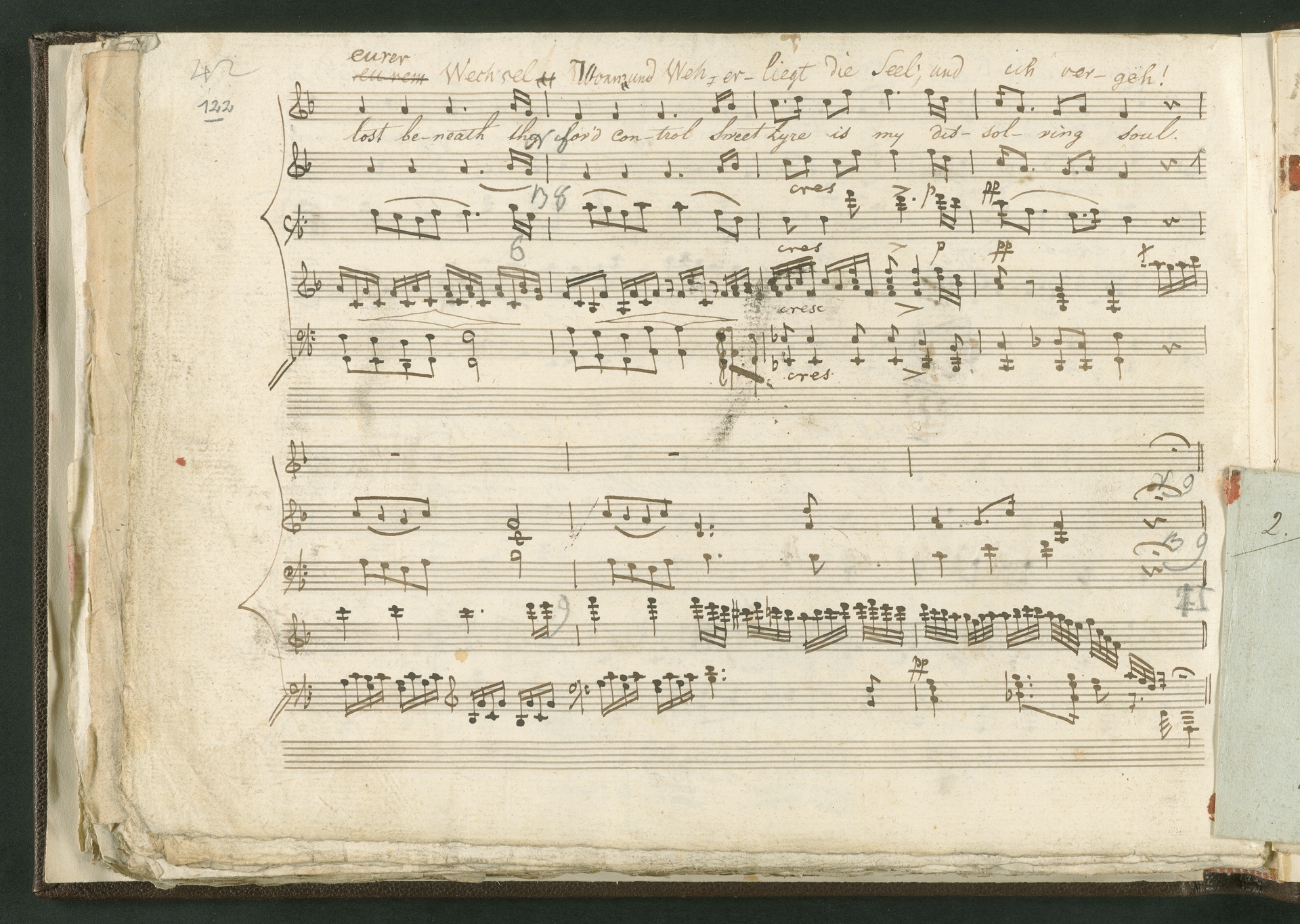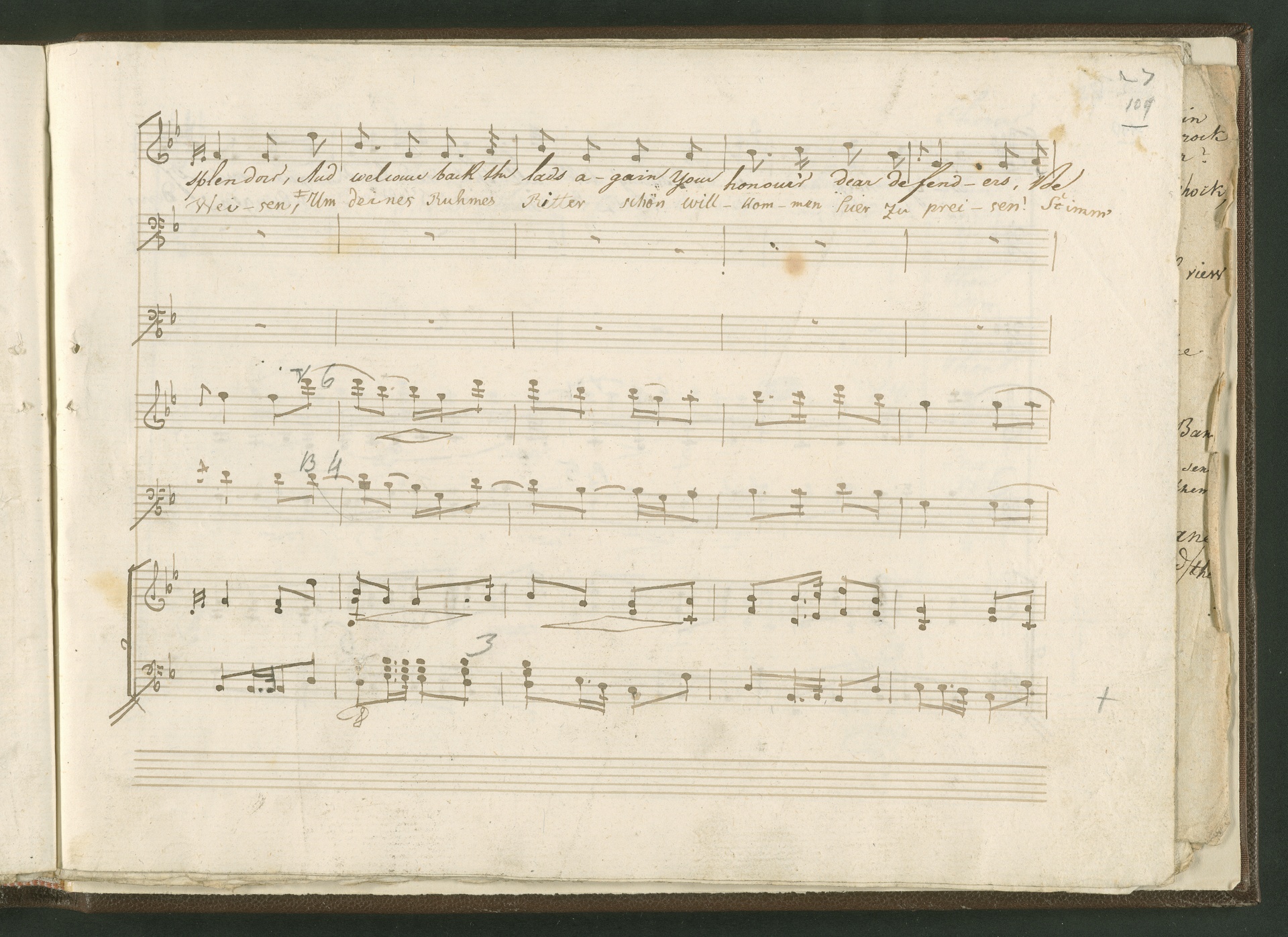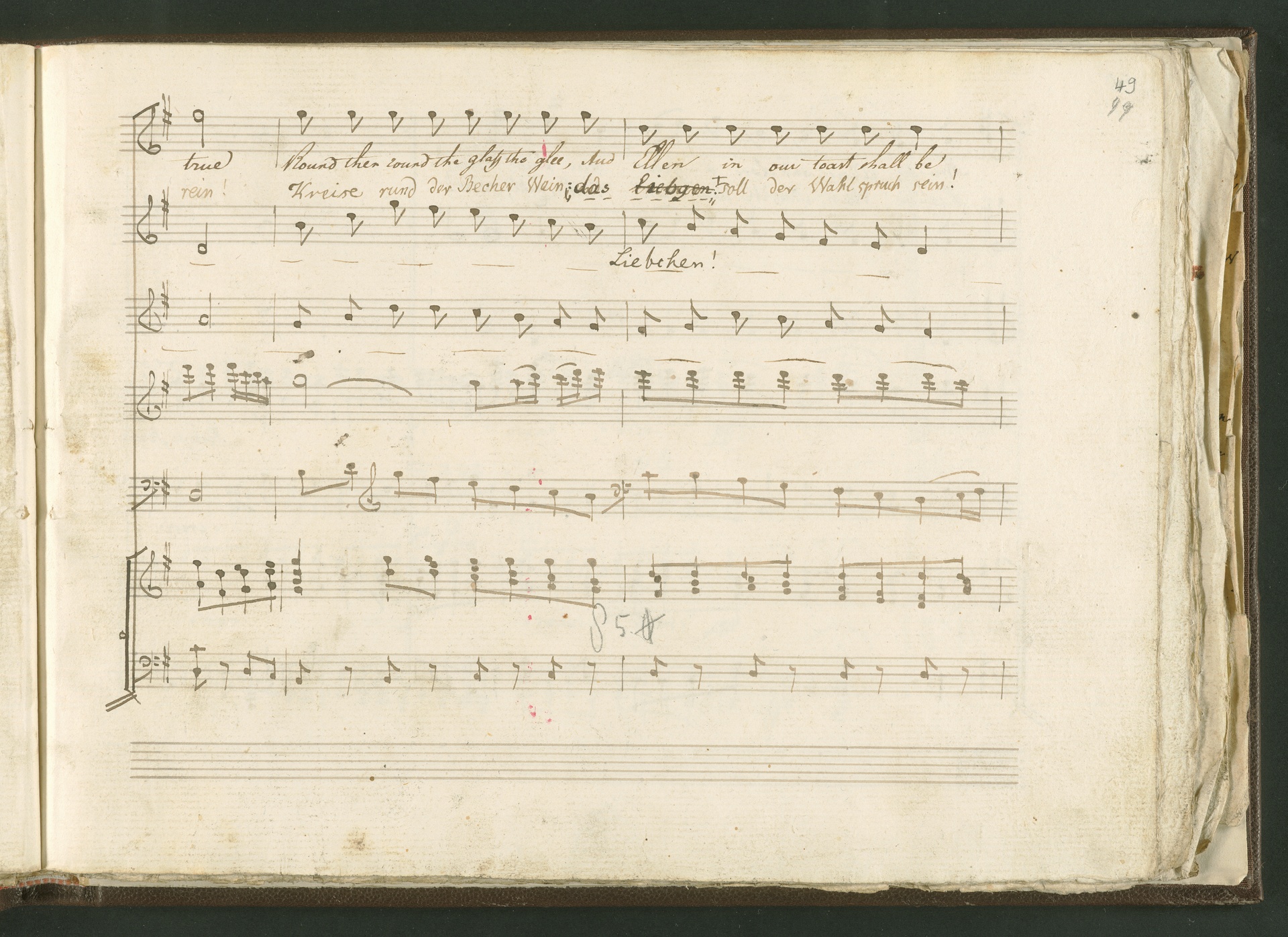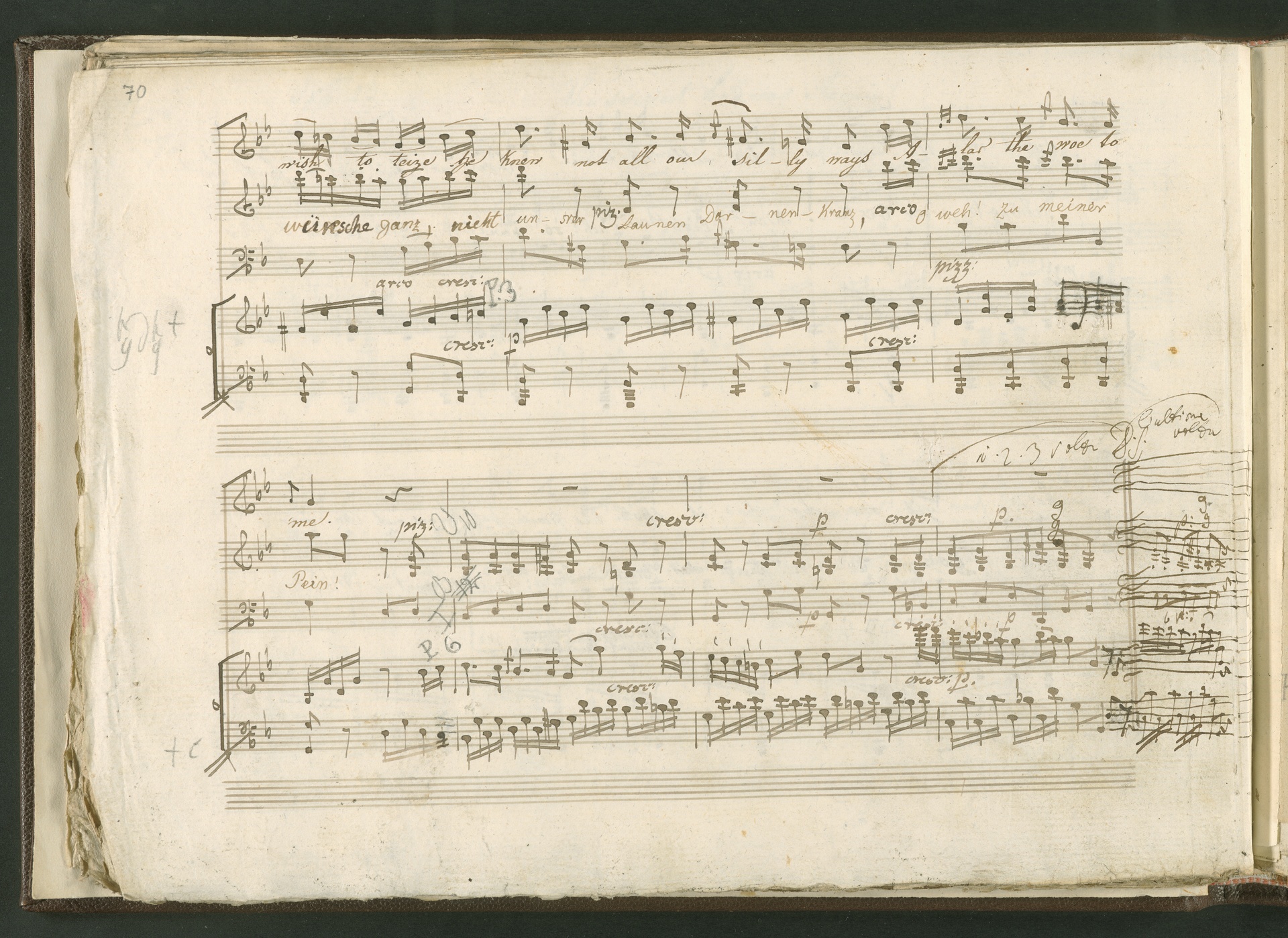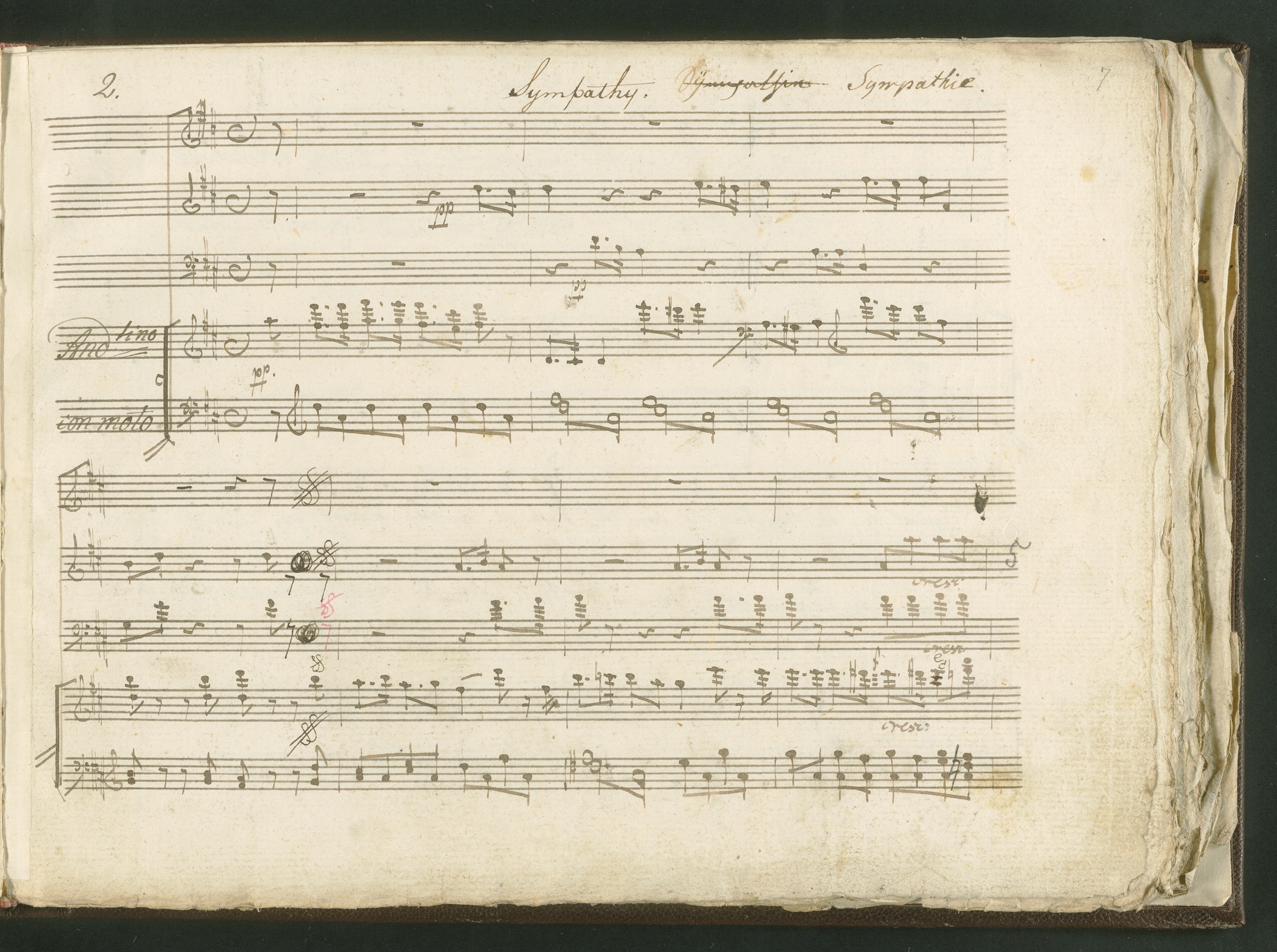 Im Juni 1818 erschien auf den britischen Inseln "A Select Collection of Original Scottish Airs": Beethovens musikalische Ausgestaltung von 25 schottischen Liedern. Beethoven, durchaus kein schlechter Geschäftsmann, versuchte anschließend, die Kompositionen auch auf dem Kontinent zu verkaufen und hatte 1820 in Berlin Glück. Der Verleger Adolph Martin Schlesinger interessierte sich für die Lieder und veranstaltete 1822 eine deutsche Ausgabe. Die überprüfte Abschrift ist die Stichvorlage für diese deutsche Originalausgabe (Op. 108). Neben dem von zwei unterschiedlichen Schreibern kopierten Notentext sind noch zwei weitere Handschriften erkennbar: Franz Oliva, Beethovens Freund und freiwilliger Sekretär schrieb den englischen Text der Lieder in die Abschrift, Samuel Heinrich Spiker fügte deren deutsche Übersetzung hinzu. Um die Lieder auf dem deutschen Markt besser verkaufen zu können, ließ Schlesinger sie übersetzen und druckte seine Ausgabe zweisprachig englisch und deutsch. Die Lieder waren im Original in einem schottischen Dialekt geschrieben, was deren Übersetzung nicht eben einfach machte. Der deutsche Text ist nicht immer ganz glücklich. Auch Beethoven bemerkte das in einem Brief an Schlesinger am 9. April 1822 und bat um Abhilfe: "wegen den Schottischen Liedern schrieb ich ihnen schon, daß beßer vom dichter auf die Langen u. kurzen Silben, welche leztere oft auf lange Noten u. die erstern auf kurze Nothen gerathen sind, Es läßt sich zwar etwas entschuld. in dieser Art, wäre der dichter hier so wäres leicht, jezt aber bin ich so überhaüft beschäftigt, daß es mir nicht mögl. ist, H. Zelter ein Mann von Kenntniß in der Poesie wie es sich für einen ausgezeichneten autor schikt, würde wol bald ihnen helfen können diese kleinen Fleken abzuwaschen" (BGA 1460, Beethoven an Adolph Martin Schlesinger). Trotz Beethovens Empfehlung, sich an Zelter (ein Freund Goethes) zu wenden, blieb der Verlag bei Spiker. Die deutschen Textunterlegungen wurden weder korrigiert noch geändert. (J.R.)