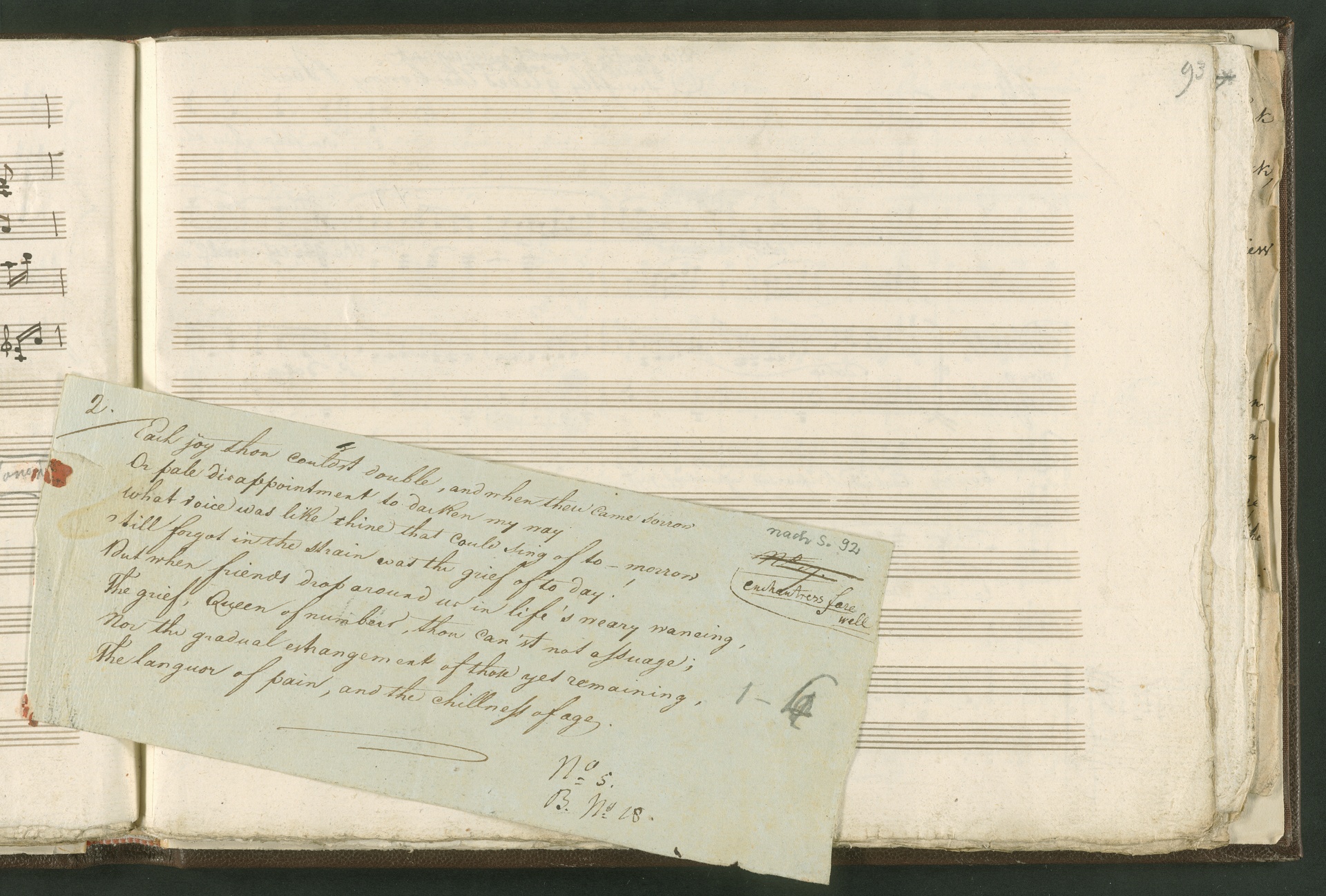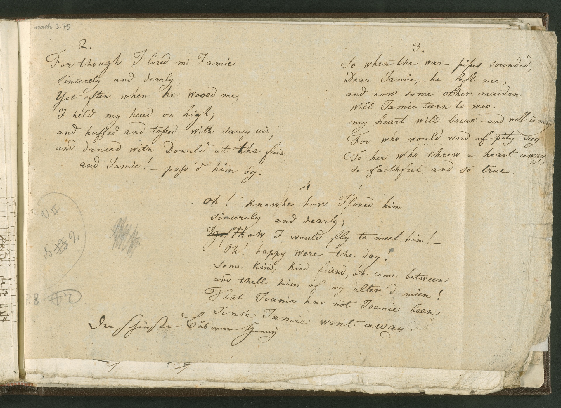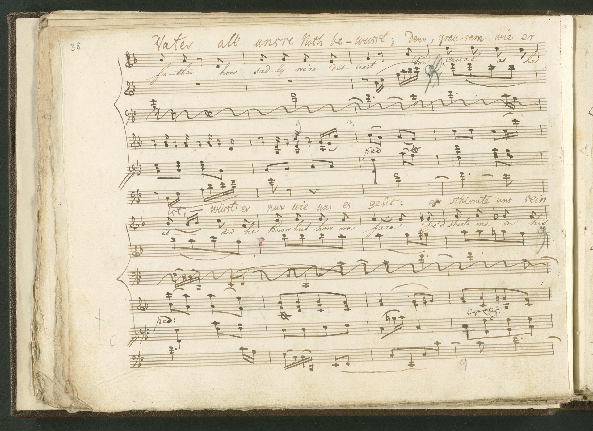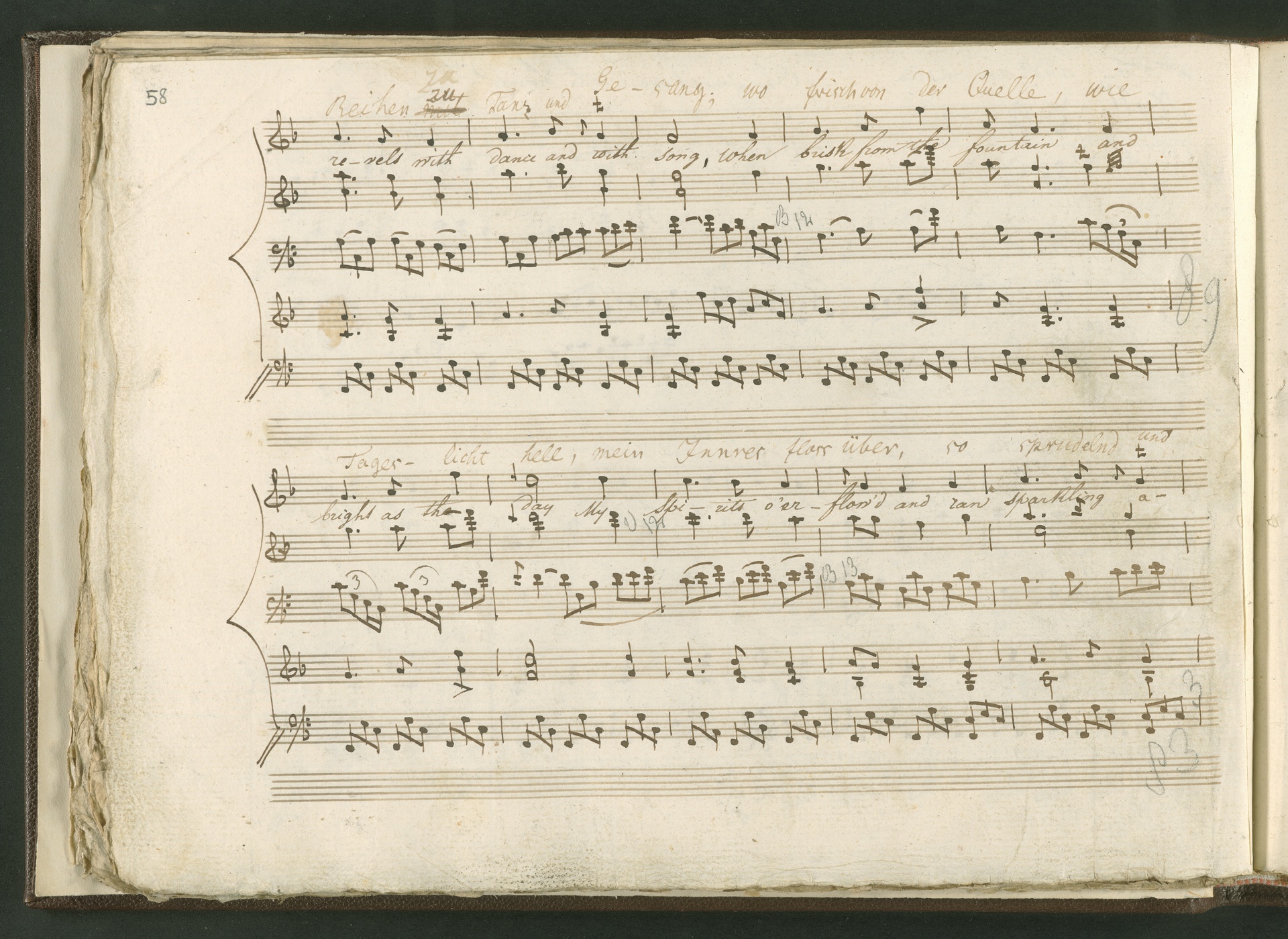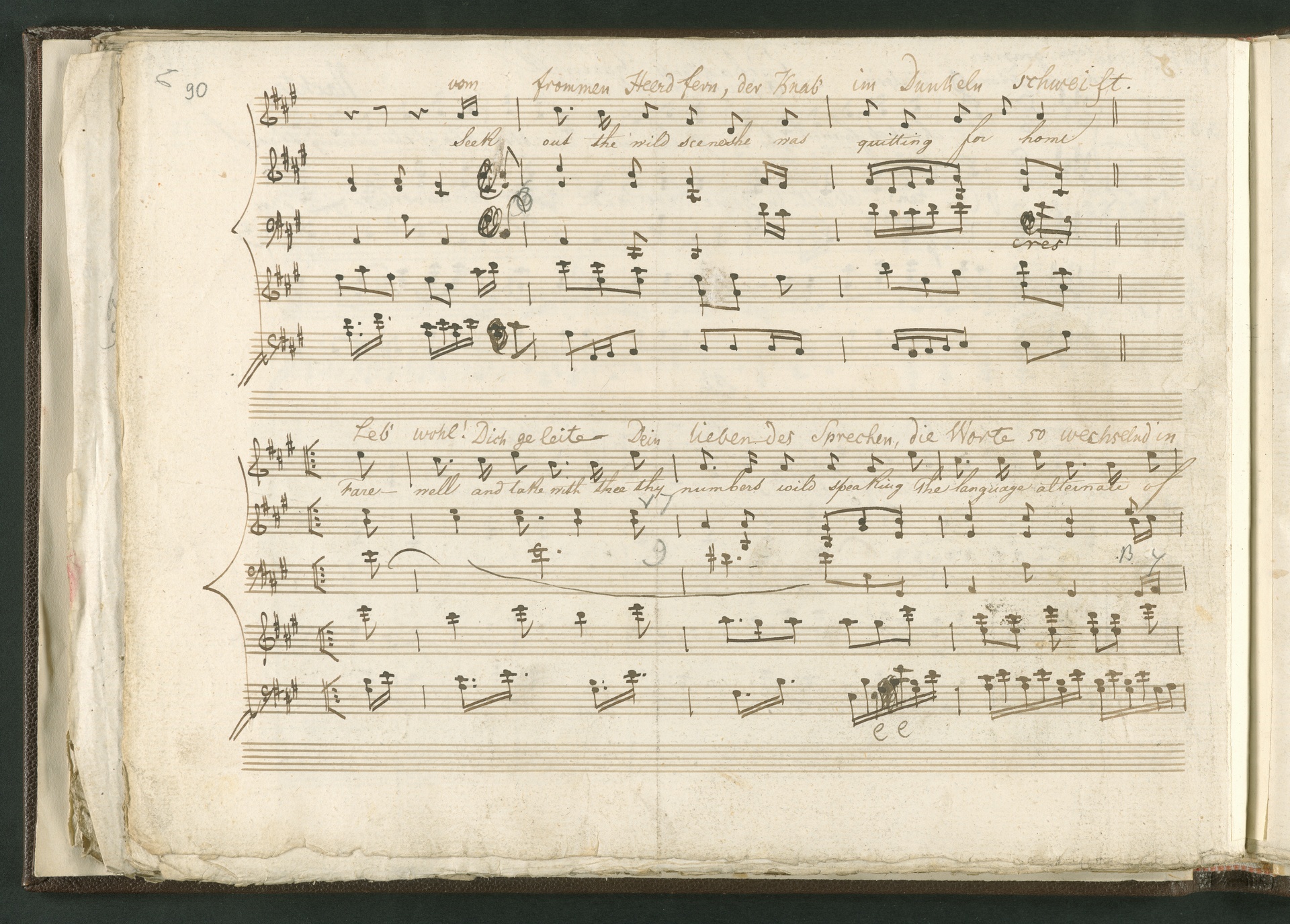 Im Juni 1818 erschien auf den britischen Inseln "A Select Collection of Original Scottish Airs": Beethovens musikalische Ausgestaltung von 25 schottischen Liedern. Beethoven, durchaus kein schlechter Geschäftsmann, versuchte anschließend, die Kompositionen auch auf dem Kontinent zu verkaufen und hatte 1820 in Berlin Glück. Der Verleger Adolph Martin Schlesinger interessierte sich für die Lieder und veranstaltete 1822 eine deutsche Ausgabe. Die überprüfte Abschrift ist die Stichvorlage für diese deutsche Originalausgabe (Op. 108). Neben dem von zwei unterschiedlichen Schreibern kopierten Notentext sind noch zwei weitere Handschriften erkennbar: Franz Oliva, Beethovens Freund und freiwilliger Sekretär schrieb den englischen Text der Lieder in die Abschrift, Samuel Heinrich Spiker fügte deren deutsche Übersetzung hinzu. Um die Lieder auf dem deutschen Markt besser verkaufen zu können, ließ Schlesinger sie übersetzen und druckte seine Ausgabe zweisprachig englisch und deutsch. Die Lieder waren im Original in einem schottischen Dialekt geschrieben, was deren Übersetzung nicht eben einfach machte. Der deutsche Text ist nicht immer ganz glücklich. Auch Beethoven bemerkte das in einem Brief an Schlesinger am 9. April 1822 und bat um Abhilfe: "wegen den Schottischen Liedern schrieb ich ihnen schon, daß beßer vom dichter auf die Langen u. kurzen Silben, welche leztere oft auf lange Noten u. die erstern auf kurze Nothen gerathen sind, Es läßt sich zwar etwas entschuld. in dieser Art, wäre der dichter hier so wäres leicht, jezt aber bin ich so überhaüft beschäftigt, daß es mir nicht mögl. ist, H. Zelter ein Mann von Kenntniß in der Poesie wie es sich für einen ausgezeichneten autor schikt, würde wol bald ihnen helfen können diese kleinen Fleken abzuwaschen" (BGA 1460, Beethoven an Adolph Martin Schlesinger). Trotz Beethovens Empfehlung, sich an Zelter (ein Freund Goethes) zu wenden, blieb der Verlag bei Spiker. Die deutschen Textunterlegungen wurden weder korrigiert noch geändert. (J.R.)