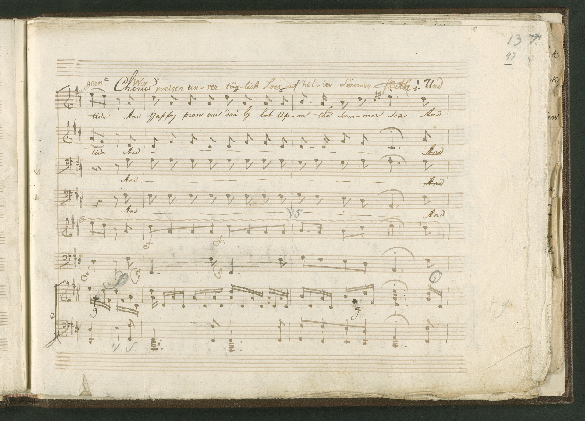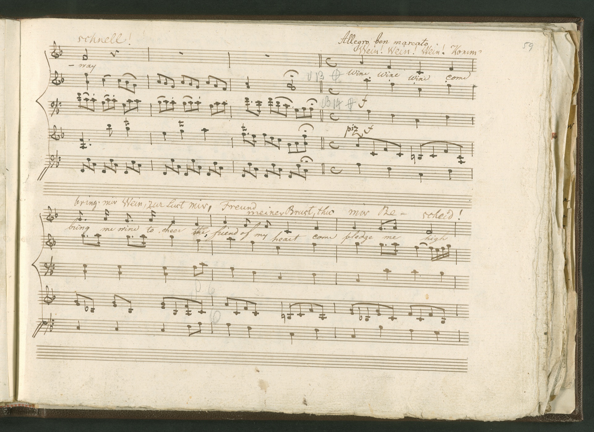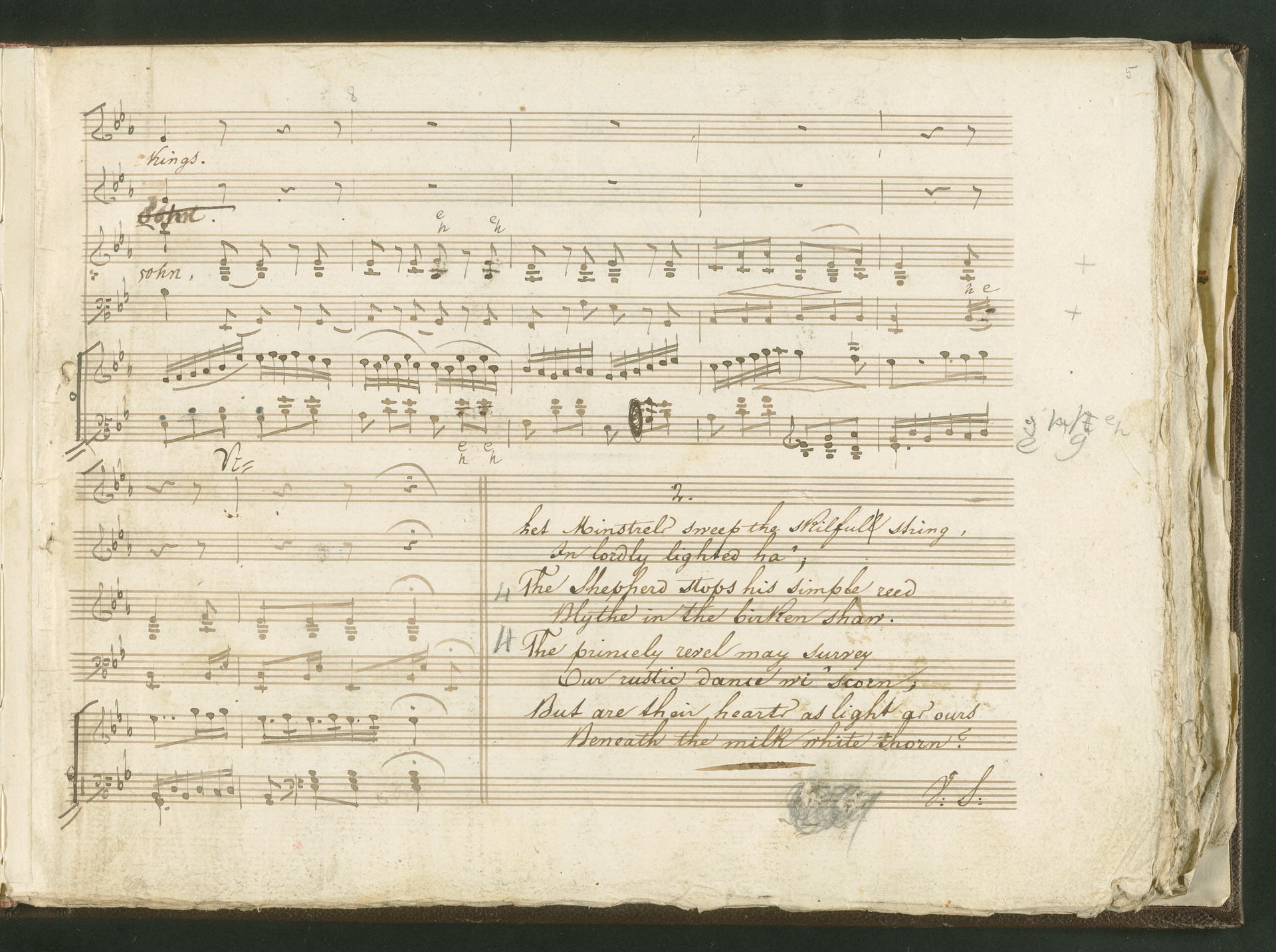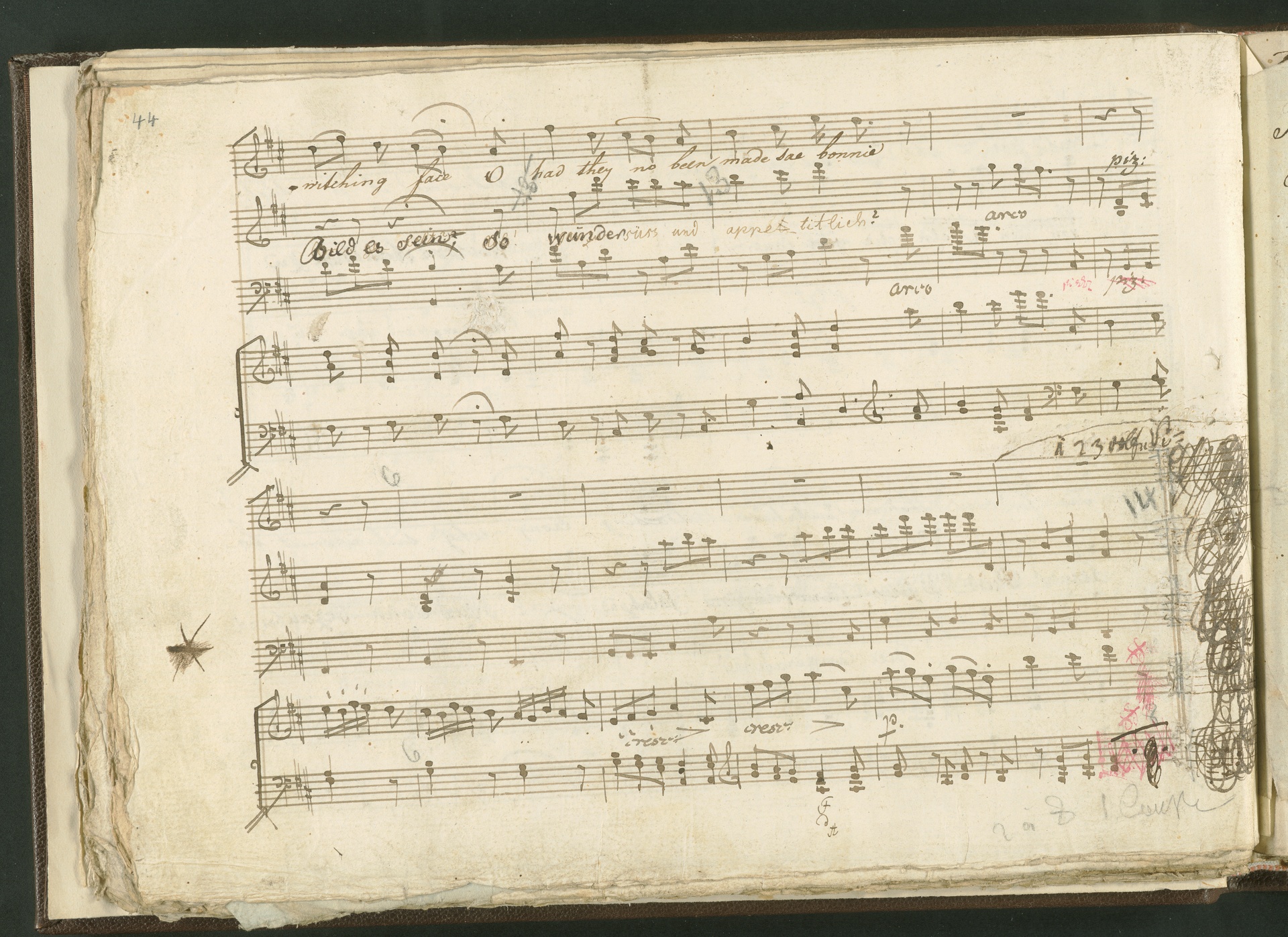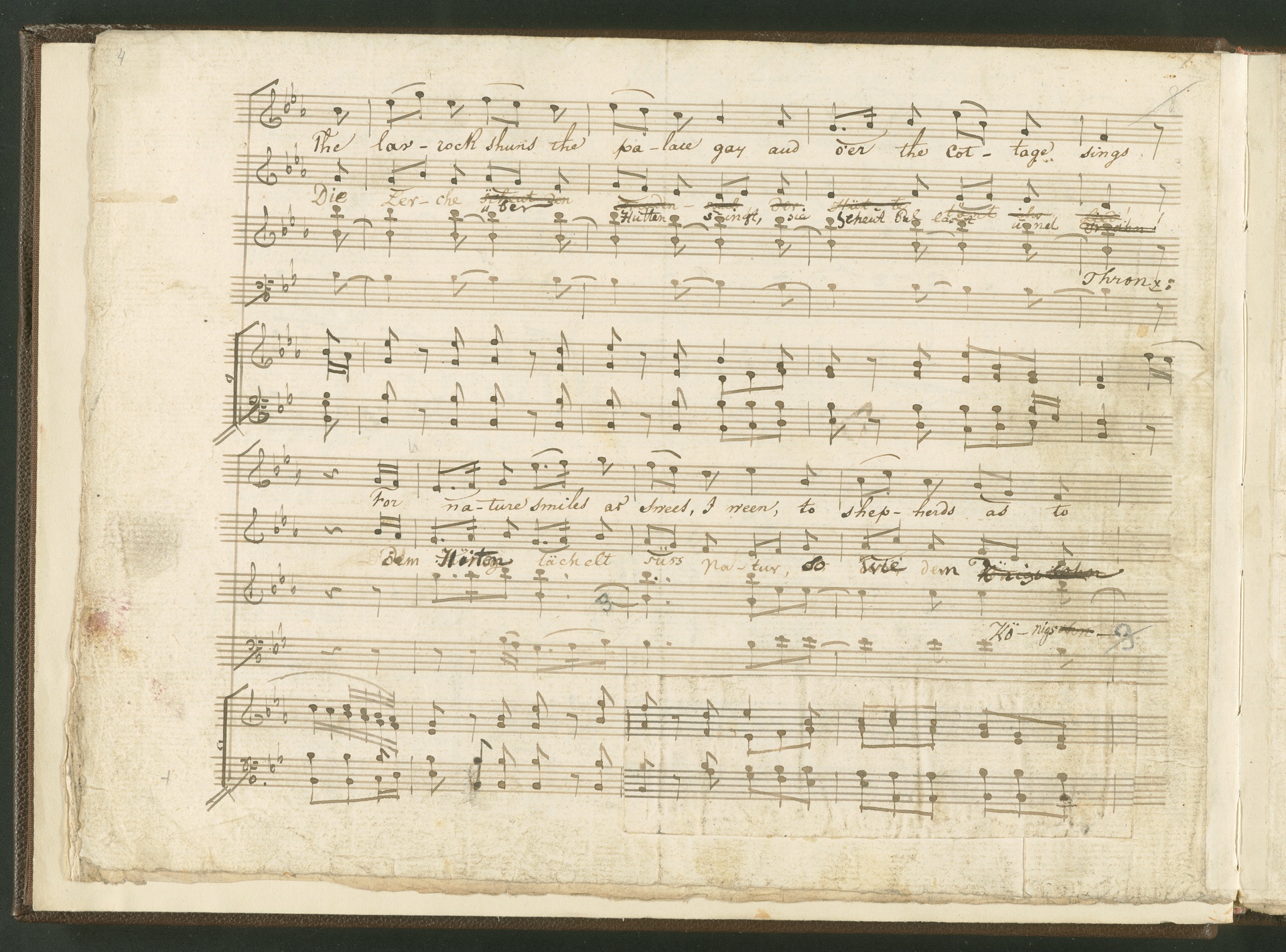 Im Juni 1818 erschien auf den britischen Inseln "A Select Collection of Original Scottish Airs": Beethovens musikalische Ausgestaltung von 25 schottischen Liedern. Beethoven, durchaus kein schlechter Geschäftsmann, versuchte anschließend, die Kompositionen auch auf dem Kontinent zu verkaufen und hatte 1820 in Berlin Glück. Der Verleger Adolph Martin Schlesinger interessierte sich für die Lieder und veranstaltete 1822 eine deutsche Ausgabe. Die überprüfte Abschrift ist die Stichvorlage für diese deutsche Originalausgabe (Op. 108). Neben dem von zwei unterschiedlichen Schreibern kopierten Notentext sind noch zwei weitere Handschriften erkennbar: Franz Oliva, Beethovens Freund und freiwilliger Sekretär schrieb den englischen Text der Lieder in die Abschrift, Samuel Heinrich Spiker fügte deren deutsche Übersetzung hinzu. Um die Lieder auf dem deutschen Markt besser verkaufen zu können, ließ Schlesinger sie übersetzen und druckte seine Ausgabe zweisprachig englisch und deutsch. Die Lieder waren im Original in einem schottischen Dialekt geschrieben, was deren Übersetzung nicht eben einfach machte. Der deutsche Text ist nicht immer ganz glücklich. Auch Beethoven bemerkte das in einem Brief an Schlesinger am 9. April 1822 und bat um Abhilfe: "wegen den Schottischen Liedern schrieb ich ihnen schon, daß beßer vom dichter auf die Langen u. kurzen Silben, welche leztere oft auf lange Noten u. die erstern auf kurze Nothen gerathen sind, Es läßt sich zwar etwas entschuld. in dieser Art, wäre der dichter hier so wäres leicht, jezt aber bin ich so überhaüft beschäftigt, daß es mir nicht mögl. ist, H. Zelter ein Mann von Kenntniß in der Poesie wie es sich für einen ausgezeichneten autor schikt, würde wol bald ihnen helfen können diese kleinen Fleken abzuwaschen" (BGA 1460, Beethoven an Adolph Martin Schlesinger). Trotz Beethovens Empfehlung, sich an Zelter (ein Freund Goethes) zu wenden, blieb der Verlag bei Spiker. Die deutschen Textunterlegungen wurden weder korrigiert noch geändert. (J.R.)