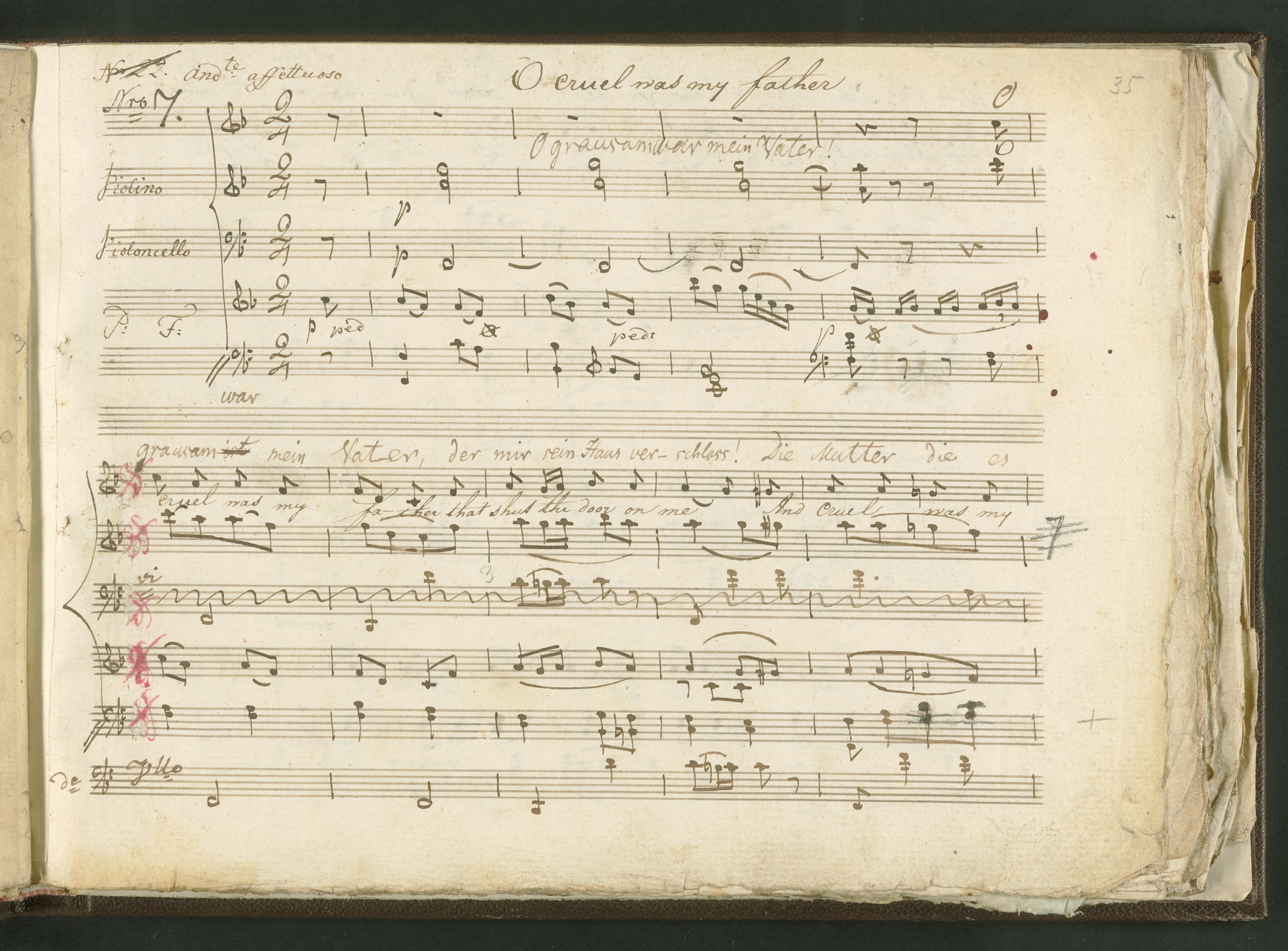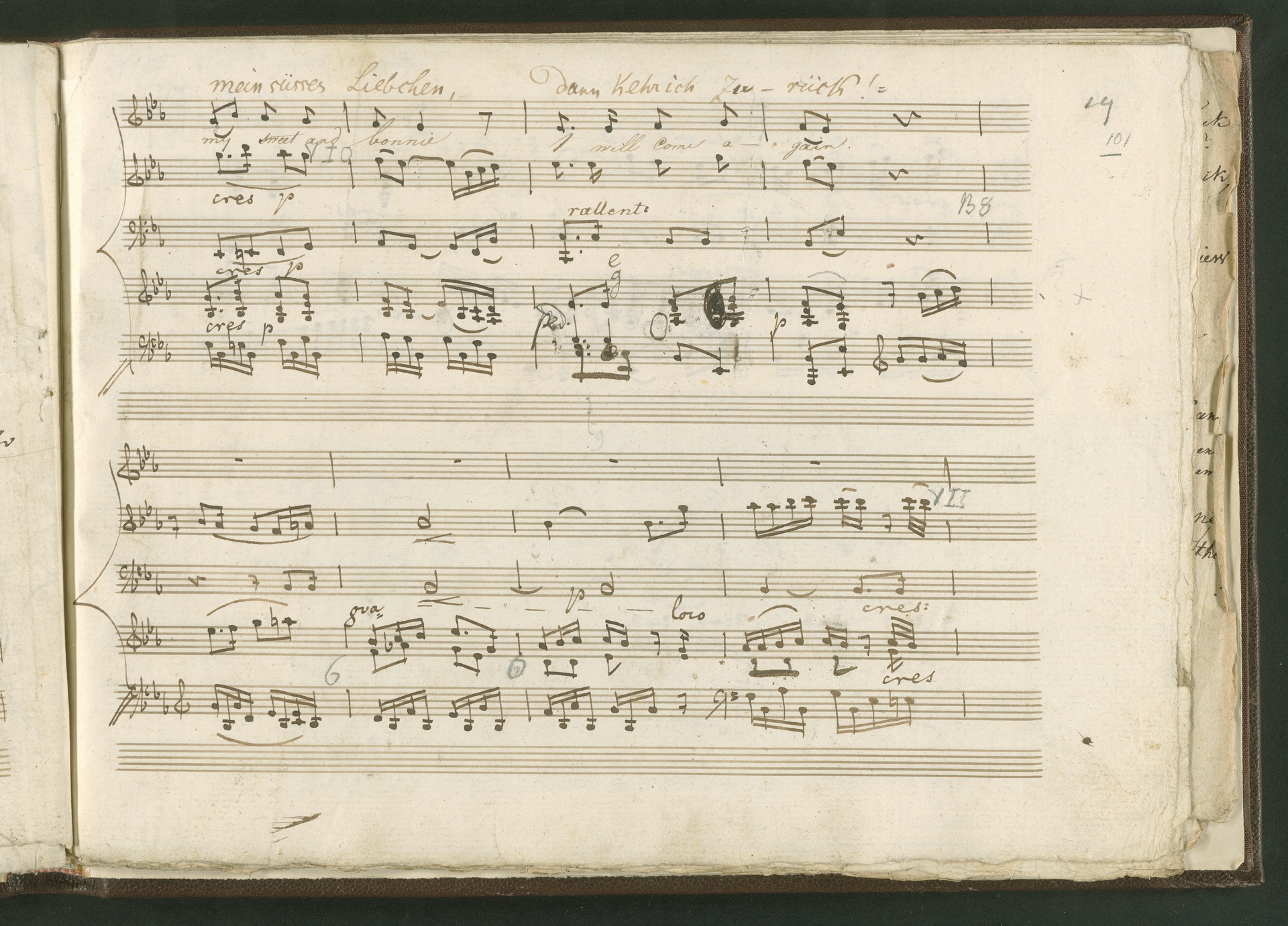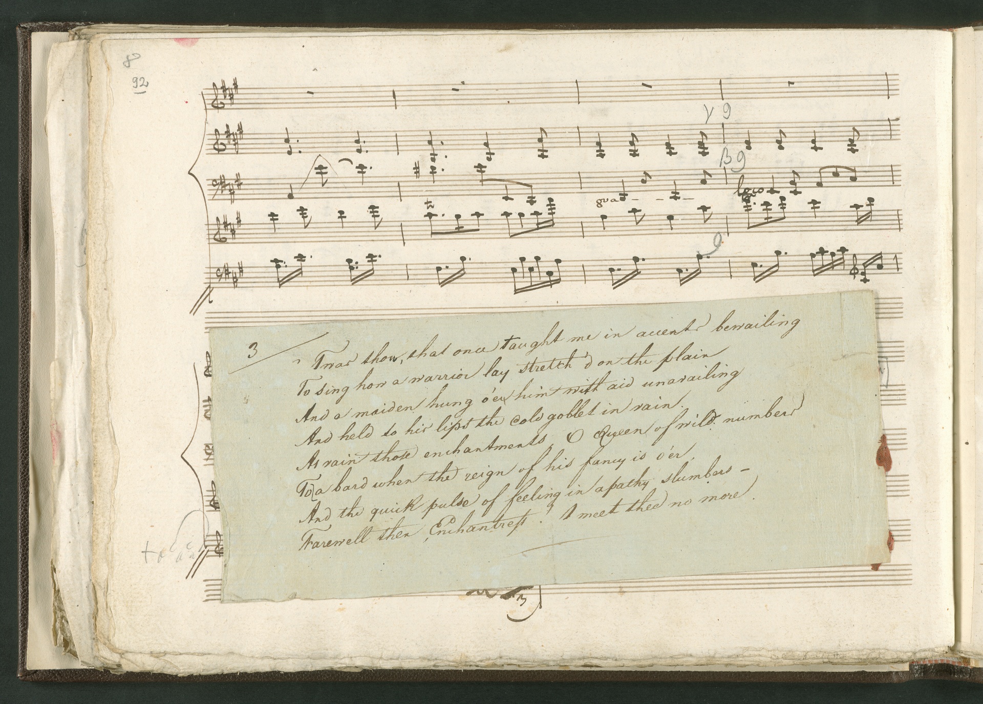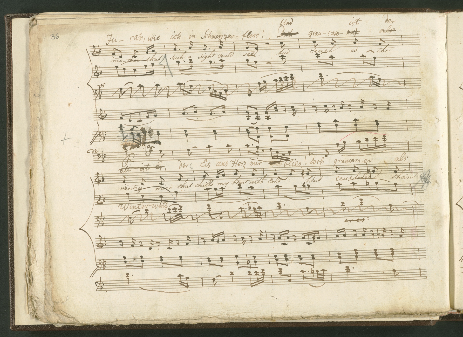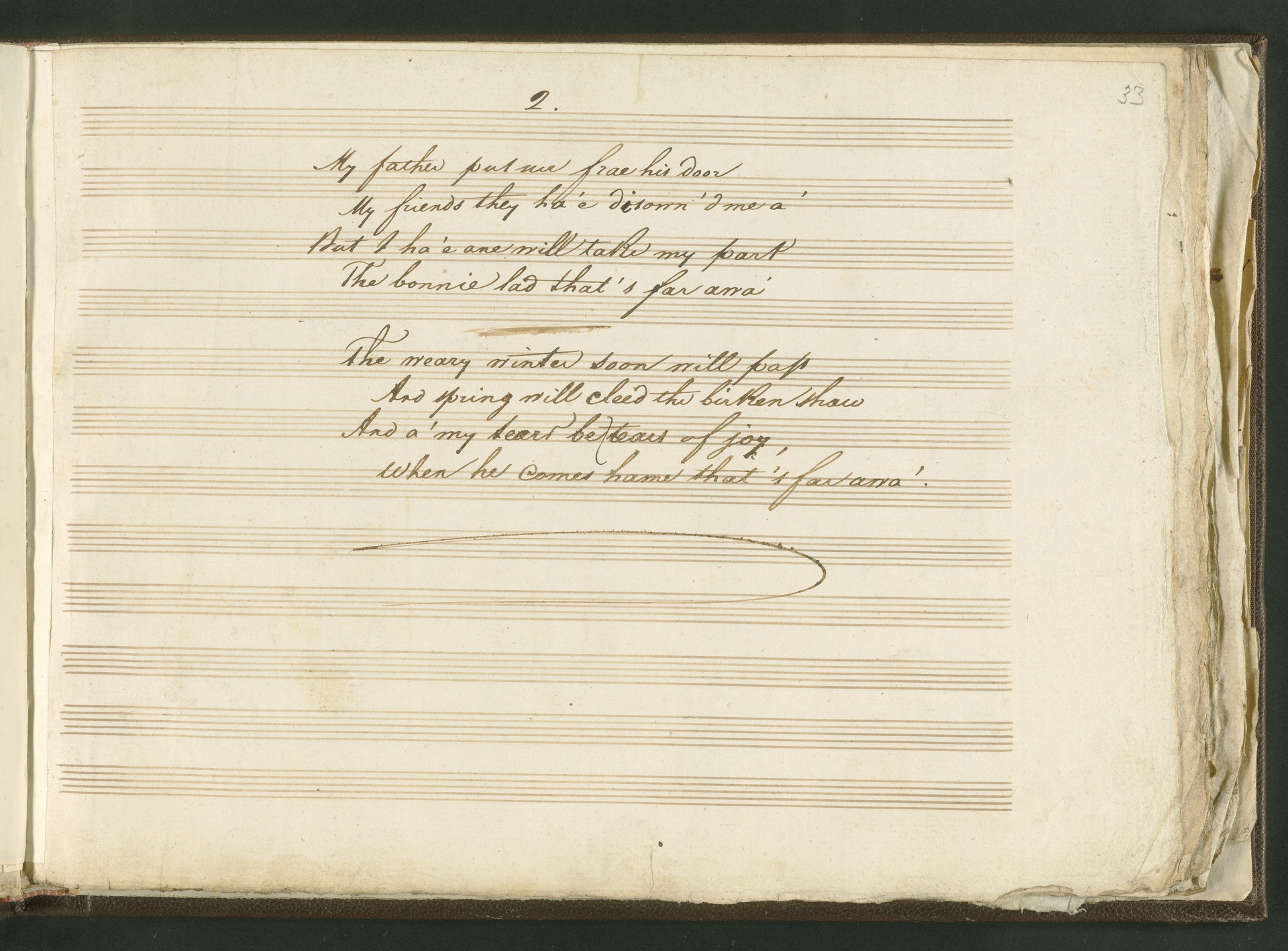 Im Juni 1818 erschien auf den britischen Inseln "A Select Collection of Original Scottish Airs": Beethovens musikalische Ausgestaltung von 25 schottischen Liedern. Beethoven, durchaus kein schlechter Geschäftsmann, versuchte anschließend, die Kompositionen auch auf dem Kontinent zu verkaufen und hatte 1820 in Berlin Glück. Der Verleger Adolph Martin Schlesinger interessierte sich für die Lieder und veranstaltete 1822 eine deutsche Ausgabe. Die überprüfte Abschrift ist die Stichvorlage für diese deutsche Originalausgabe (Op. 108). Neben dem von zwei unterschiedlichen Schreibern kopierten Notentext sind noch zwei weitere Handschriften erkennbar: Franz Oliva, Beethovens Freund und freiwilliger Sekretär schrieb den englischen Text der Lieder in die Abschrift, Samuel Heinrich Spiker fügte deren deutsche Übersetzung hinzu. Um die Lieder auf dem deutschen Markt besser verkaufen zu können, ließ Schlesinger sie übersetzen und druckte seine Ausgabe zweisprachig englisch und deutsch. Die Lieder waren im Original in einem schottischen Dialekt geschrieben, was deren Übersetzung nicht eben einfach machte. Der deutsche Text ist nicht immer ganz glücklich. Auch Beethoven bemerkte das in einem Brief an Schlesinger am 9. April 1822 und bat um Abhilfe: "wegen den Schottischen Liedern schrieb ich ihnen schon, daß beßer vom dichter auf die Langen u. kurzen Silben, welche leztere oft auf lange Noten u. die erstern auf kurze Nothen gerathen sind, Es läßt sich zwar etwas entschuld. in dieser Art, wäre der dichter hier so wäres leicht, jezt aber bin ich so überhaüft beschäftigt, daß es mir nicht mögl. ist, H. Zelter ein Mann von Kenntniß in der Poesie wie es sich für einen ausgezeichneten autor schikt, würde wol bald ihnen helfen können diese kleinen Fleken abzuwaschen" (BGA 1460, Beethoven an Adolph Martin Schlesinger). Trotz Beethovens Empfehlung, sich an Zelter (ein Freund Goethes) zu wenden, blieb der Verlag bei Spiker. Die deutschen Textunterlegungen wurden weder korrigiert noch geändert. (J.R.)
