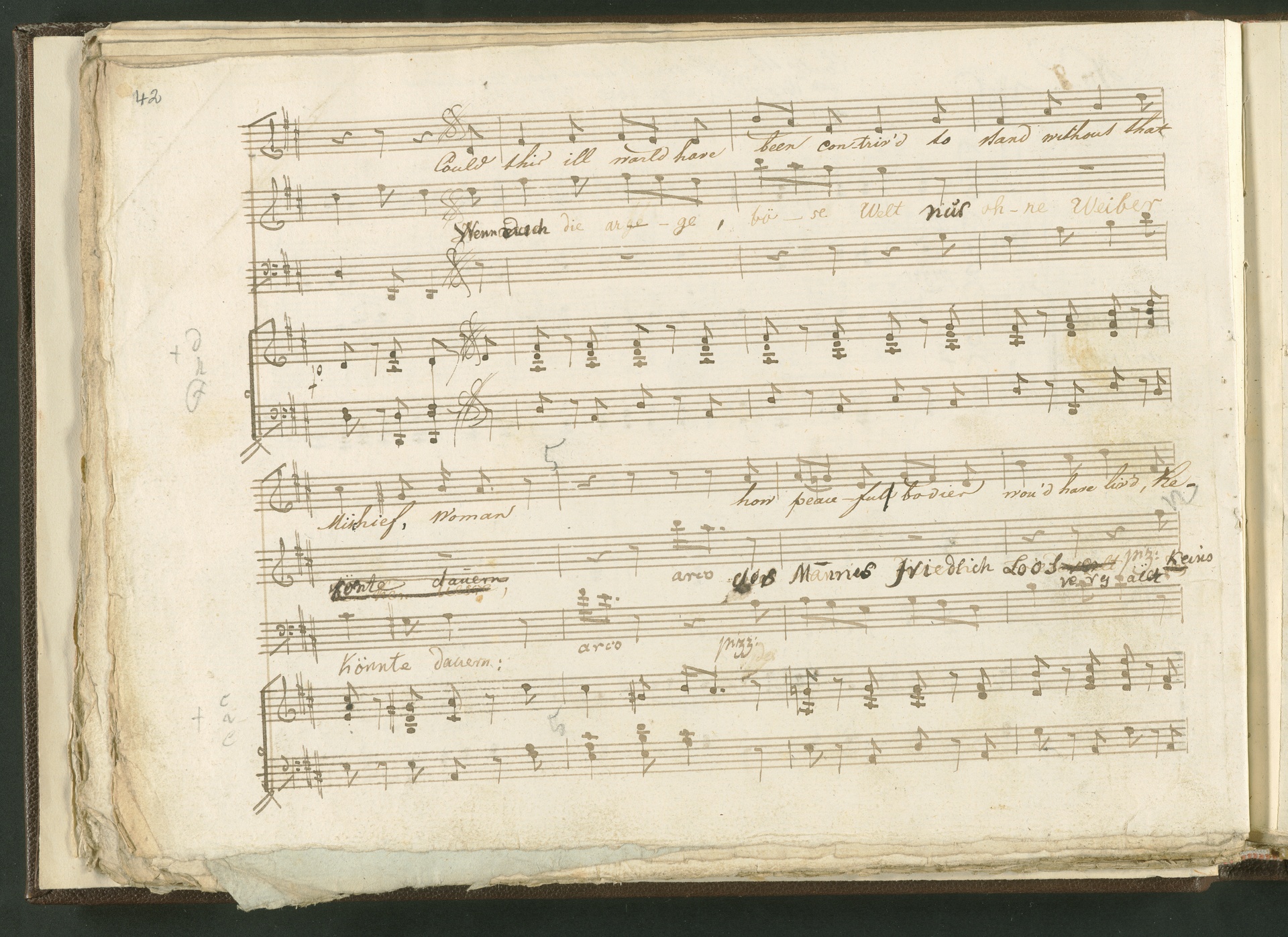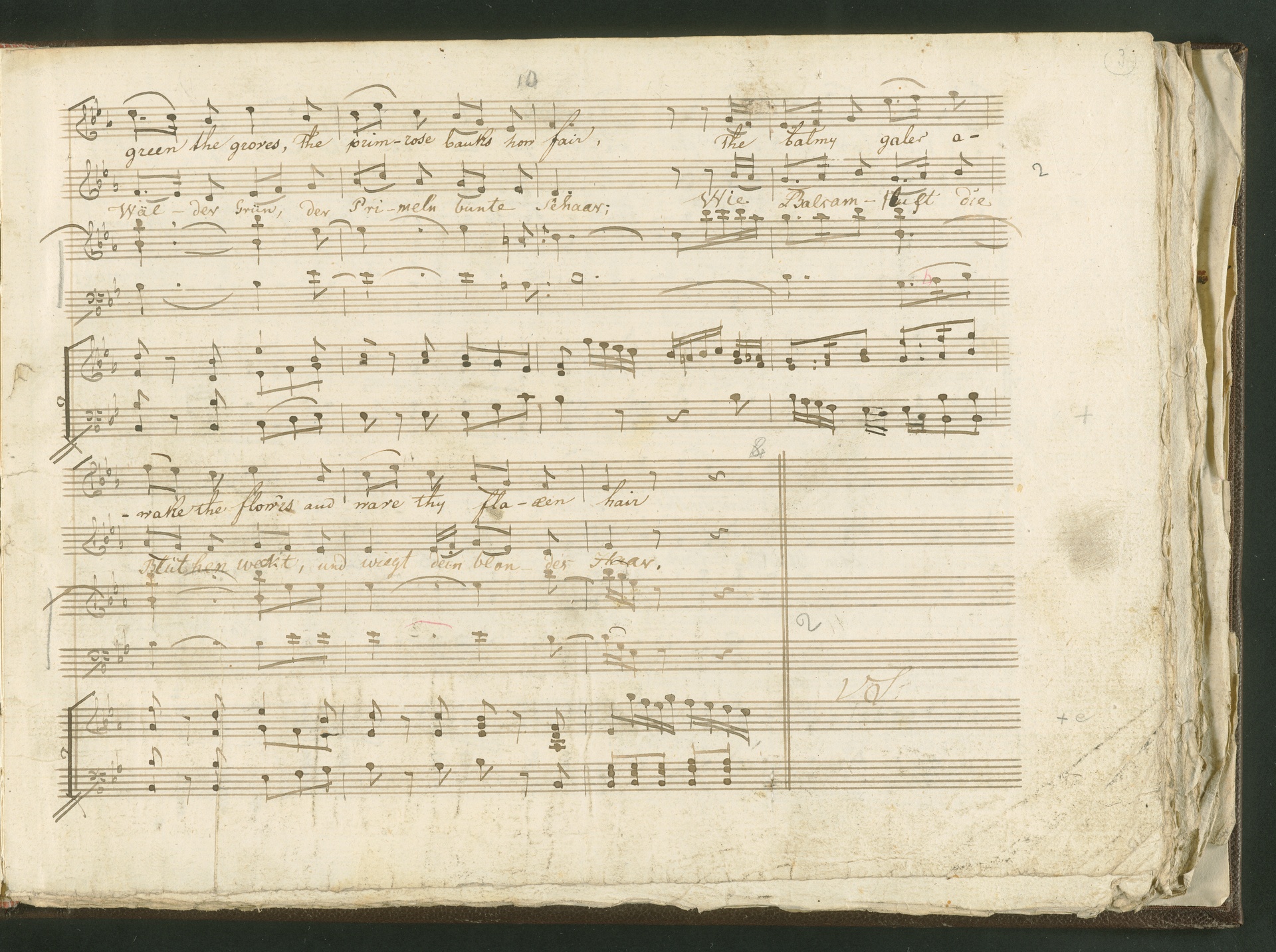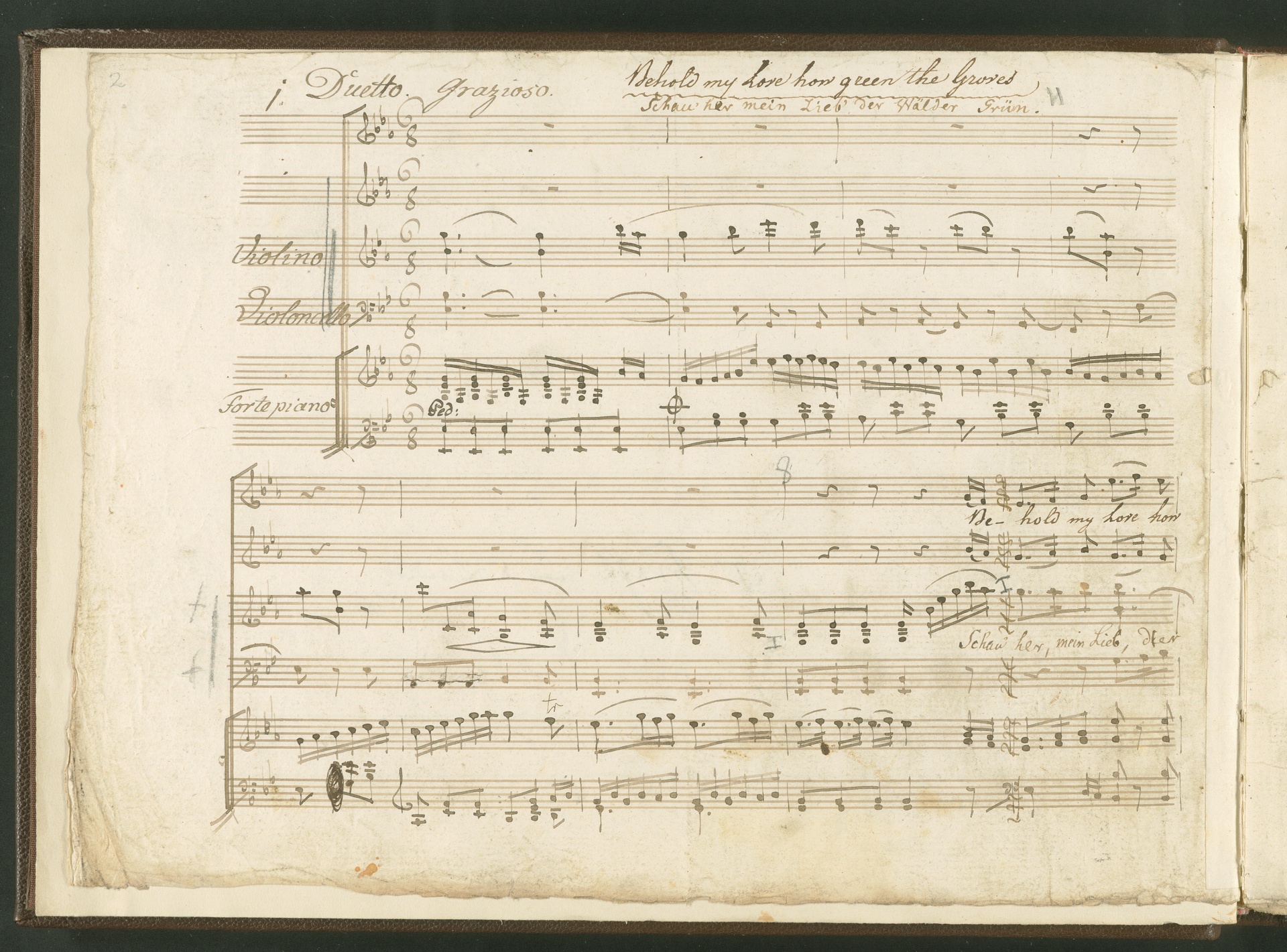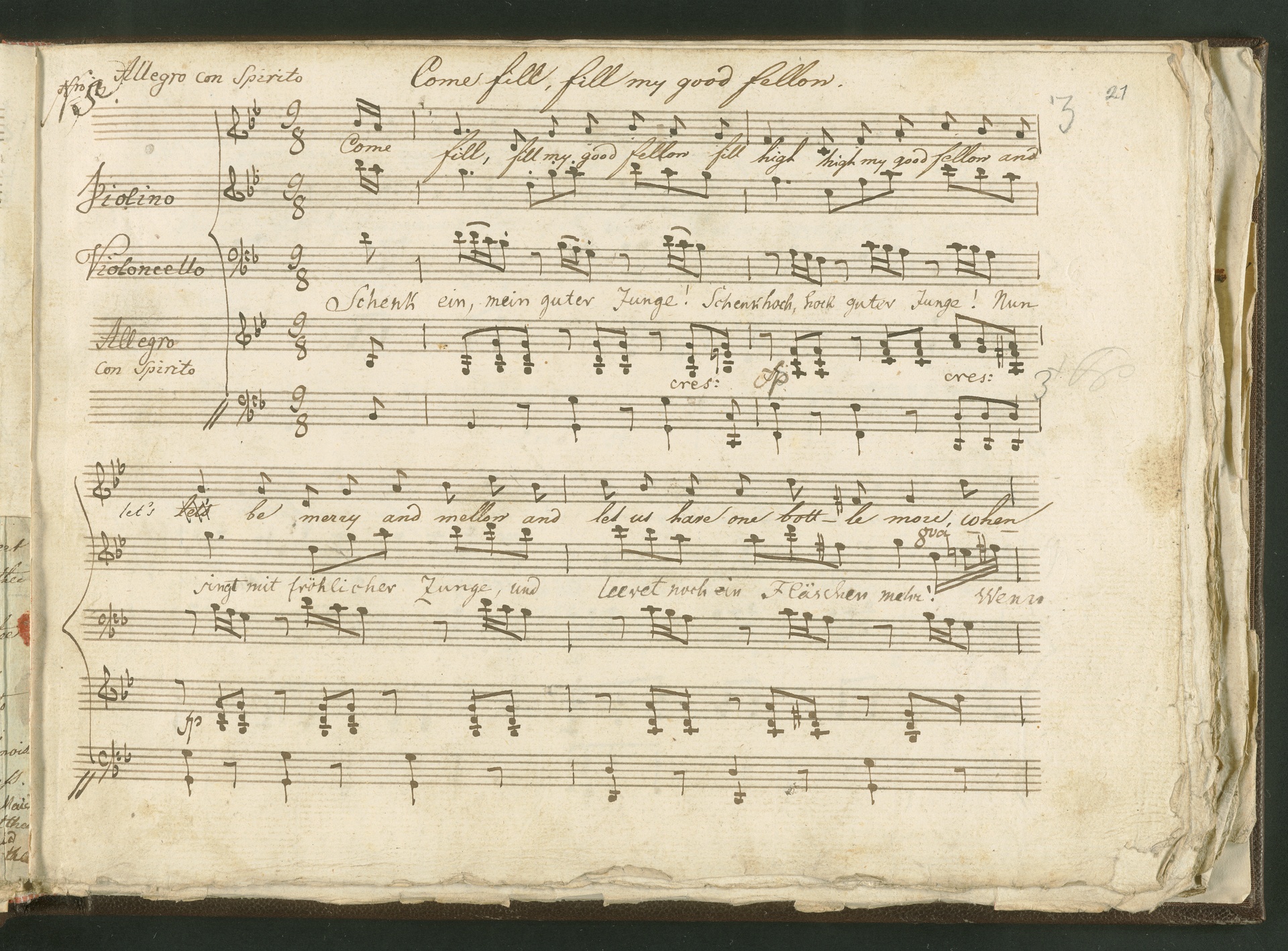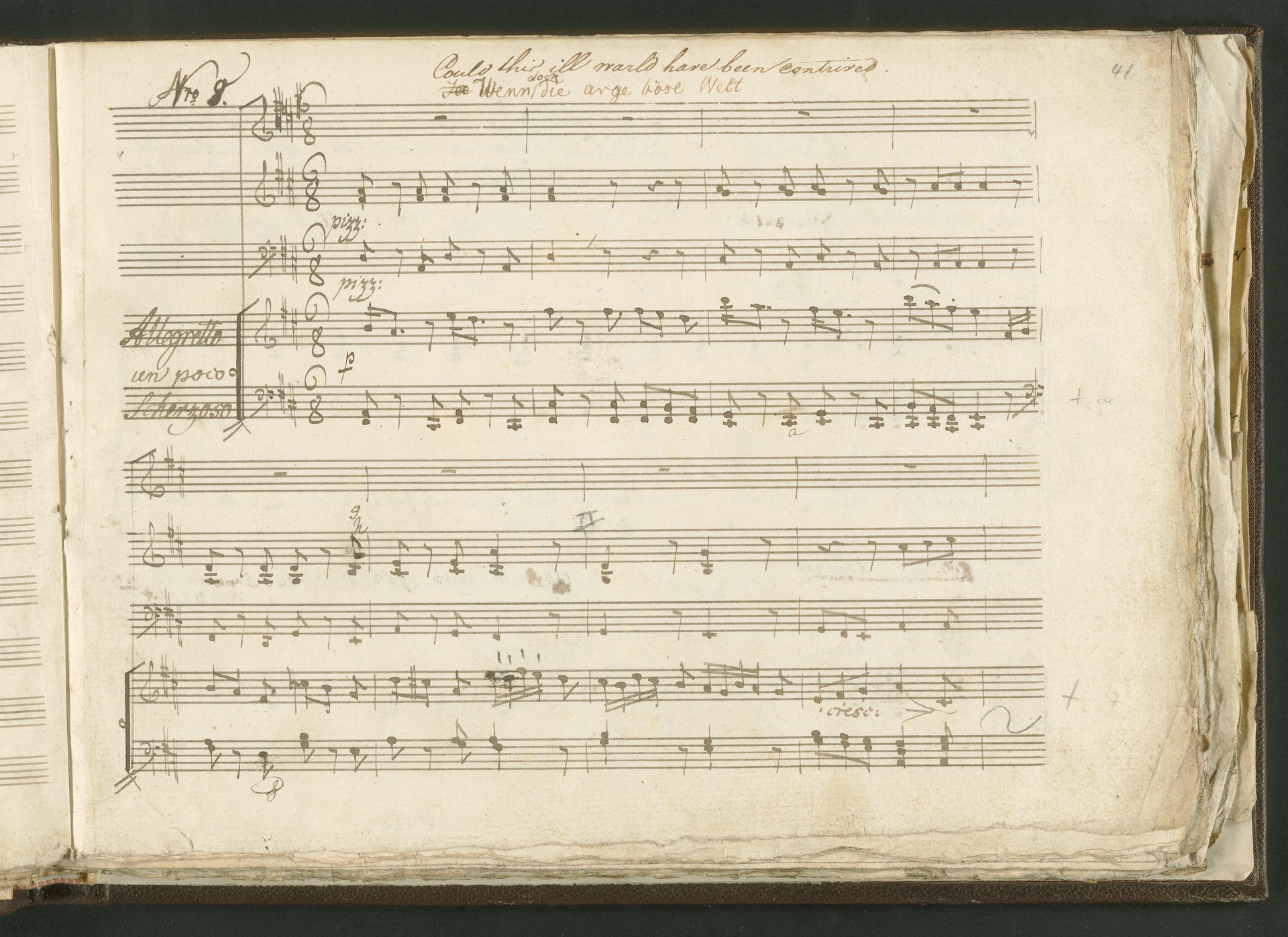 Im Juni 1818 erschien auf den britischen Inseln "A Select Collection of Original Scottish Airs": Beethovens musikalische Ausgestaltung von 25 schottischen Liedern. Beethoven, durchaus kein schlechter Geschäftsmann, versuchte anschließend, die Kompositionen auch auf dem Kontinent zu verkaufen und hatte 1820 in Berlin Glück. Der Verleger Adolph Martin Schlesinger interessierte sich für die Lieder und veranstaltete 1822 eine deutsche Ausgabe. Die überprüfte Abschrift ist die Stichvorlage für diese deutsche Originalausgabe (Op. 108). Neben dem von zwei unterschiedlichen Schreibern kopierten Notentext sind noch zwei weitere Handschriften erkennbar: Franz Oliva, Beethovens Freund und freiwilliger Sekretär schrieb den englischen Text der Lieder in die Abschrift, Samuel Heinrich Spiker fügte deren deutsche Übersetzung hinzu. Um die Lieder auf dem deutschen Markt besser verkaufen zu können, ließ Schlesinger sie übersetzen und druckte seine Ausgabe zweisprachig englisch und deutsch. Die Lieder waren im Original in einem schottischen Dialekt geschrieben, was deren Übersetzung nicht eben einfach machte. Der deutsche Text ist nicht immer ganz glücklich. Auch Beethoven bemerkte das in einem Brief an Schlesinger am 9. April 1822 und bat um Abhilfe: "wegen den Schottischen Liedern schrieb ich ihnen schon, daß beßer vom dichter auf die Langen u. kurzen Silben, welche leztere oft auf lange Noten u. die erstern auf kurze Nothen gerathen sind, Es läßt sich zwar etwas entschuld. in dieser Art, wäre der dichter hier so wäres leicht, jezt aber bin ich so überhaüft beschäftigt, daß es mir nicht mögl. ist, H. Zelter ein Mann von Kenntniß in der Poesie wie es sich für einen ausgezeichneten autor schikt, würde wol bald ihnen helfen können diese kleinen Fleken abzuwaschen" (BGA 1460, Beethoven an Adolph Martin Schlesinger). Trotz Beethovens Empfehlung, sich an Zelter (ein Freund Goethes) zu wenden, blieb der Verlag bei Spiker. Die deutschen Textunterlegungen wurden weder korrigiert noch geändert. (J.R.)