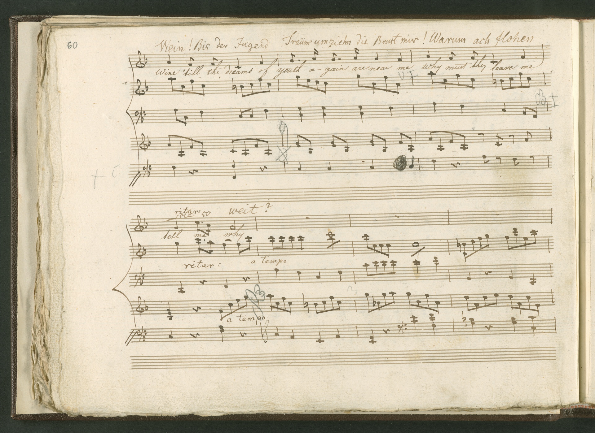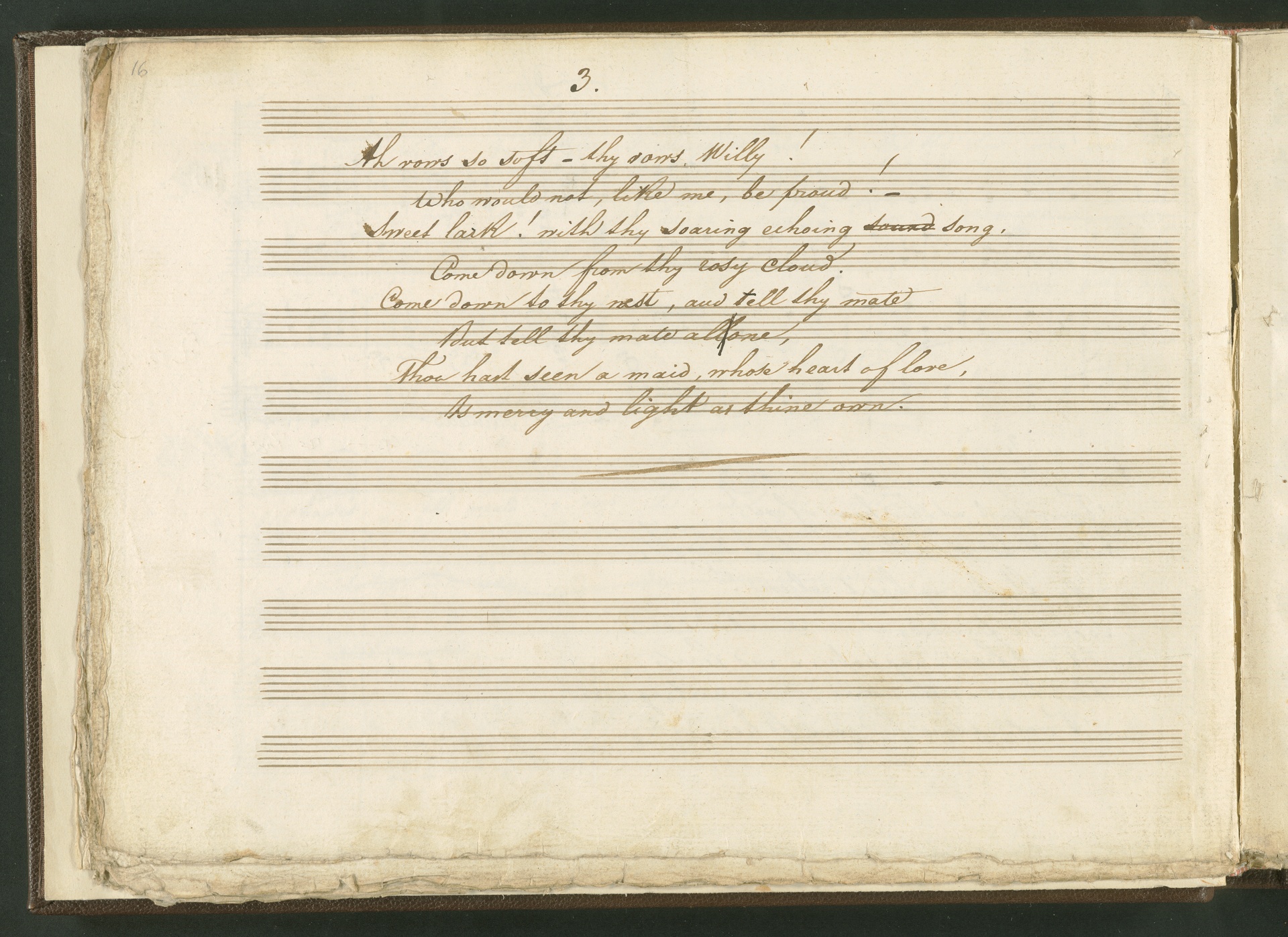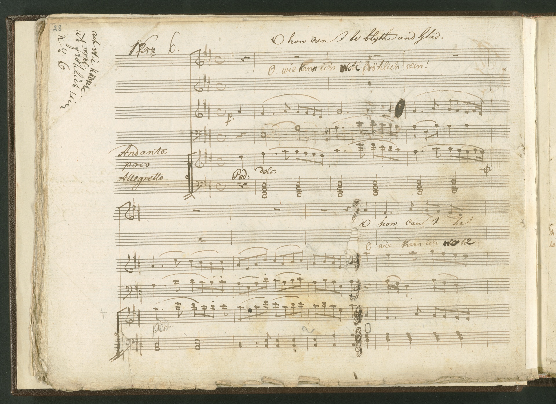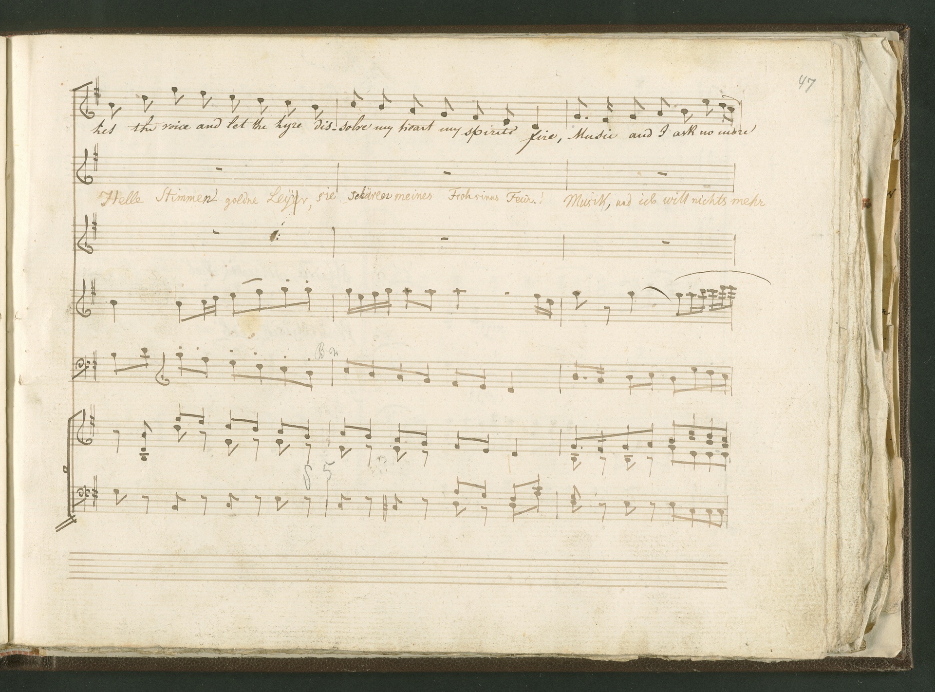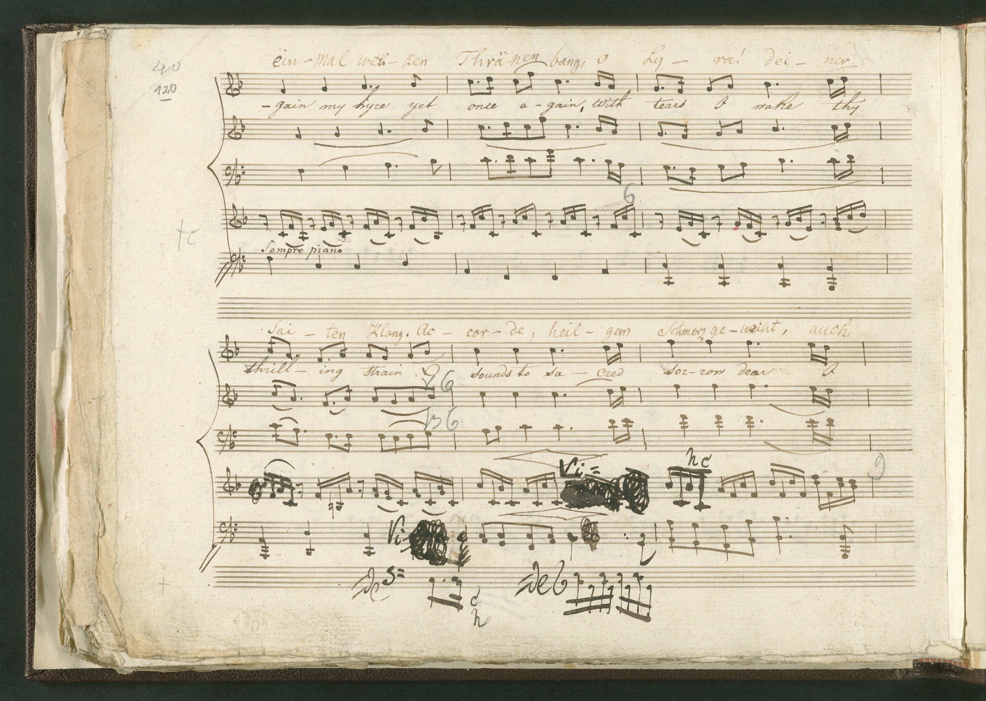 Im Juni 1818 erschien auf den britischen Inseln "A Select Collection of Original Scottish Airs": Beethovens musikalische Ausgestaltung von 25 schottischen Liedern. Beethoven, durchaus kein schlechter Geschäftsmann, versuchte anschließend, die Kompositionen auch auf dem Kontinent zu verkaufen und hatte 1820 in Berlin Glück. Der Verleger Adolph Martin Schlesinger interessierte sich für die Lieder und veranstaltete 1822 eine deutsche Ausgabe. Die überprüfte Abschrift ist die Stichvorlage für diese deutsche Originalausgabe (Op. 108). Neben dem von zwei unterschiedlichen Schreibern kopierten Notentext sind noch zwei weitere Handschriften erkennbar: Franz Oliva, Beethovens Freund und freiwilliger Sekretär schrieb den englischen Text der Lieder in die Abschrift, Samuel Heinrich Spiker fügte deren deutsche Übersetzung hinzu. Um die Lieder auf dem deutschen Markt besser verkaufen zu können, ließ Schlesinger sie übersetzen und druckte seine Ausgabe zweisprachig englisch und deutsch. Die Lieder waren im Original in einem schottischen Dialekt geschrieben, was deren Übersetzung nicht eben einfach machte. Der deutsche Text ist nicht immer ganz glücklich. Auch Beethoven bemerkte das in einem Brief an Schlesinger am 9. April 1822 und bat um Abhilfe: "wegen den Schottischen Liedern schrieb ich ihnen schon, daß beßer vom dichter auf die Langen u. kurzen Silben, welche leztere oft auf lange Noten u. die erstern auf kurze Nothen gerathen sind, Es läßt sich zwar etwas entschuld. in dieser Art, wäre der dichter hier so wäres leicht, jezt aber bin ich so überhaüft beschäftigt, daß es mir nicht mögl. ist, H. Zelter ein Mann von Kenntniß in der Poesie wie es sich für einen ausgezeichneten autor schikt, würde wol bald ihnen helfen können diese kleinen Fleken abzuwaschen" (BGA 1460, Beethoven an Adolph Martin Schlesinger). Trotz Beethovens Empfehlung, sich an Zelter (ein Freund Goethes) zu wenden, blieb der Verlag bei Spiker. Die deutschen Textunterlegungen wurden weder korrigiert noch geändert. (J.R.)