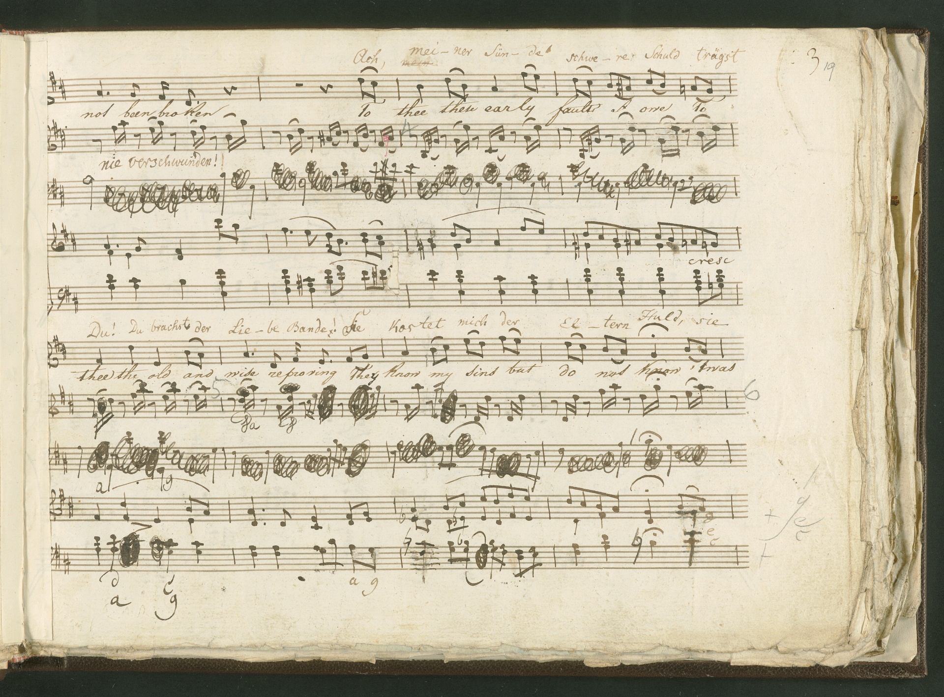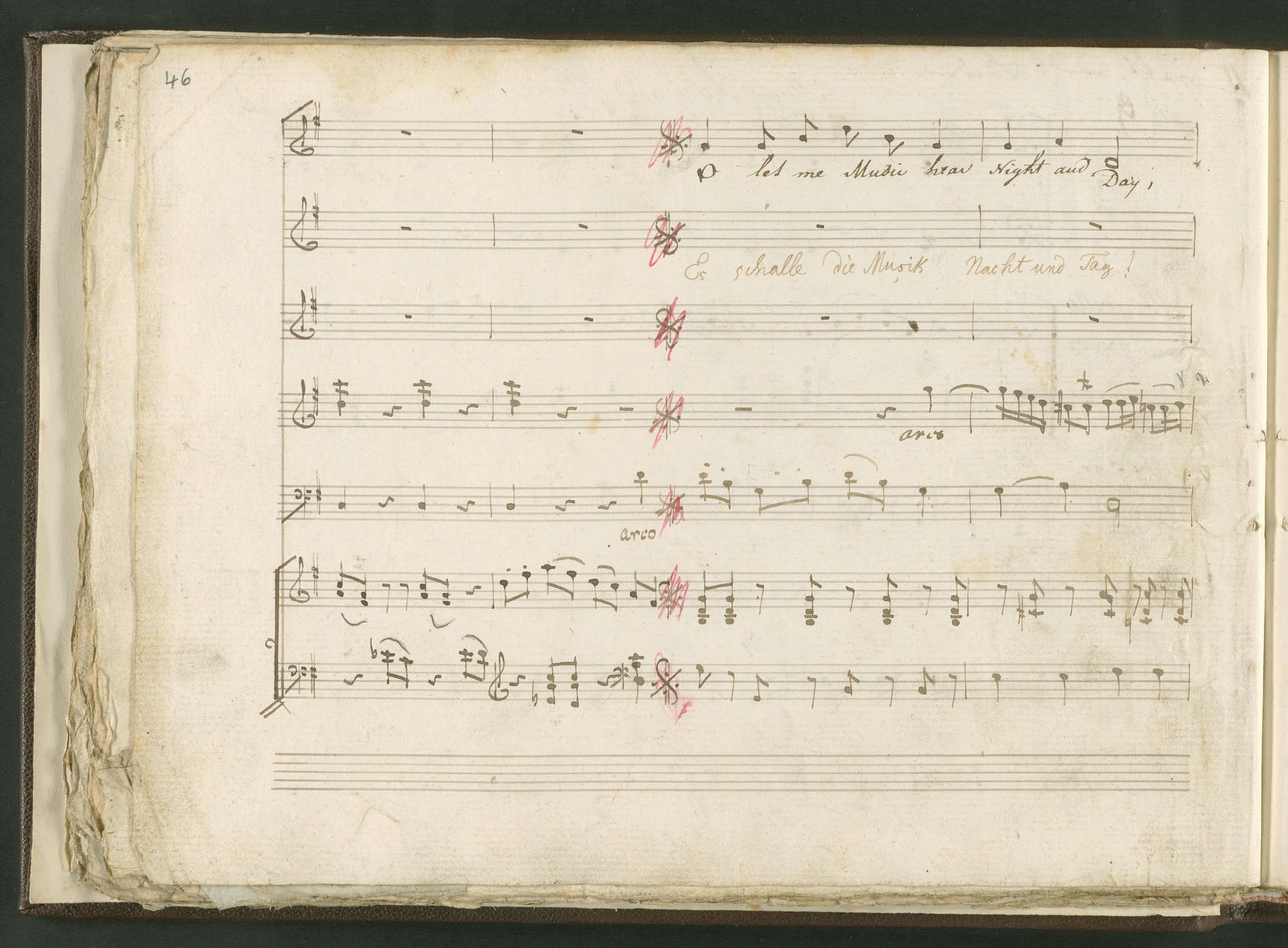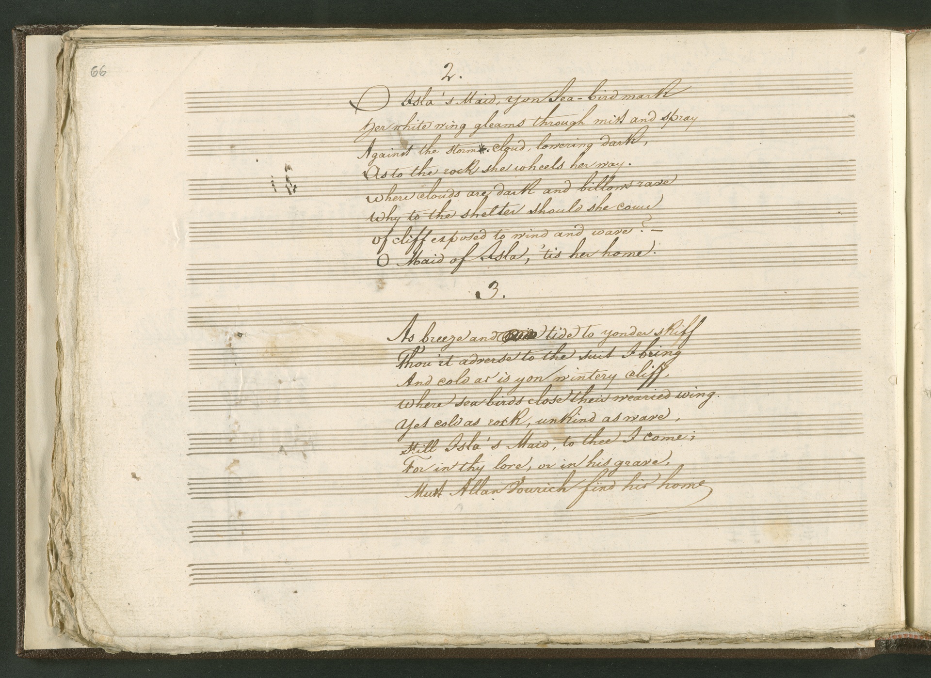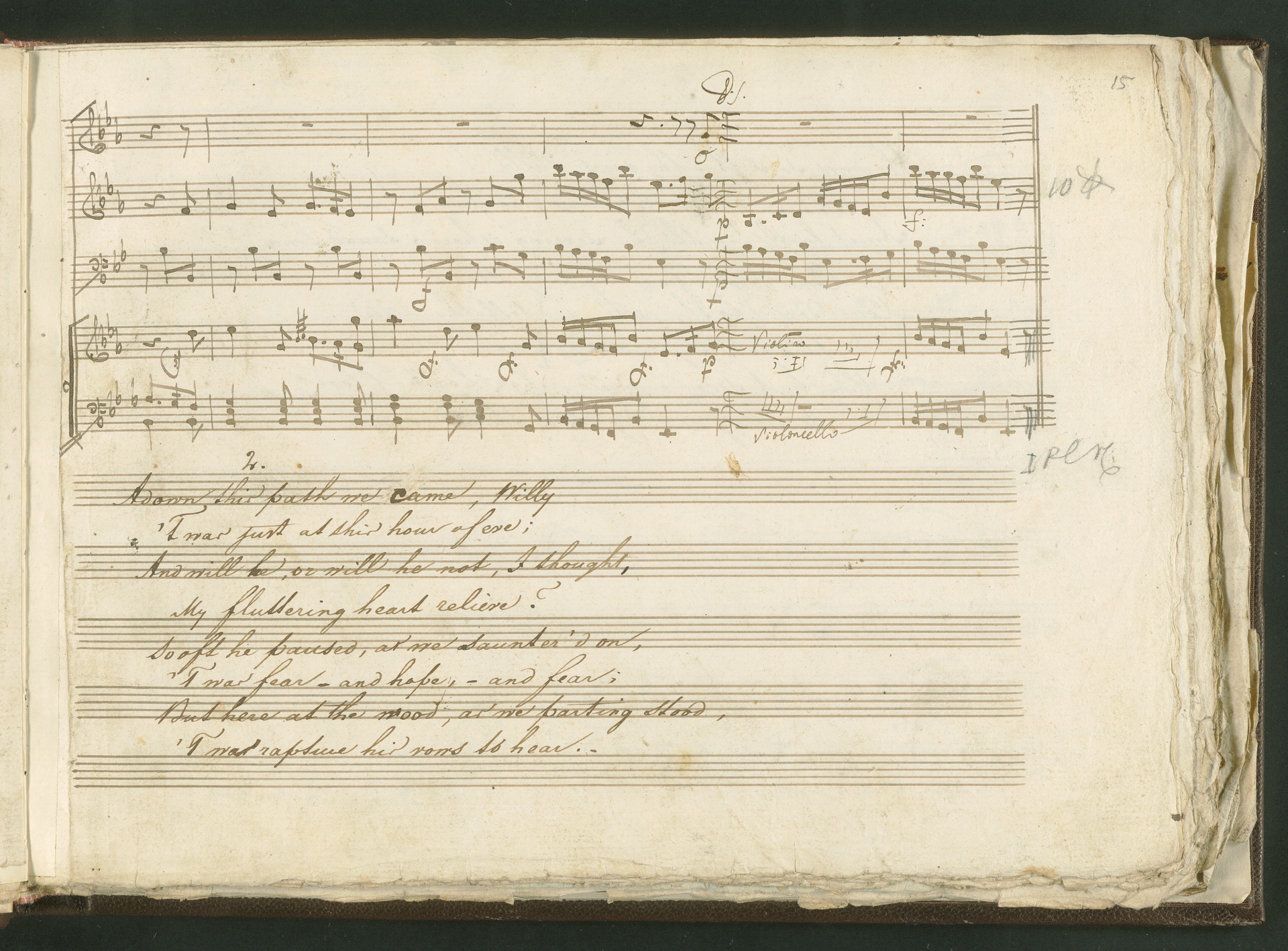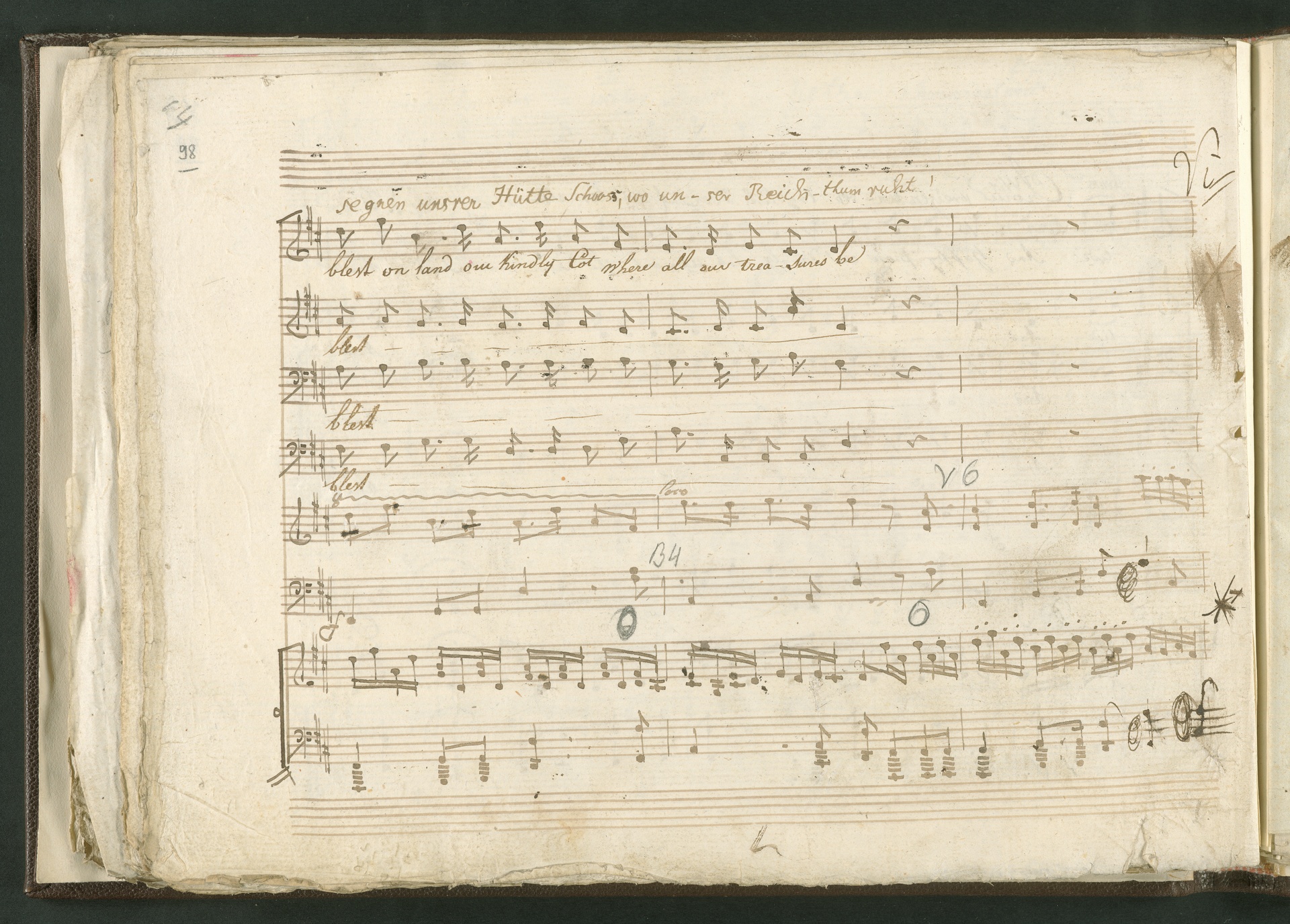 Im Juni 1818 erschien auf den britischen Inseln "A Select Collection of Original Scottish Airs": Beethovens musikalische Ausgestaltung von 25 schottischen Liedern. Beethoven, durchaus kein schlechter Geschäftsmann, versuchte anschließend, die Kompositionen auch auf dem Kontinent zu verkaufen und hatte 1820 in Berlin Glück. Der Verleger Adolph Martin Schlesinger interessierte sich für die Lieder und veranstaltete 1822 eine deutsche Ausgabe. Die überprüfte Abschrift ist die Stichvorlage für diese deutsche Originalausgabe (Op. 108). Neben dem von zwei unterschiedlichen Schreibern kopierten Notentext sind noch zwei weitere Handschriften erkennbar: Franz Oliva, Beethovens Freund und freiwilliger Sekretär schrieb den englischen Text der Lieder in die Abschrift, Samuel Heinrich Spiker fügte deren deutsche Übersetzung hinzu. Um die Lieder auf dem deutschen Markt besser verkaufen zu können, ließ Schlesinger sie übersetzen und druckte seine Ausgabe zweisprachig englisch und deutsch. Die Lieder waren im Original in einem schottischen Dialekt geschrieben, was deren Übersetzung nicht eben einfach machte. Der deutsche Text ist nicht immer ganz glücklich. Auch Beethoven bemerkte das in einem Brief an Schlesinger am 9. April 1822 und bat um Abhilfe: "wegen den Schottischen Liedern schrieb ich ihnen schon, daß beßer vom dichter auf die Langen u. kurzen Silben, welche leztere oft auf lange Noten u. die erstern auf kurze Nothen gerathen sind, Es läßt sich zwar etwas entschuld. in dieser Art, wäre der dichter hier so wäres leicht, jezt aber bin ich so überhaüft beschäftigt, daß es mir nicht mögl. ist, H. Zelter ein Mann von Kenntniß in der Poesie wie es sich für einen ausgezeichneten autor schikt, würde wol bald ihnen helfen können diese kleinen Fleken abzuwaschen" (BGA 1460, Beethoven an Adolph Martin Schlesinger). Trotz Beethovens Empfehlung, sich an Zelter (ein Freund Goethes) zu wenden, blieb der Verlag bei Spiker. Die deutschen Textunterlegungen wurden weder korrigiert noch geändert. (J.R.)