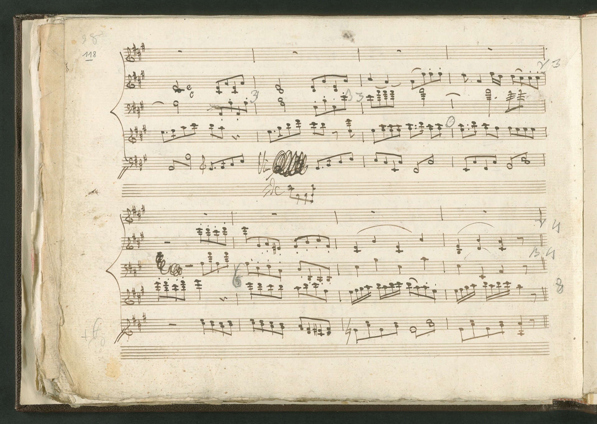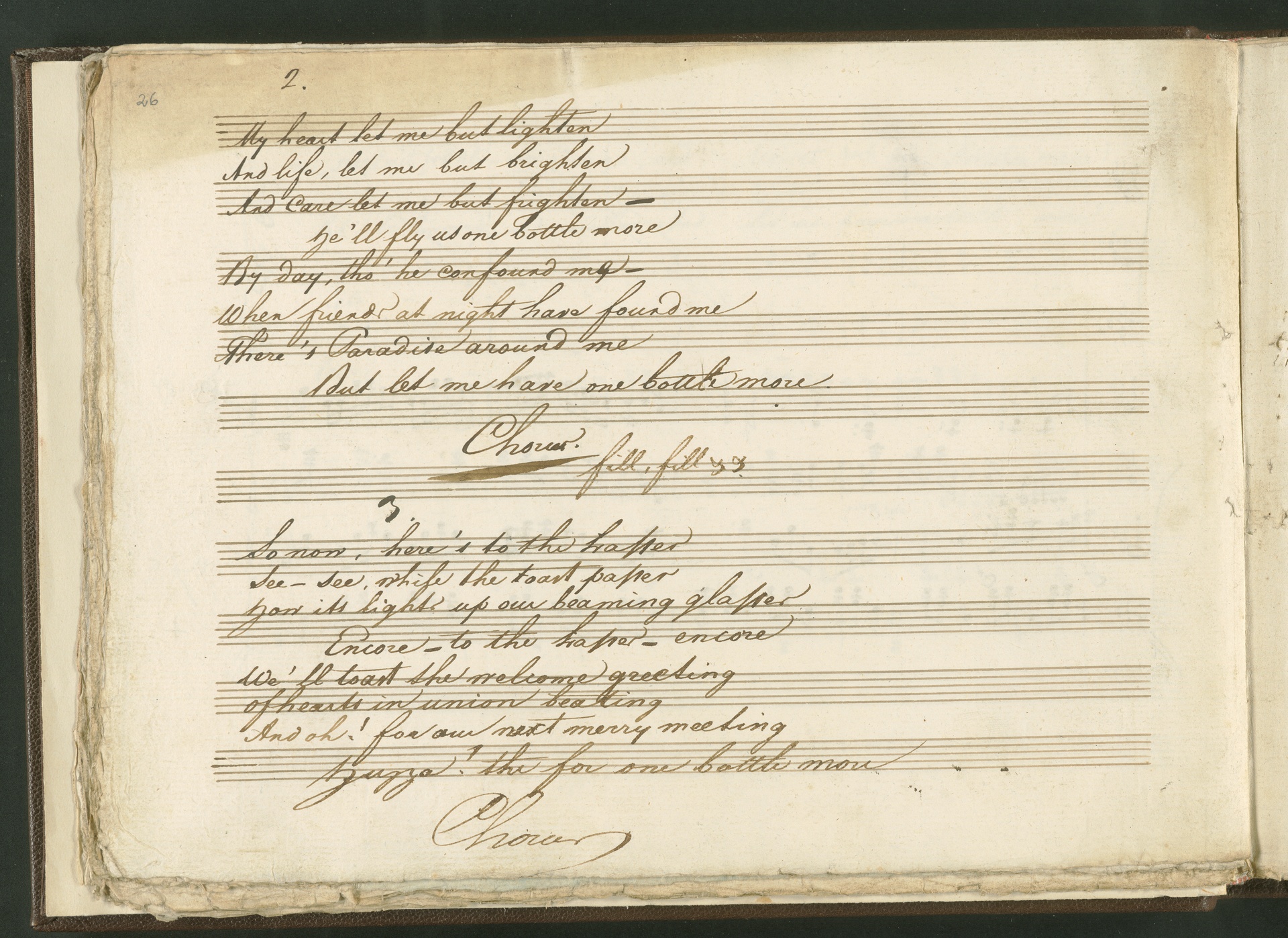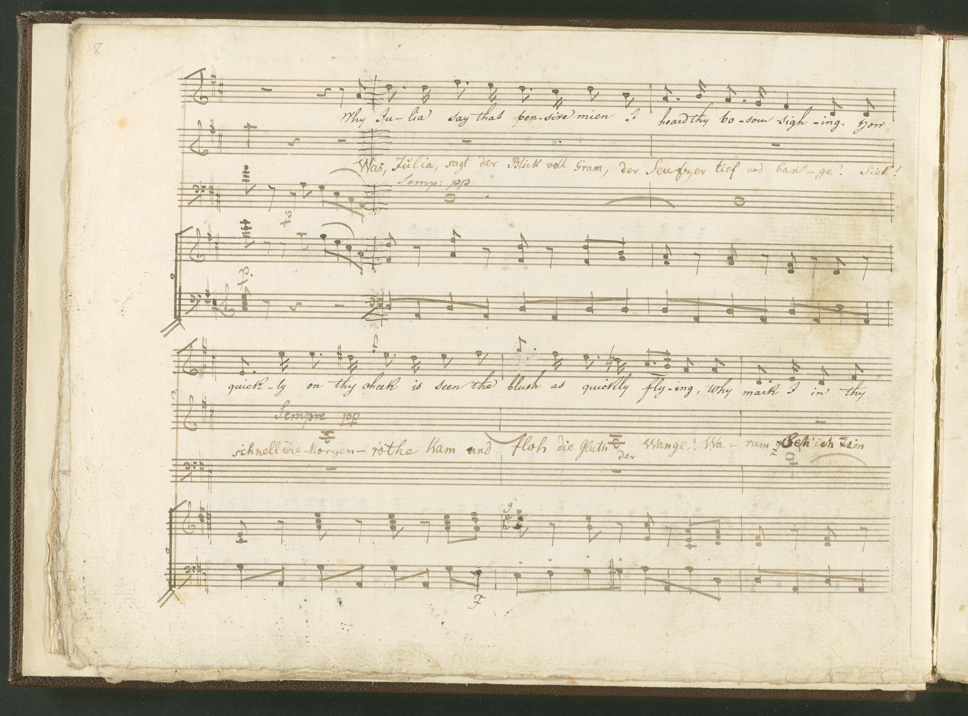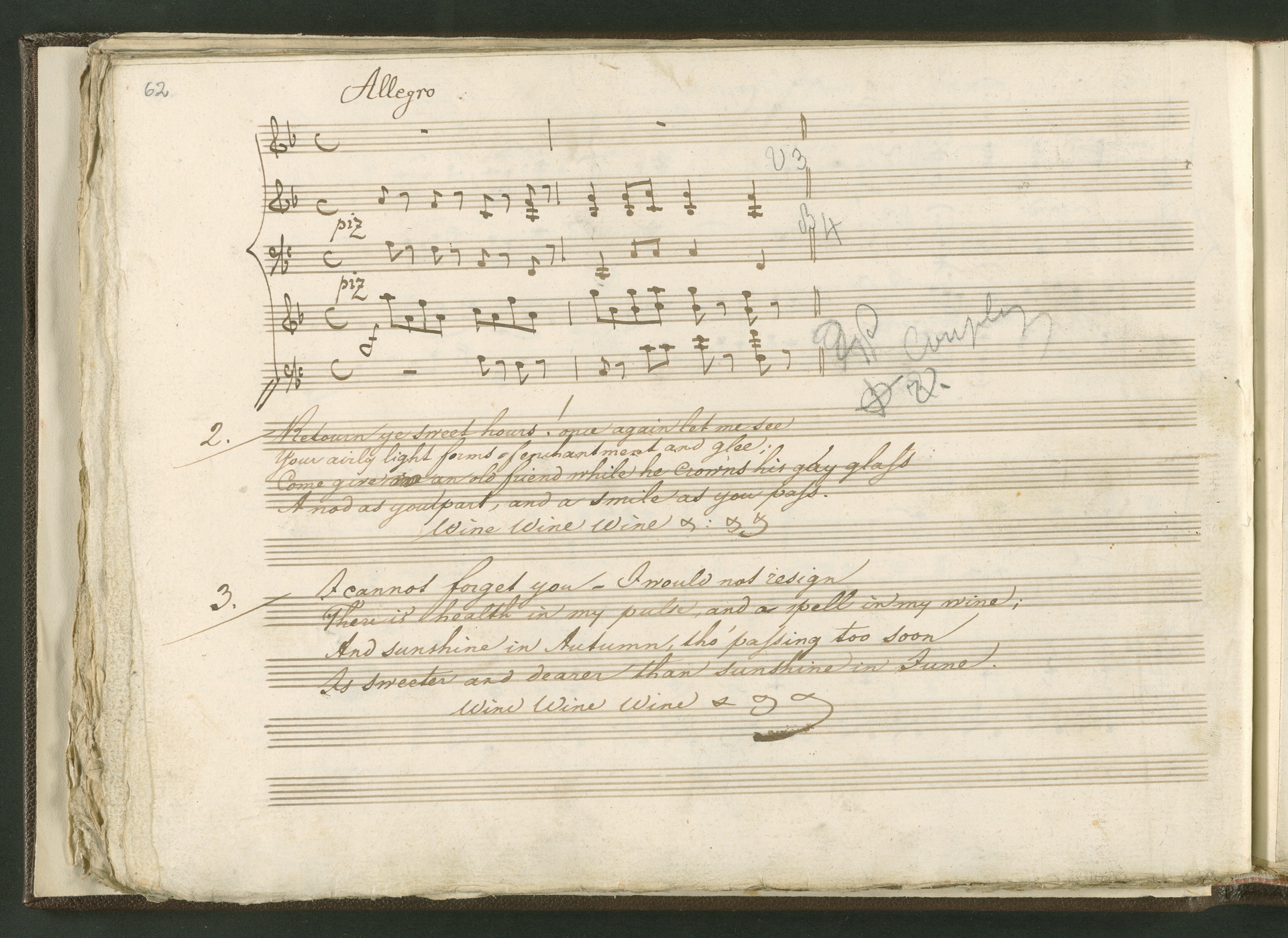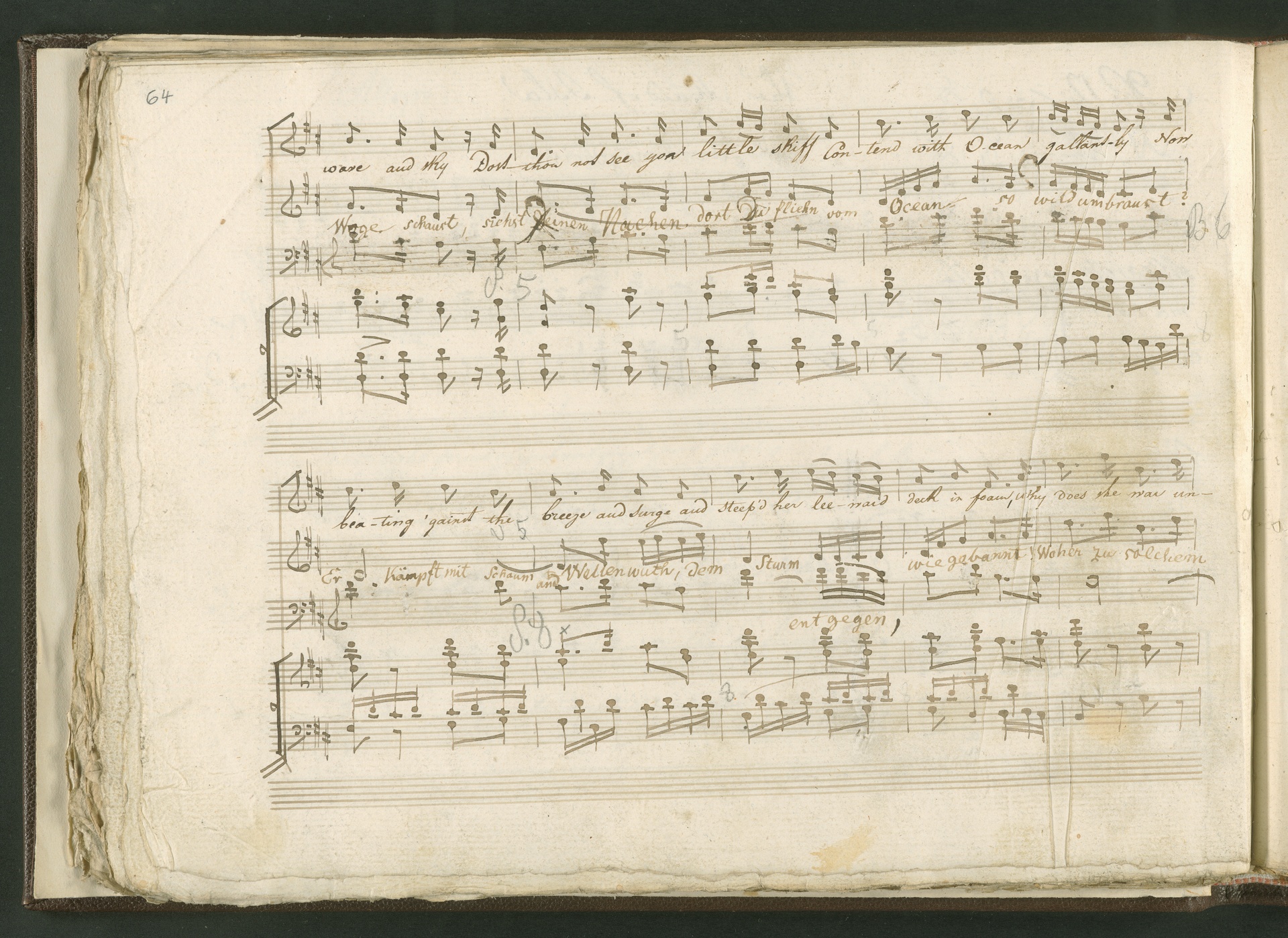 Im Juni 1818 erschien auf den britischen Inseln "A Select Collection of Original Scottish Airs": Beethovens musikalische Ausgestaltung von 25 schottischen Liedern. Beethoven, durchaus kein schlechter Geschäftsmann, versuchte anschließend, die Kompositionen auch auf dem Kontinent zu verkaufen und hatte 1820 in Berlin Glück. Der Verleger Adolph Martin Schlesinger interessierte sich für die Lieder und veranstaltete 1822 eine deutsche Ausgabe. Die überprüfte Abschrift ist die Stichvorlage für diese deutsche Originalausgabe (Op. 108). Neben dem von zwei unterschiedlichen Schreibern kopierten Notentext sind noch zwei weitere Handschriften erkennbar: Franz Oliva, Beethovens Freund und freiwilliger Sekretär schrieb den englischen Text der Lieder in die Abschrift, Samuel Heinrich Spiker fügte deren deutsche Übersetzung hinzu. Um die Lieder auf dem deutschen Markt besser verkaufen zu können, ließ Schlesinger sie übersetzen und druckte seine Ausgabe zweisprachig englisch und deutsch. Die Lieder waren im Original in einem schottischen Dialekt geschrieben, was deren Übersetzung nicht eben einfach machte. Der deutsche Text ist nicht immer ganz glücklich. Auch Beethoven bemerkte das in einem Brief an Schlesinger am 9. April 1822 und bat um Abhilfe: "wegen den Schottischen Liedern schrieb ich ihnen schon, daß beßer vom dichter auf die Langen u. kurzen Silben, welche leztere oft auf lange Noten u. die erstern auf kurze Nothen gerathen sind, Es läßt sich zwar etwas entschuld. in dieser Art, wäre der dichter hier so wäres leicht, jezt aber bin ich so überhaüft beschäftigt, daß es mir nicht mögl. ist, H. Zelter ein Mann von Kenntniß in der Poesie wie es sich für einen ausgezeichneten autor schikt, würde wol bald ihnen helfen können diese kleinen Fleken abzuwaschen" (BGA 1460, Beethoven an Adolph Martin Schlesinger). Trotz Beethovens Empfehlung, sich an Zelter (ein Freund Goethes) zu wenden, blieb der Verlag bei Spiker. Die deutschen Textunterlegungen wurden weder korrigiert noch geändert. (J.R.)