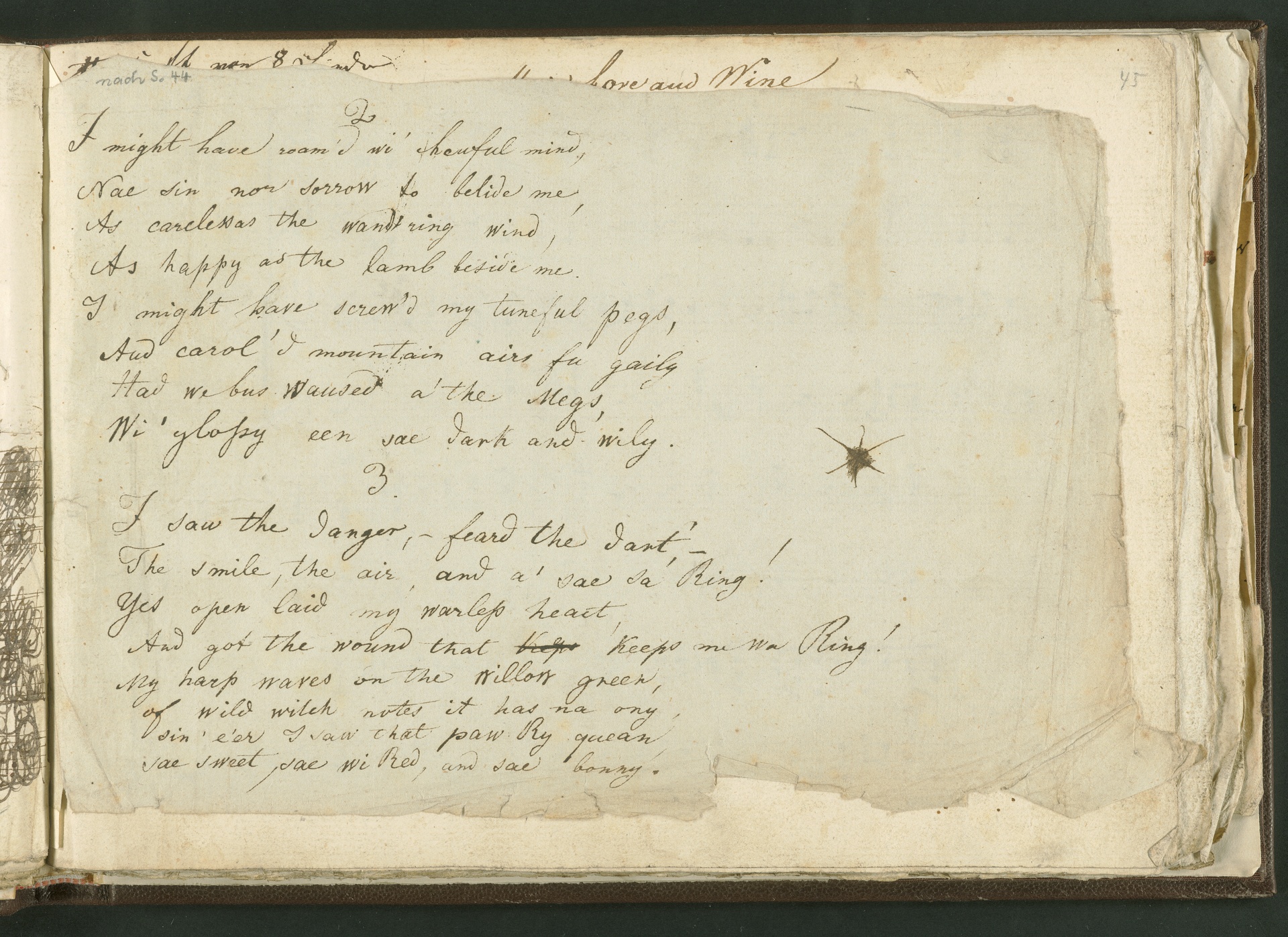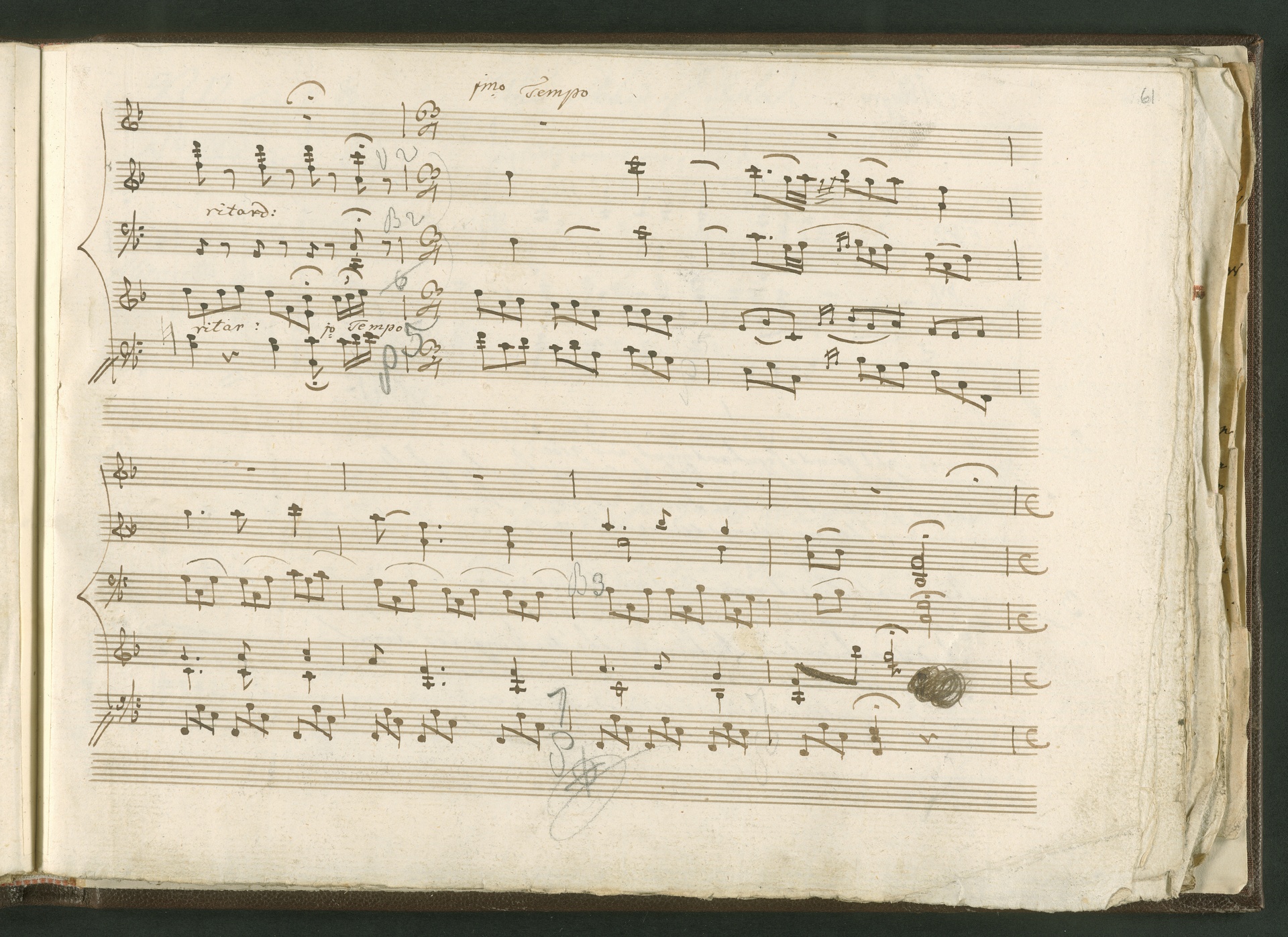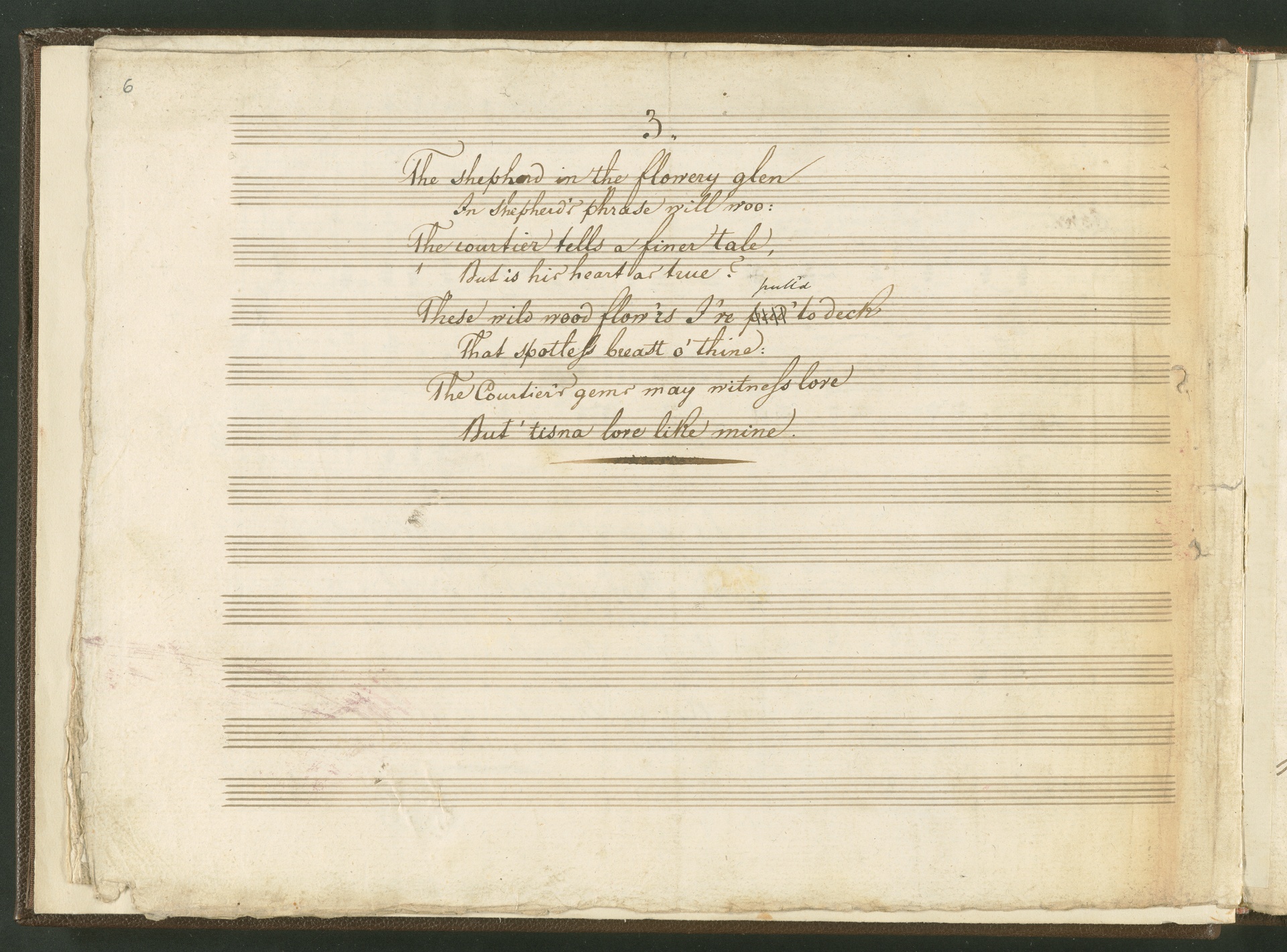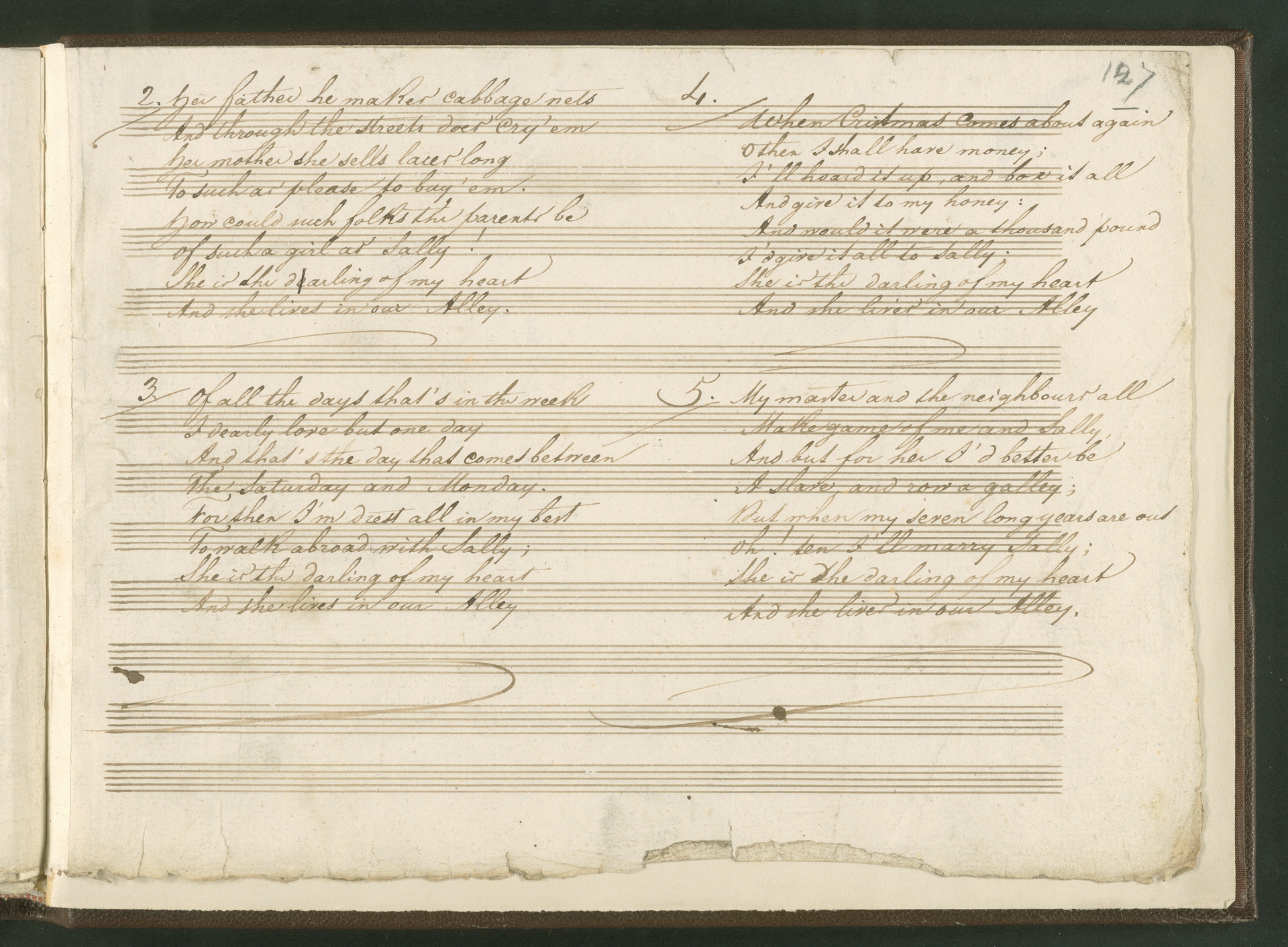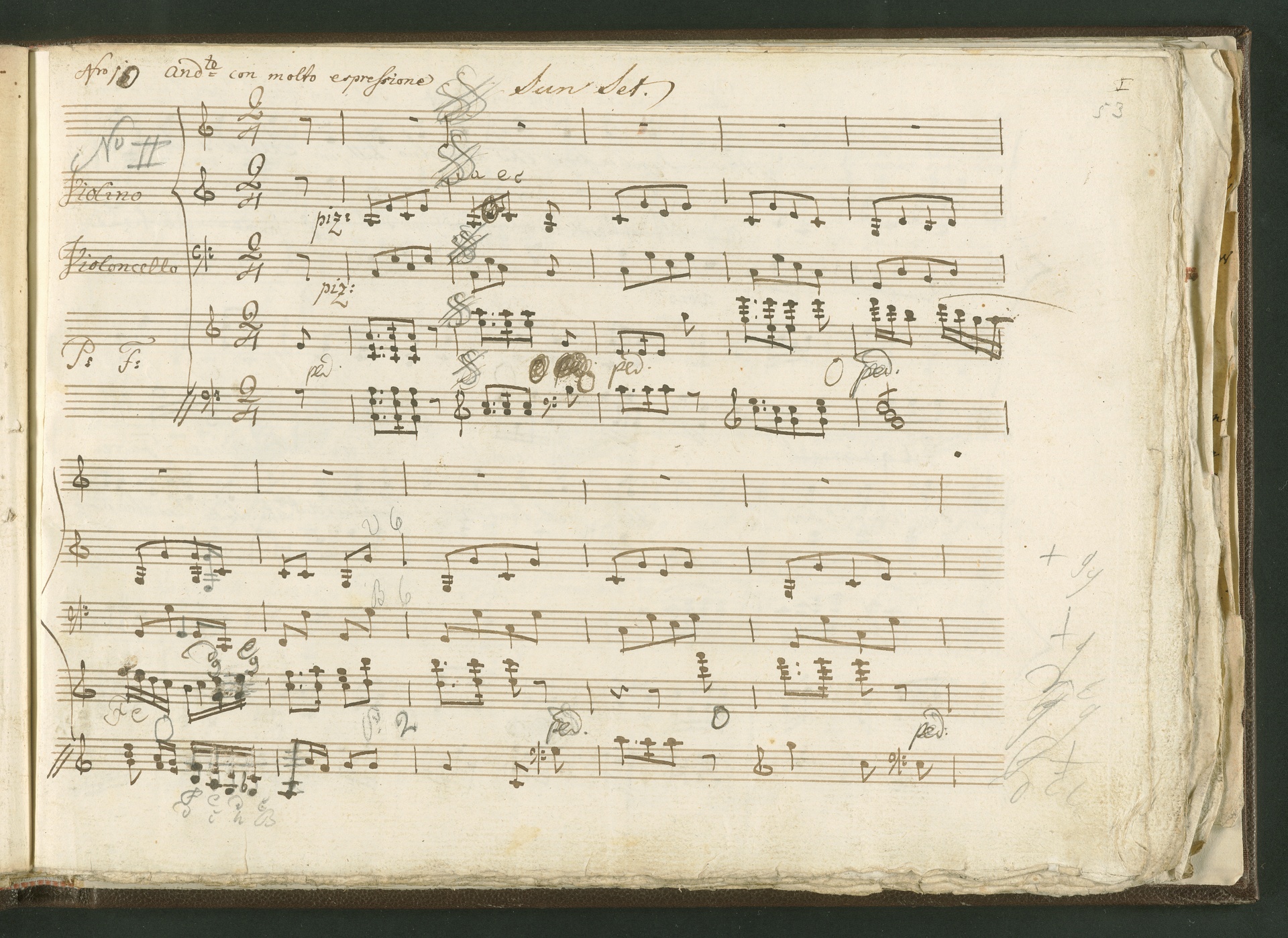 Im Juni 1818 erschien auf den britischen Inseln "A Select Collection of Original Scottish Airs": Beethovens musikalische Ausgestaltung von 25 schottischen Liedern. Beethoven, durchaus kein schlechter Geschäftsmann, versuchte anschließend, die Kompositionen auch auf dem Kontinent zu verkaufen und hatte 1820 in Berlin Glück. Der Verleger Adolph Martin Schlesinger interessierte sich für die Lieder und veranstaltete 1822 eine deutsche Ausgabe. Die überprüfte Abschrift ist die Stichvorlage für diese deutsche Originalausgabe (Op. 108). Neben dem von zwei unterschiedlichen Schreibern kopierten Notentext sind noch zwei weitere Handschriften erkennbar: Franz Oliva, Beethovens Freund und freiwilliger Sekretär schrieb den englischen Text der Lieder in die Abschrift, Samuel Heinrich Spiker fügte deren deutsche Übersetzung hinzu. Um die Lieder auf dem deutschen Markt besser verkaufen zu können, ließ Schlesinger sie übersetzen und druckte seine Ausgabe zweisprachig englisch und deutsch. Die Lieder waren im Original in einem schottischen Dialekt geschrieben, was deren Übersetzung nicht eben einfach machte. Der deutsche Text ist nicht immer ganz glücklich. Auch Beethoven bemerkte das in einem Brief an Schlesinger am 9. April 1822 und bat um Abhilfe: "wegen den Schottischen Liedern schrieb ich ihnen schon, daß beßer vom dichter auf die Langen u. kurzen Silben, welche leztere oft auf lange Noten u. die erstern auf kurze Nothen gerathen sind, Es läßt sich zwar etwas entschuld. in dieser Art, wäre der dichter hier so wäres leicht, jezt aber bin ich so überhaüft beschäftigt, daß es mir nicht mögl. ist, H. Zelter ein Mann von Kenntniß in der Poesie wie es sich für einen ausgezeichneten autor schikt, würde wol bald ihnen helfen können diese kleinen Fleken abzuwaschen" (BGA 1460, Beethoven an Adolph Martin Schlesinger). Trotz Beethovens Empfehlung, sich an Zelter (ein Freund Goethes) zu wenden, blieb der Verlag bei Spiker. Die deutschen Textunterlegungen wurden weder korrigiert noch geändert. (J.R.)