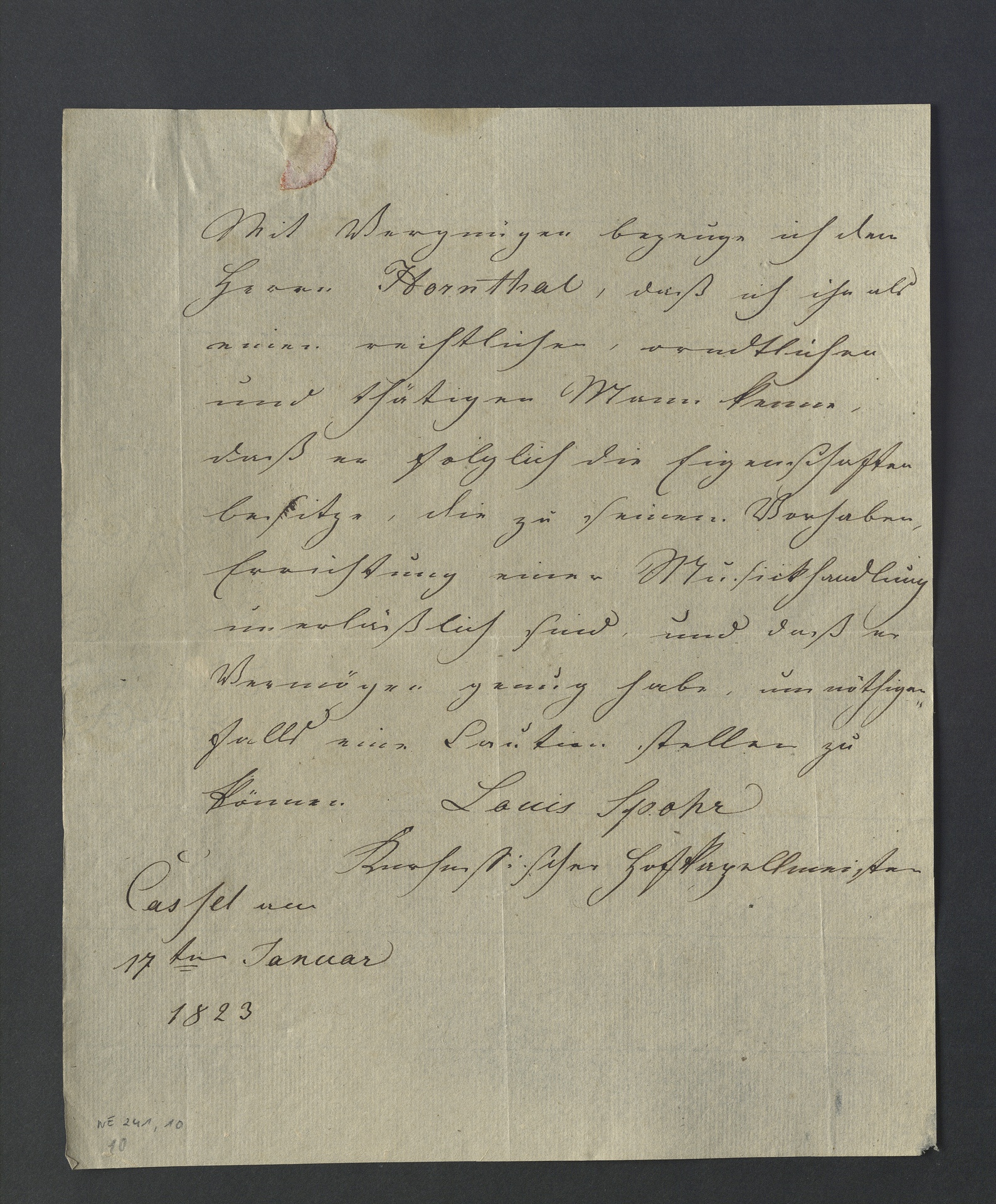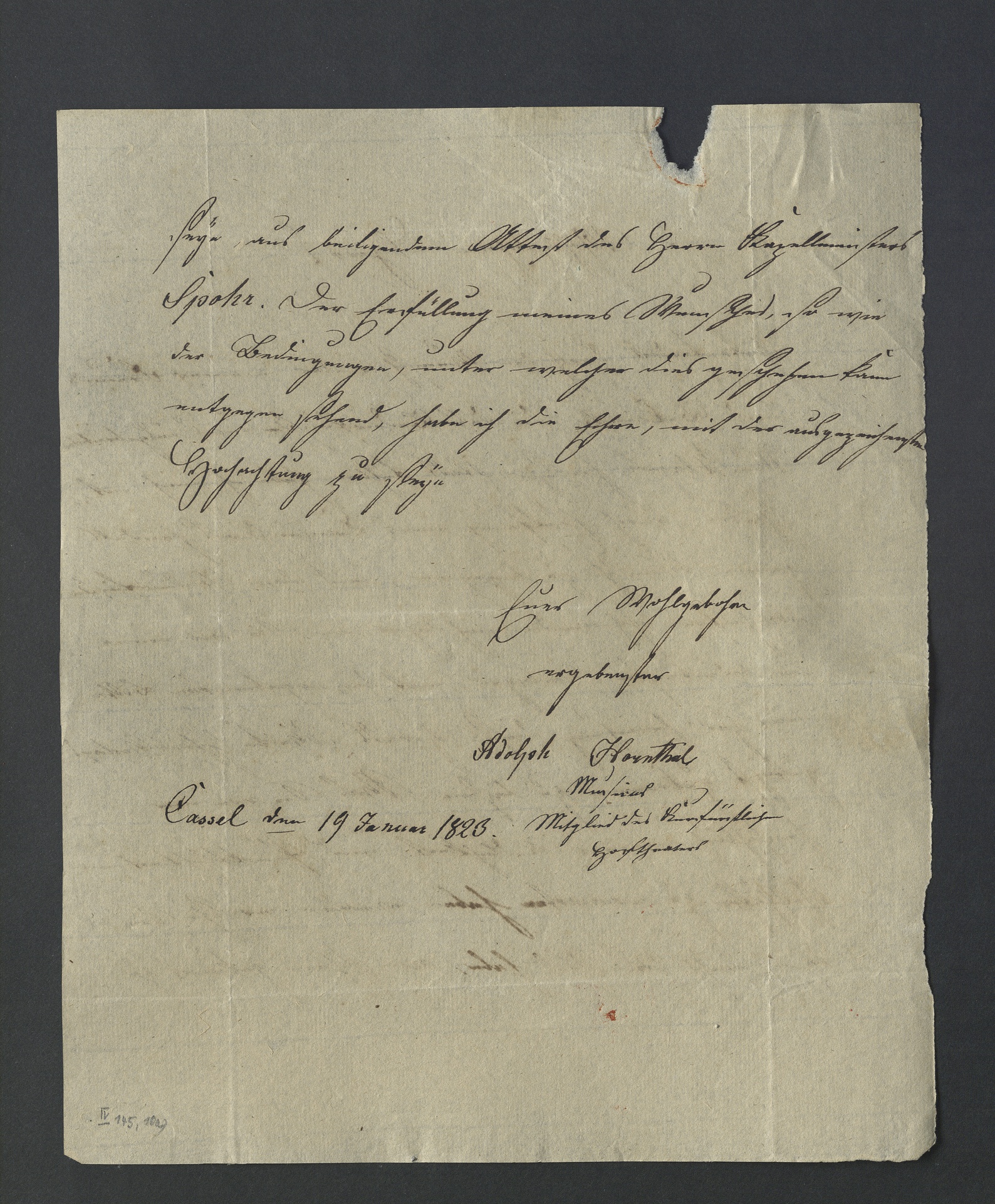 Text: "Wohlgebohrener Herr Aufgefordert durch den Wunsch vieler meiner Freunde und Bekannten, die das Bedürfniß eines ausgebreiteten Musiklagers hiesiger Stadt fühlen, habe ich mich entschlossen, durch Eröffnung eines Commißionshandels jenem Wunsche zu begegnen, und den Bedürfnißen abzuhelfen. Ich wnde mich daher an Sie, als einen der bedeutendsten Verleger, mit der ergebensten Bitte mir zur Erreichung dieses Zwecks, Werke Ihres Verlags gütigst zukommen zu lassen. Was Sie von mir hinsichtlich meiner Redlichkeit, und Pünktlichkeit im Geschäfte zu erwarten haben werden, ersehen Sie, da ich nicht das Glück habe, von Ihnen gekannt zu seyn, aus beiliegendem Attest des Herrn Kapellmeisters Spohr. Der Erfüllung meines Wunsches, so wie der Bedingungen, unter welchen dies geschehen kann entgegen sehend, habe ich die Ehre, mit der ausgezeichnesten Hochachtung zu seyn Euer Wohlgebohrn ergebenster Adolph Hornthal Musicus Mitglied des kutfürstlichen Hoftheaters Cassel den 19 Januar 1823". Karl Traugott Goldbach, Spohr-Briefe: <http://bit.ly/1mePTqf>
