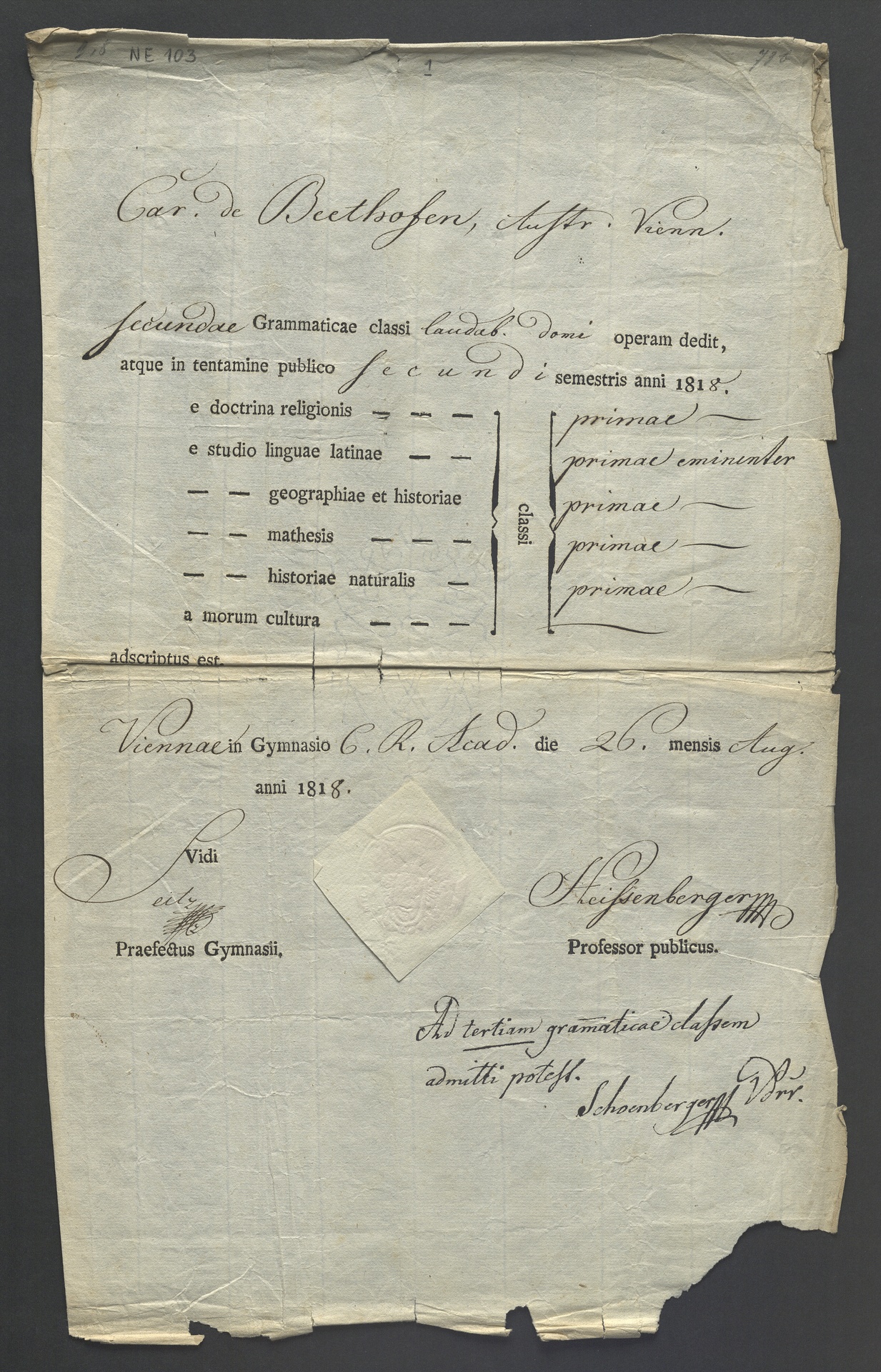 Karl van Beethoven (Neffe), Schulzeugnis der 2. Grammatikal-Klasse des Gymnasiums vom 26. August 1818
