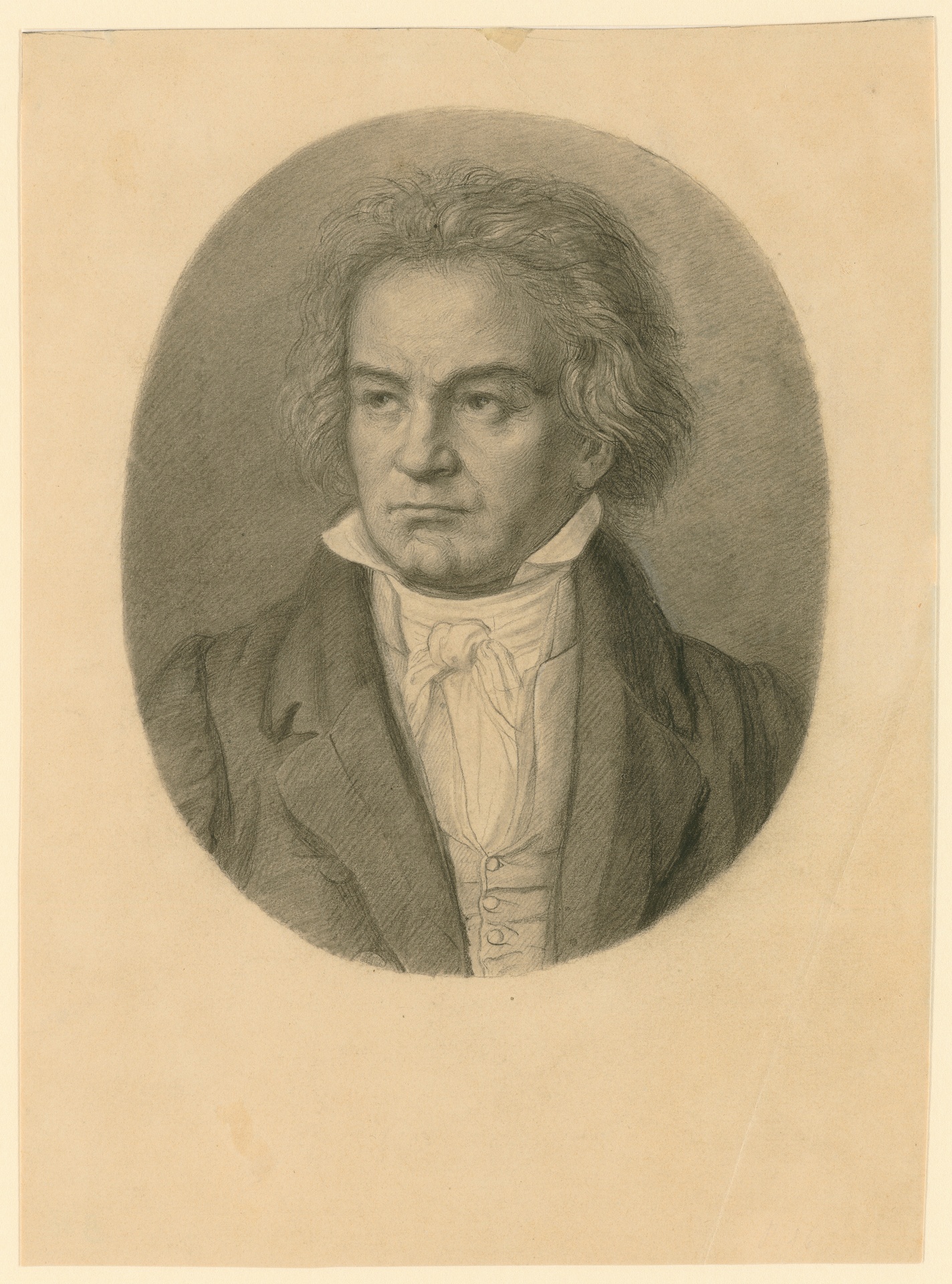 Anders als viele der sehr idealisierenden und pathetischen Darstellungen Beethovens vermittelt die Zeichnung, die August von Kloeber im Sommer 1818 in Mödling schuf, einen recht unmittelbaren und natürlichen Eindruck von Beethovens äußerer Erscheinung. Wie sich der Maler später erinnerte, empfand auch Beethoven selbst diese Studie als sehr lebensnah - insbesondere seine Frisur sei sehr gut getroffen.