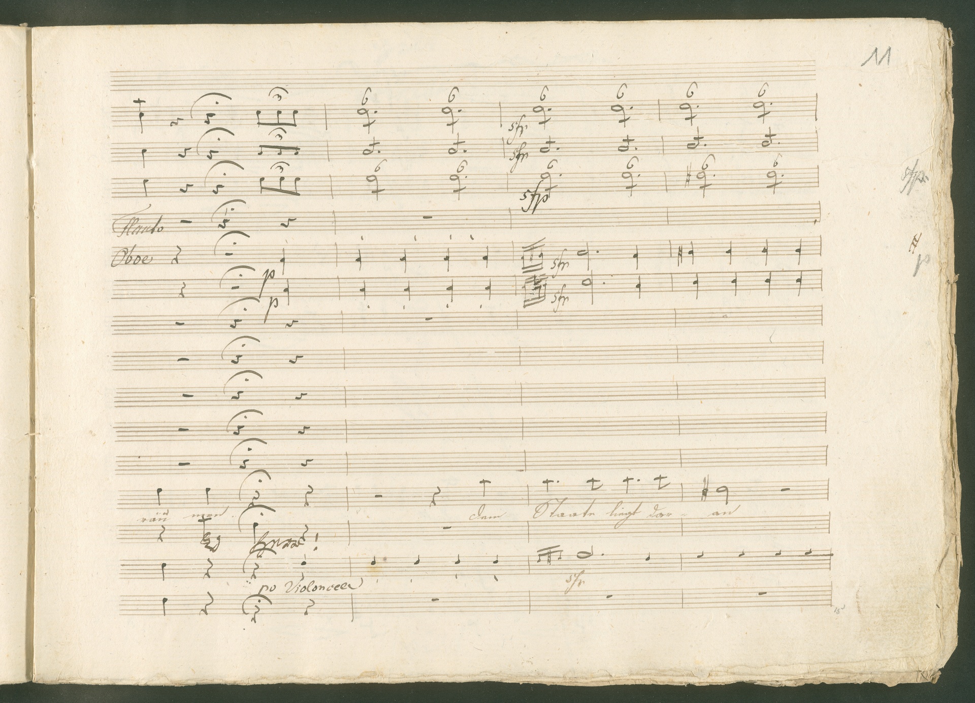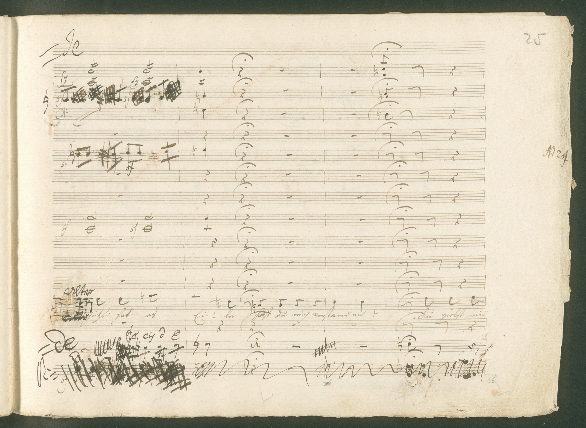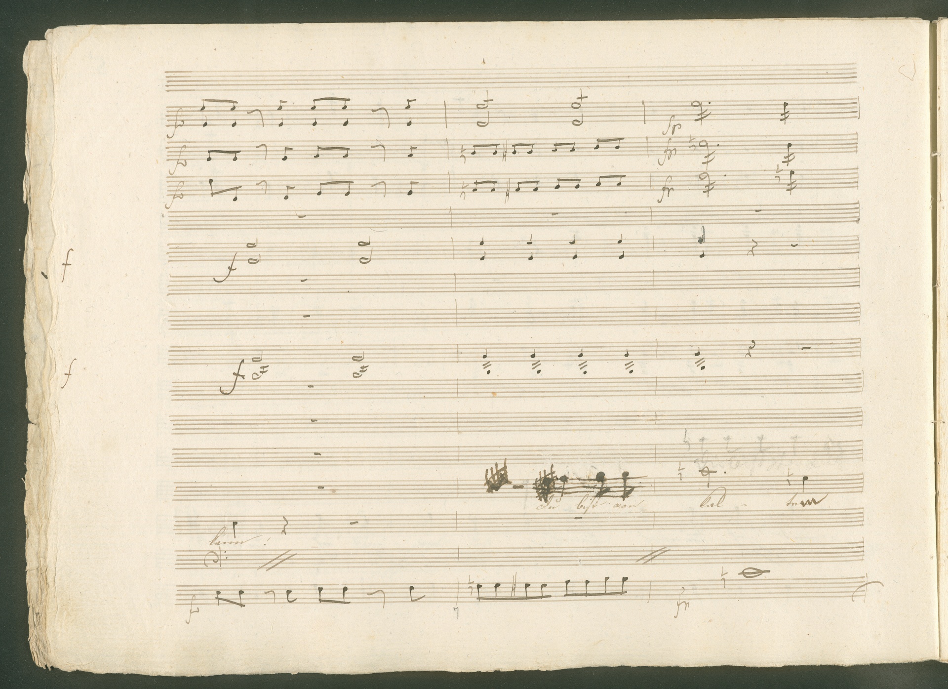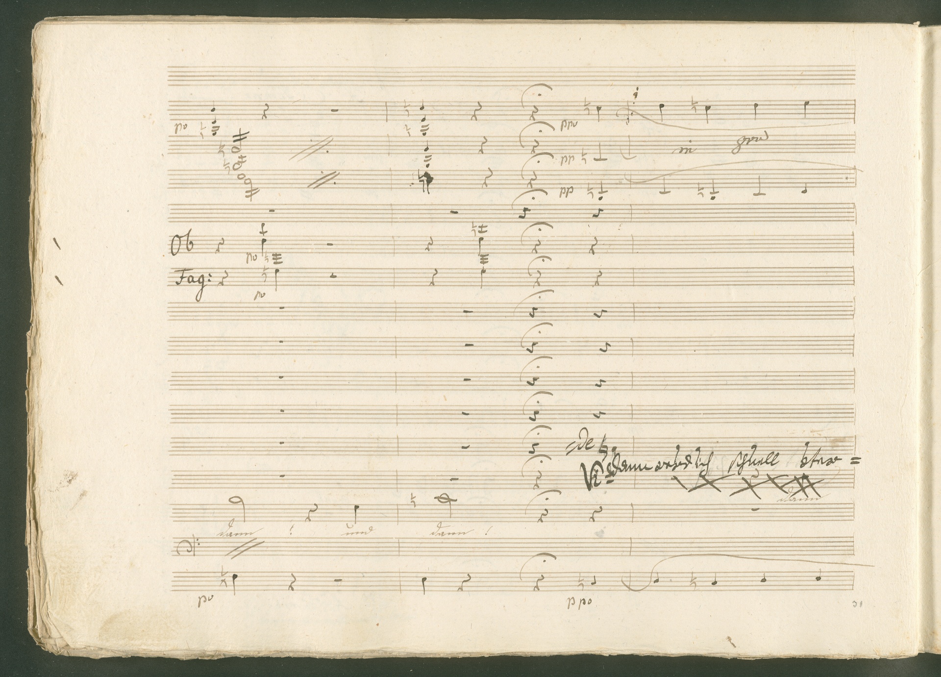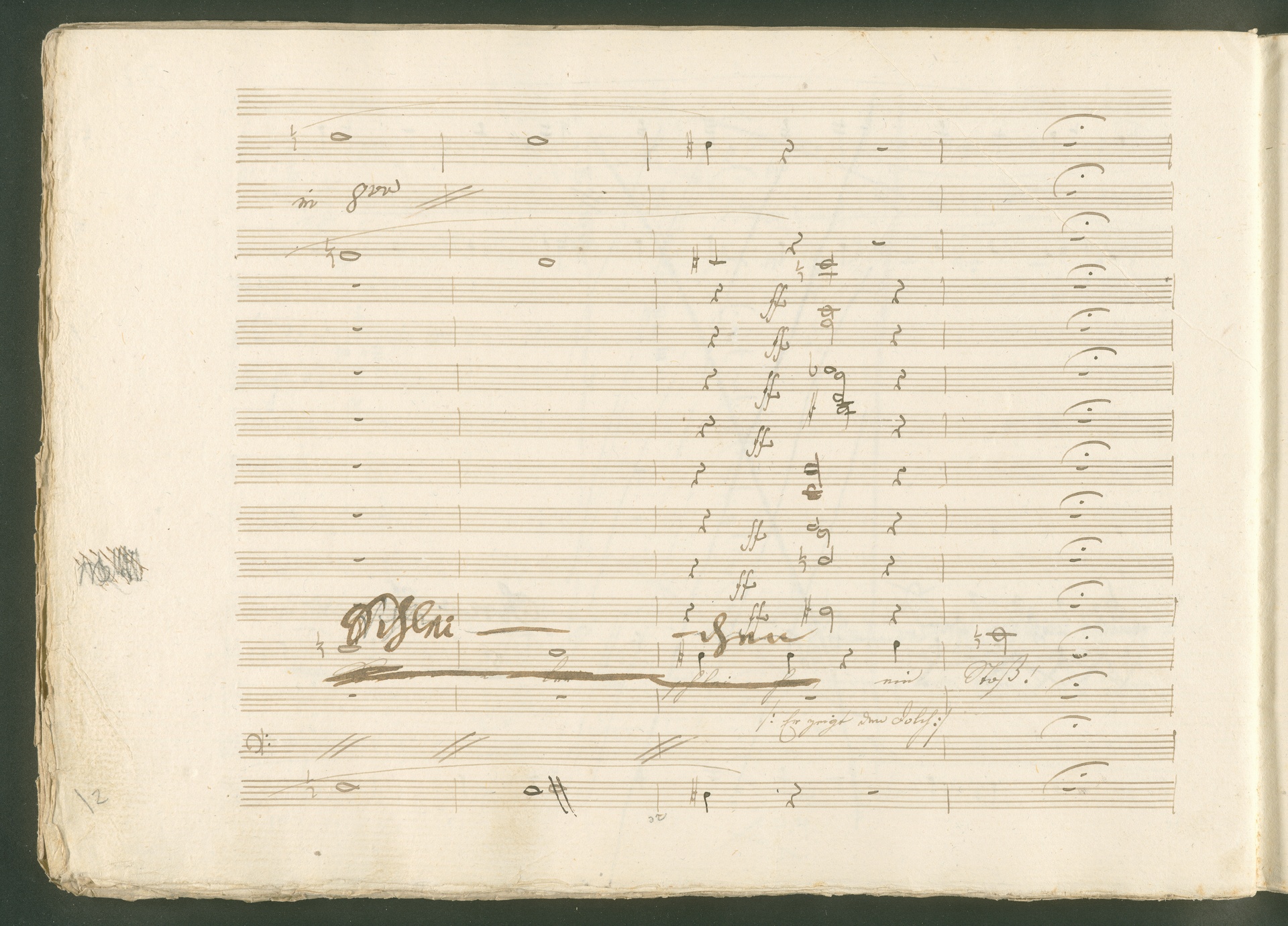 Abgebildet ist eine Kopistenabschrift des Duetts Pizarro/Rocco "Jetzt, Alter, jetzt hat es Eile" aus Beethovens einziger Oper Leonore bzw. Fidelio. Der Kopist schrieb das Duett in der Fassung von 1806, Beethoven korrigierte diese im Zuge der Umarbeitung der Oper 1814. Bei dieser letzten Revision straffte Beethoven den Ablauf durch gezielte Streichungen, die die Wirkung verstärkten und das Tempo der Handlung beschleunigten. Auch die vorliegende Abschrift trägt solche Eingriffe: auf etlichen Blättern kürzte Beethoven Takte oder ganze Phrasen. So gleich zu Beginn auf den beiden ersten Notentextseiten: Pizarro beginnt in der Fassung von 1806, wie sie der Kopist schrieb, mit dem Wortlaut: "Jetzt, Alter, Alter, jetzt hat es Eile!". Er singt quasi atemlos - es hat ja Eile - mit Pausen versetzt auf fünf Takte verteilt. Beethoven korrigiert dies, in dem er die zwei Takte "Alter, Alter" streicht bzw. ausradiert und die Phrase auf drei Takte zusammenzieht. Erst jetzt entsteht tatsächlich der Eindruck, Pizarro sei gehetzt - "Jetzt, Alter, jetzt hat es Eile." Nur ein kleines Detail und im Manuskript keine große Korrektur - aber welche dramaturgische Wirkung erzielt Beethoven damit! (J.R.)