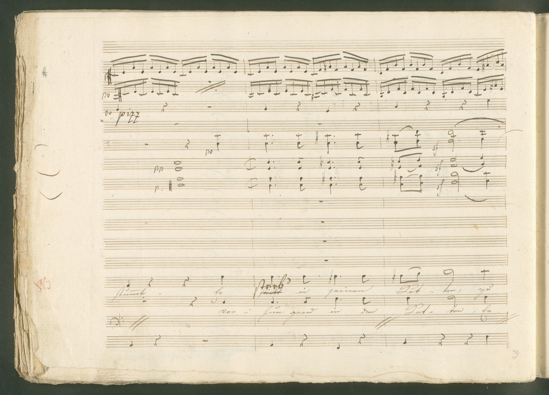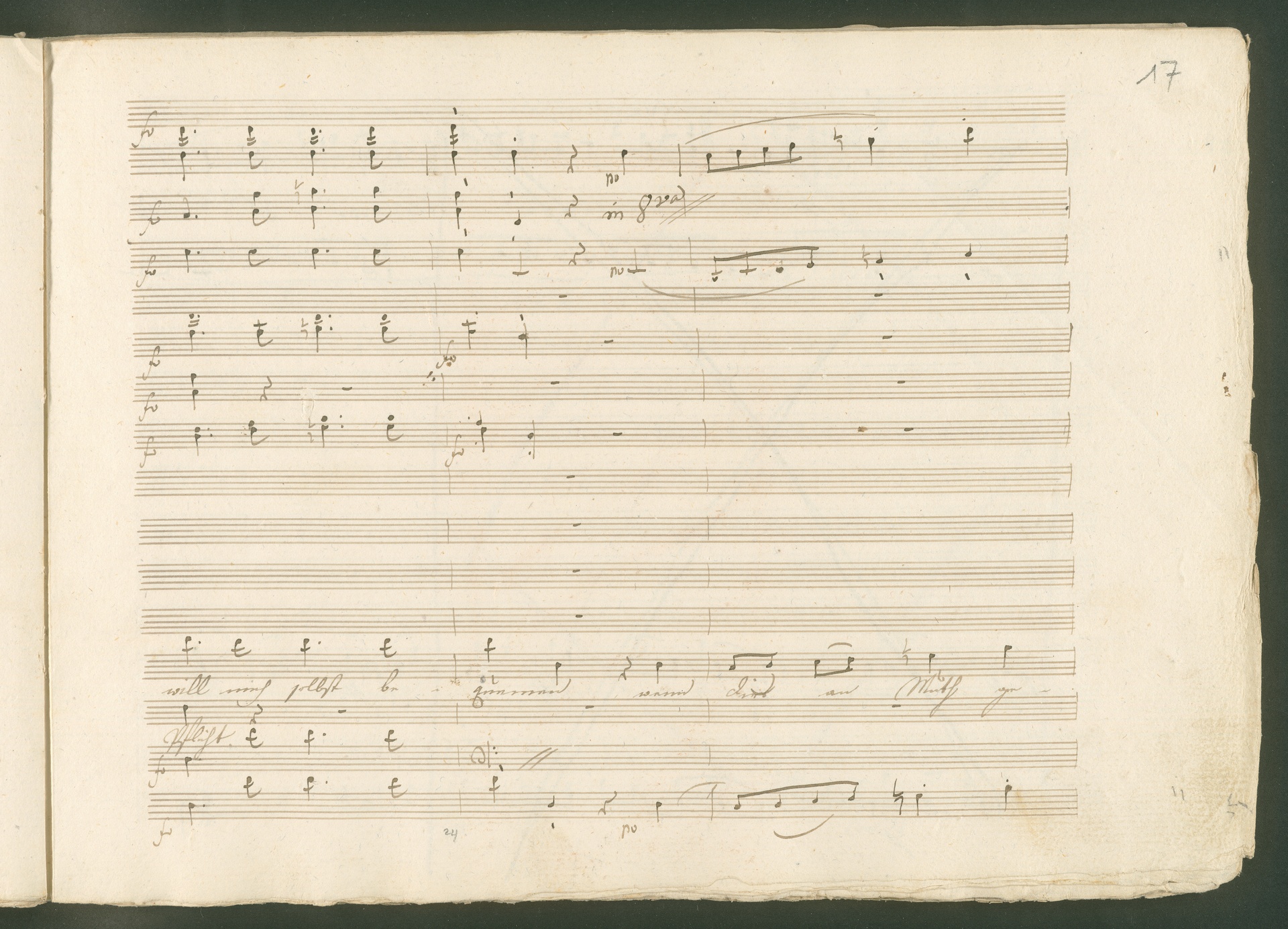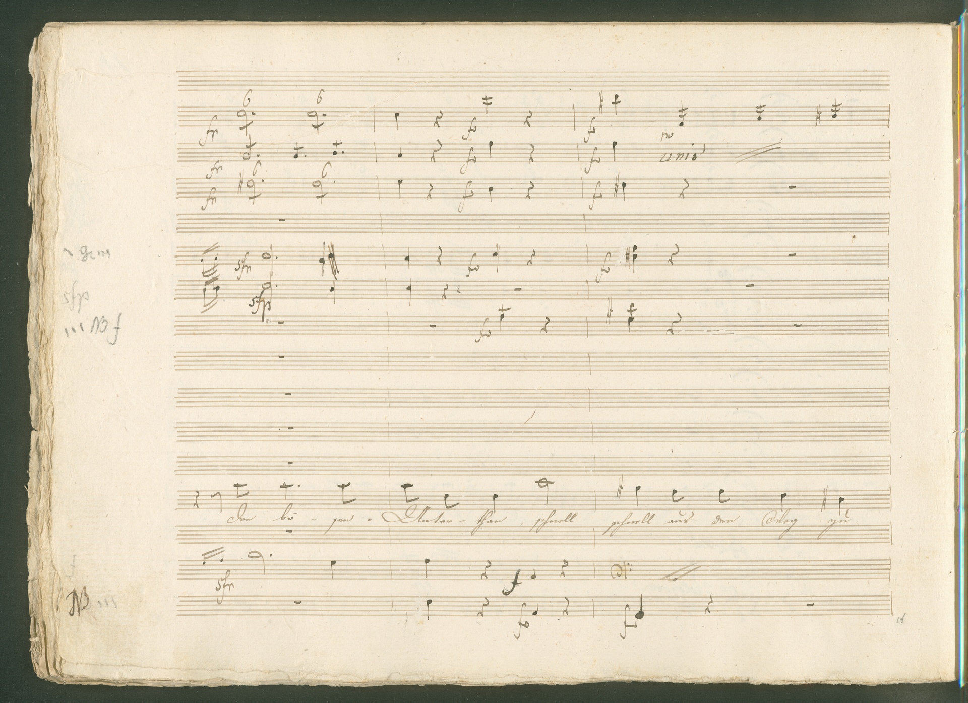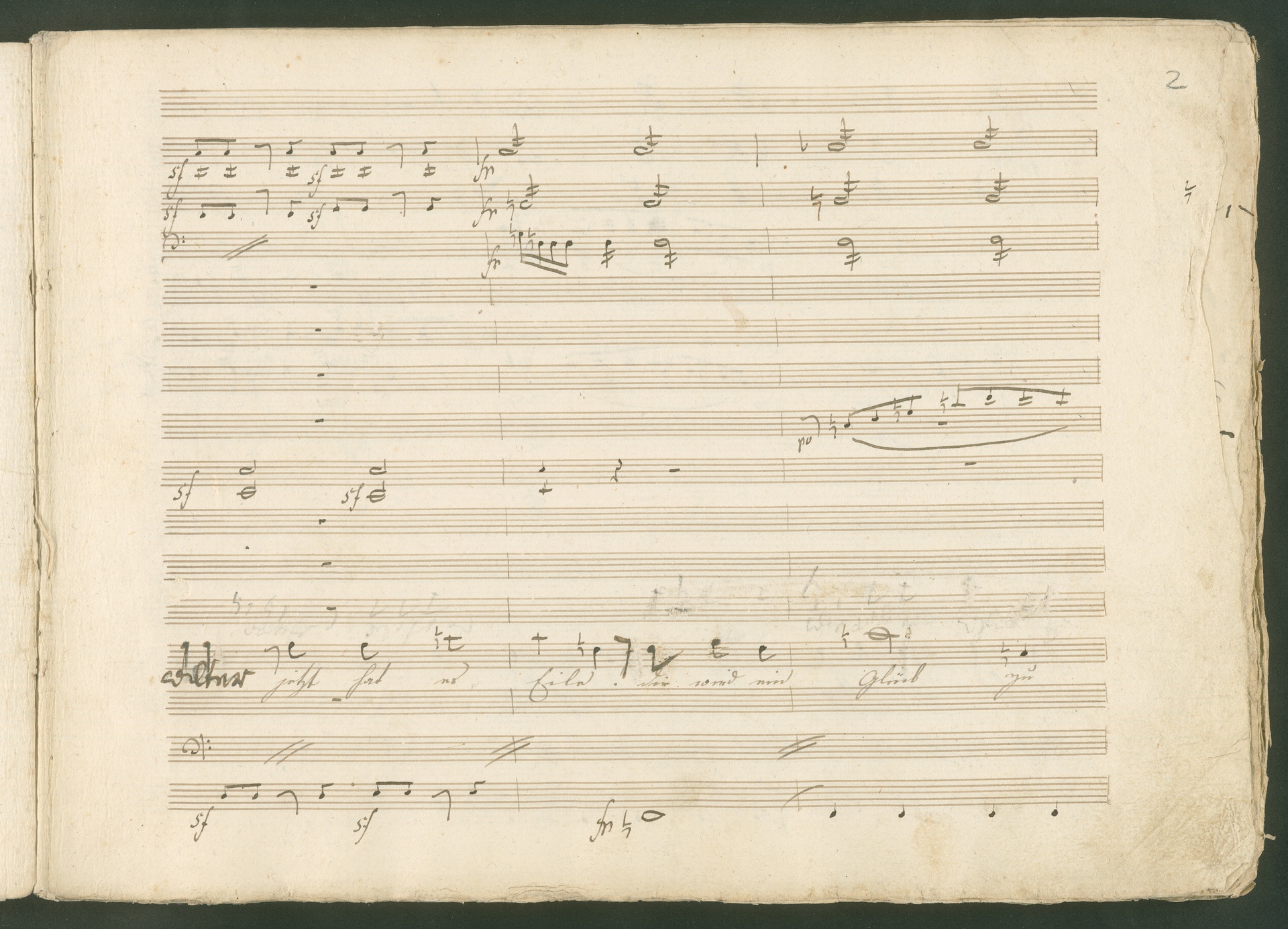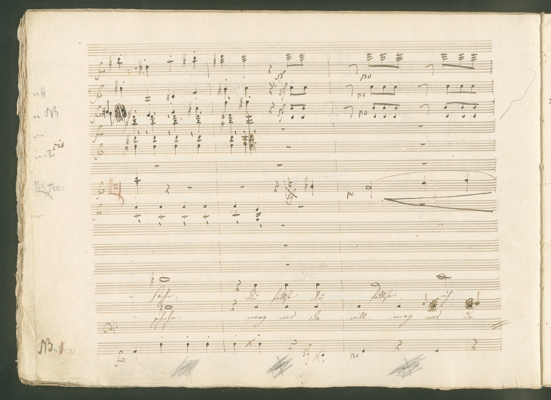Abgebildet ist eine Kopistenabschrift des Duetts Pizarro/Rocco "Jetzt, Alter, jetzt hat es Eile" aus Beethovens einziger Oper Leonore bzw. Fidelio. Der Kopist schrieb das Duett in der Fassung von 1806, Beethoven korrigierte diese im Zuge der Umarbeitung der Oper 1814. Bei dieser letzten Revision straffte Beethoven den Ablauf durch gezielte Streichungen, die die Wirkung verstärkten und das Tempo der Handlung beschleunigten. Auch die vorliegende Abschrift trägt solche Eingriffe: auf etlichen Blättern kürzte Beethoven Takte oder ganze Phrasen. So gleich zu Beginn auf den beiden ersten Notentextseiten: Pizarro beginnt in der Fassung von 1806, wie sie der Kopist schrieb, mit dem Wortlaut: "Jetzt, Alter, Alter, jetzt hat es Eile!". Er singt quasi atemlos - es hat ja Eile - mit Pausen versetzt auf fünf Takte verteilt. Beethoven korrigiert dies, in dem er die zwei Takte "Alter, Alter" streicht bzw. ausradiert und die Phrase auf drei Takte zusammenzieht. Erst jetzt entsteht tatsächlich der Eindruck, Pizarro sei gehetzt - "Jetzt, Alter, jetzt hat es Eile." Nur ein kleines Detail und im Manuskript keine große Korrektur - aber welche dramaturgische Wirkung erzielt Beethoven damit! (J.R.)