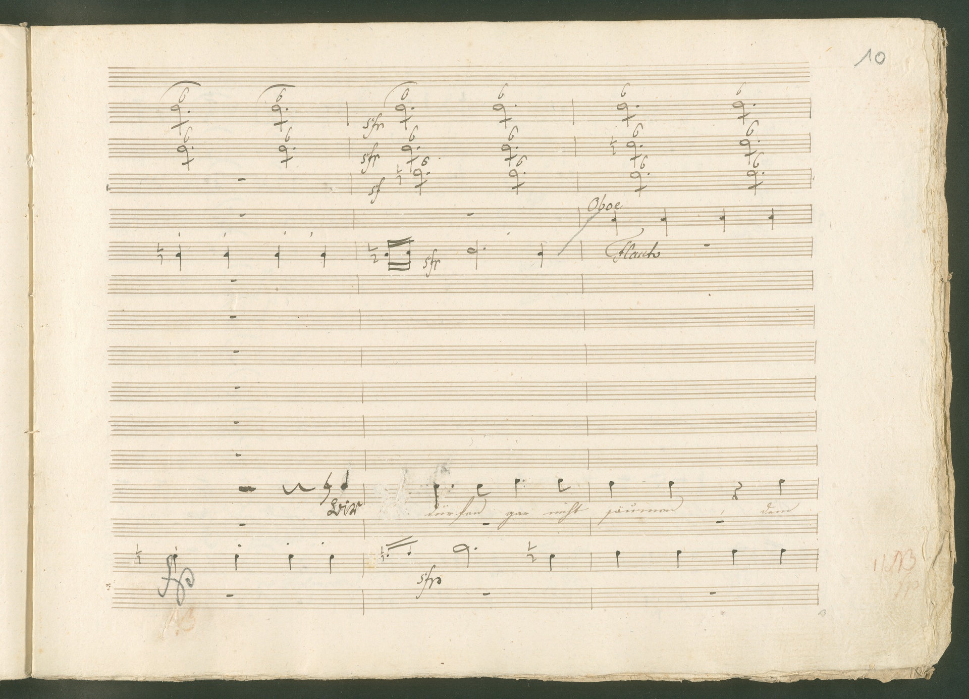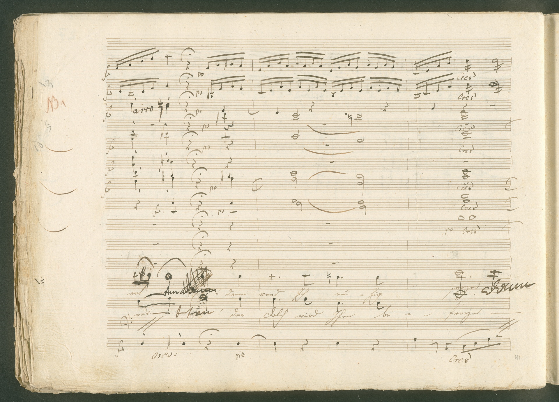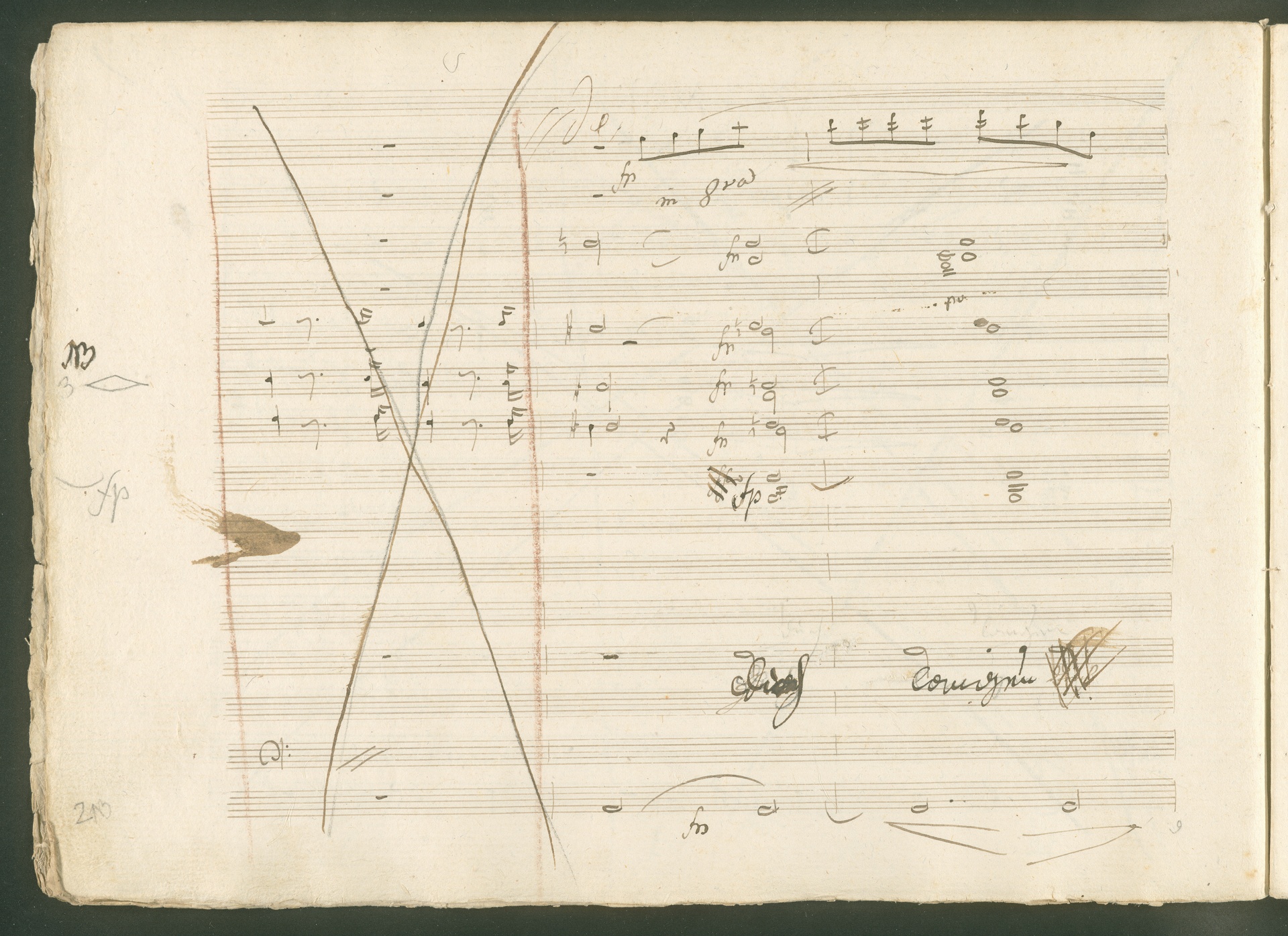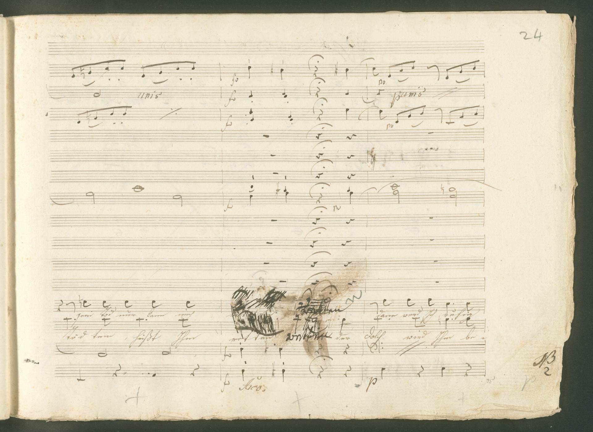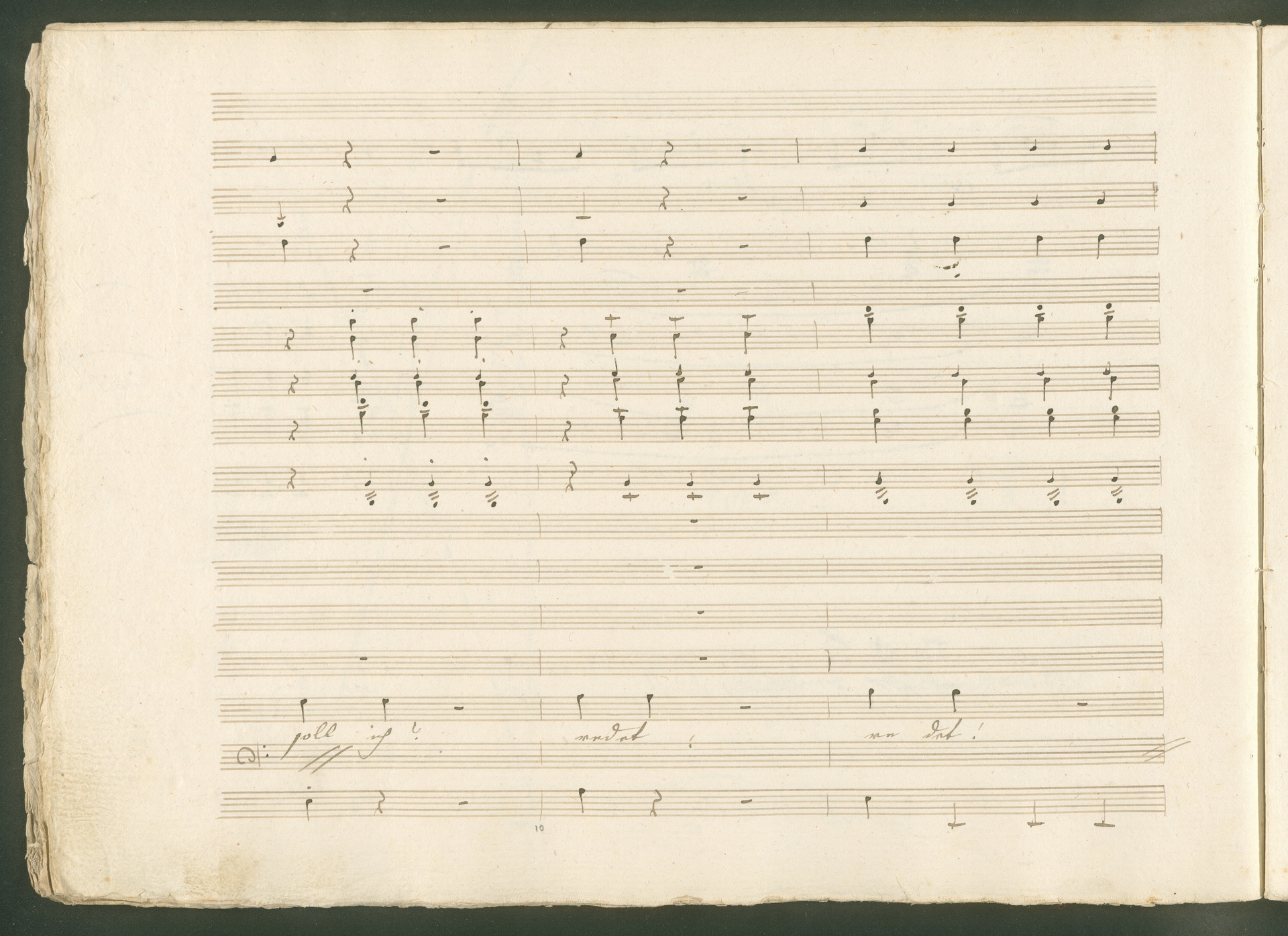 Abgebildet ist eine Kopistenabschrift des Duetts Pizarro/Rocco "Jetzt, Alter, jetzt hat es Eile" aus Beethovens einziger Oper Leonore bzw. Fidelio. Der Kopist schrieb das Duett in der Fassung von 1806, Beethoven korrigierte diese im Zuge der Umarbeitung der Oper 1814. Bei dieser letzten Revision straffte Beethoven den Ablauf durch gezielte Streichungen, die die Wirkung verstärkten und das Tempo der Handlung beschleunigten. Auch die vorliegende Abschrift trägt solche Eingriffe: auf etlichen Blättern kürzte Beethoven Takte oder ganze Phrasen. So gleich zu Beginn auf den beiden ersten Notentextseiten: Pizarro beginnt in der Fassung von 1806, wie sie der Kopist schrieb, mit dem Wortlaut: "Jetzt, Alter, Alter, jetzt hat es Eile!". Er singt quasi atemlos - es hat ja Eile - mit Pausen versetzt auf fünf Takte verteilt. Beethoven korrigiert dies, in dem er die zwei Takte "Alter, Alter" streicht bzw. ausradiert und die Phrase auf drei Takte zusammenzieht. Erst jetzt entsteht tatsächlich der Eindruck, Pizarro sei gehetzt - "Jetzt, Alter, jetzt hat es Eile." Nur ein kleines Detail und im Manuskript keine große Korrektur - aber welche dramaturgische Wirkung erzielt Beethoven damit! (J.R.)