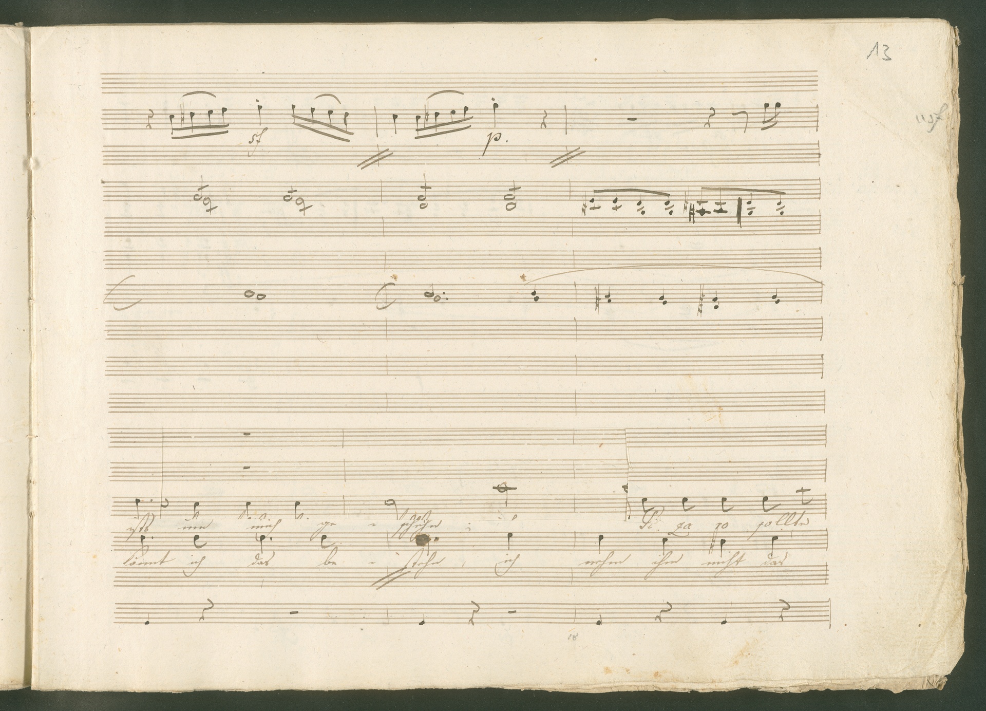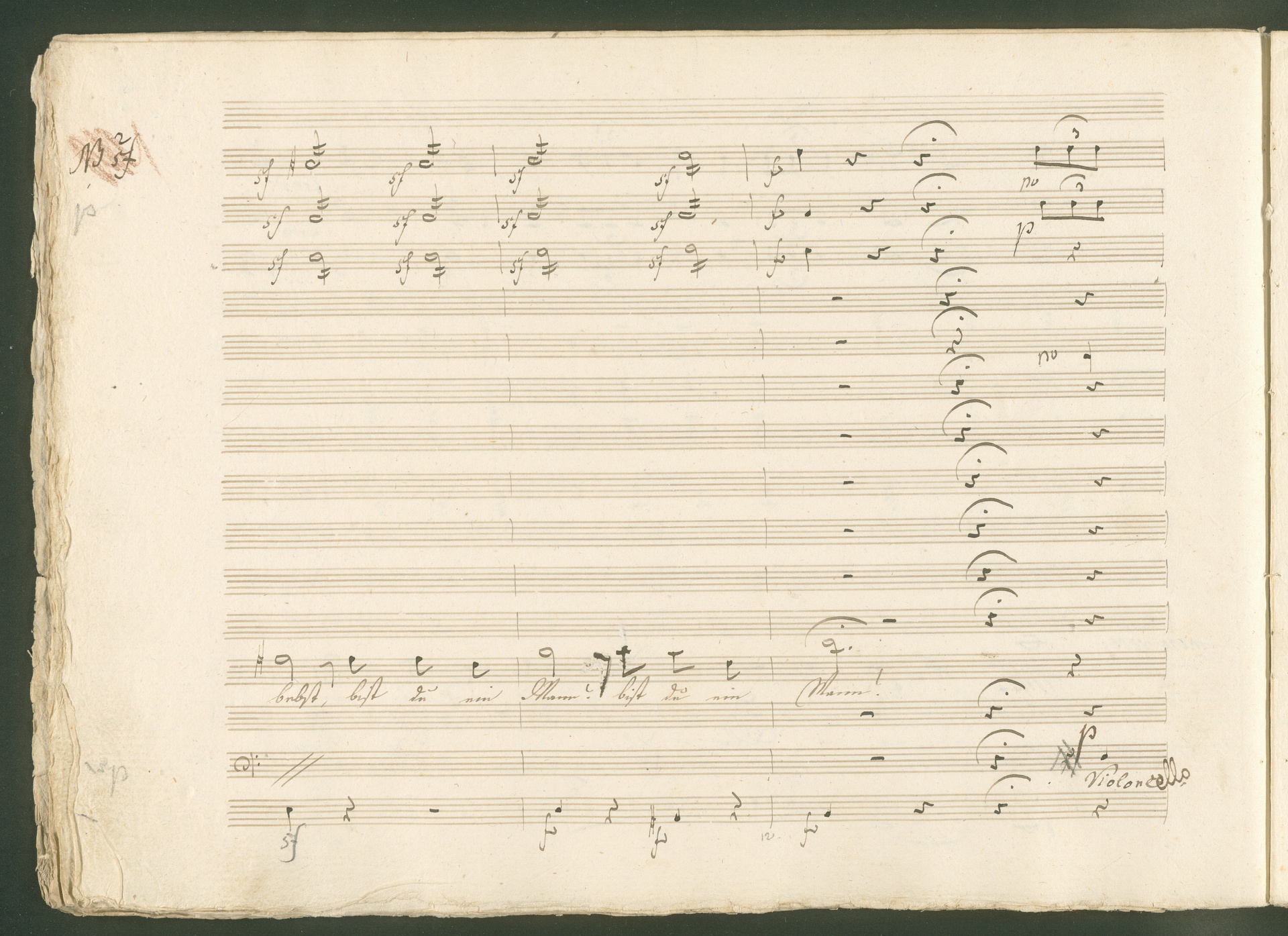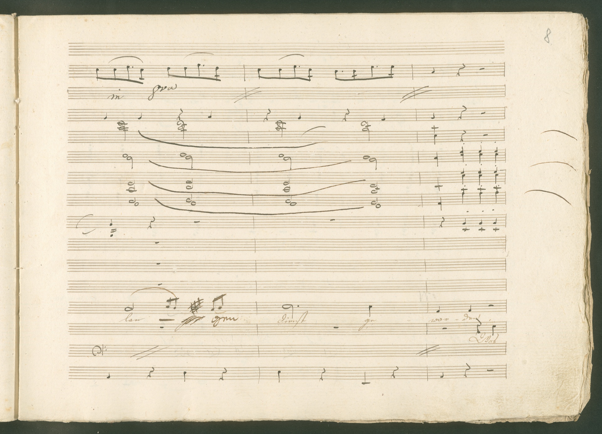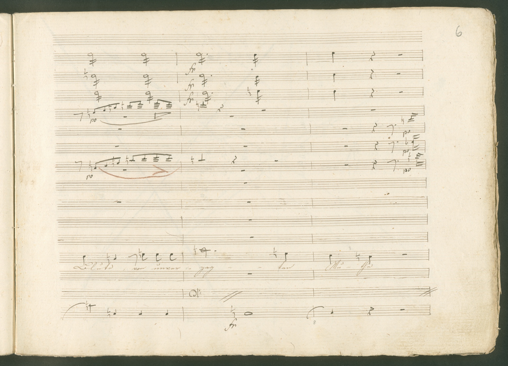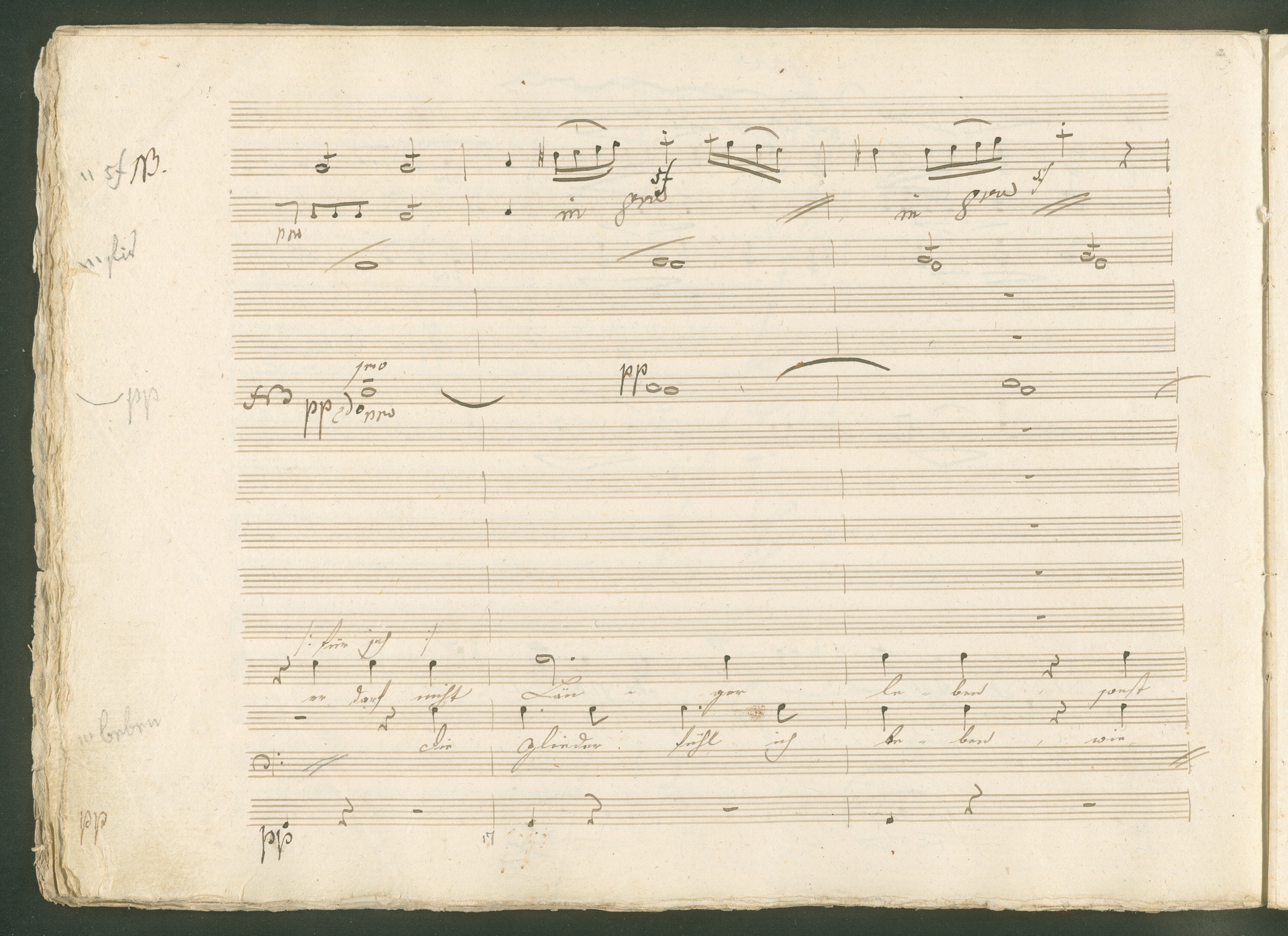 Abgebildet ist eine Kopistenabschrift des Duetts Pizarro/Rocco "Jetzt, Alter, jetzt hat es Eile" aus Beethovens einziger Oper Leonore bzw. Fidelio. Der Kopist schrieb das Duett in der Fassung von 1806, Beethoven korrigierte diese im Zuge der Umarbeitung der Oper 1814. Bei dieser letzten Revision straffte Beethoven den Ablauf durch gezielte Streichungen, die die Wirkung verstärkten und das Tempo der Handlung beschleunigten. Auch die vorliegende Abschrift trägt solche Eingriffe: auf etlichen Blättern kürzte Beethoven Takte oder ganze Phrasen. So gleich zu Beginn auf den beiden ersten Notentextseiten: Pizarro beginnt in der Fassung von 1806, wie sie der Kopist schrieb, mit dem Wortlaut: "Jetzt, Alter, Alter, jetzt hat es Eile!". Er singt quasi atemlos - es hat ja Eile - mit Pausen versetzt auf fünf Takte verteilt. Beethoven korrigiert dies, in dem er die zwei Takte "Alter, Alter" streicht bzw. ausradiert und die Phrase auf drei Takte zusammenzieht. Erst jetzt entsteht tatsächlich der Eindruck, Pizarro sei gehetzt - "Jetzt, Alter, jetzt hat es Eile." Nur ein kleines Detail und im Manuskript keine große Korrektur - aber welche dramaturgische Wirkung erzielt Beethoven damit! (J.R.)