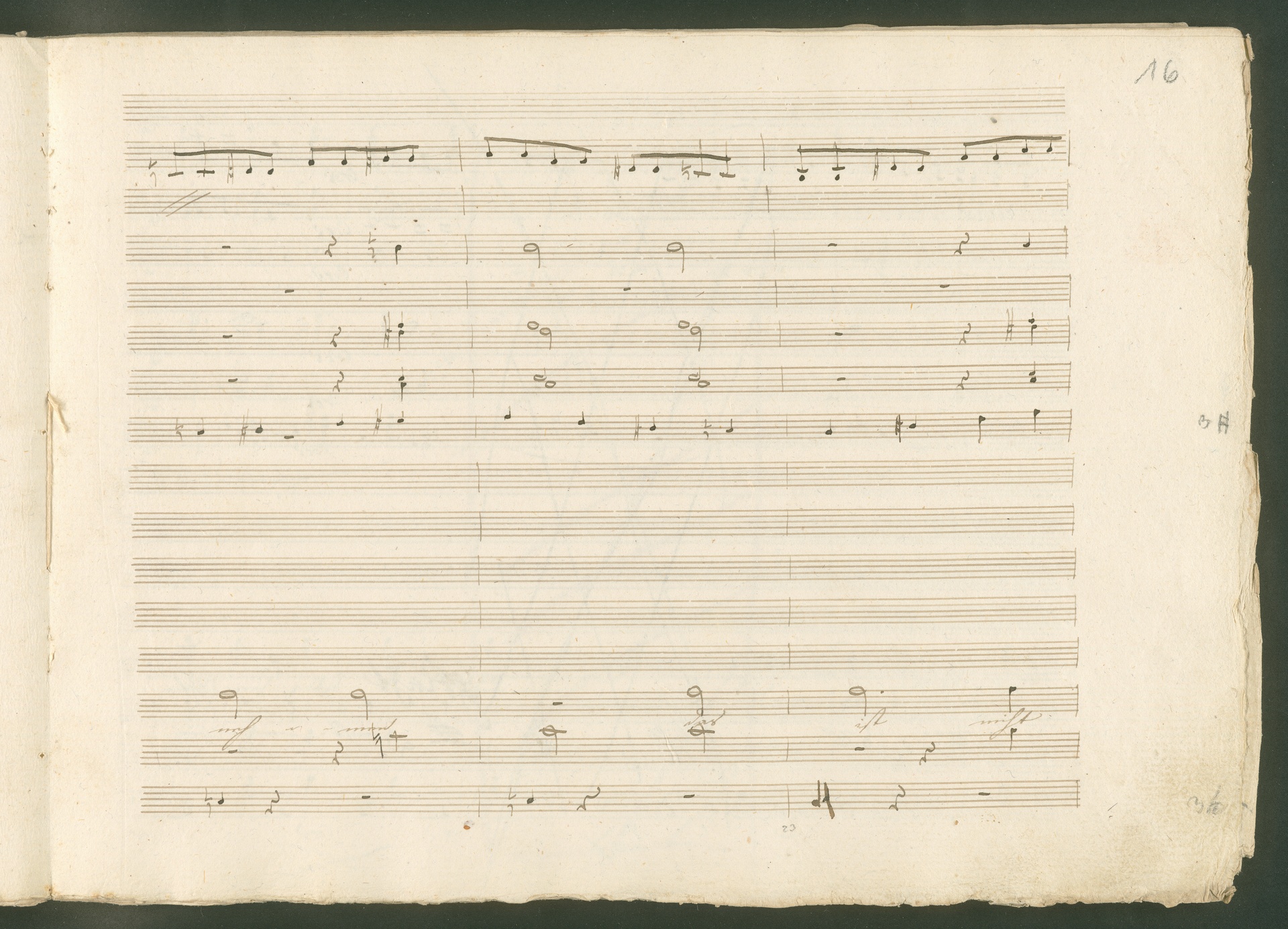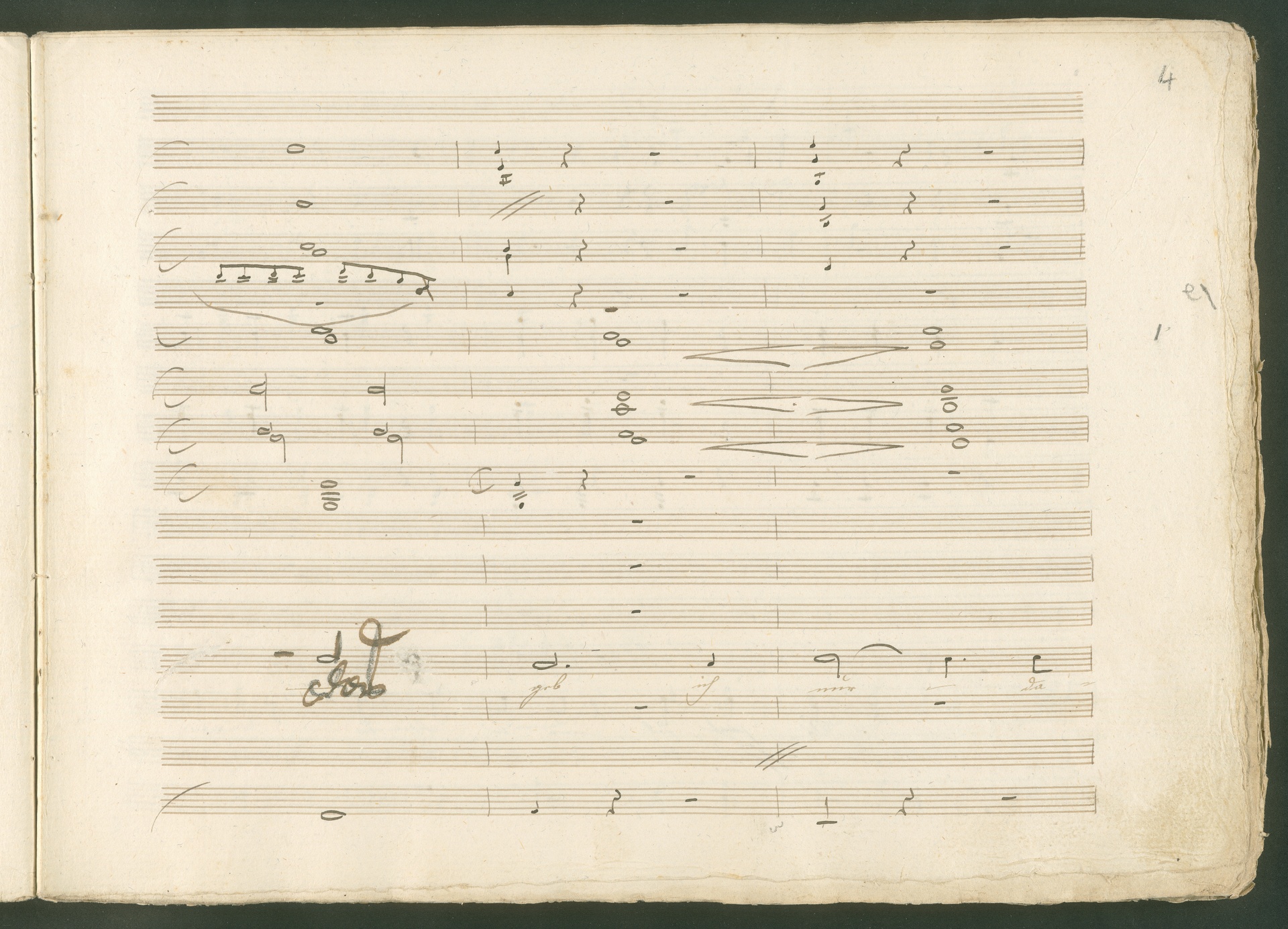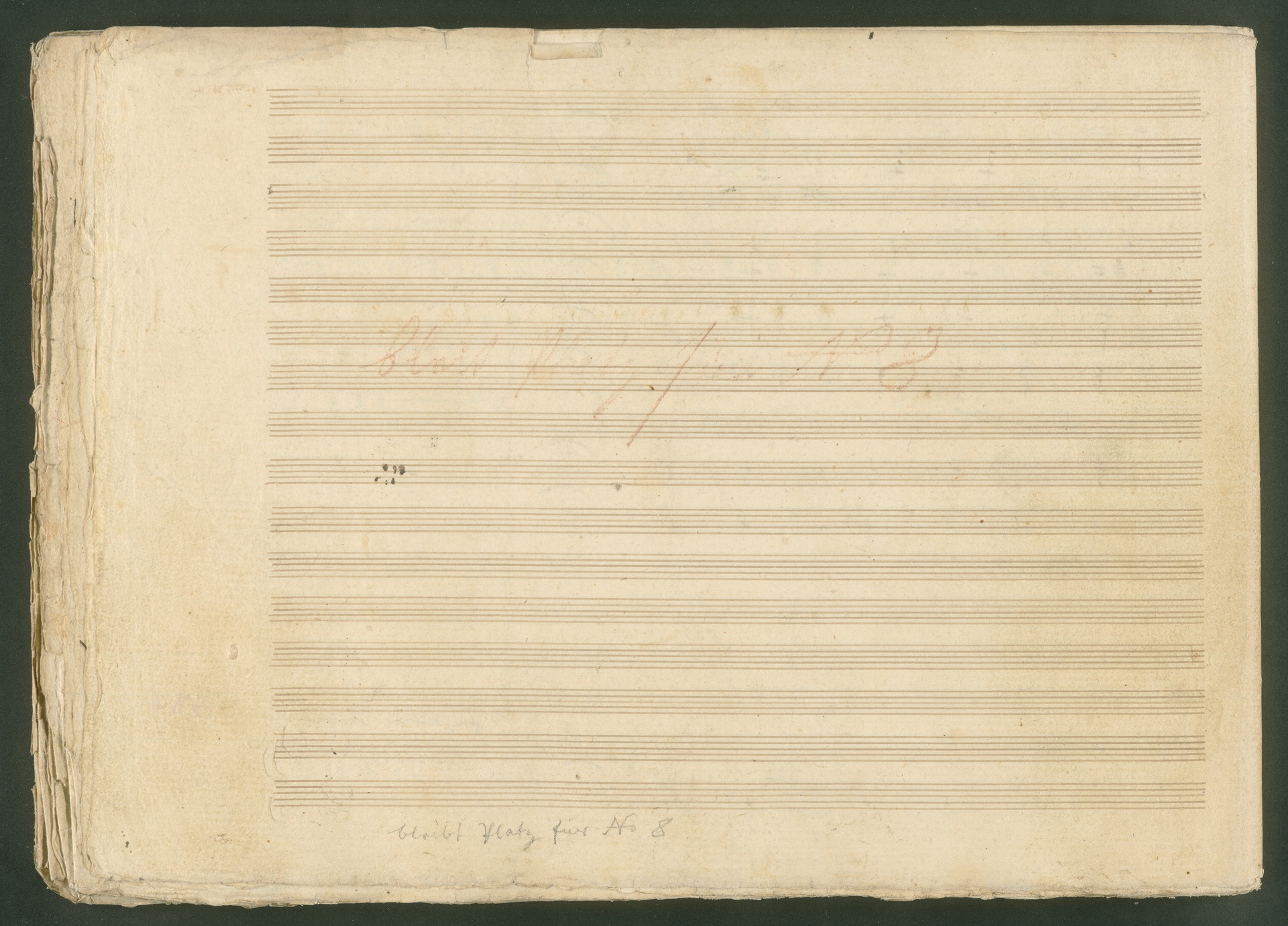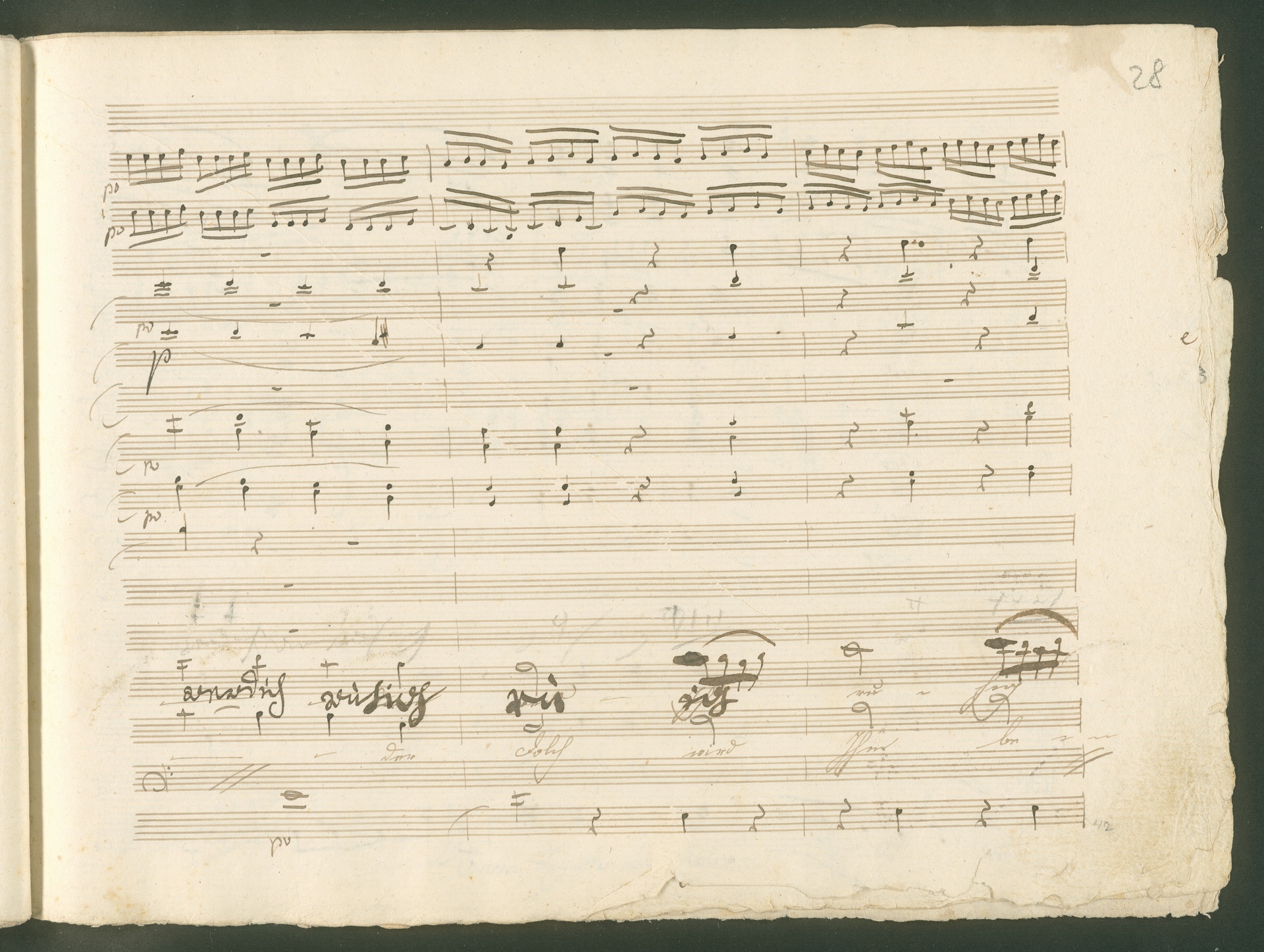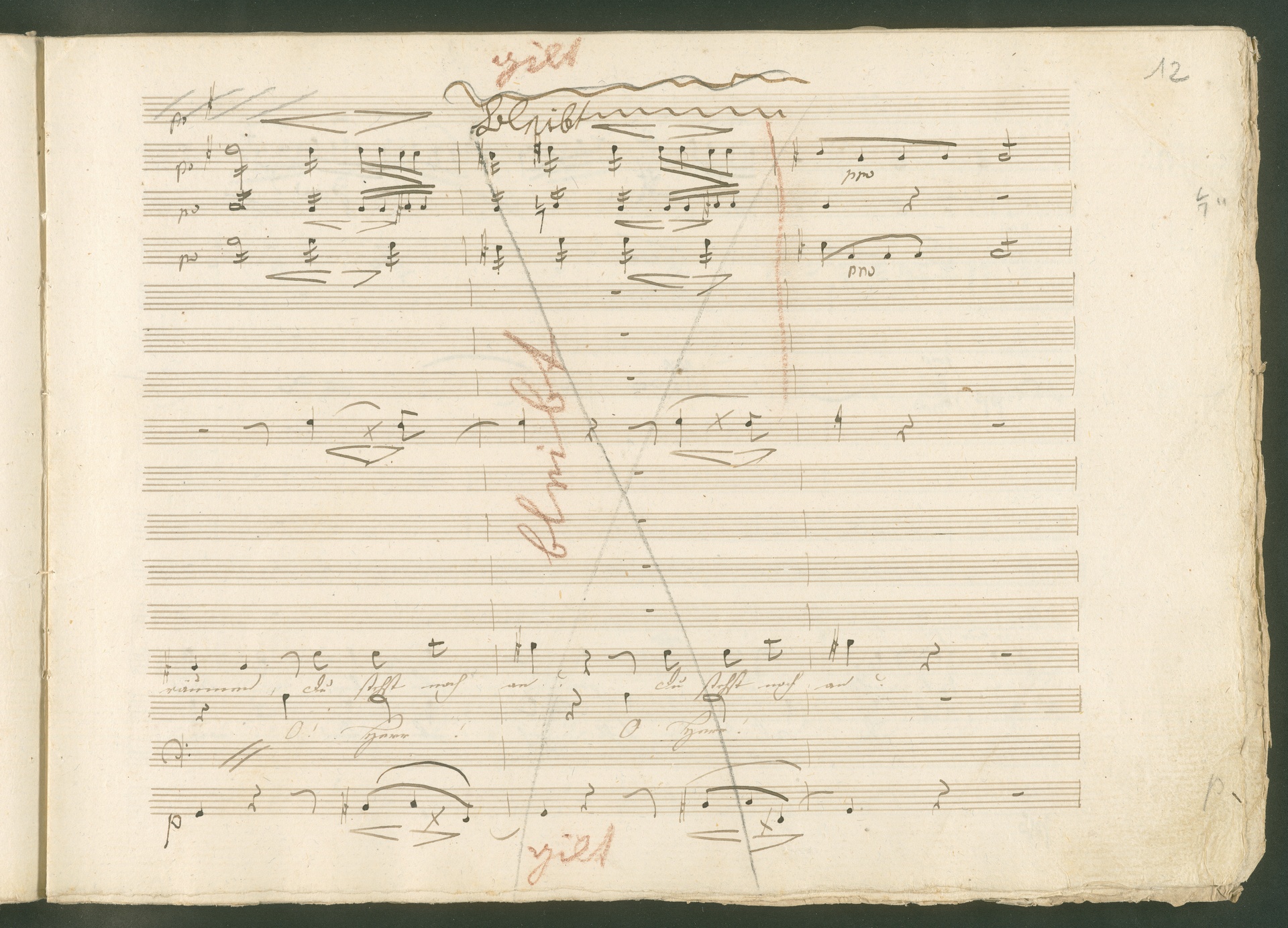 Abgebildet ist eine Kopistenabschrift des Duetts Pizarro/Rocco "Jetzt, Alter, jetzt hat es Eile" aus Beethovens einziger Oper Leonore bzw. Fidelio. Der Kopist schrieb das Duett in der Fassung von 1806, Beethoven korrigierte diese im Zuge der Umarbeitung der Oper 1814. Bei dieser letzten Revision straffte Beethoven den Ablauf durch gezielte Streichungen, die die Wirkung verstärkten und das Tempo der Handlung beschleunigten. Auch die vorliegende Abschrift trägt solche Eingriffe: auf etlichen Blättern kürzte Beethoven Takte oder ganze Phrasen. So gleich zu Beginn auf den beiden ersten Notentextseiten: Pizarro beginnt in der Fassung von 1806, wie sie der Kopist schrieb, mit dem Wortlaut: "Jetzt, Alter, Alter, jetzt hat es Eile!". Er singt quasi atemlos - es hat ja Eile - mit Pausen versetzt auf fünf Takte verteilt. Beethoven korrigiert dies, in dem er die zwei Takte "Alter, Alter" streicht bzw. ausradiert und die Phrase auf drei Takte zusammenzieht. Erst jetzt entsteht tatsächlich der Eindruck, Pizarro sei gehetzt - "Jetzt, Alter, jetzt hat es Eile." Nur ein kleines Detail und im Manuskript keine große Korrektur - aber welche dramaturgische Wirkung erzielt Beethoven damit! (J.R.)