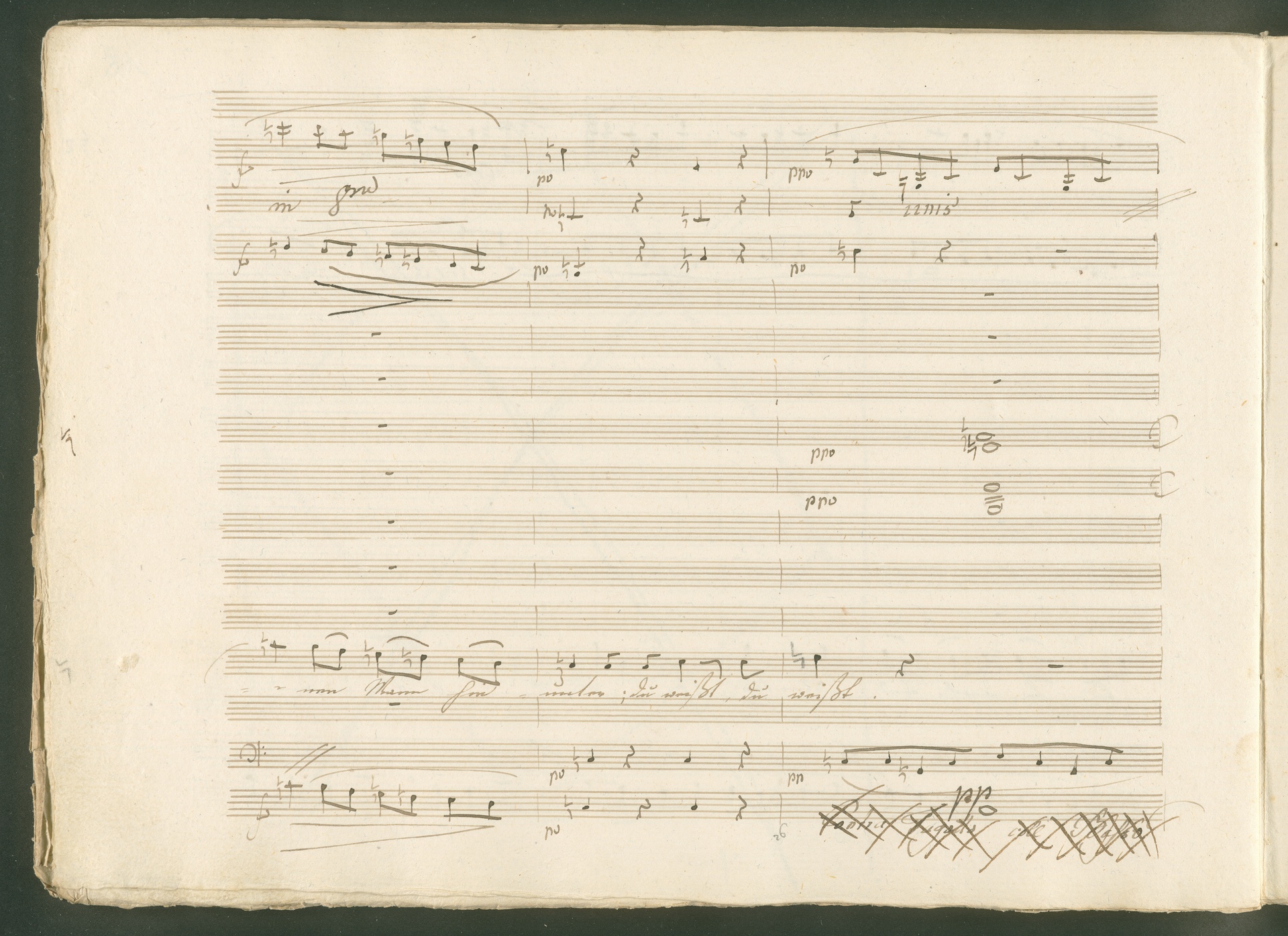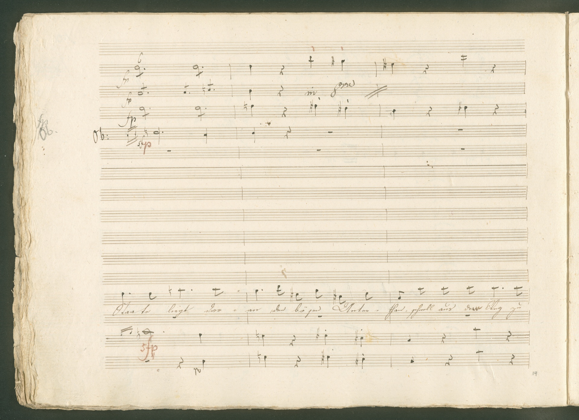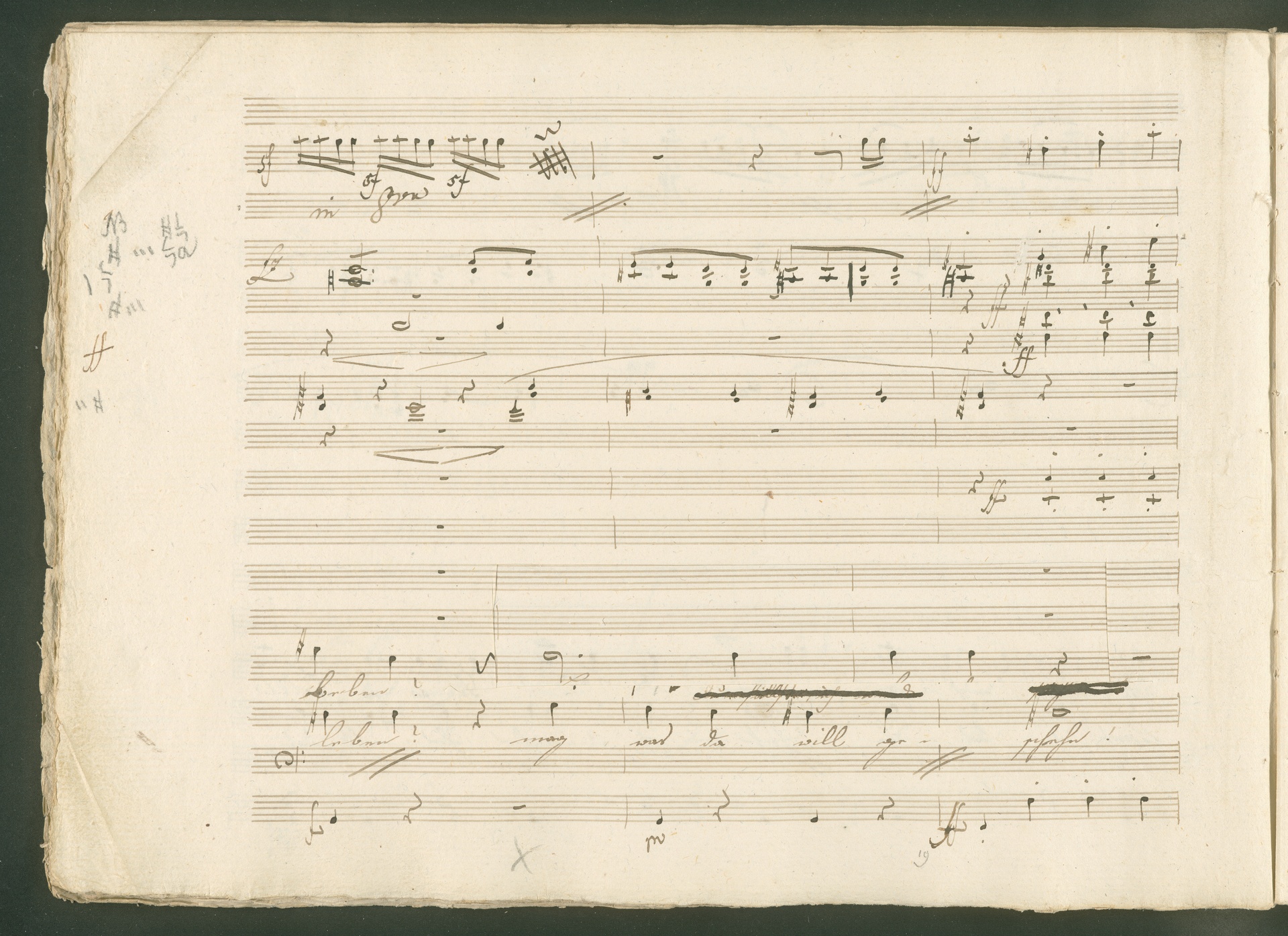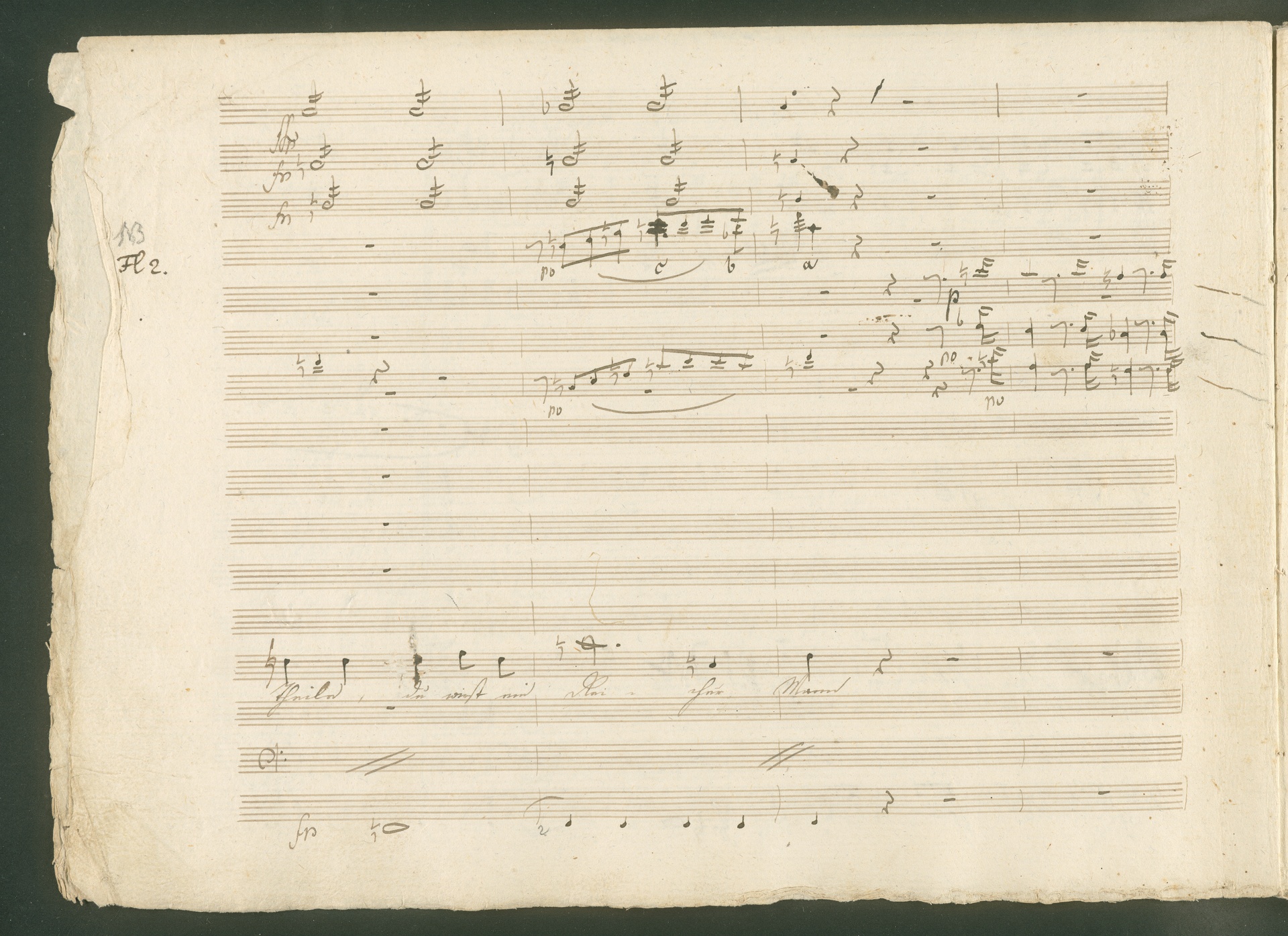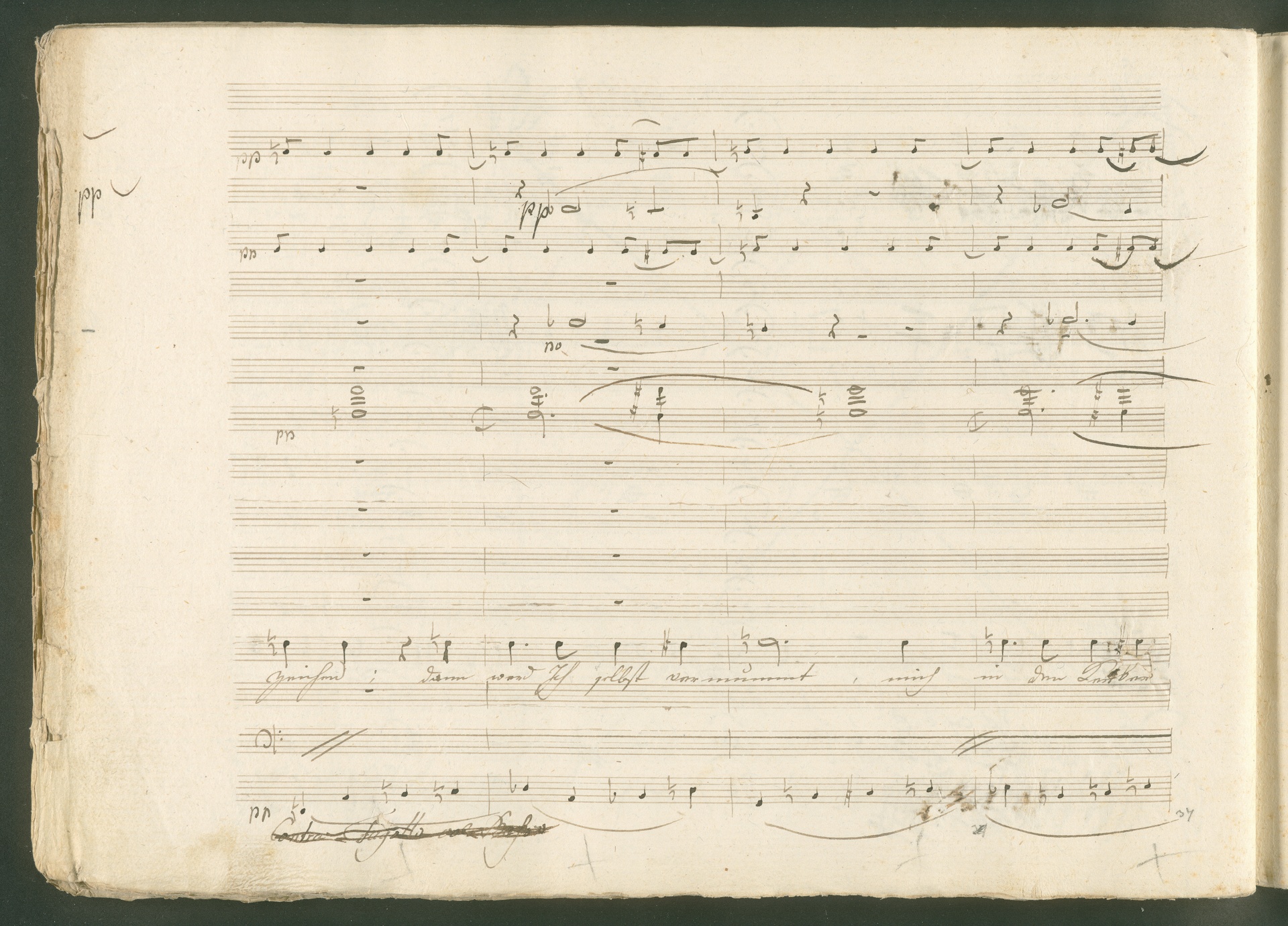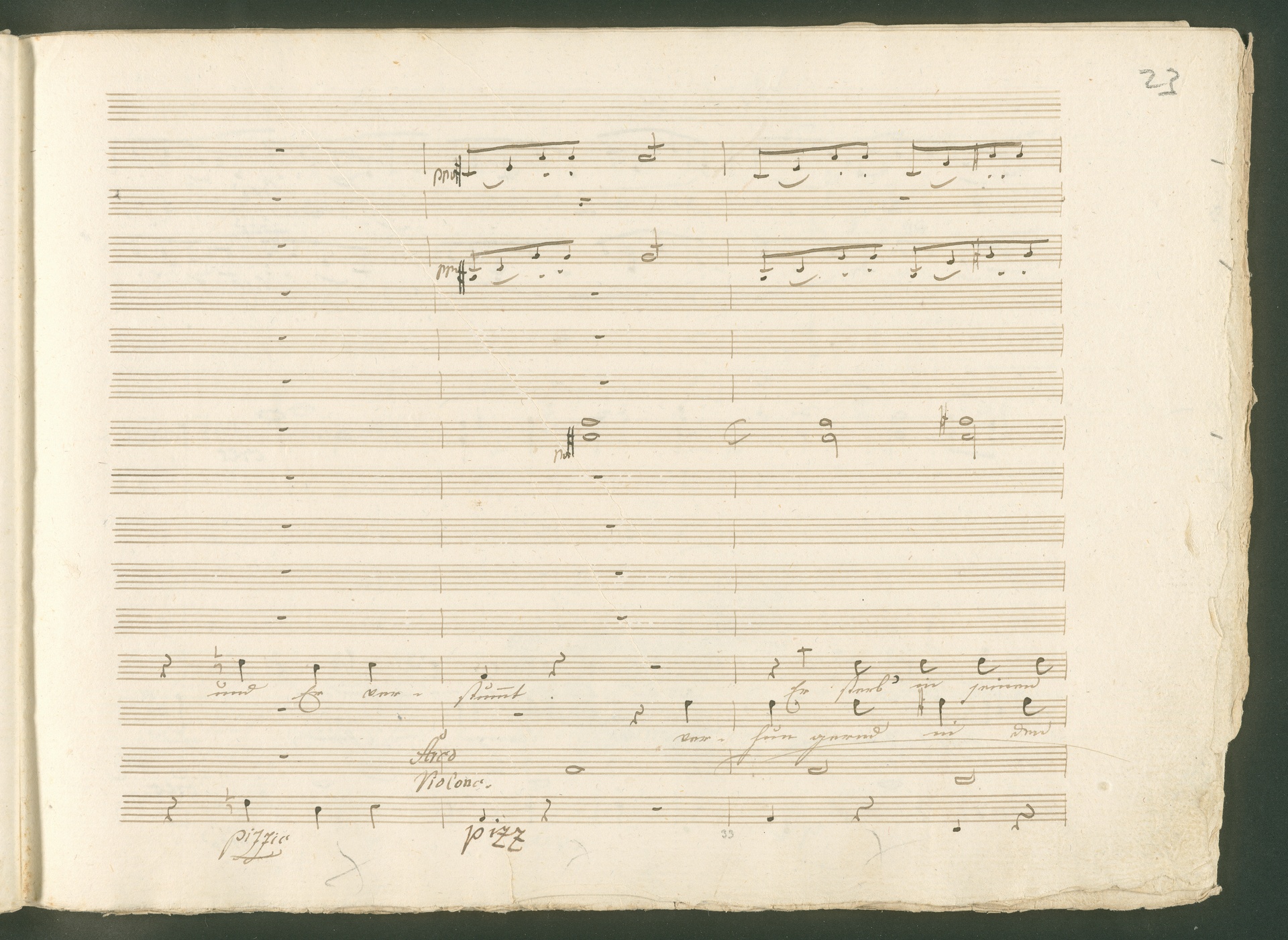 Abgebildet ist eine Kopistenabschrift des Duetts Pizarro/Rocco "Jetzt, Alter, jetzt hat es Eile" aus Beethovens einziger Oper Leonore bzw. Fidelio. Der Kopist schrieb das Duett in der Fassung von 1806, Beethoven korrigierte diese im Zuge der Umarbeitung der Oper 1814. Bei dieser letzten Revision straffte Beethoven den Ablauf durch gezielte Streichungen, die die Wirkung verstärkten und das Tempo der Handlung beschleunigten. Auch die vorliegende Abschrift trägt solche Eingriffe: auf etlichen Blättern kürzte Beethoven Takte oder ganze Phrasen. So gleich zu Beginn auf den beiden ersten Notentextseiten: Pizarro beginnt in der Fassung von 1806, wie sie der Kopist schrieb, mit dem Wortlaut: "Jetzt, Alter, Alter, jetzt hat es Eile!". Er singt quasi atemlos - es hat ja Eile - mit Pausen versetzt auf fünf Takte verteilt. Beethoven korrigiert dies, in dem er die zwei Takte "Alter, Alter" streicht bzw. ausradiert und die Phrase auf drei Takte zusammenzieht. Erst jetzt entsteht tatsächlich der Eindruck, Pizarro sei gehetzt - "Jetzt, Alter, jetzt hat es Eile." Nur ein kleines Detail und im Manuskript keine große Korrektur - aber welche dramaturgische Wirkung erzielt Beethoven damit! (J.R.)