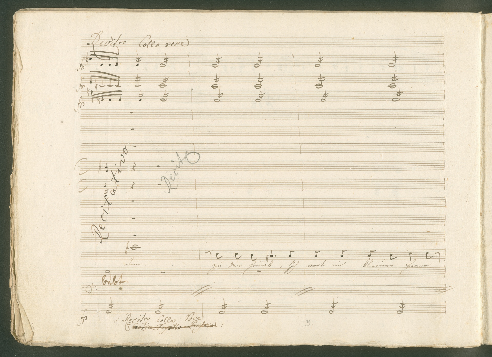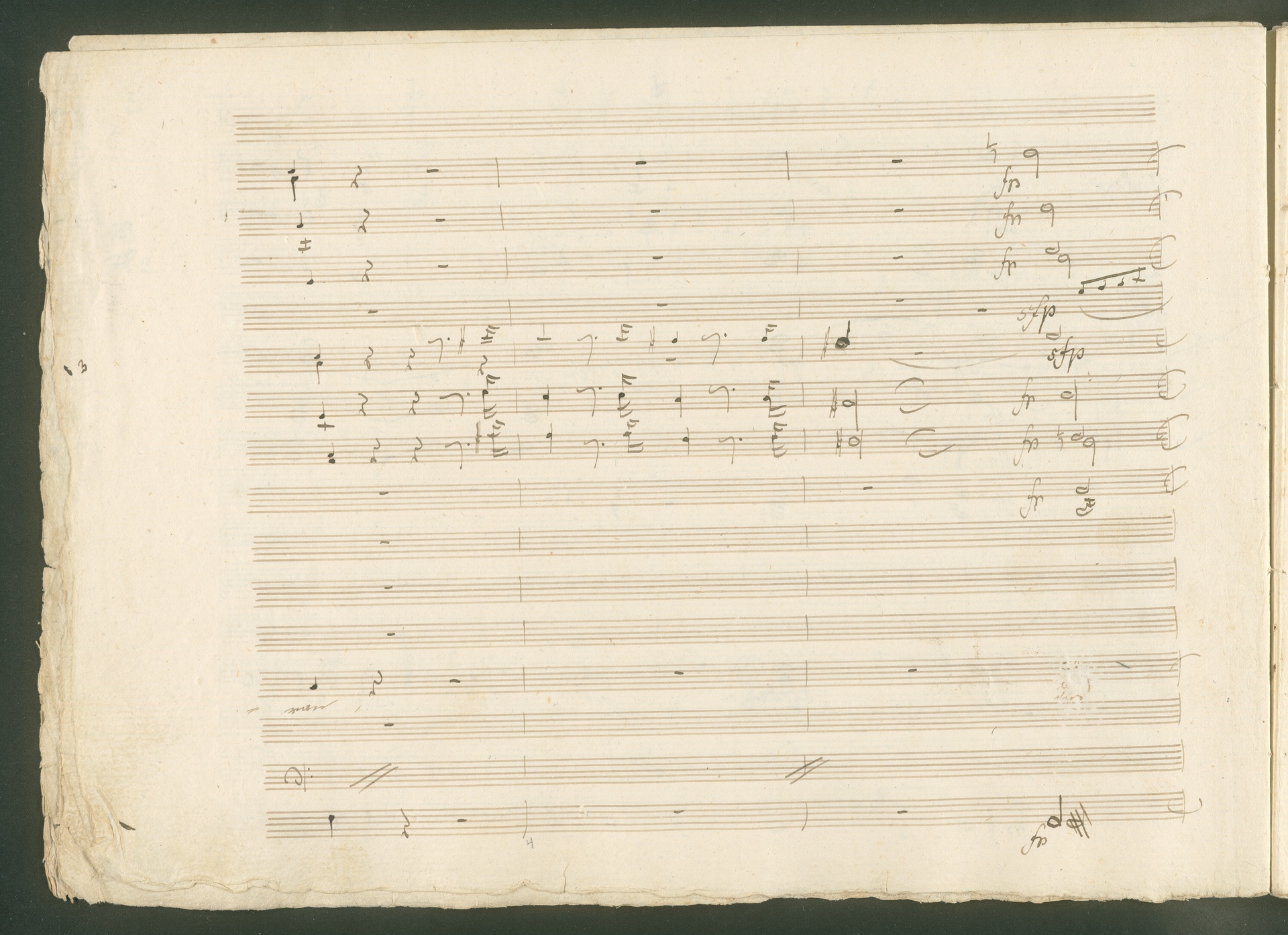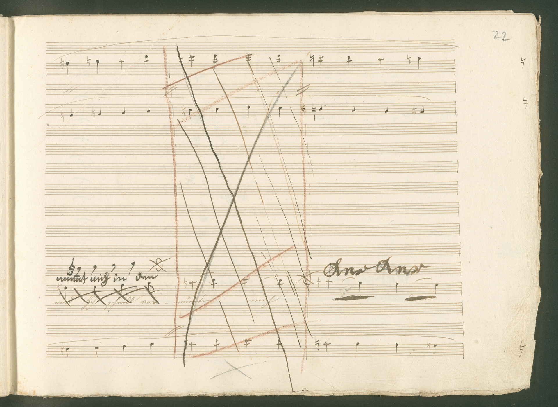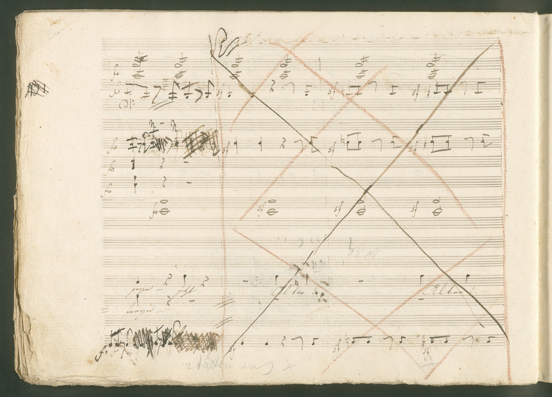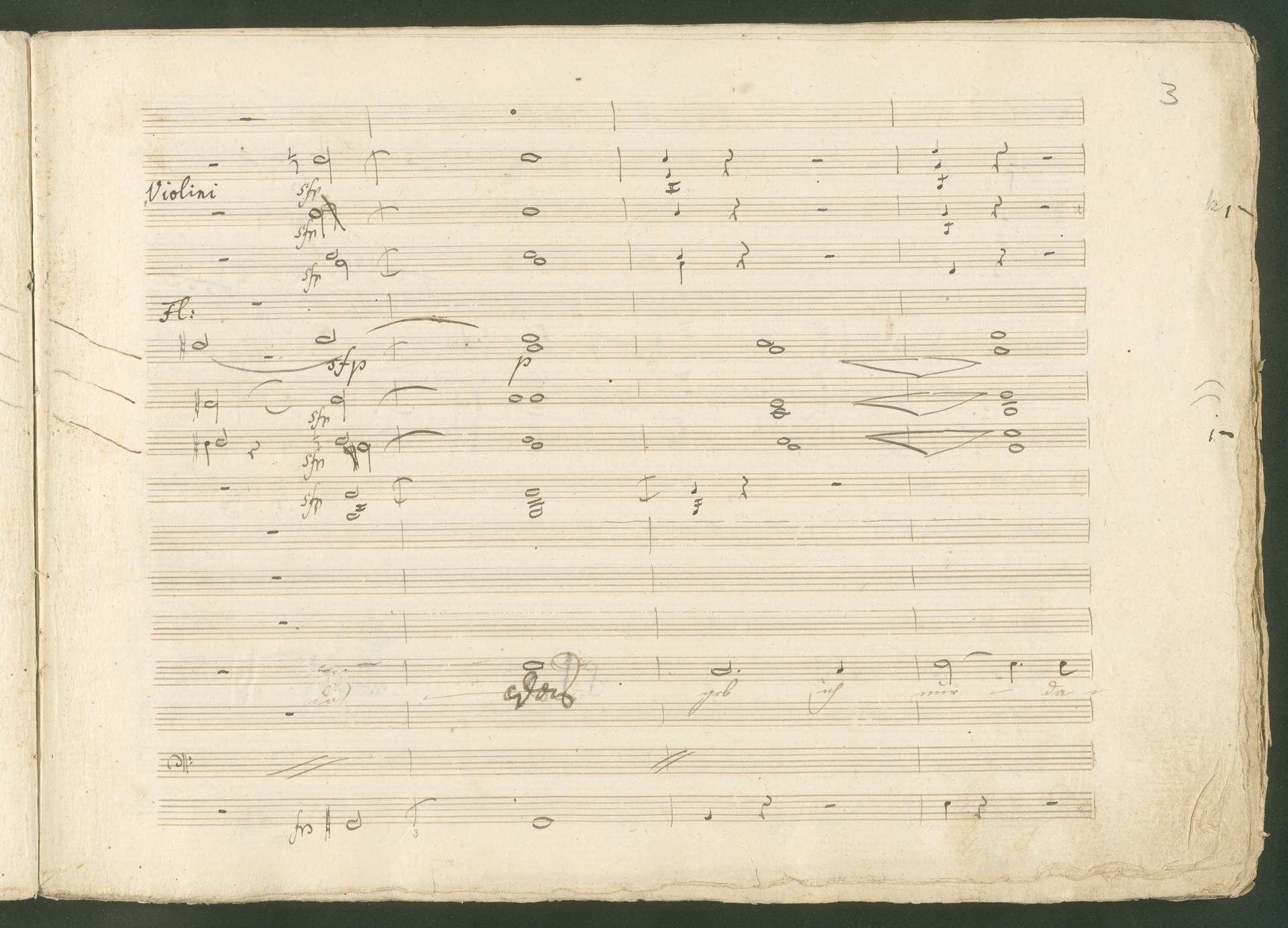 Abgebildet ist eine Kopistenabschrift des Duetts Pizarro/Rocco "Jetzt, Alter, jetzt hat es Eile" aus Beethovens einziger Oper Leonore bzw. Fidelio. Der Kopist schrieb das Duett in der Fassung von 1806, Beethoven korrigierte diese im Zuge der Umarbeitung der Oper 1814. Bei dieser letzten Revision straffte Beethoven den Ablauf durch gezielte Streichungen, die die Wirkung verstärkten und das Tempo der Handlung beschleunigten. Auch die vorliegende Abschrift trägt solche Eingriffe: auf etlichen Blättern kürzte Beethoven Takte oder ganze Phrasen. So gleich zu Beginn auf den beiden ersten Notentextseiten: Pizarro beginnt in der Fassung von 1806, wie sie der Kopist schrieb, mit dem Wortlaut: "Jetzt, Alter, Alter, jetzt hat es Eile!". Er singt quasi atemlos - es hat ja Eile - mit Pausen versetzt auf fünf Takte verteilt. Beethoven korrigiert dies, in dem er die zwei Takte "Alter, Alter" streicht bzw. ausradiert und die Phrase auf drei Takte zusammenzieht. Erst jetzt entsteht tatsächlich der Eindruck, Pizarro sei gehetzt - "Jetzt, Alter, jetzt hat es Eile." Nur ein kleines Detail und im Manuskript keine große Korrektur - aber welche dramaturgische Wirkung erzielt Beethoven damit! (J.R.)