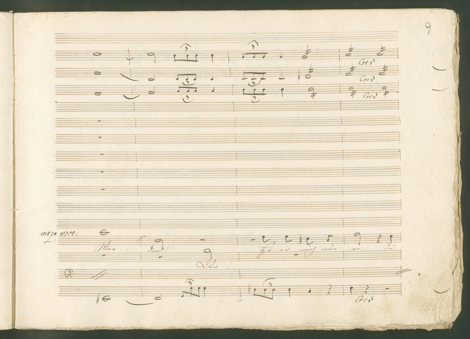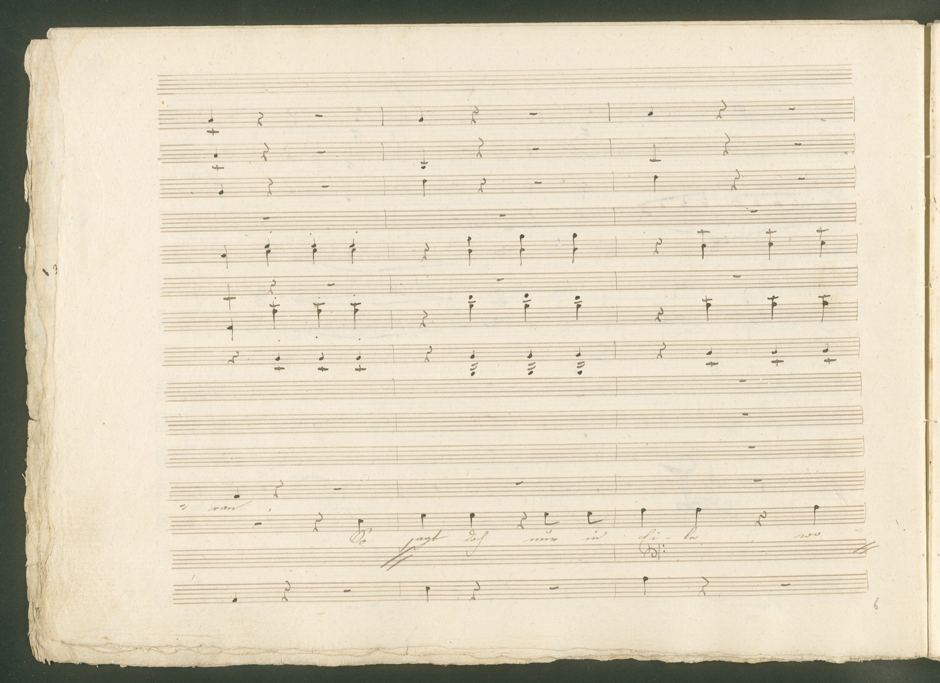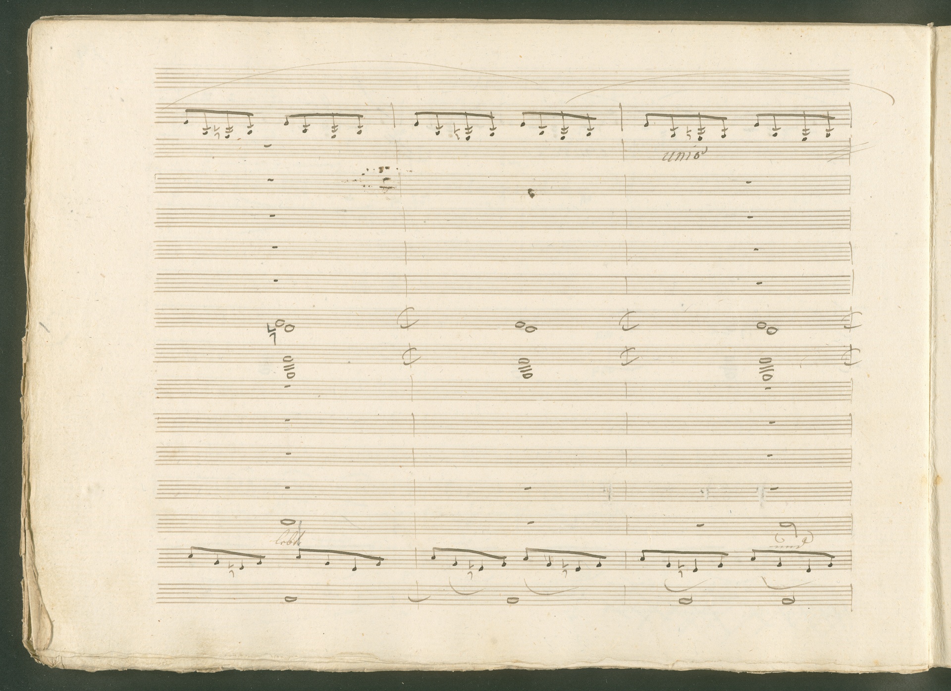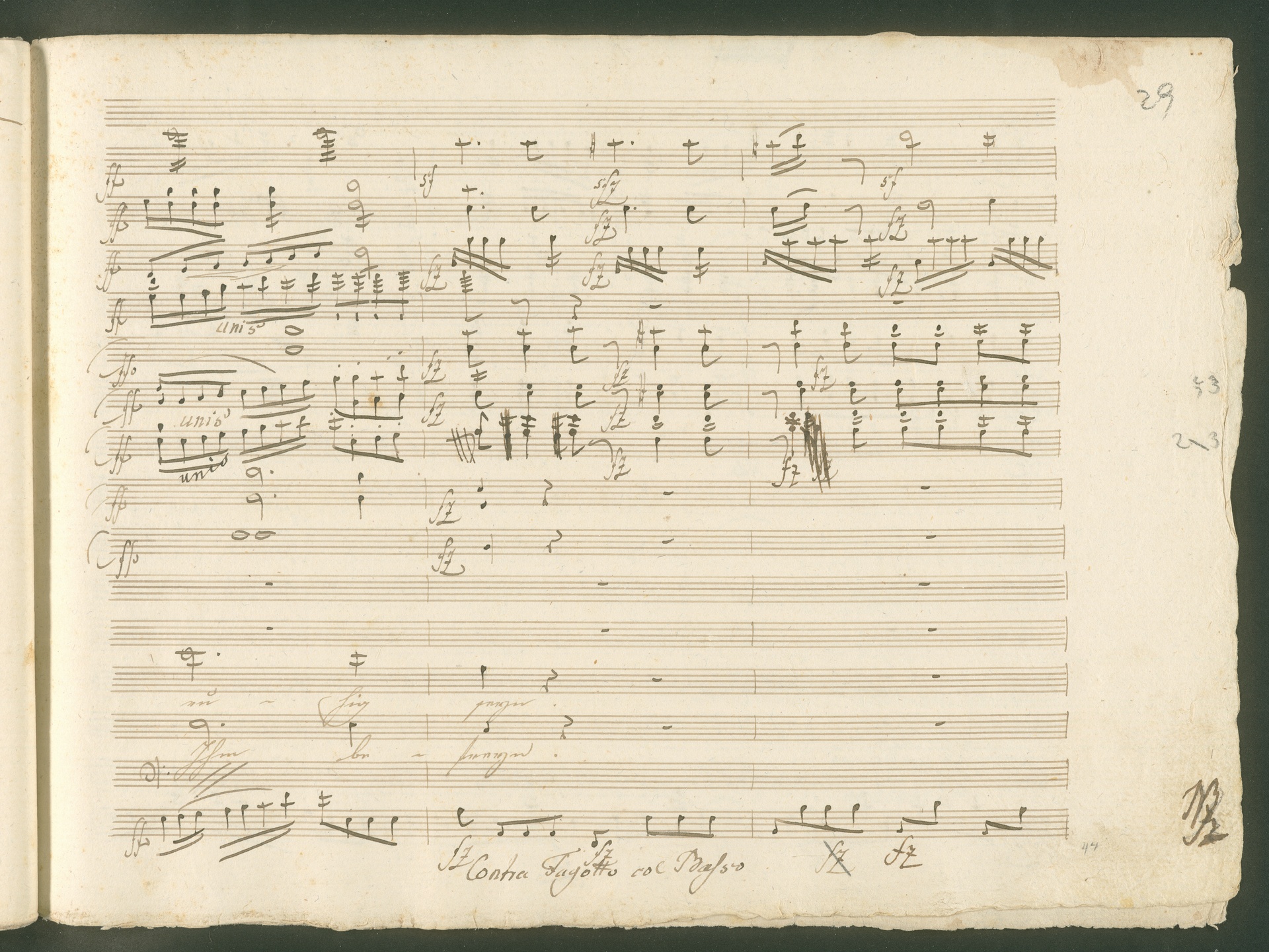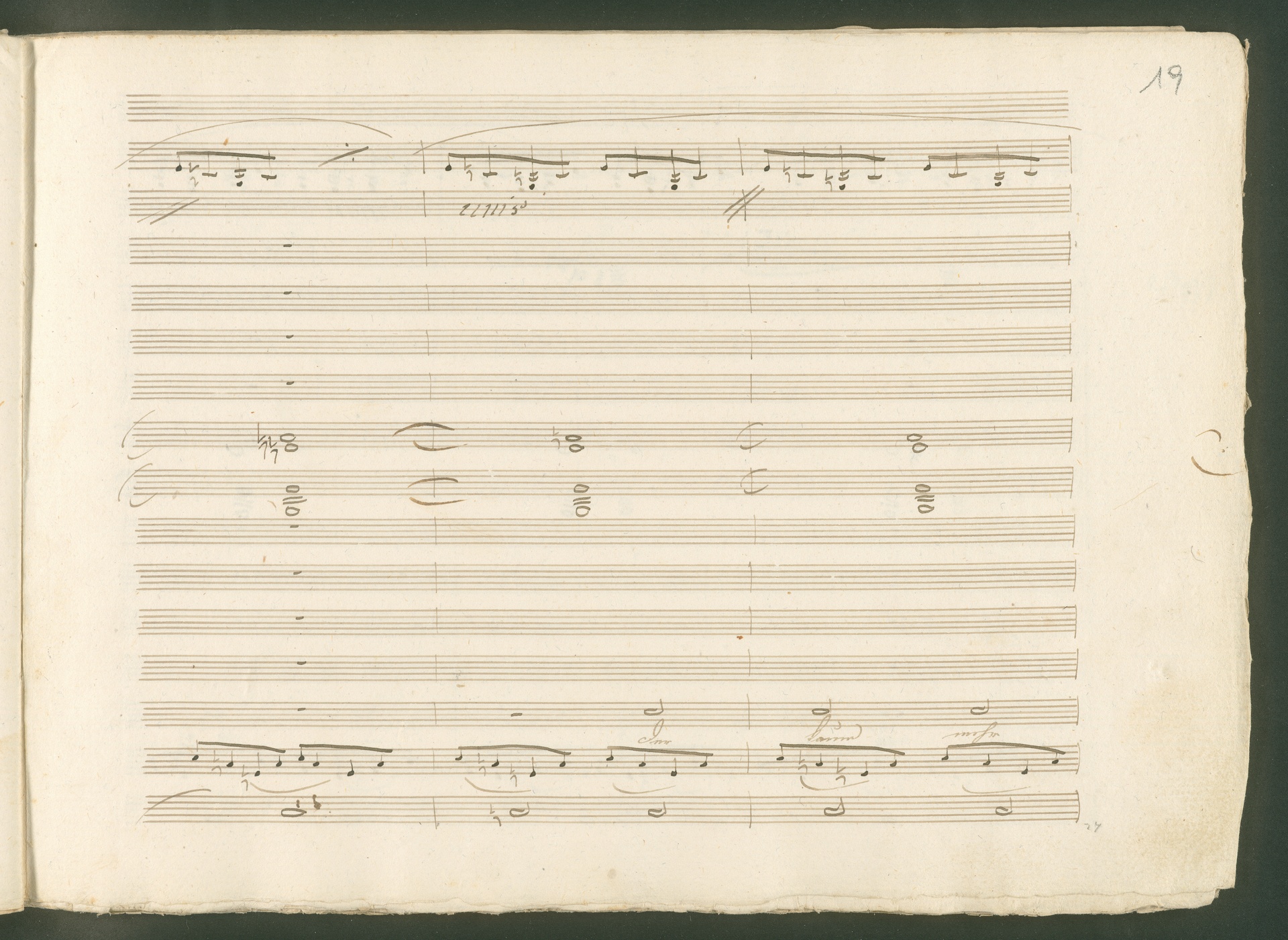 Abgebildet ist eine Kopistenabschrift des Duetts Pizarro/Rocco "Jetzt, Alter, jetzt hat es Eile" aus Beethovens einziger Oper Leonore bzw. Fidelio. Der Kopist schrieb das Duett in der Fassung von 1806, Beethoven korrigierte diese im Zuge der Umarbeitung der Oper 1814. Bei dieser letzten Revision straffte Beethoven den Ablauf durch gezielte Streichungen, die die Wirkung verstärkten und das Tempo der Handlung beschleunigten. Auch die vorliegende Abschrift trägt solche Eingriffe: auf etlichen Blättern kürzte Beethoven Takte oder ganze Phrasen. So gleich zu Beginn auf den beiden ersten Notentextseiten: Pizarro beginnt in der Fassung von 1806, wie sie der Kopist schrieb, mit dem Wortlaut: "Jetzt, Alter, Alter, jetzt hat es Eile!". Er singt quasi atemlos - es hat ja Eile - mit Pausen versetzt auf fünf Takte verteilt. Beethoven korrigiert dies, in dem er die zwei Takte "Alter, Alter" streicht bzw. ausradiert und die Phrase auf drei Takte zusammenzieht. Erst jetzt entsteht tatsächlich der Eindruck, Pizarro sei gehetzt - "Jetzt, Alter, jetzt hat es Eile." Nur ein kleines Detail und im Manuskript keine große Korrektur - aber welche dramaturgische Wirkung erzielt Beethoven damit! (J.R.)