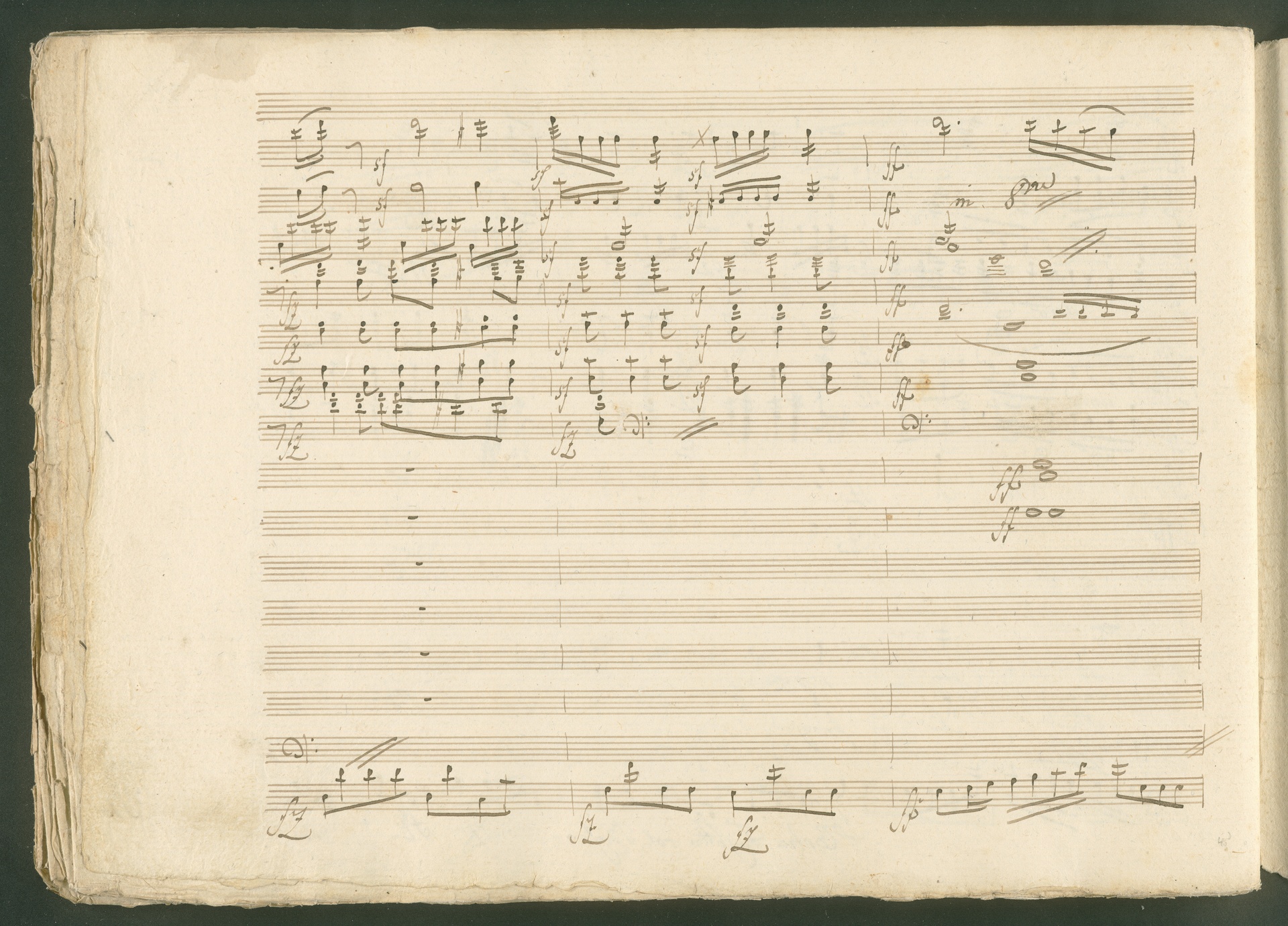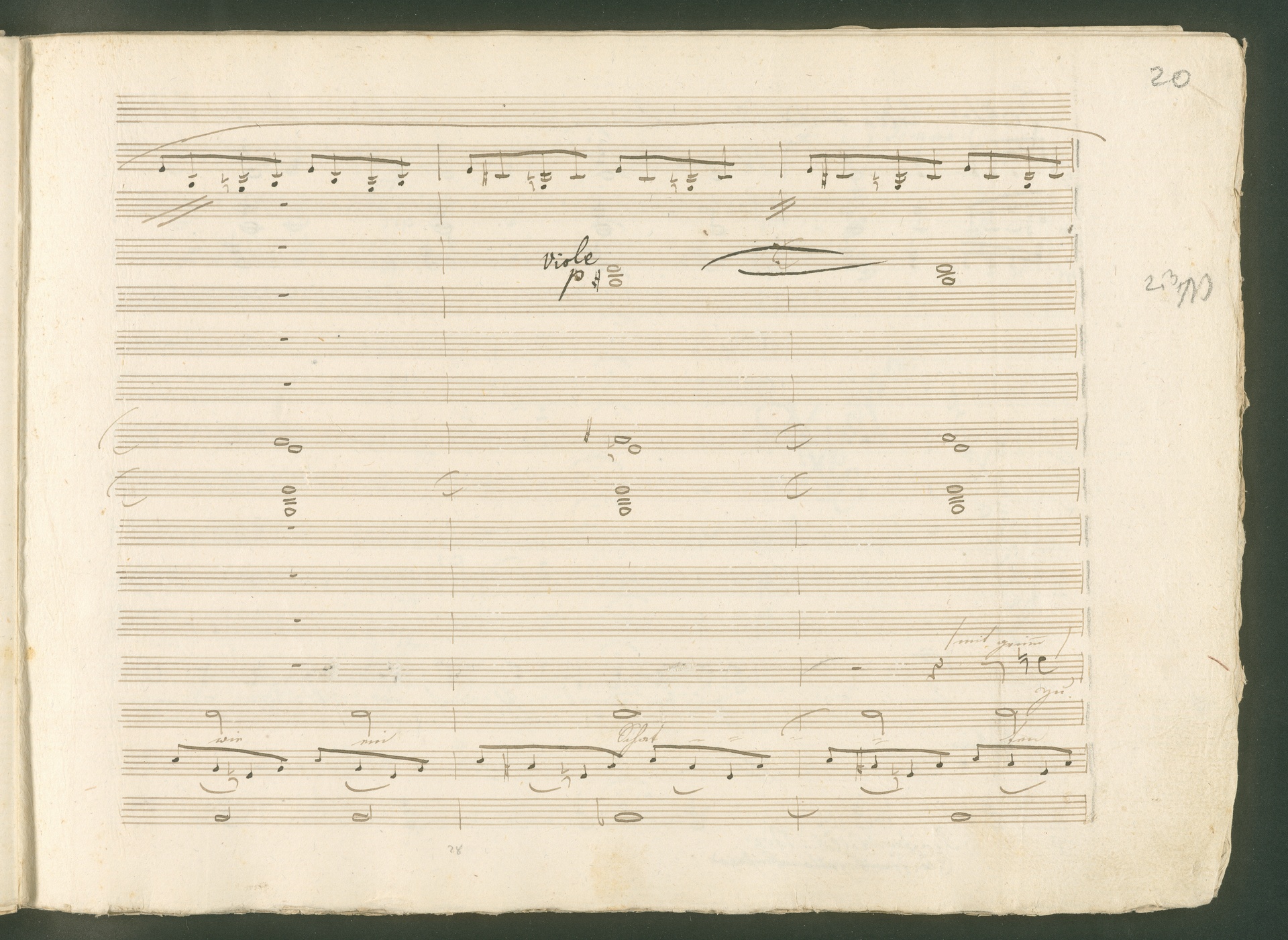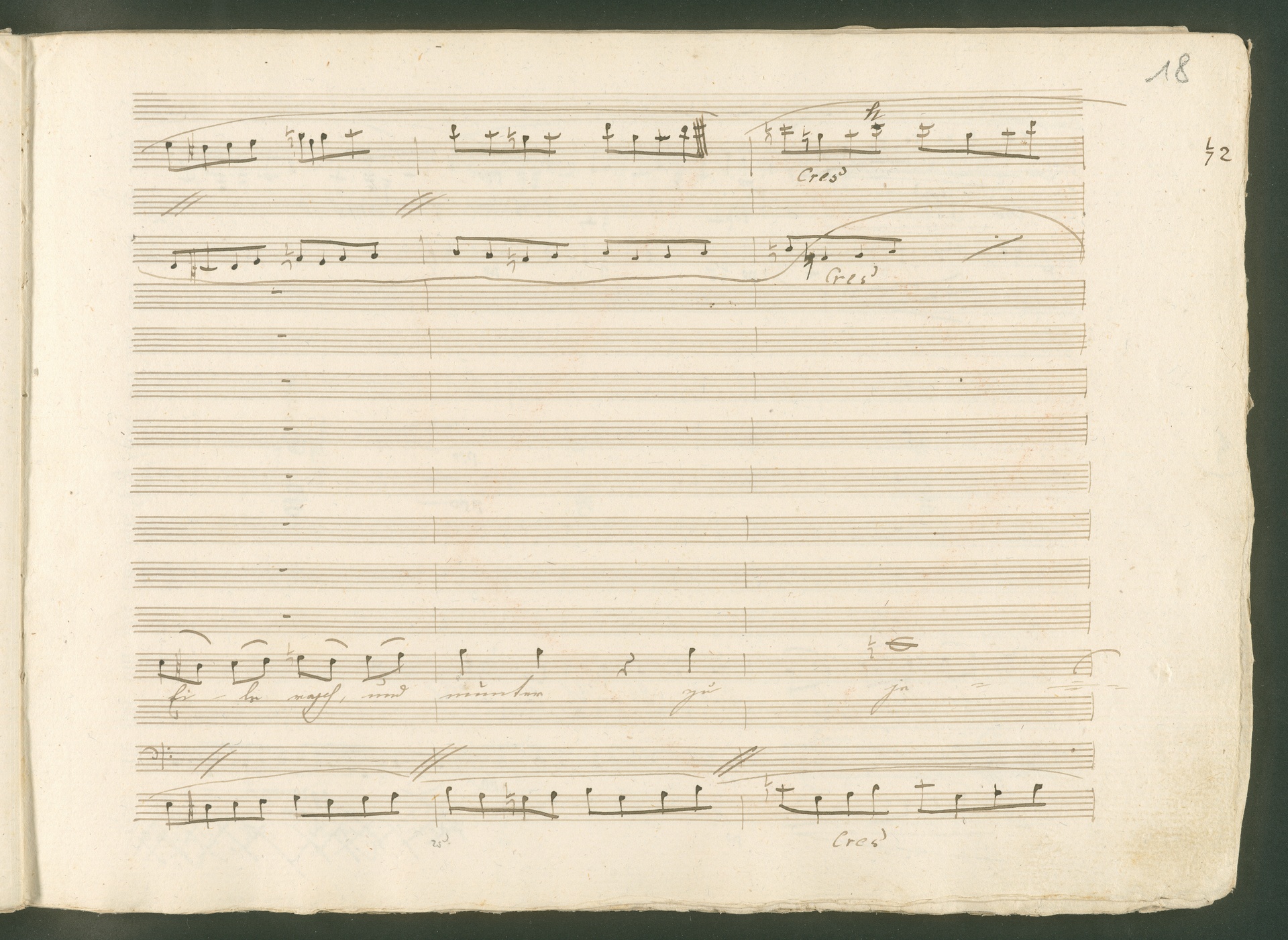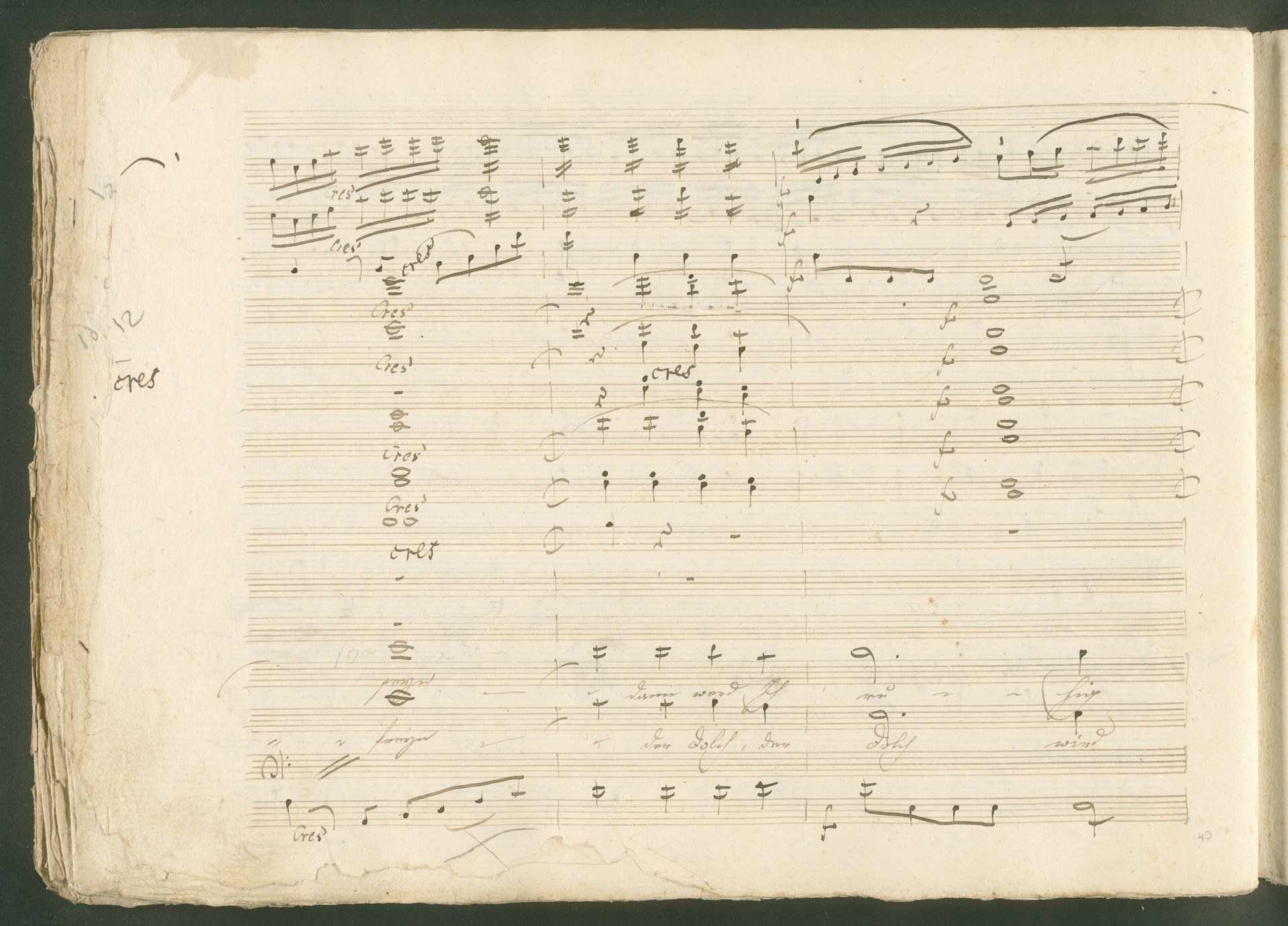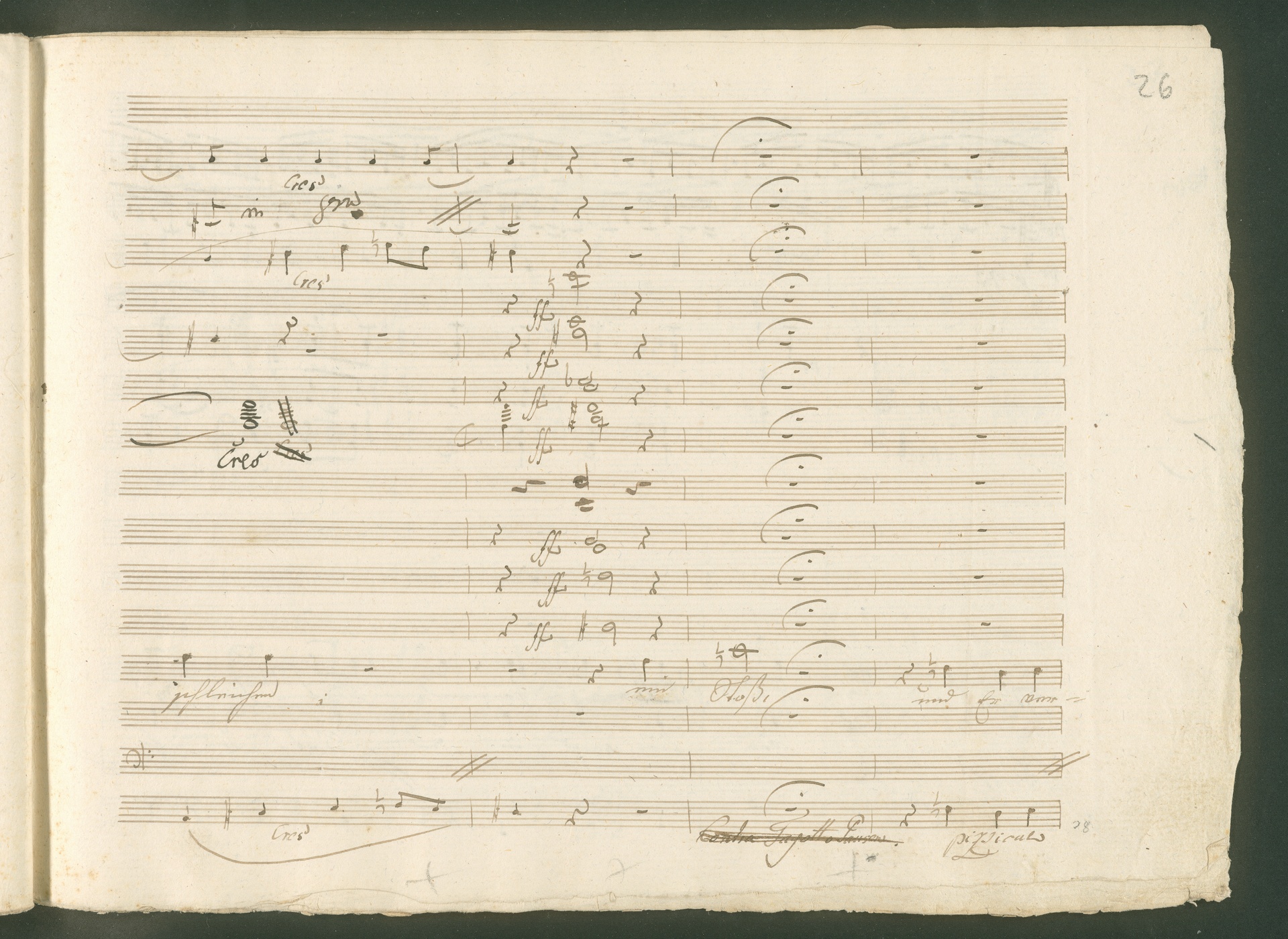 Abgebildet ist eine Kopistenabschrift des Duetts Pizarro/Rocco "Jetzt, Alter, jetzt hat es Eile" aus Beethovens einziger Oper Leonore bzw. Fidelio. Der Kopist schrieb das Duett in der Fassung von 1806, Beethoven korrigierte diese im Zuge der Umarbeitung der Oper 1814. Bei dieser letzten Revision straffte Beethoven den Ablauf durch gezielte Streichungen, die die Wirkung verstärkten und das Tempo der Handlung beschleunigten. Auch die vorliegende Abschrift trägt solche Eingriffe: auf etlichen Blättern kürzte Beethoven Takte oder ganze Phrasen. So gleich zu Beginn auf den beiden ersten Notentextseiten: Pizarro beginnt in der Fassung von 1806, wie sie der Kopist schrieb, mit dem Wortlaut: "Jetzt, Alter, Alter, jetzt hat es Eile!". Er singt quasi atemlos - es hat ja Eile - mit Pausen versetzt auf fünf Takte verteilt. Beethoven korrigiert dies, in dem er die zwei Takte "Alter, Alter" streicht bzw. ausradiert und die Phrase auf drei Takte zusammenzieht. Erst jetzt entsteht tatsächlich der Eindruck, Pizarro sei gehetzt - "Jetzt, Alter, jetzt hat es Eile." Nur ein kleines Detail und im Manuskript keine große Korrektur - aber welche dramaturgische Wirkung erzielt Beethoven damit! (J.R.)